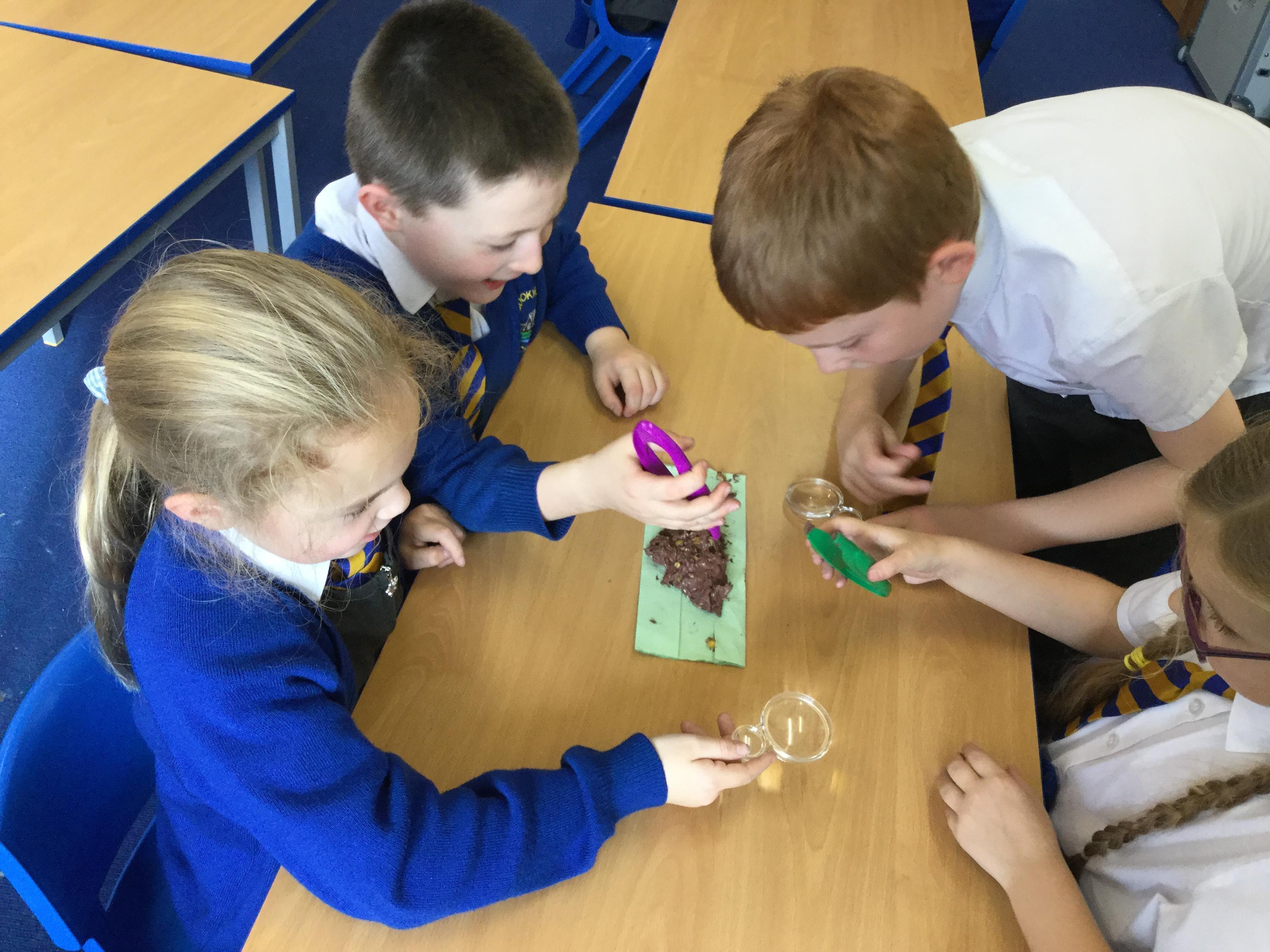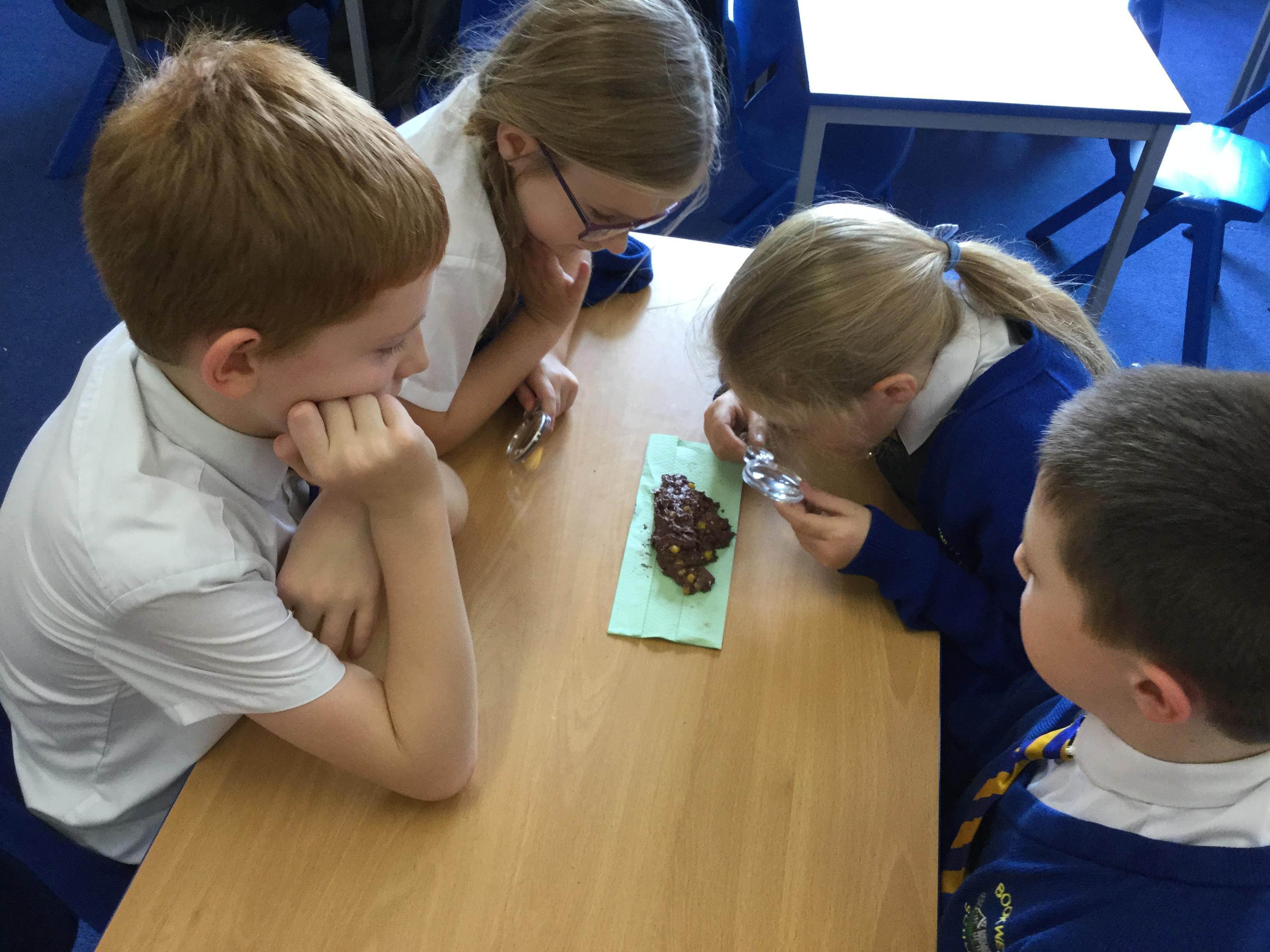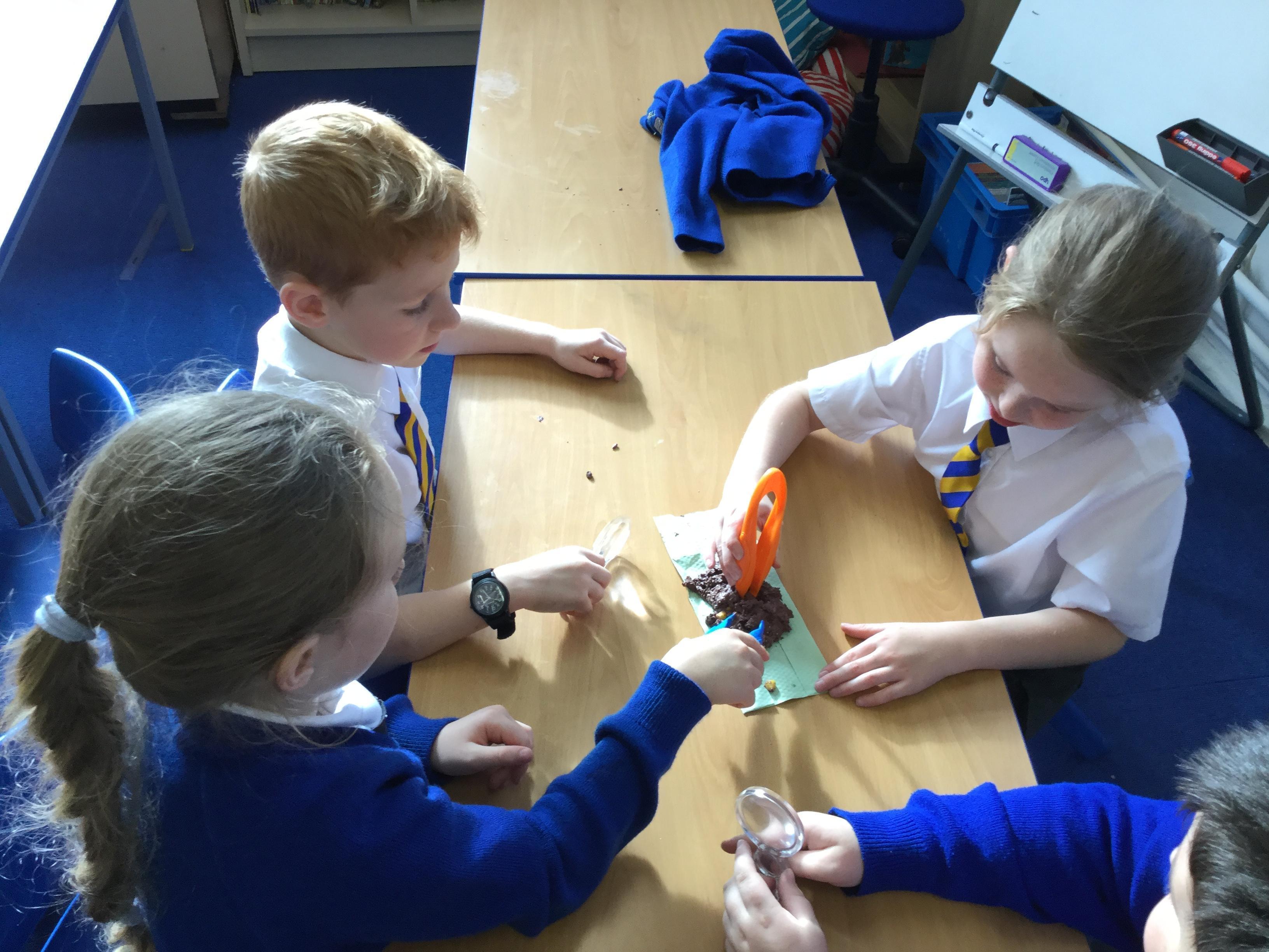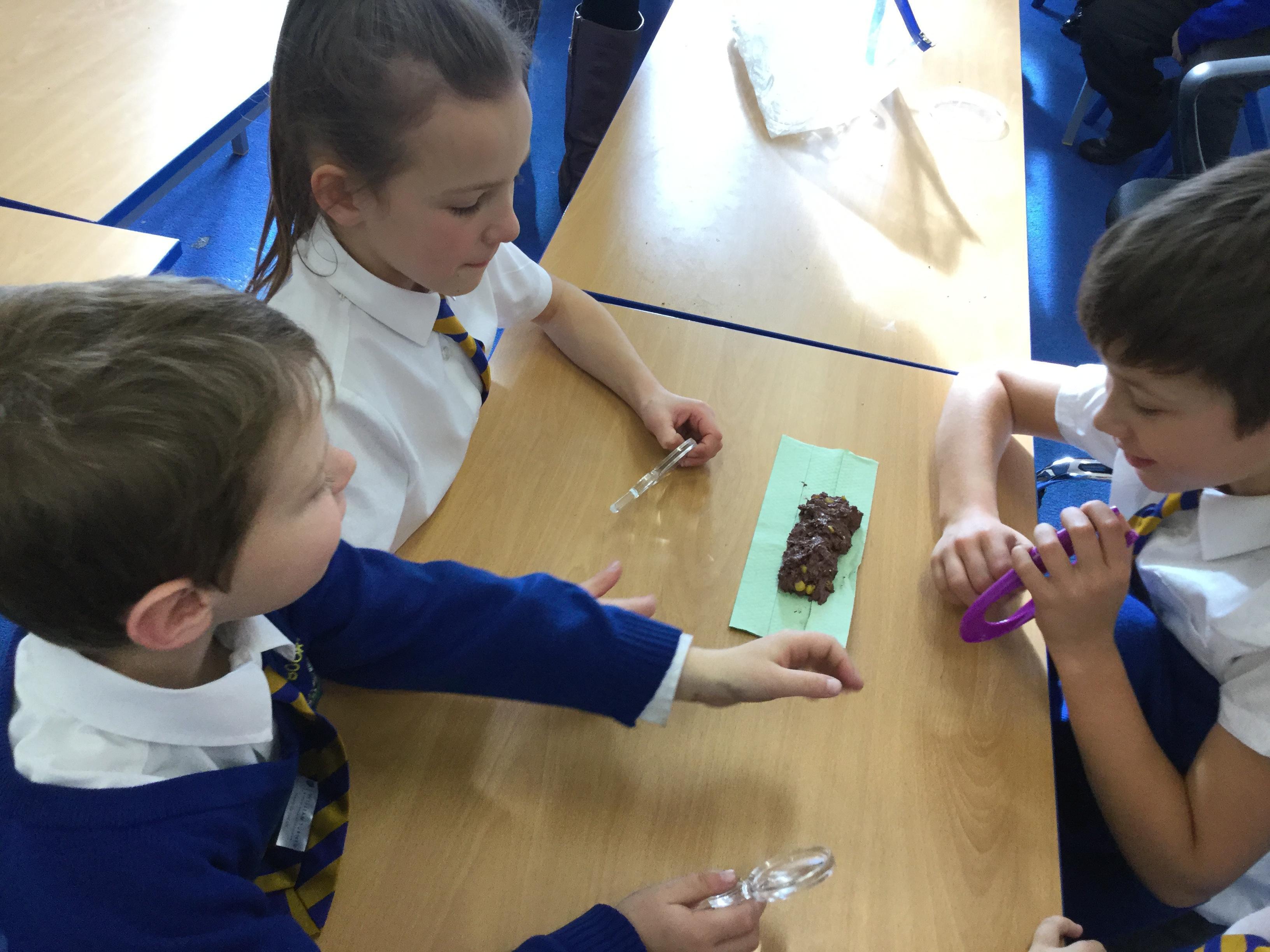 One of the things our class wanted to learn about during our Stone Age topic was what people in the Stone Age ate. Luckily, Mrs McEwan managed to locate some Stone Age poo and when we came in from break, there was lots all over our desks. We were astounded and some of us felt slightly unwell. In groups, we got some tweezers and magnifying glasses and began to investigate what was in the waste. We discovered corn, leaves, barley, fish bones and fruit. It smelled of meat so we assumed they must have ate some of that too. Our hands were filthy by the end!