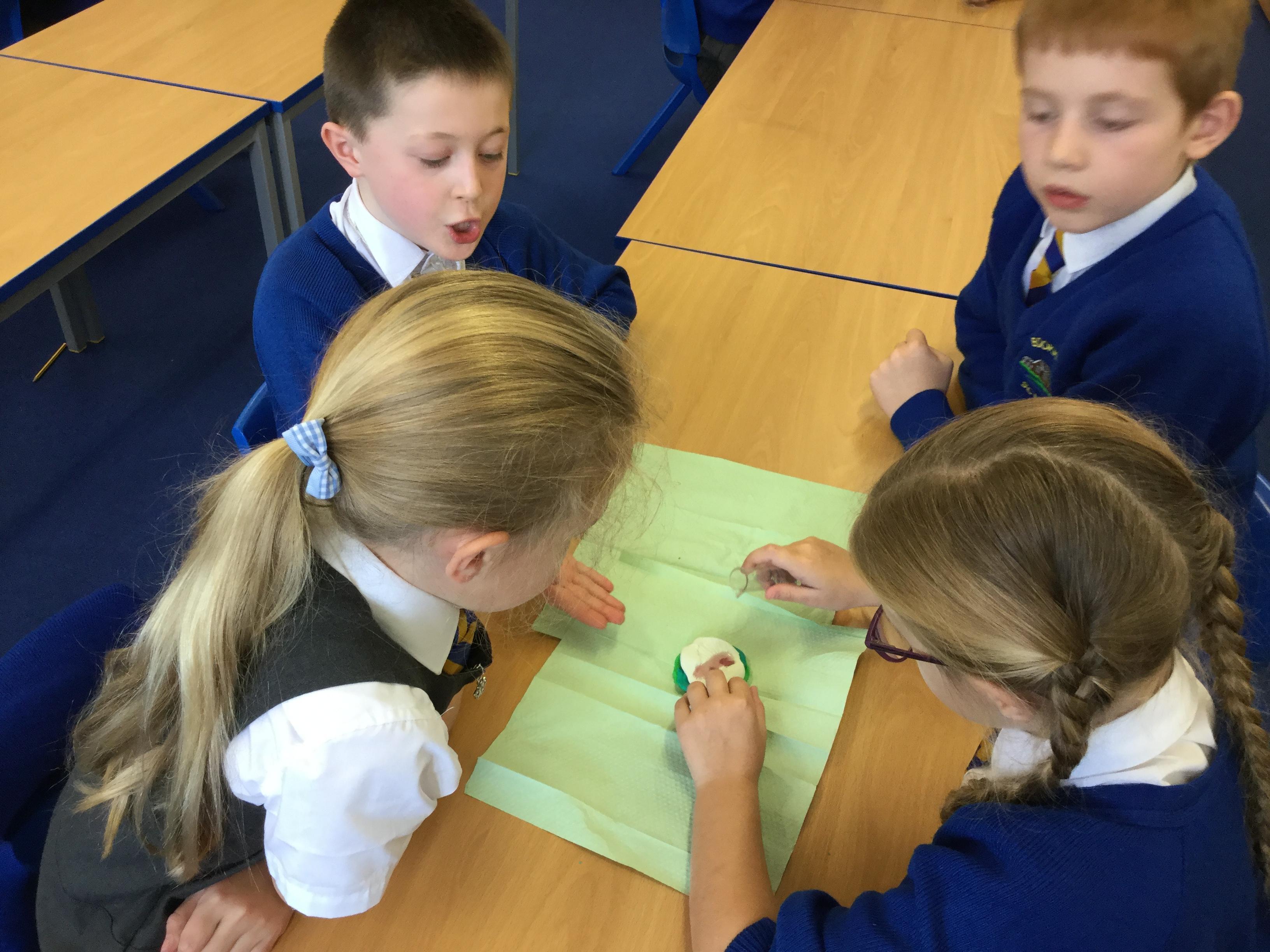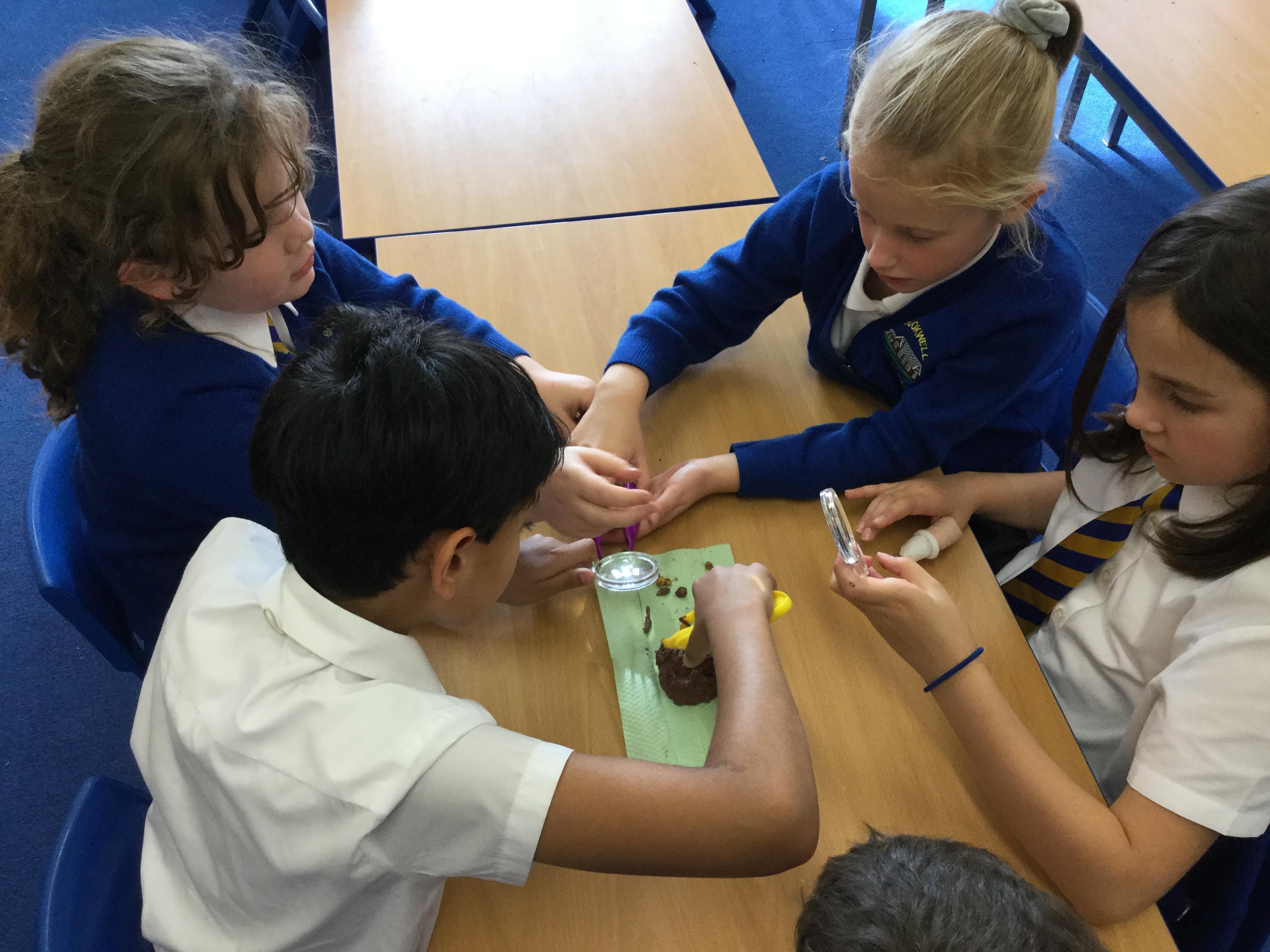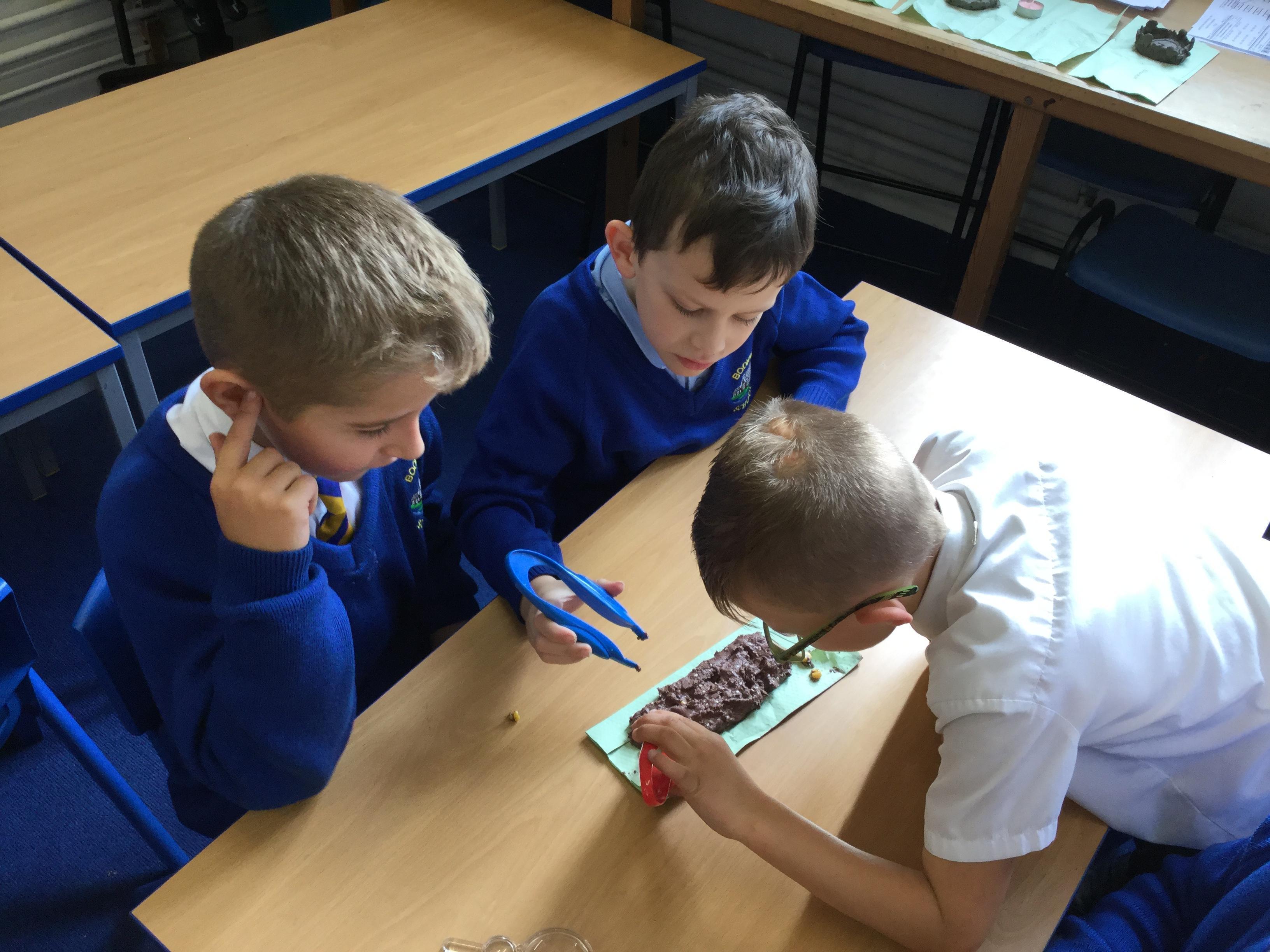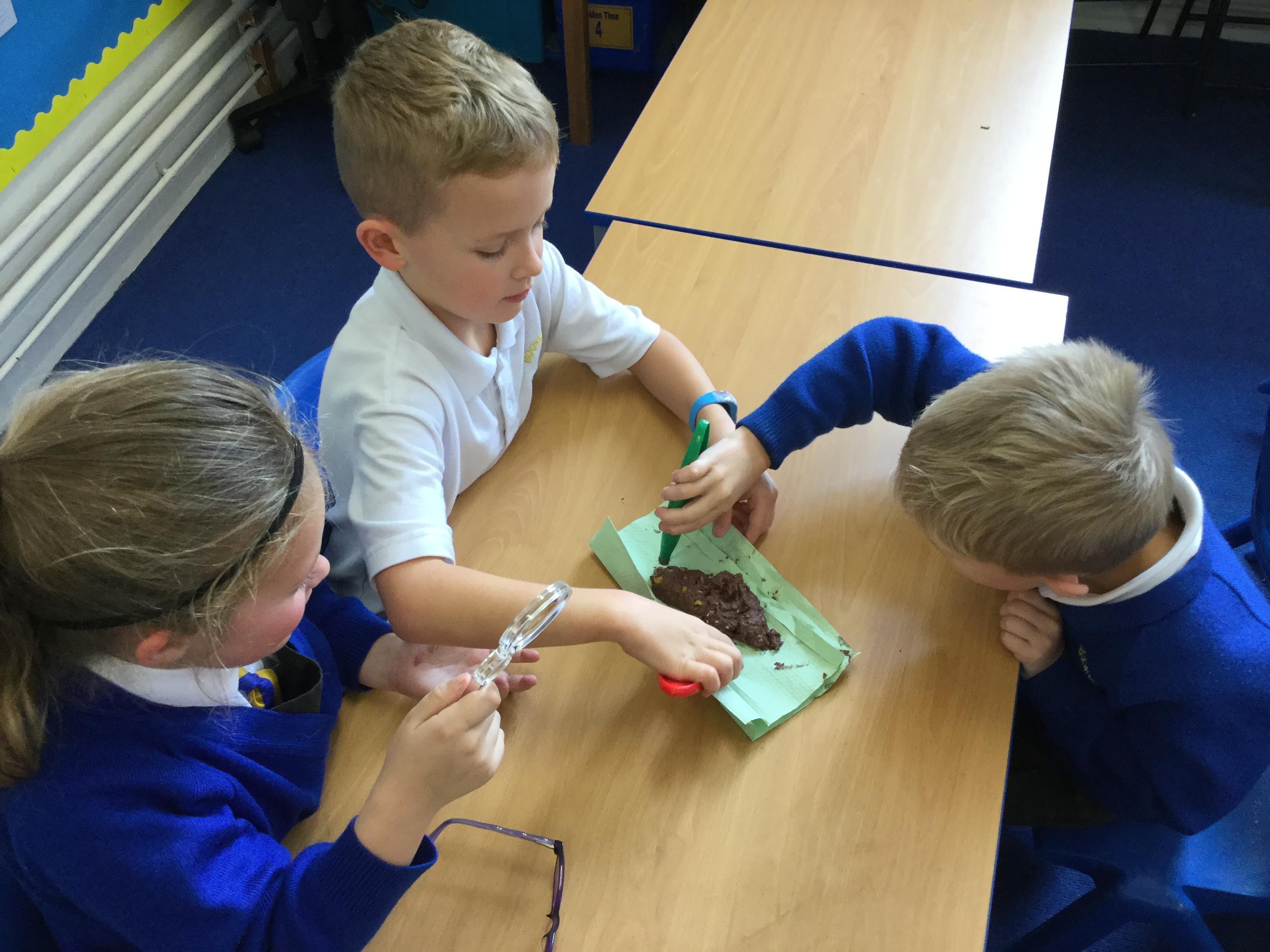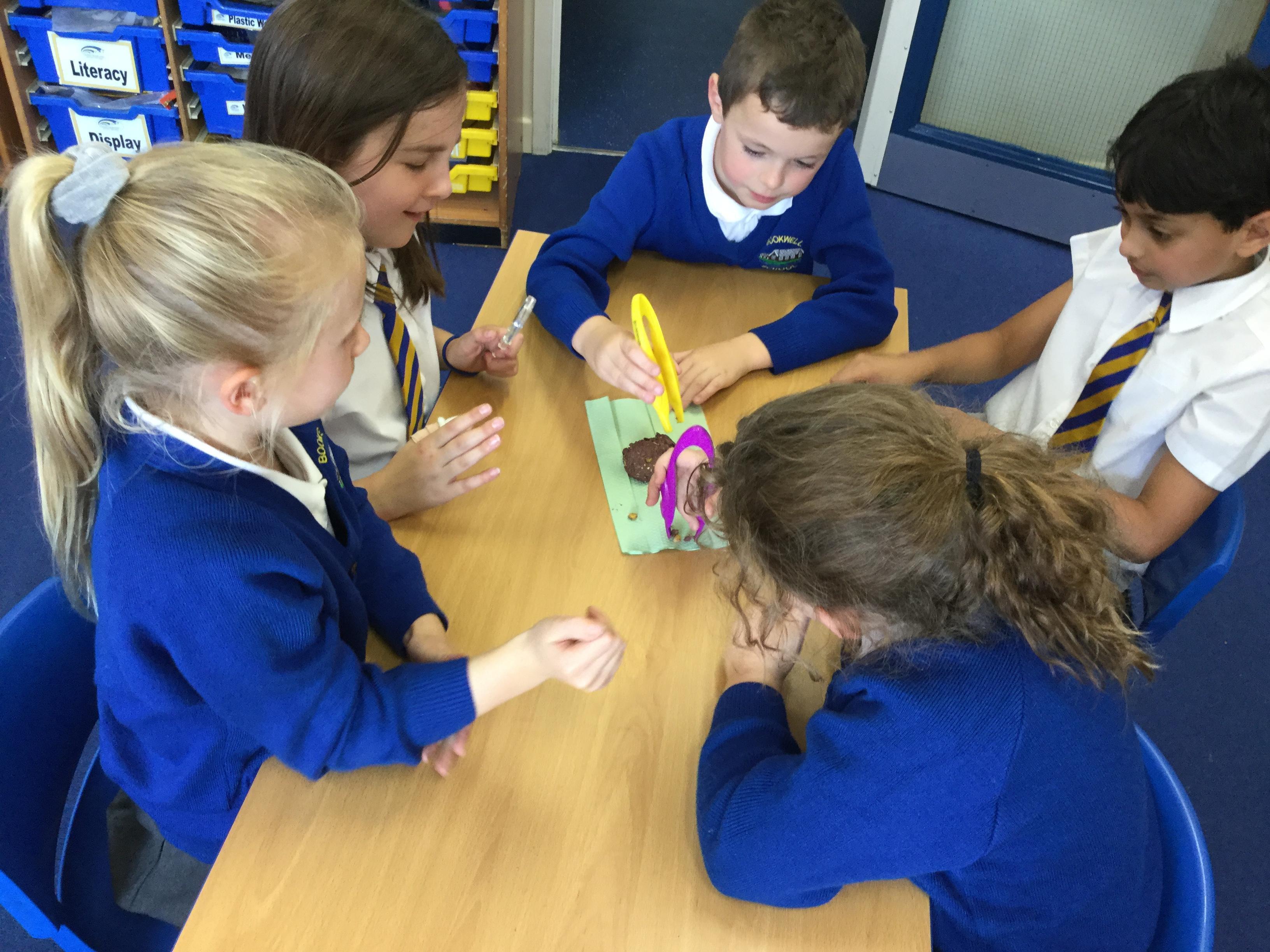One of the things our class wanted to learn about during our Stone Age topic was what people in the Stone Age ate. Luckily, Mrs McEwan managed to locate some Stone Age poo and when we came in from break, there was lots all over our desks. We were astounded and some of us felt slightly unwell. In groups, we got some tweezers and magnifying glasses and began to investigate what was in the waste. We discovered corn, leaves, barley, fish bones and fruit. It smelled of meat so we assumed they must have ate some of that too. Our hands were filthy by the end!