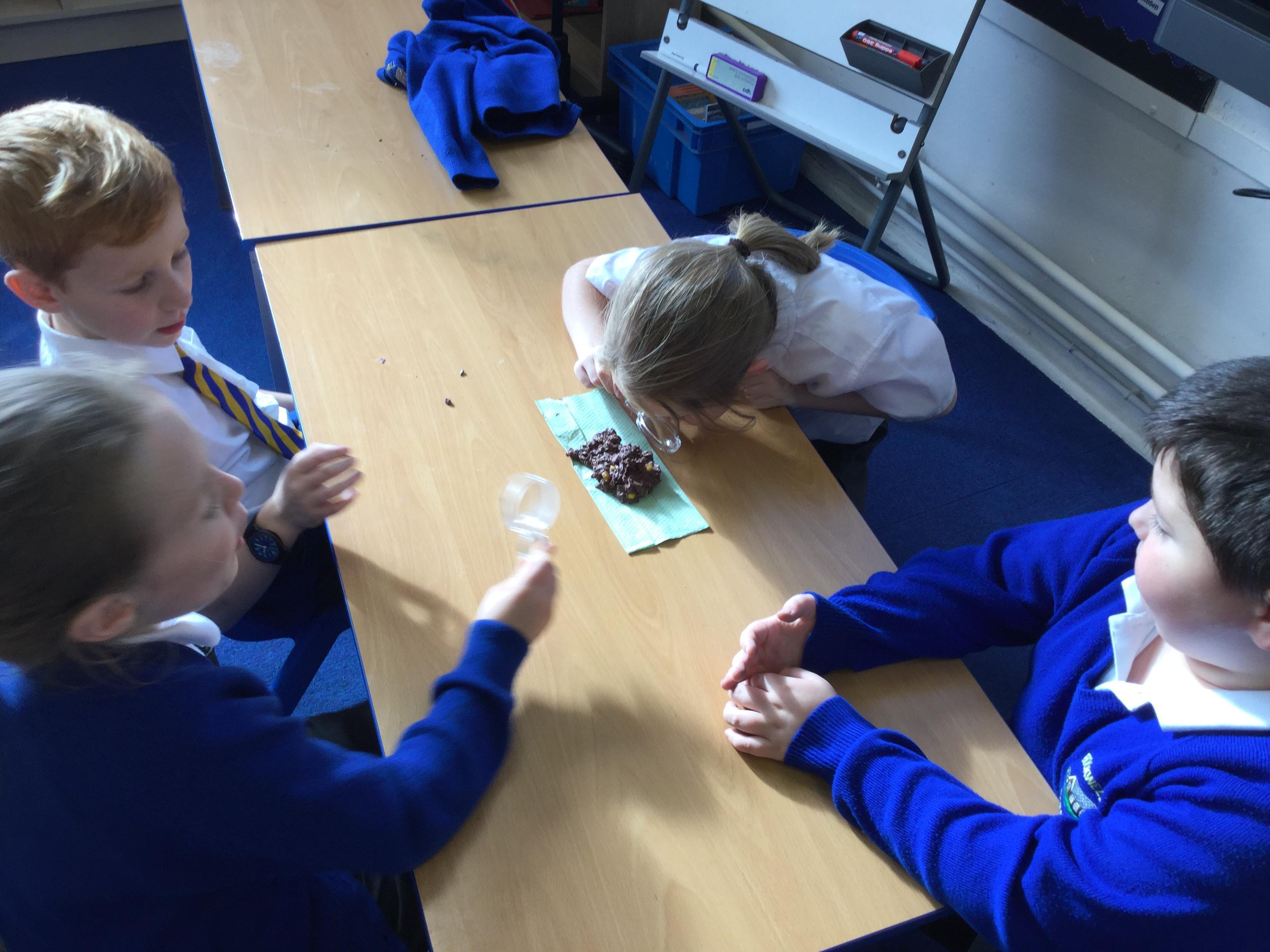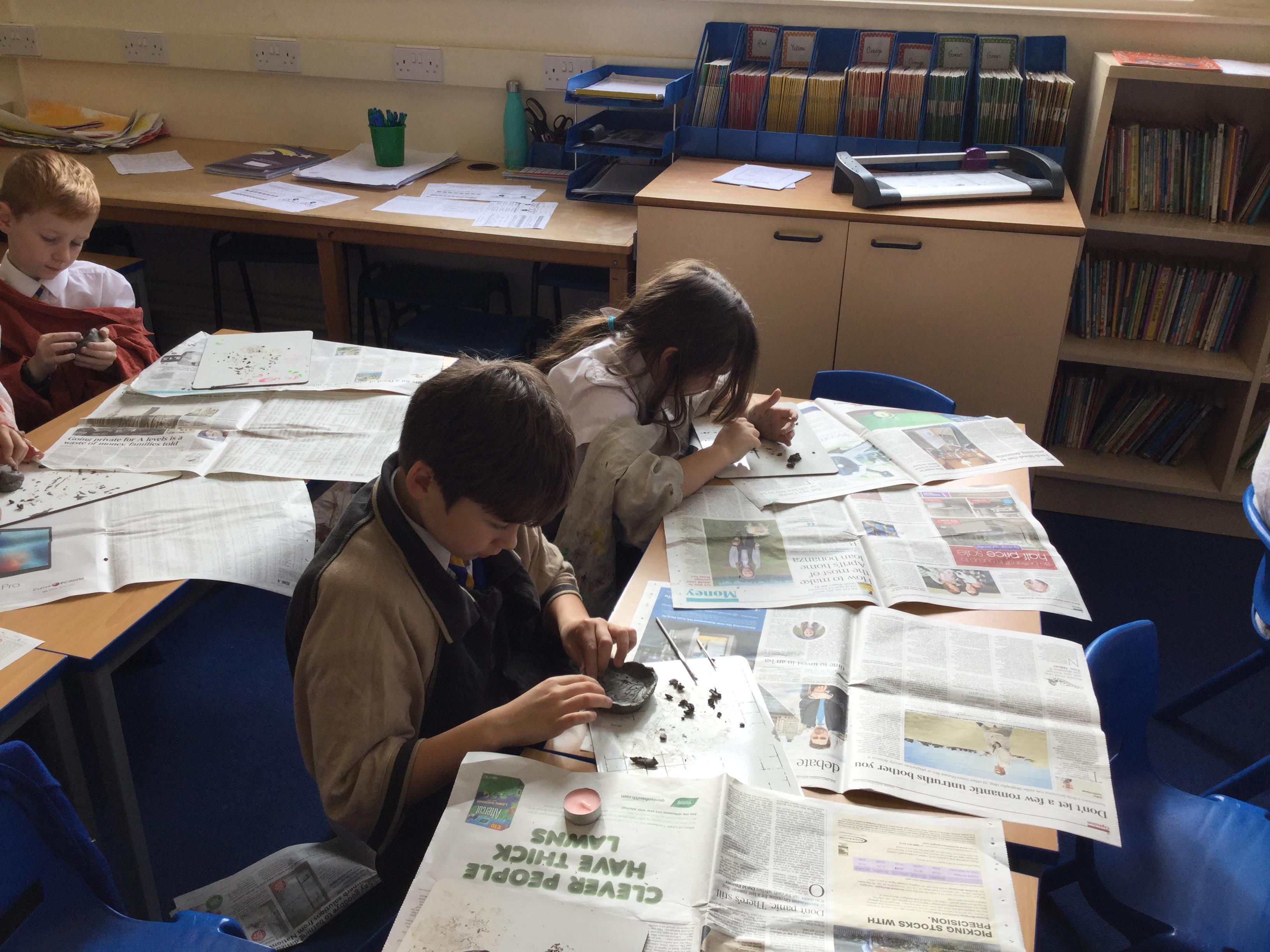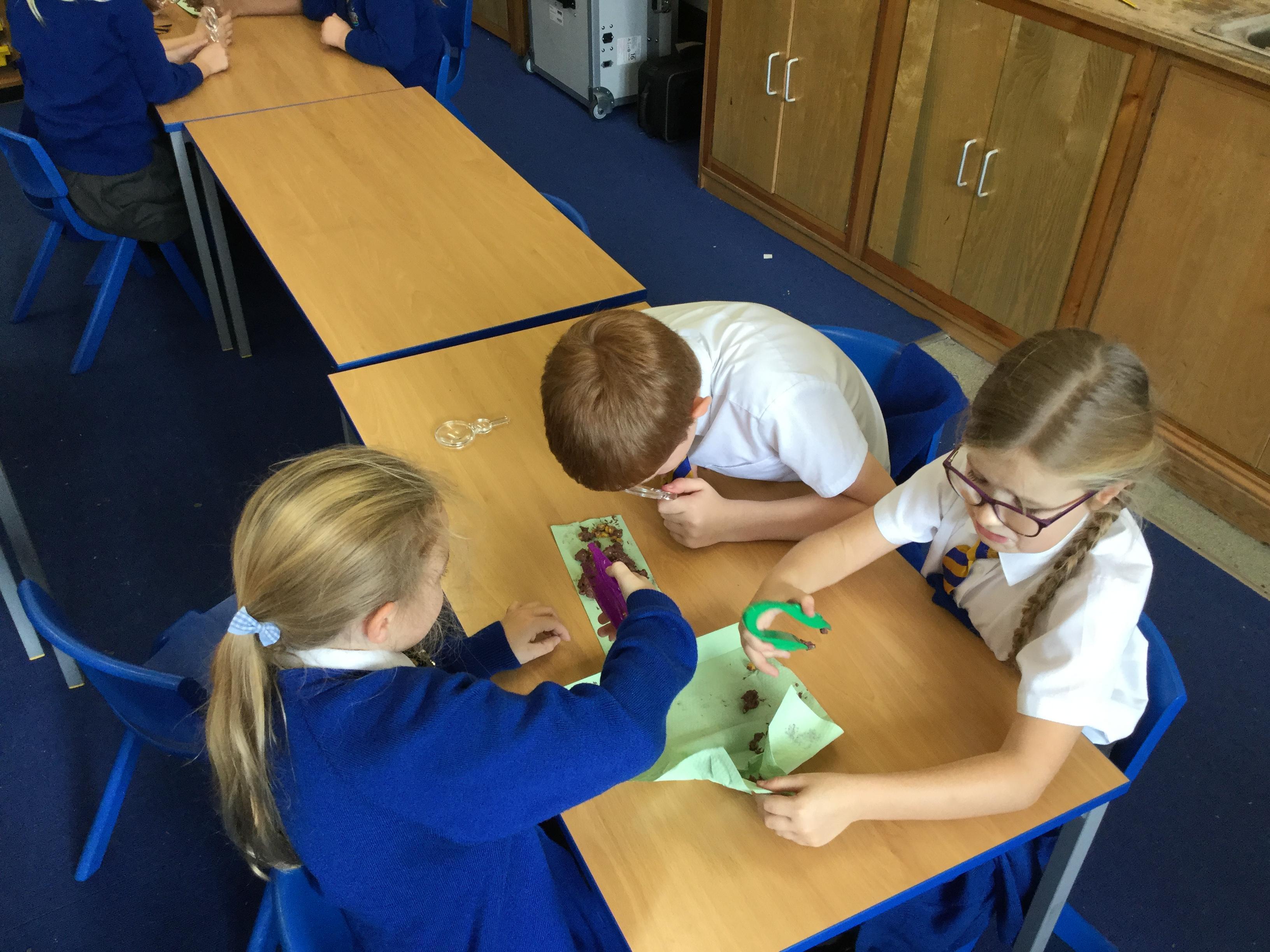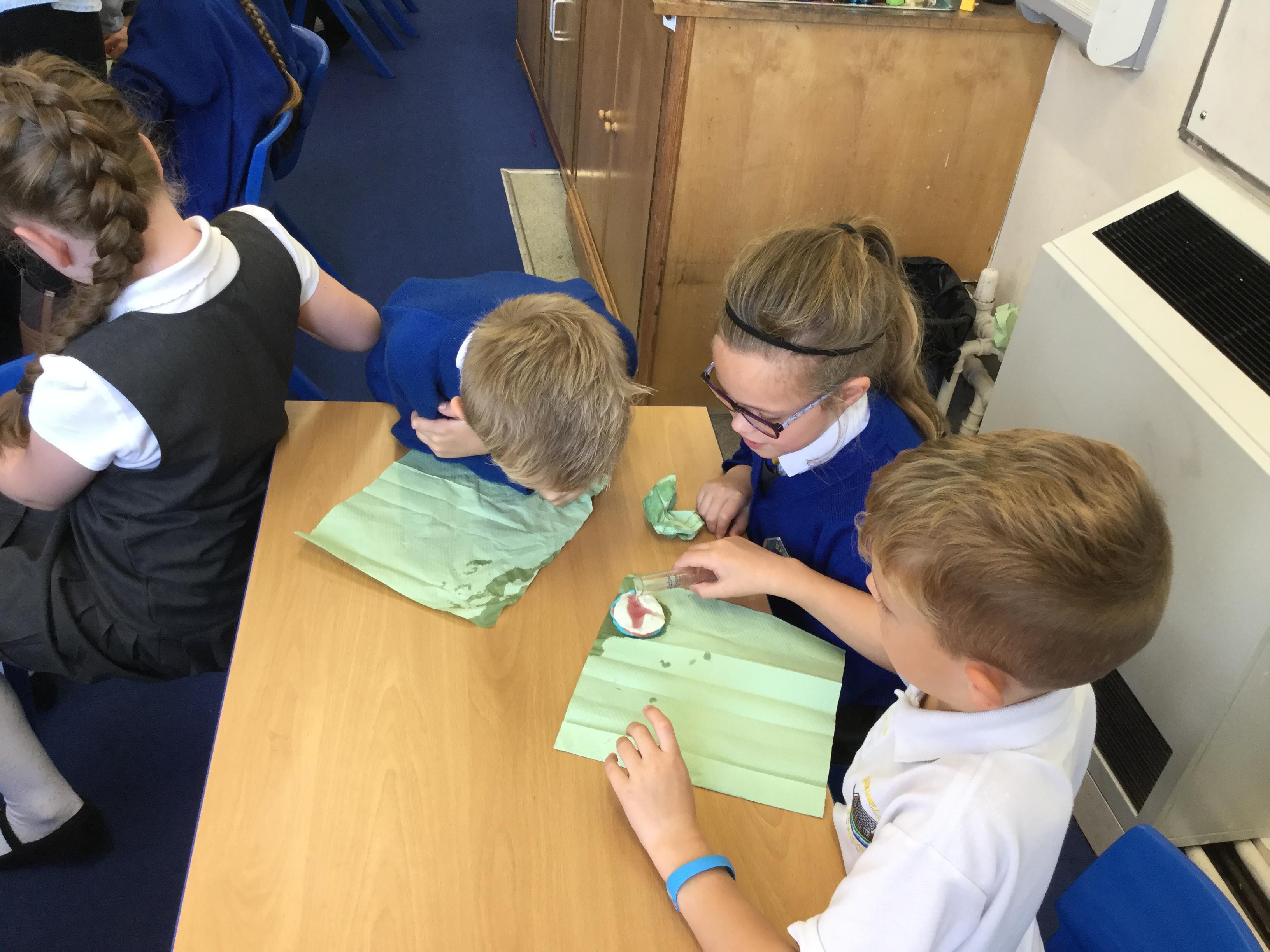 One of the things our class wanted to learn about during our Stone Age topic was what people in the Stone Age ate. Luckily, Mrs McEwan managed to locate some Stone Age poo and when we came in from break, there was lots all over our desks. We were astounded and some of us felt slightly unwell. In groups, we got some tweezers and magnifying glasses and began to investigate what was in the waste. We discovered corn, leaves, barley, fish bones and fruit. It smelled of meat so we assumed they must have ate some of that too. Our hands were filthy by the end!