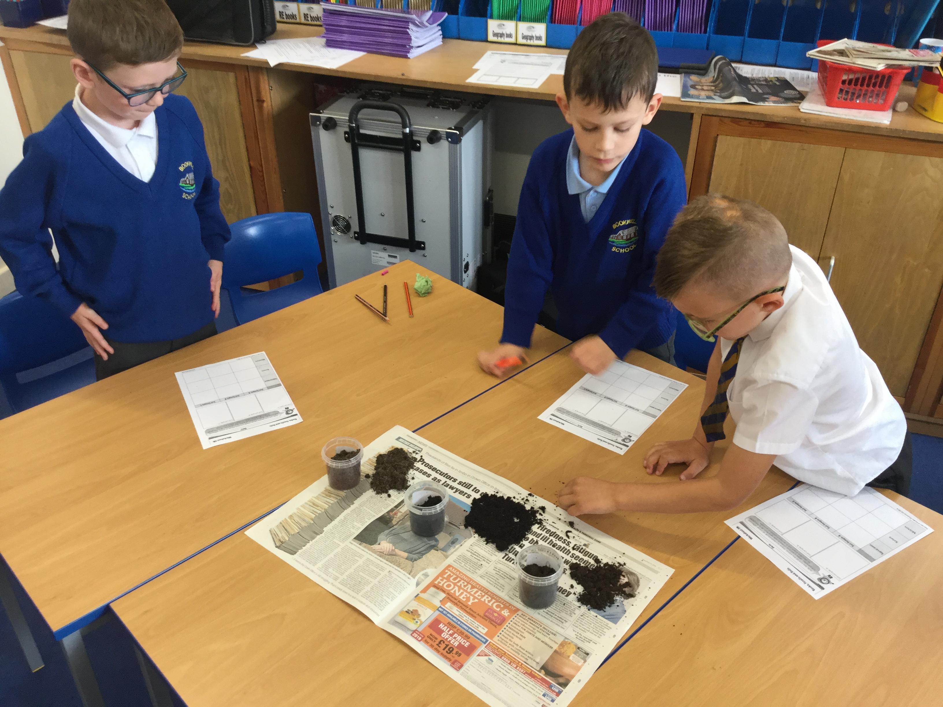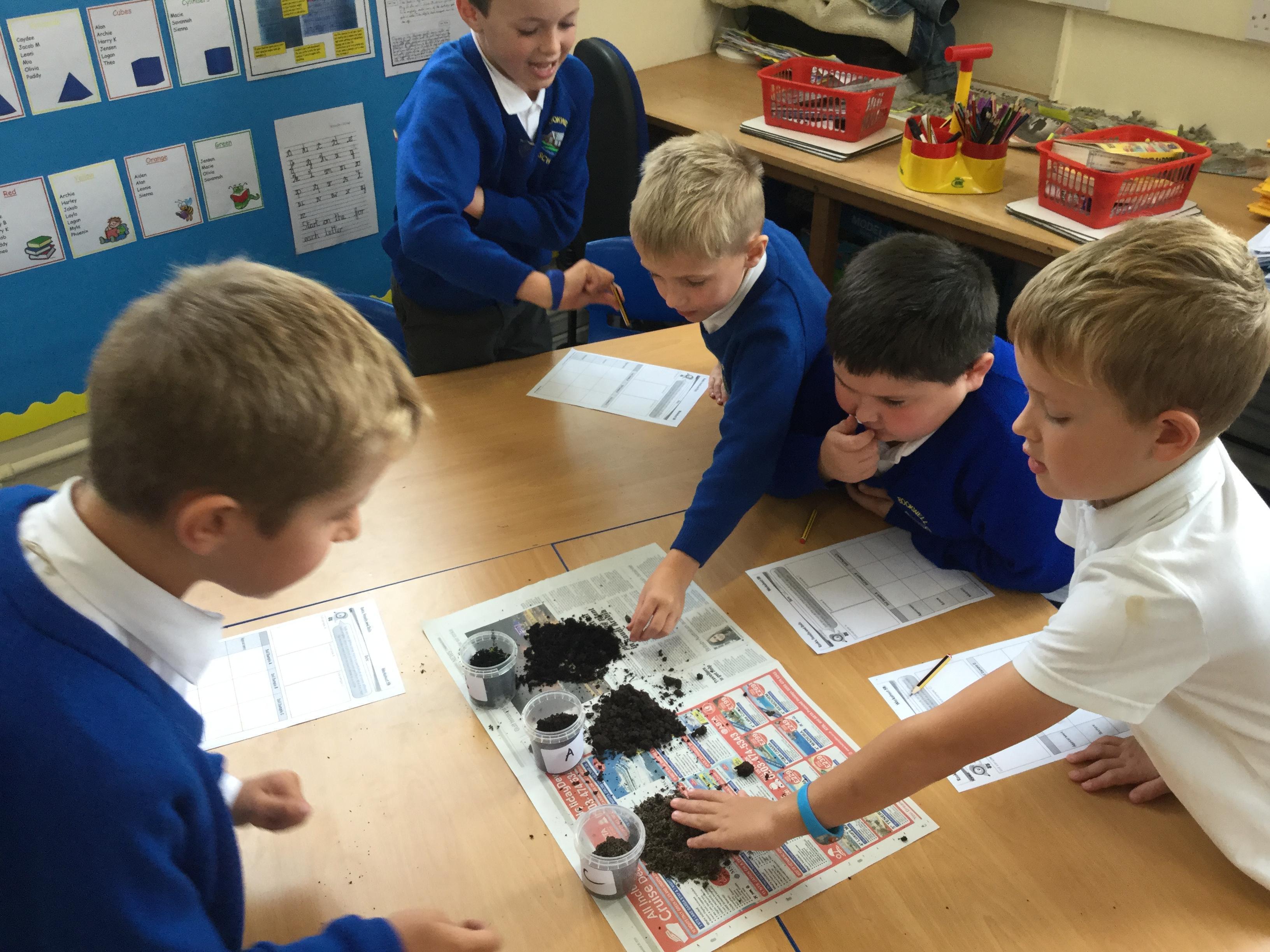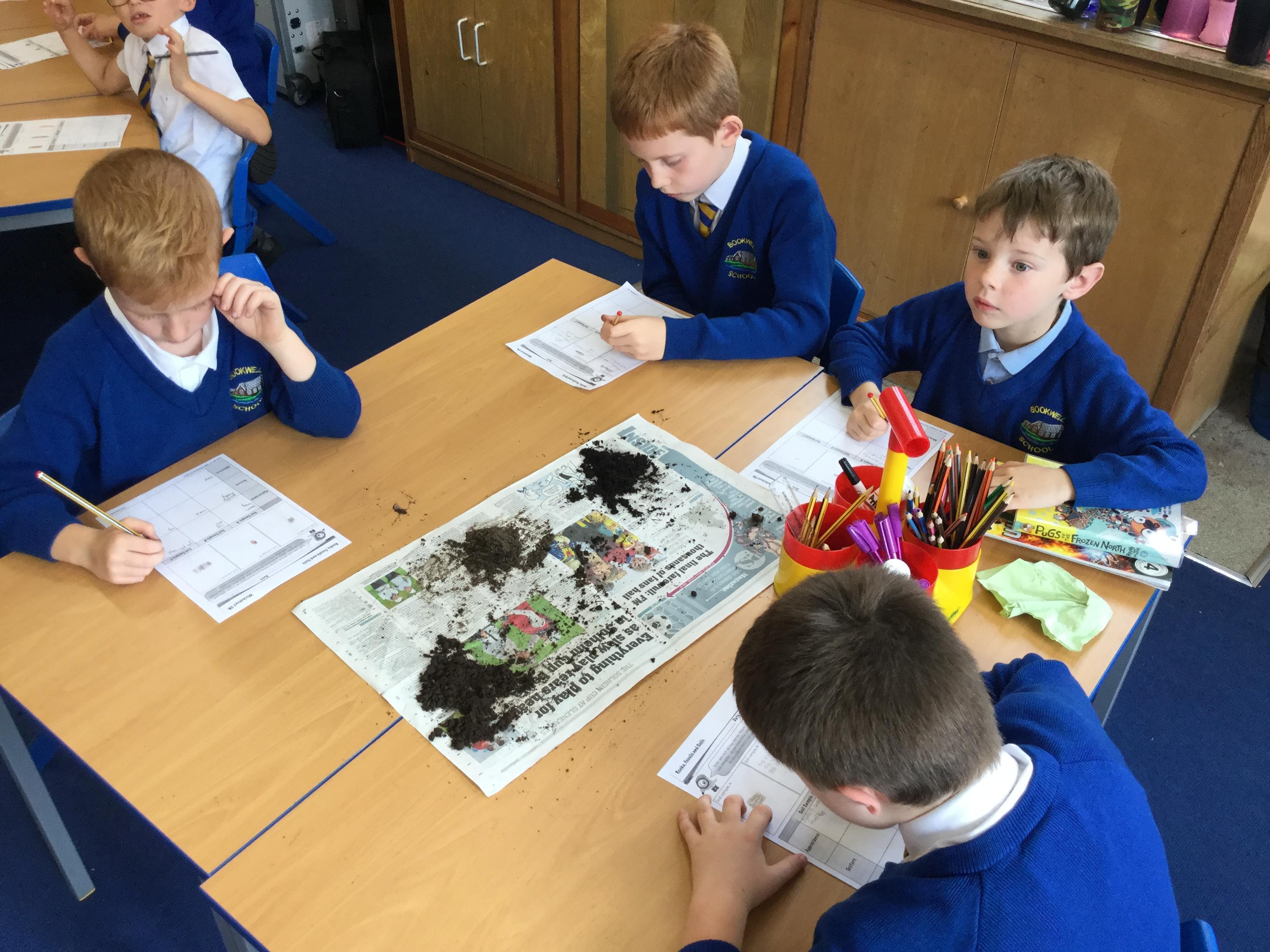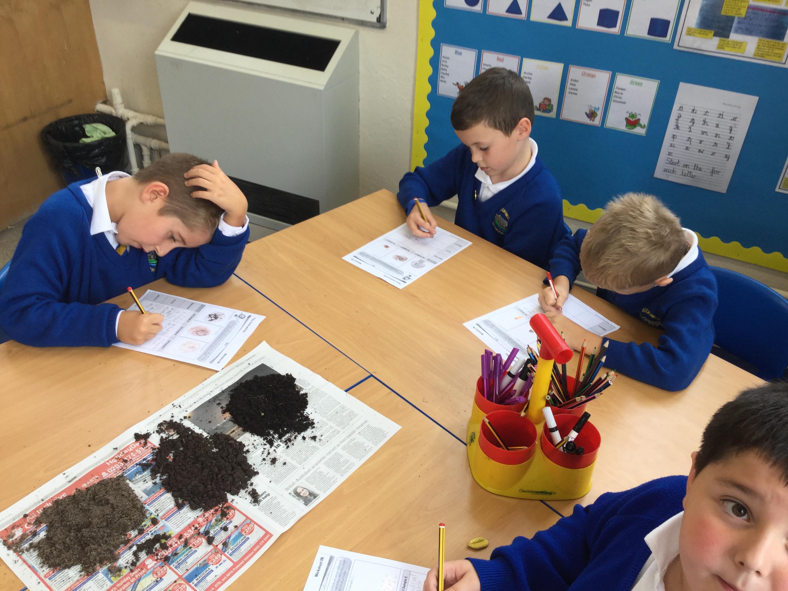 Today, the class studied 3 different soil samples taken from the school grounds. They had to compare them and note any differences in appearance, texture and moisture. The children learnt that soil is made up of organic material, rocks, clay and sand. They also discovered quite a few creepy crawlies too!
