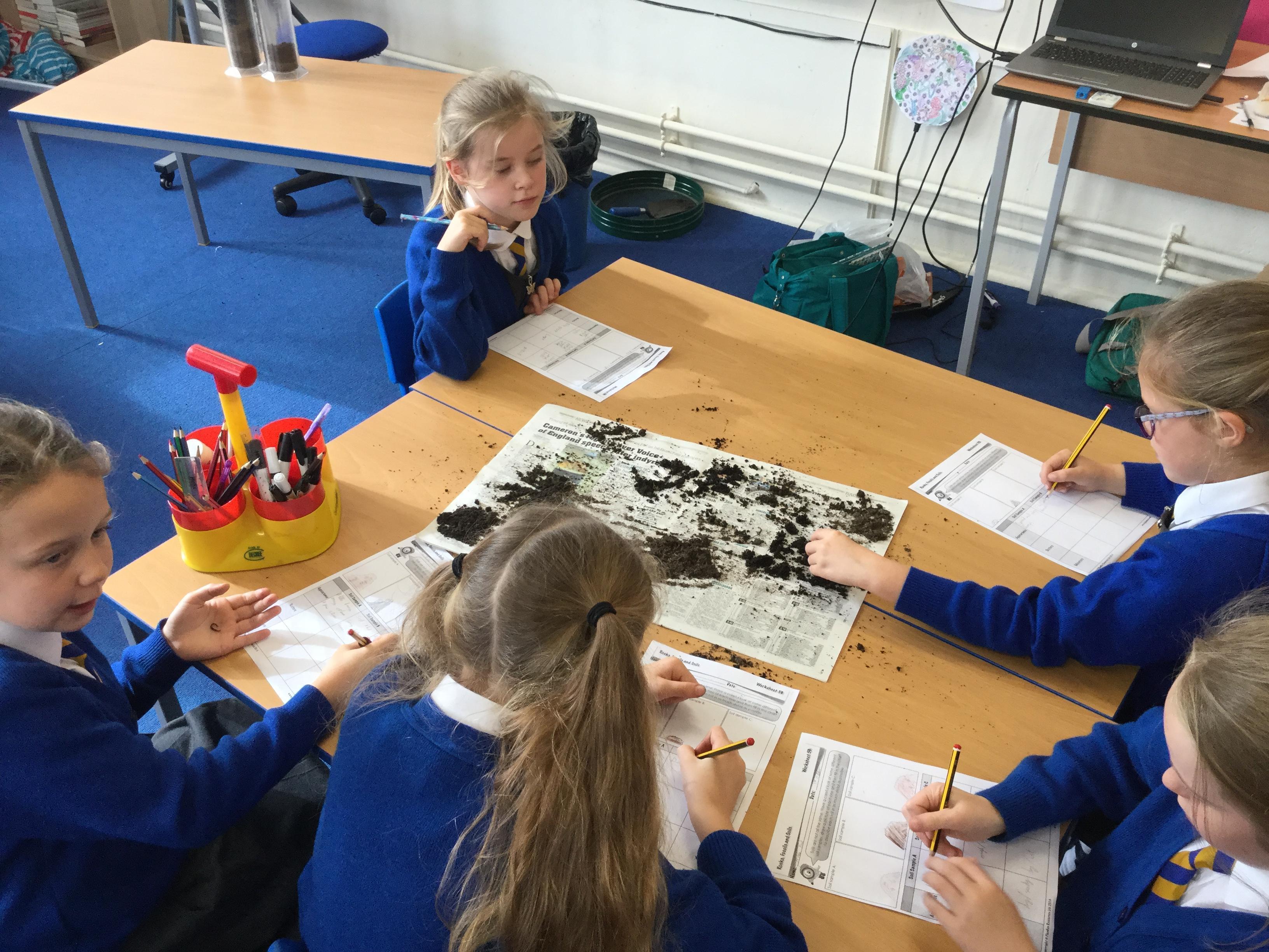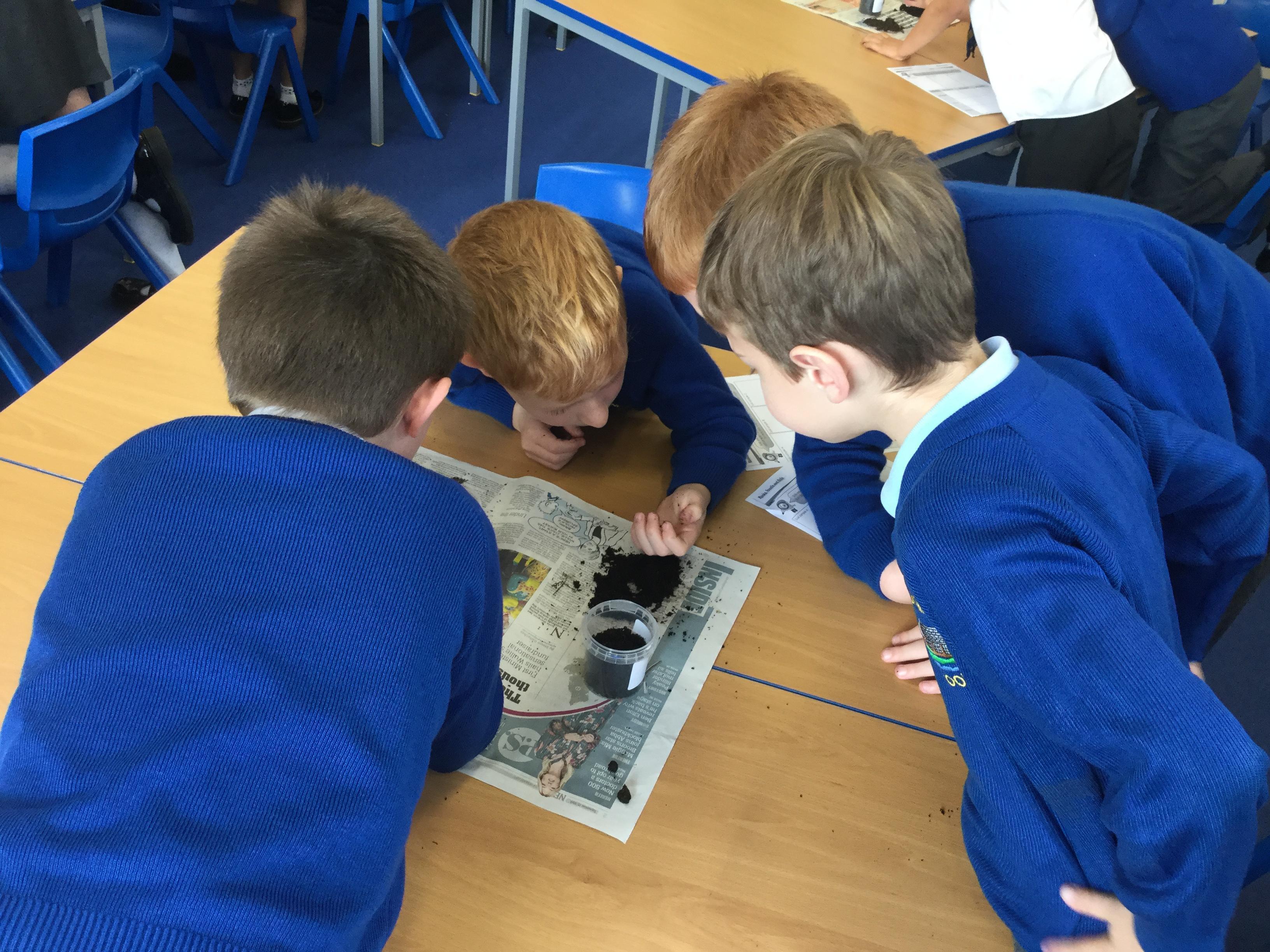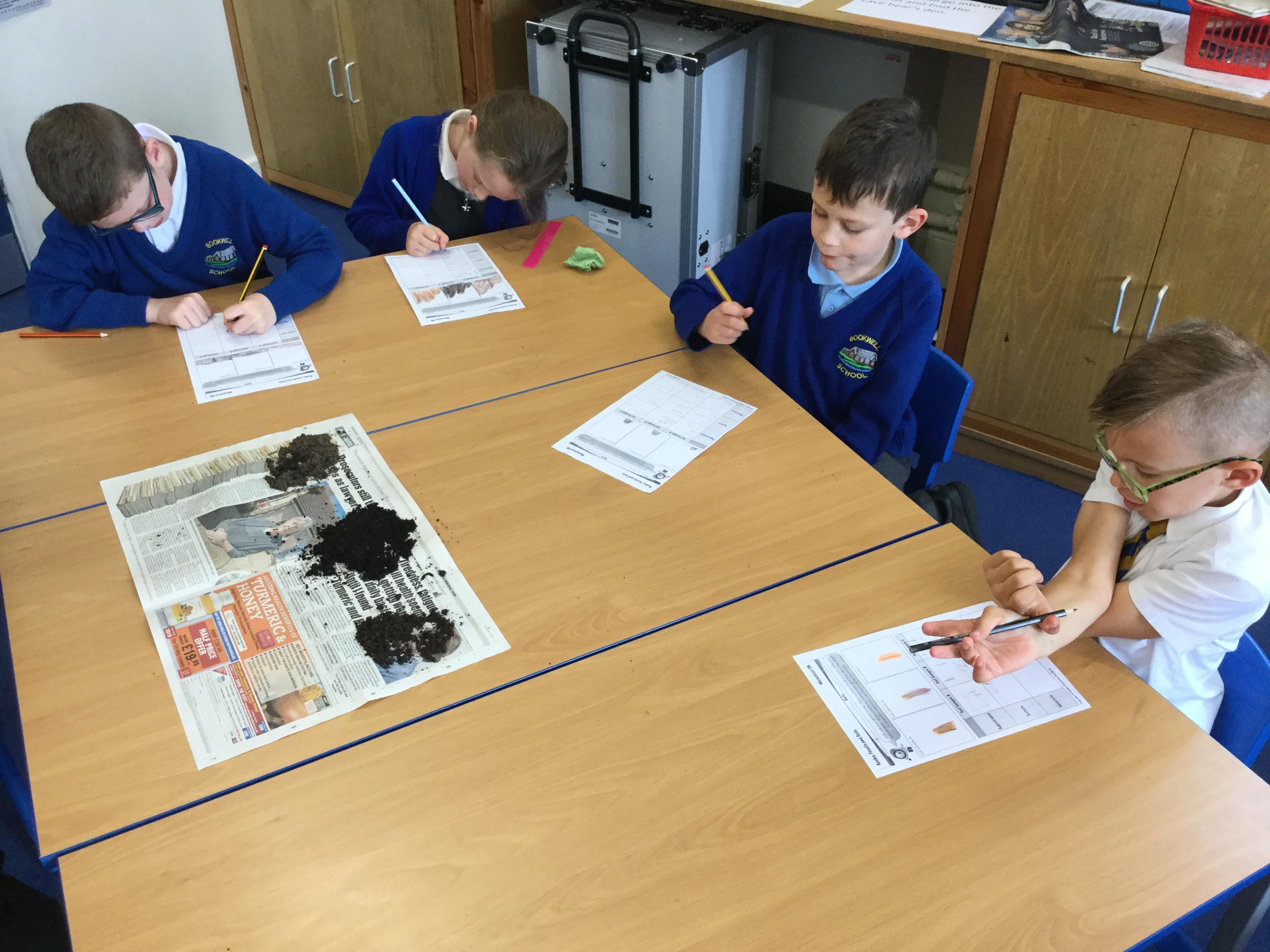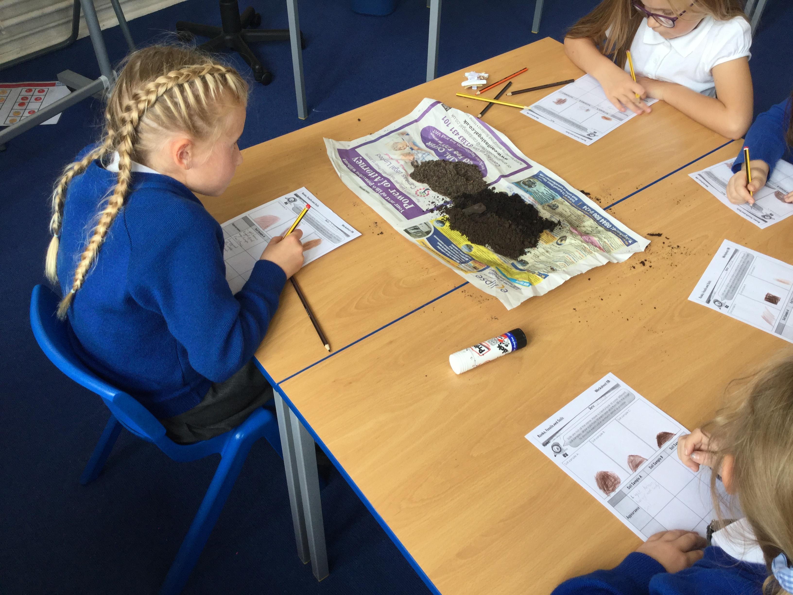 Today, the class studied 3 different soil samples taken from the school grounds. They had to compare them and note any differences in appearance, texture and moisture. The children learnt that soil is made up of organic material, rocks, clay and sand. They also discovered quite a few creepy crawlies too!