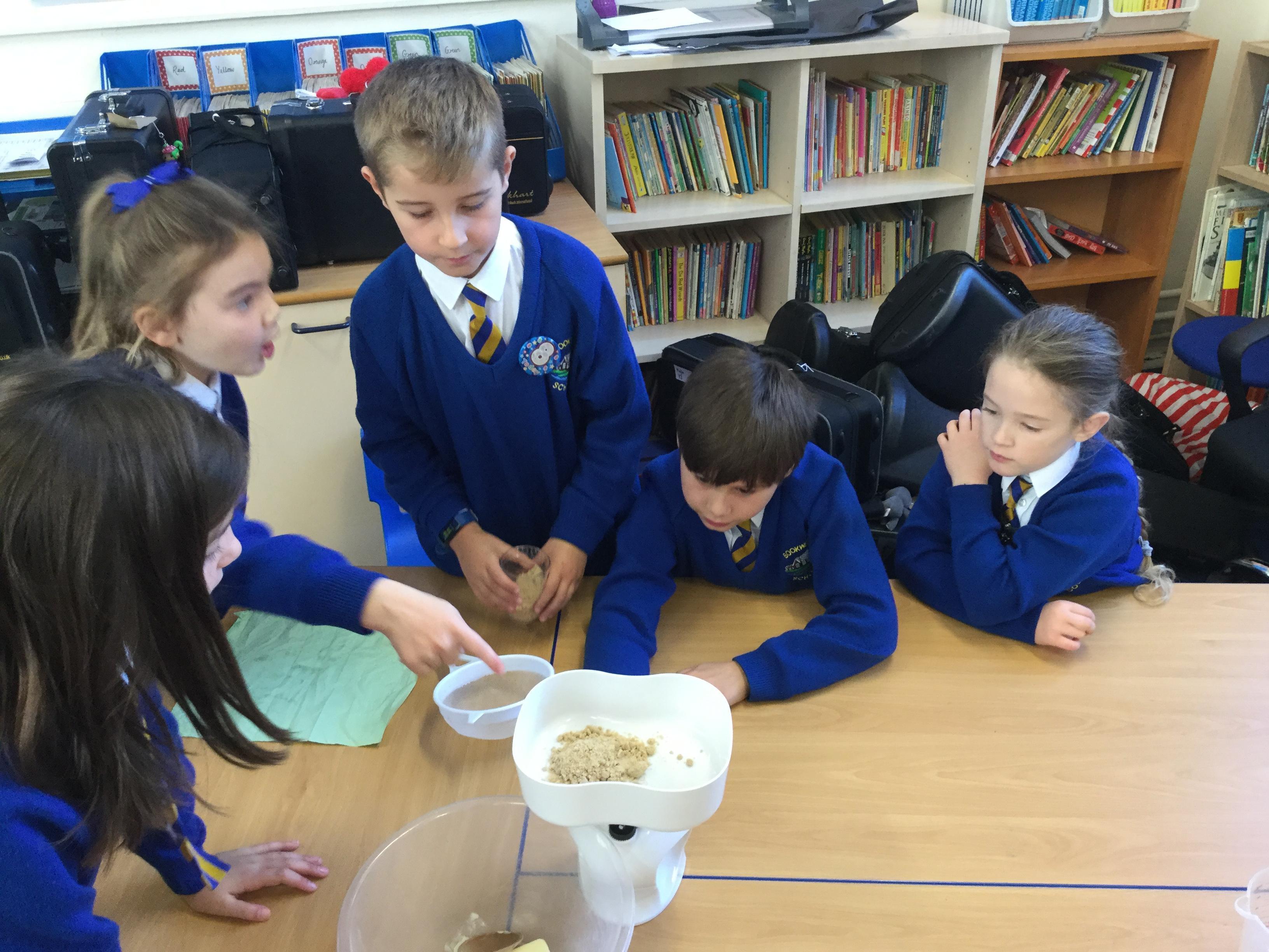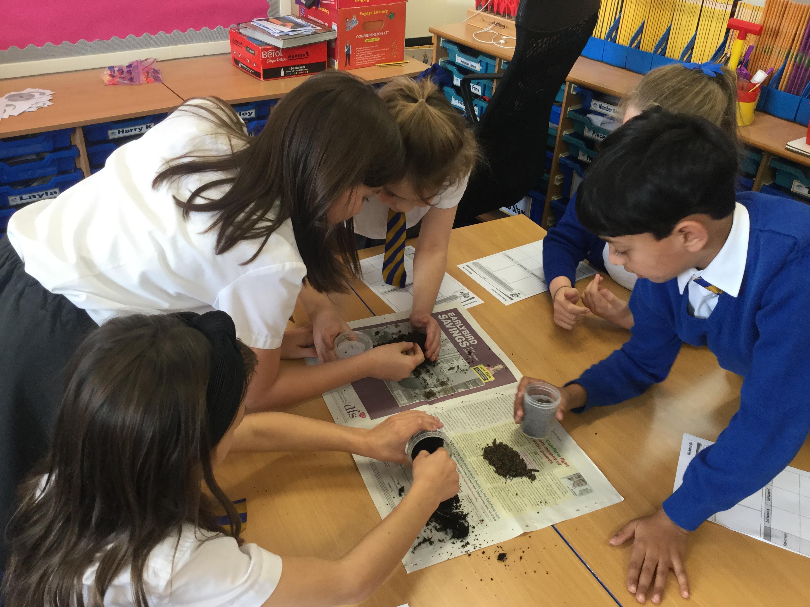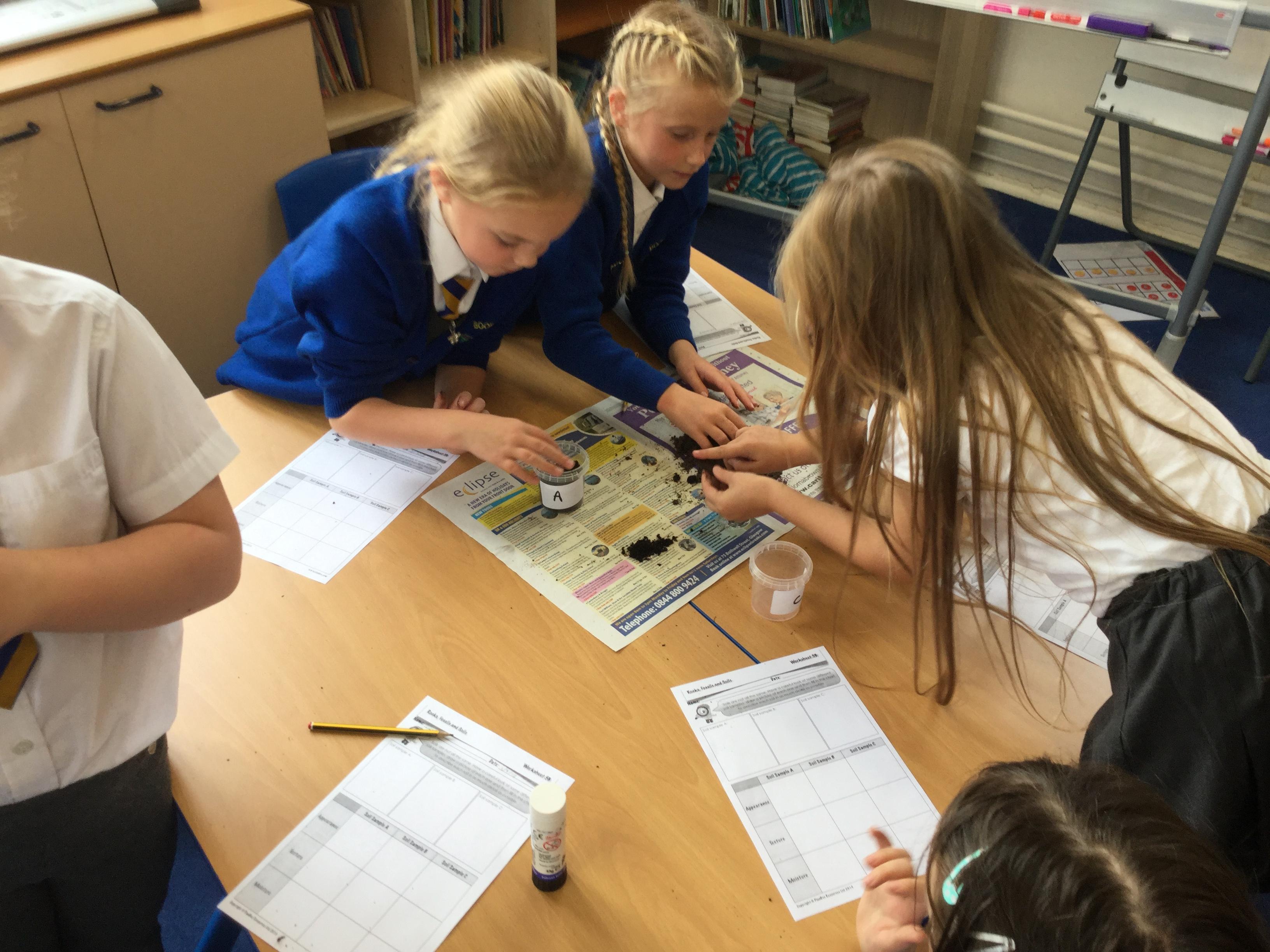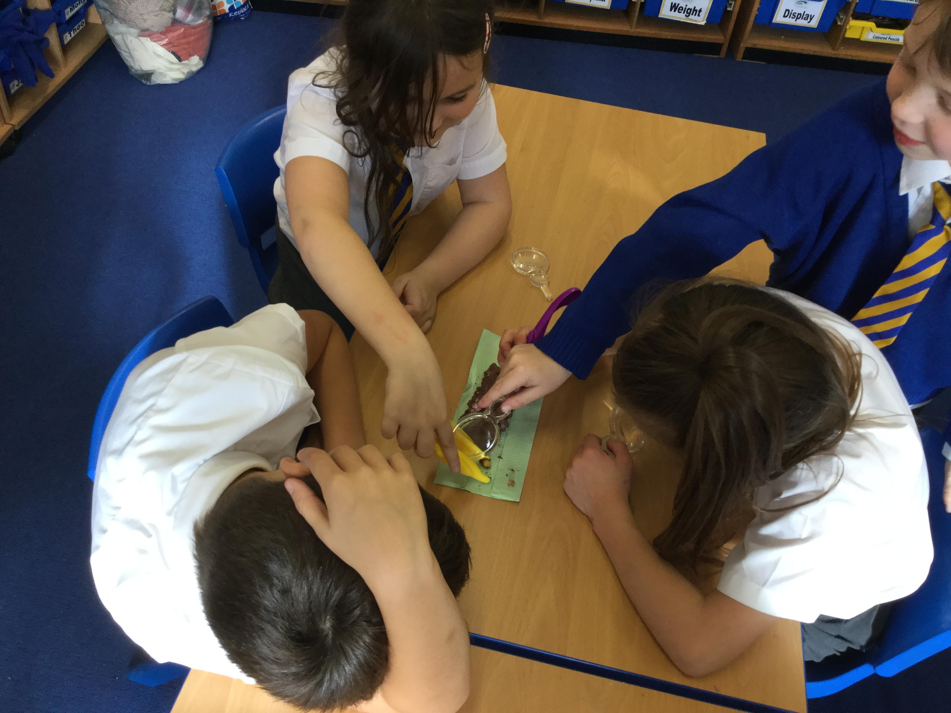 Today, the class studied 3 different soil samples taken from the school grounds. They had to compare them and note any differences in appearance, texture and moisture. The children learnt that soil is made up of organic material, rocks, clay and sand. They also discovered quite a few creepy crawlies too!