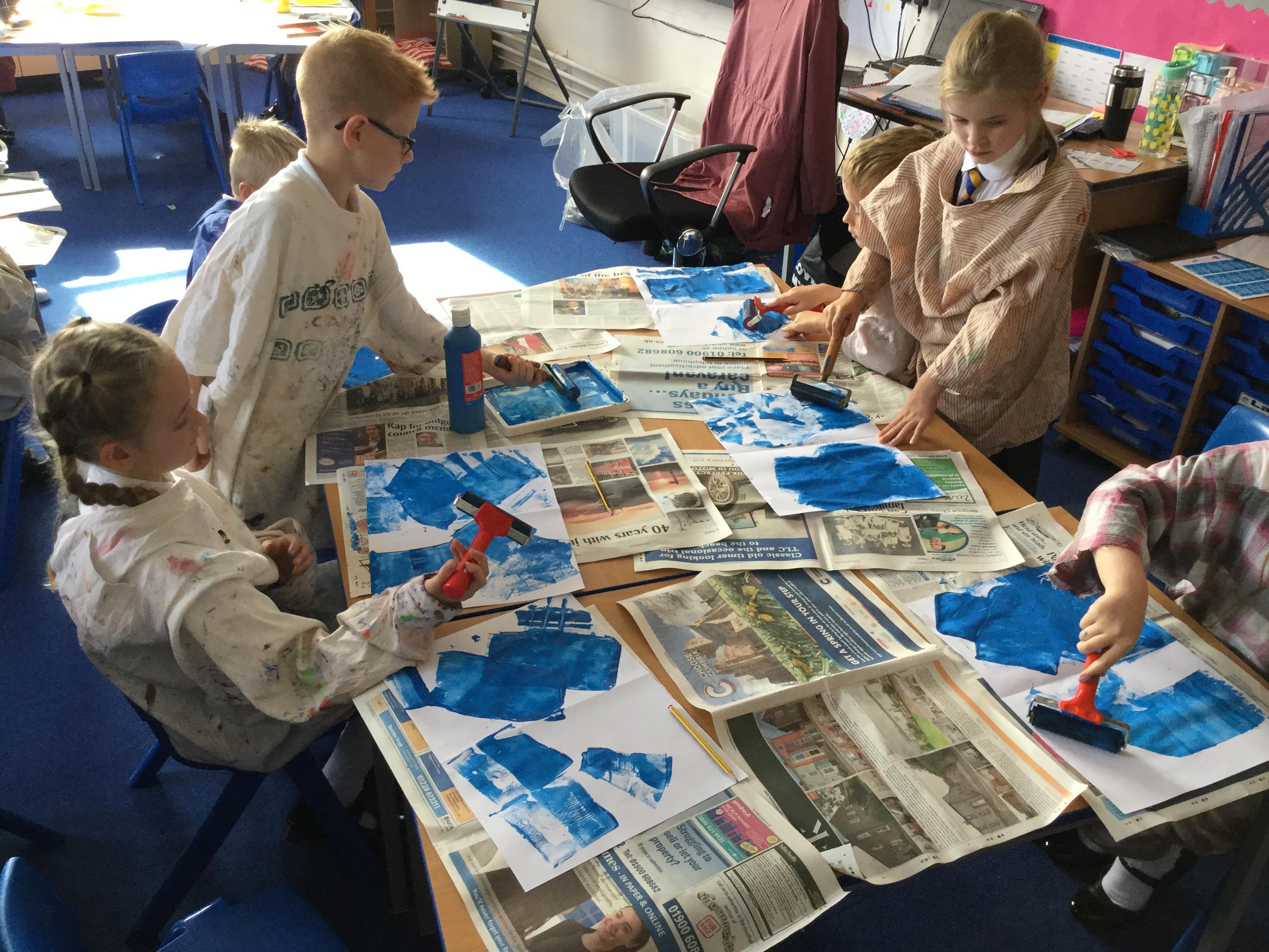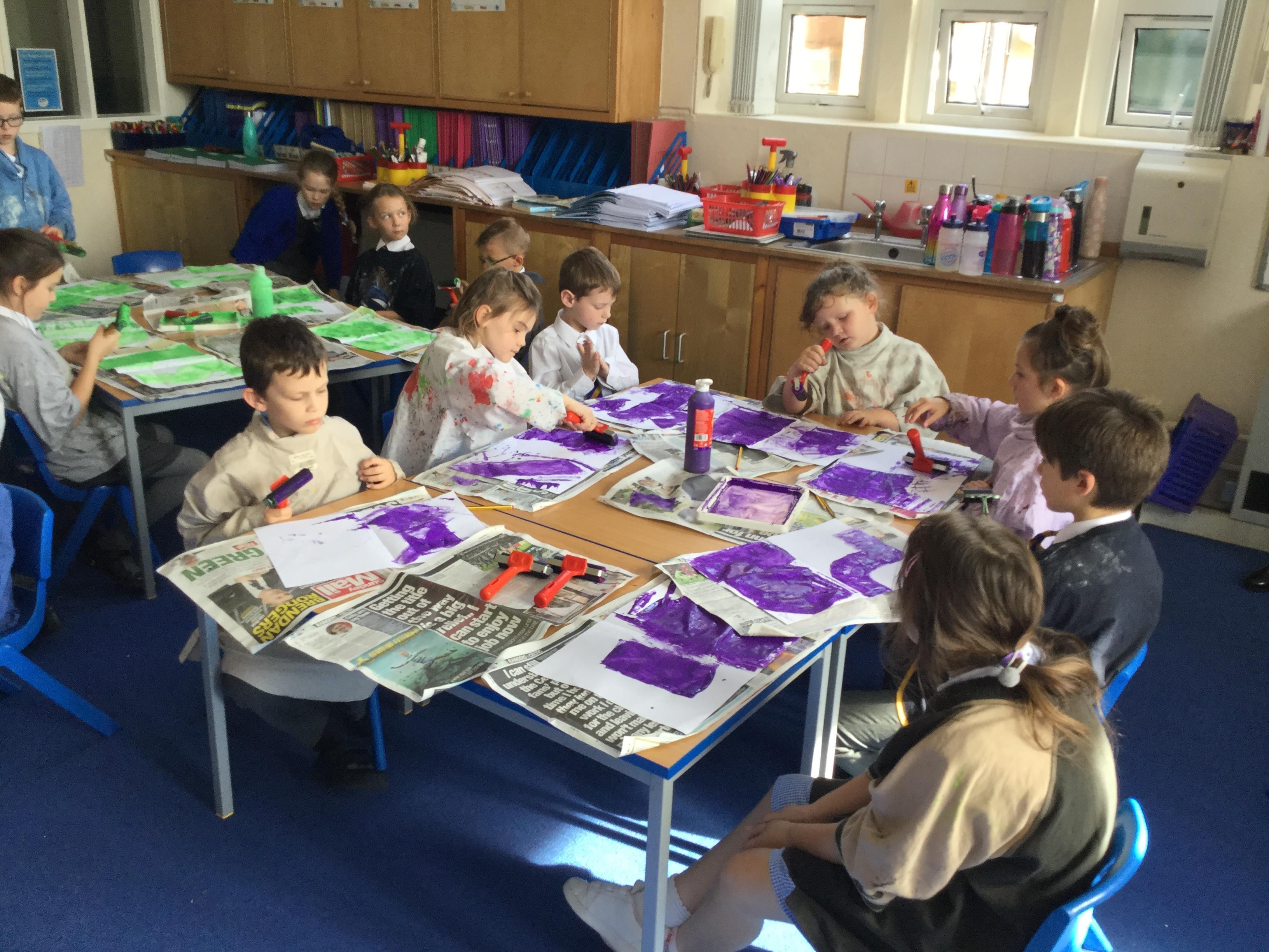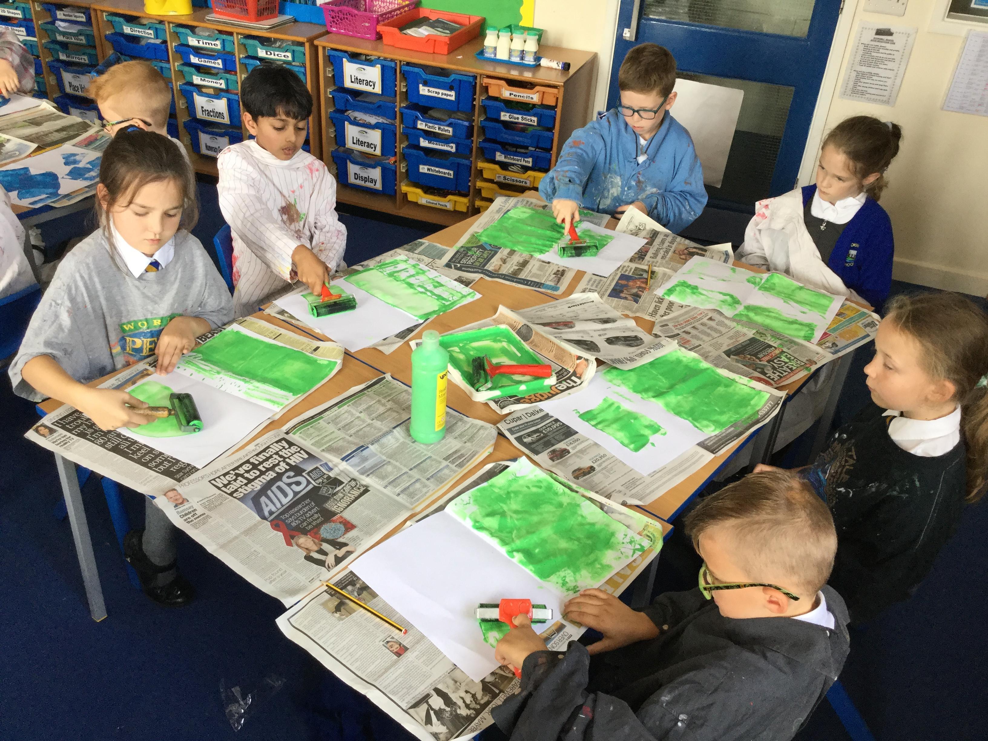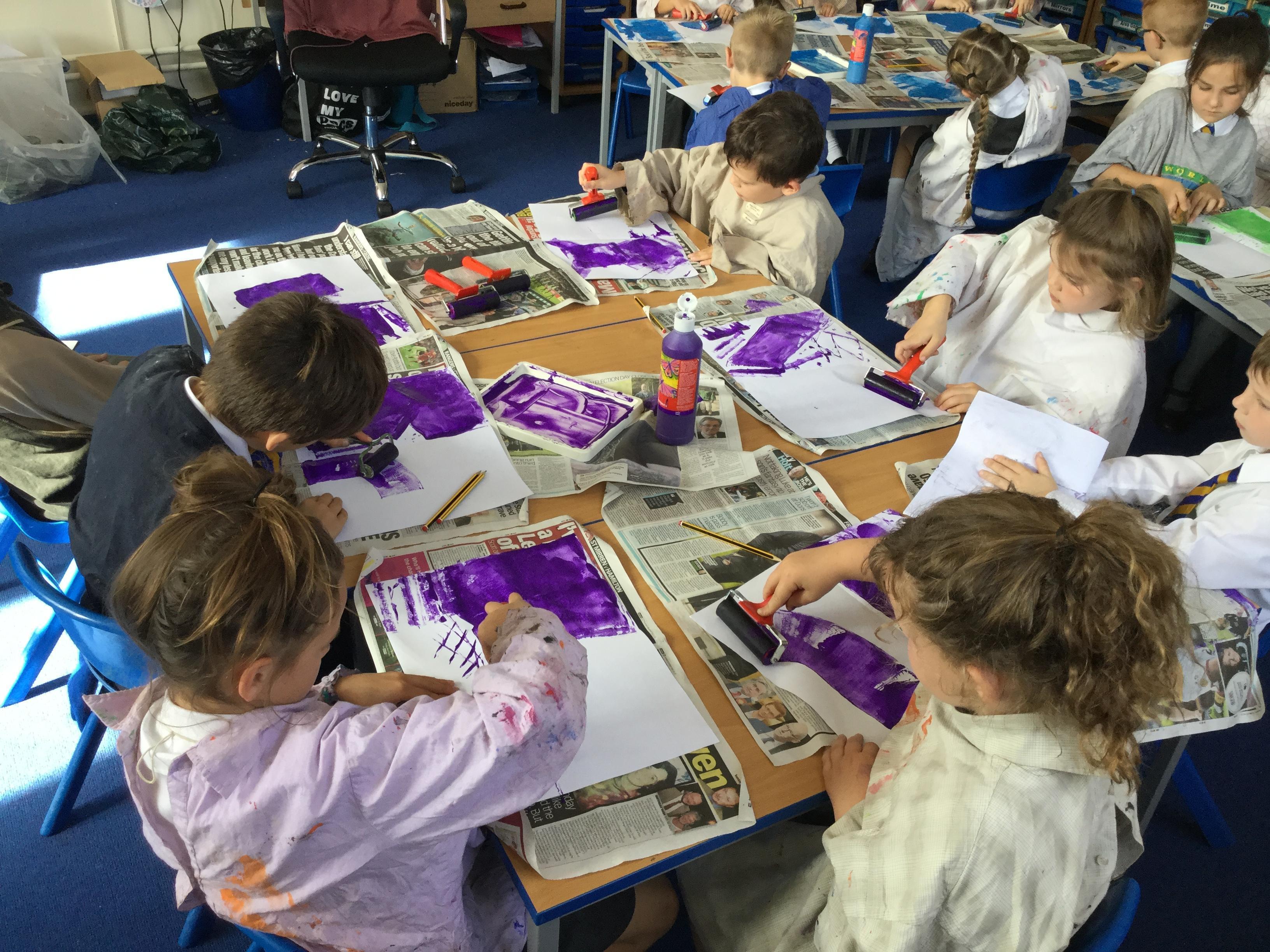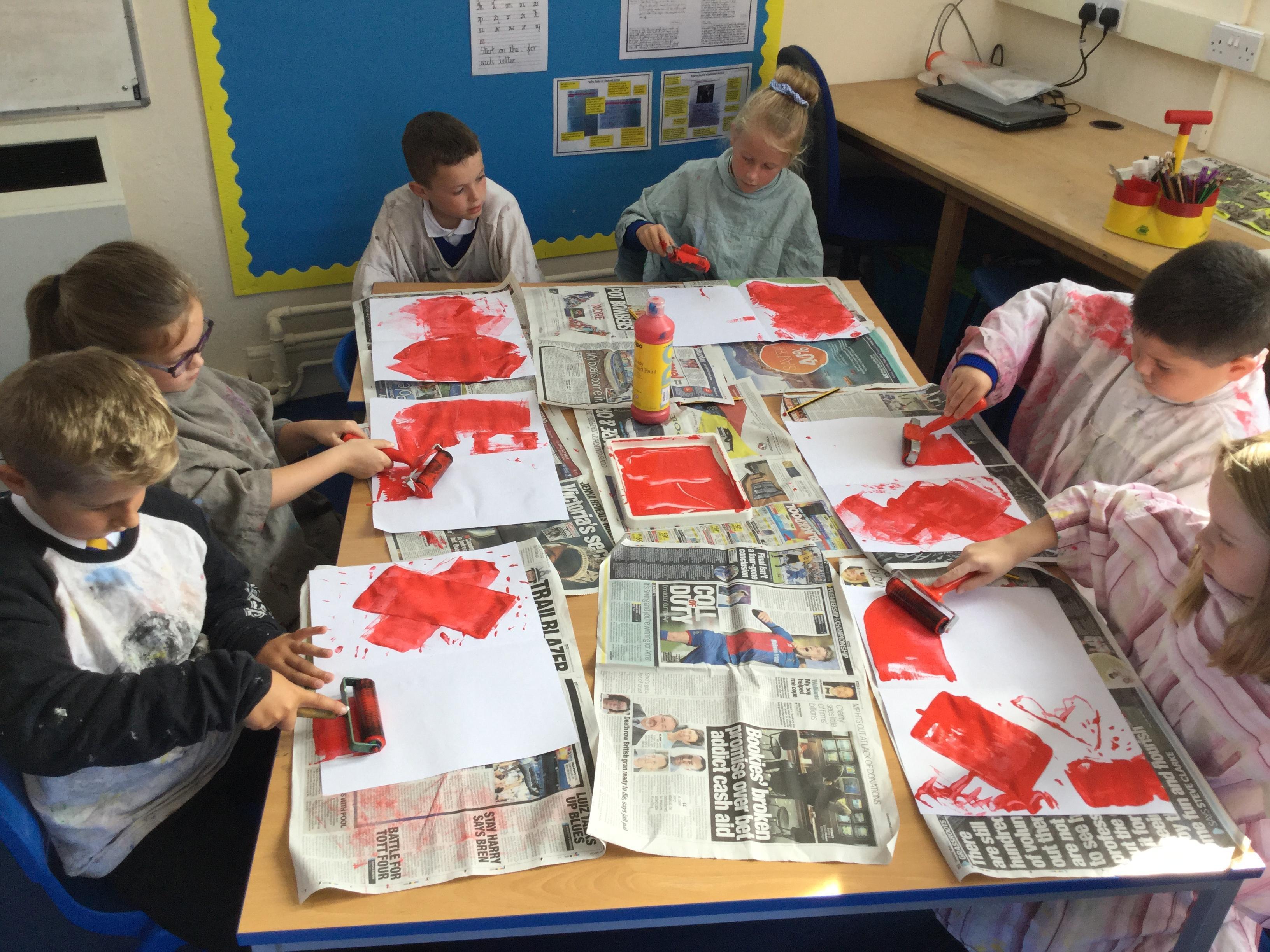 We were inking up paint slabs and experimenting using rollers today. There were lots of different ways to use the roller to print on the paper. One of our favourites was using the side of the roller.
