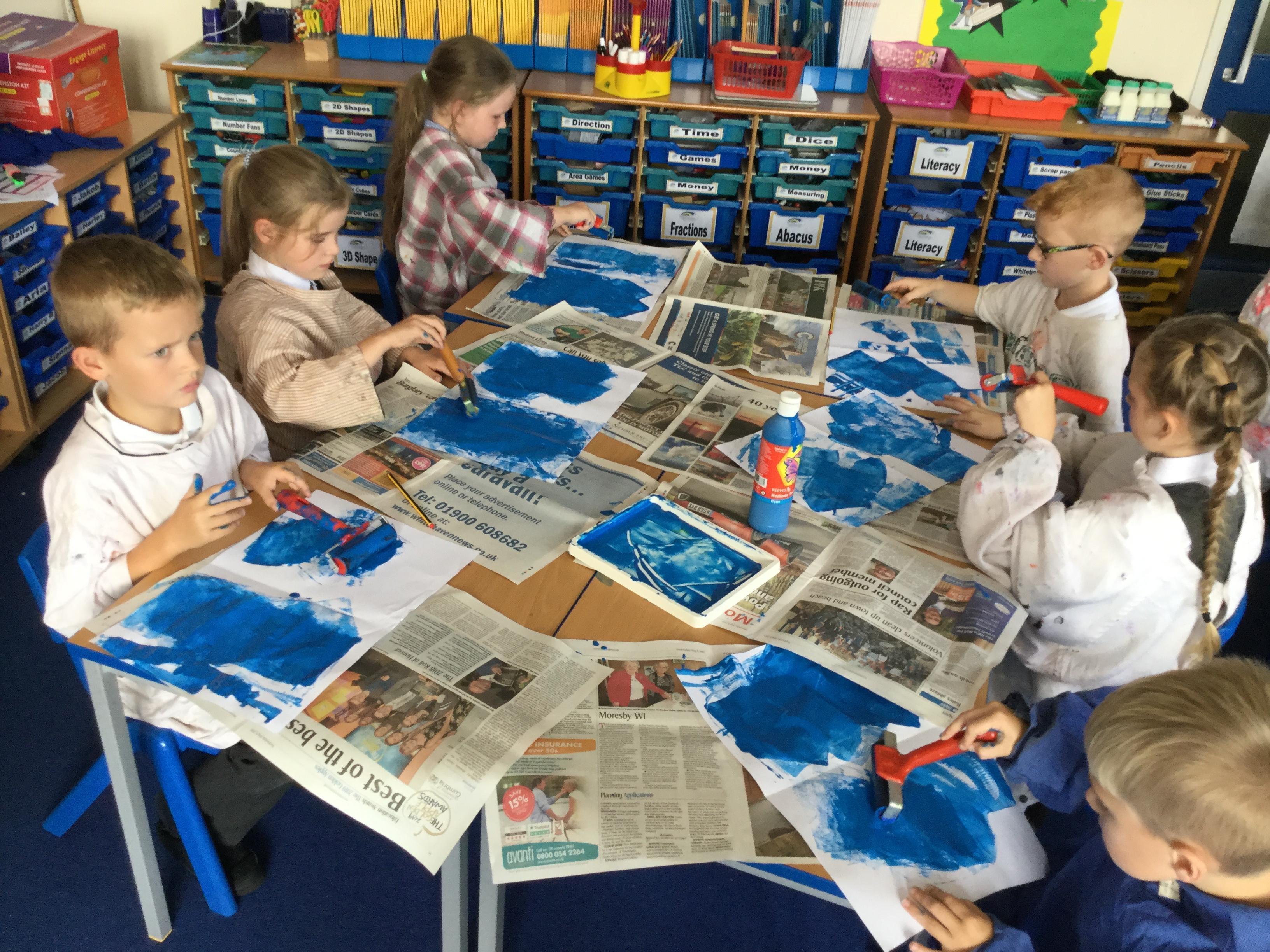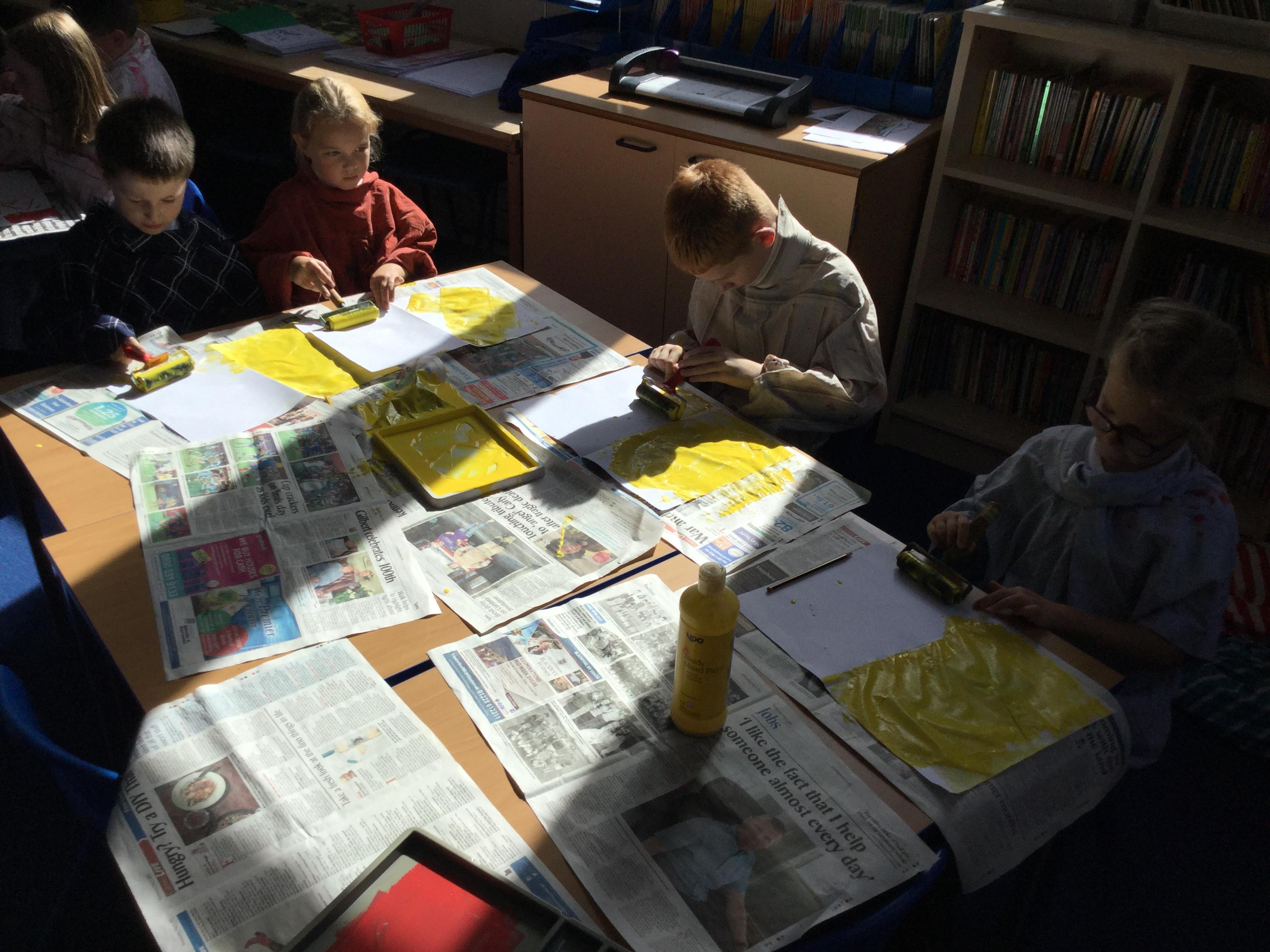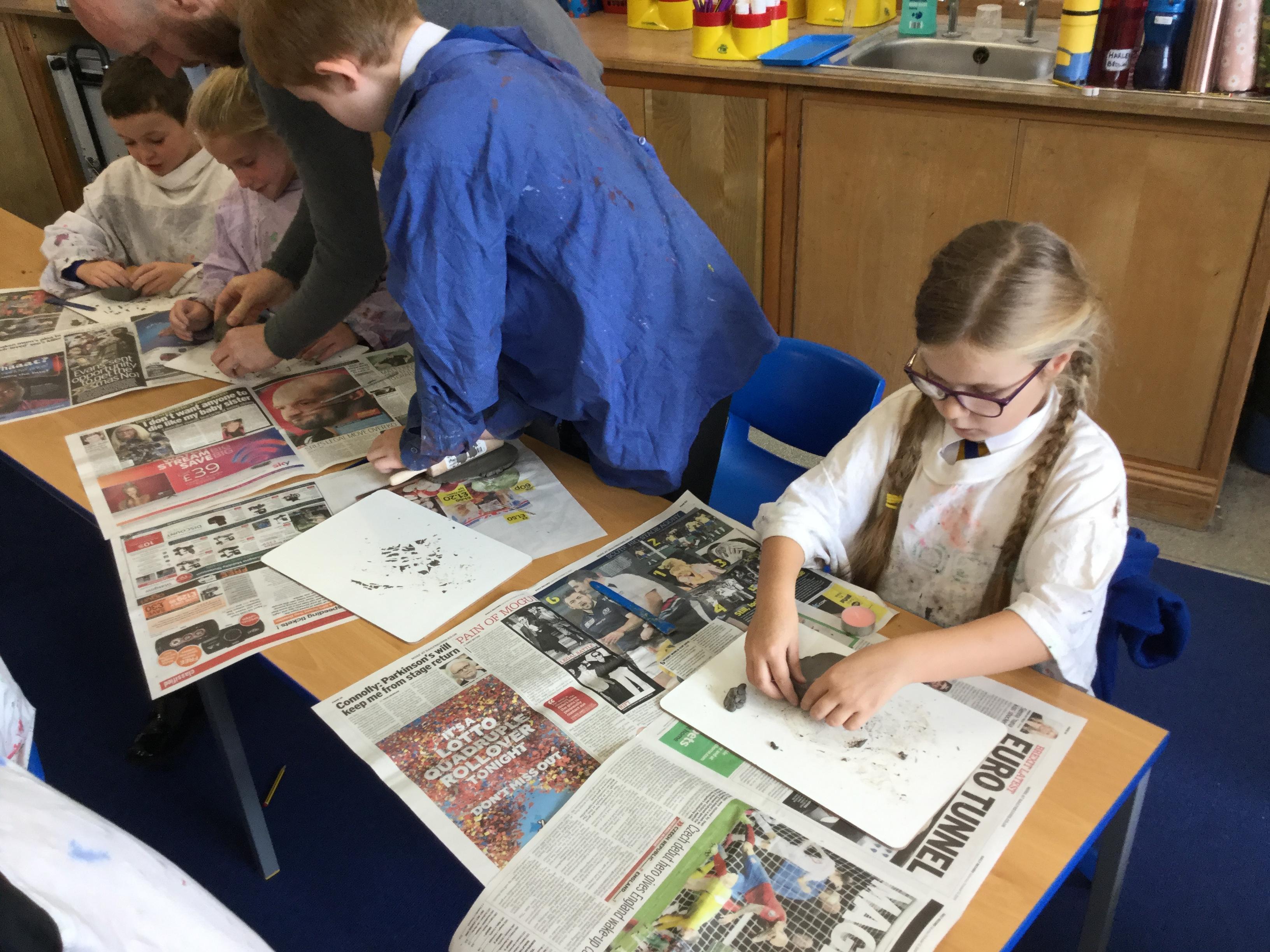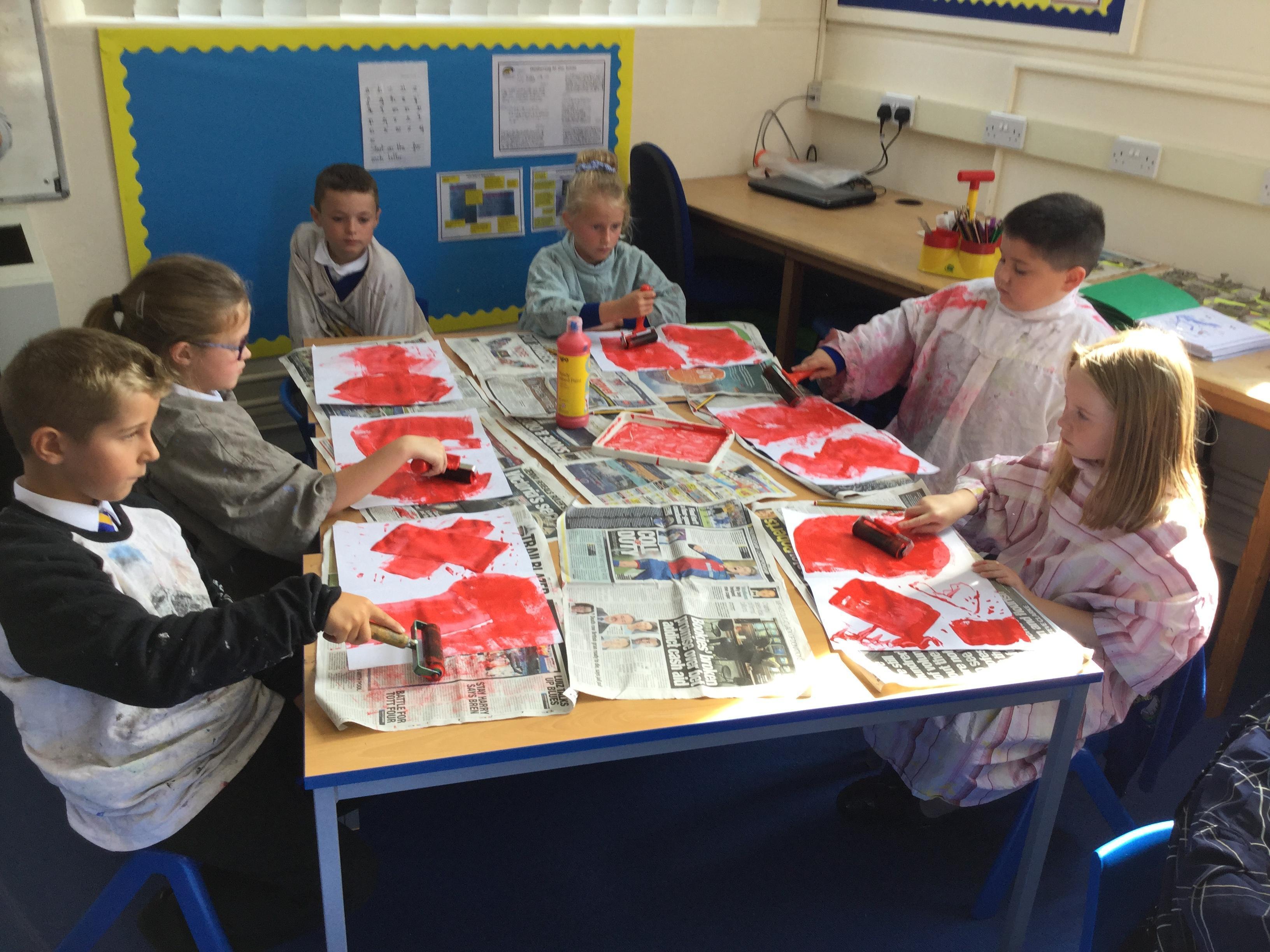 We were inking up paint slabs and experimenting using rollers today. There were lots of different ways to use the roller to print on the paper. One of our favourites was using the side of the roller.