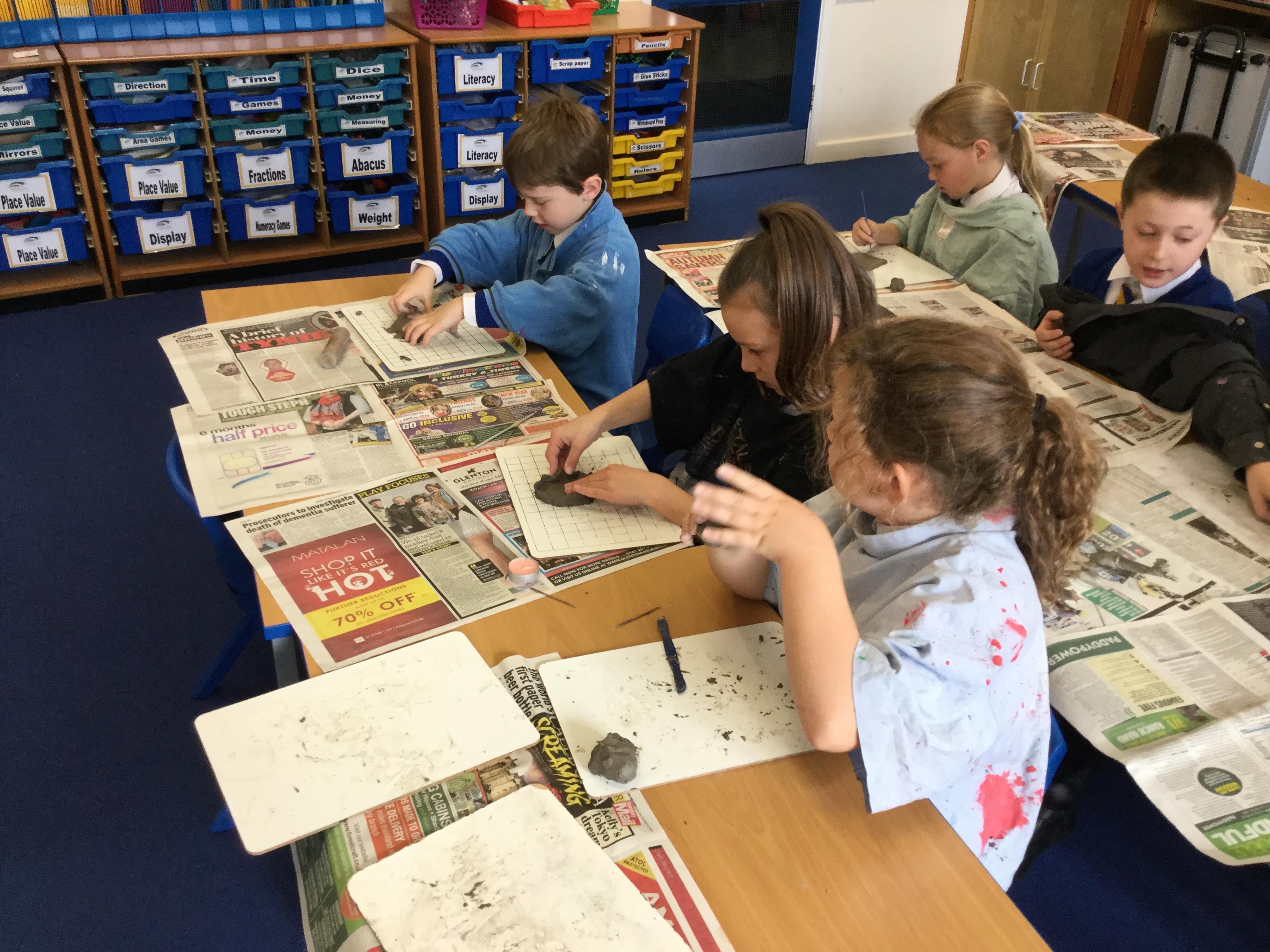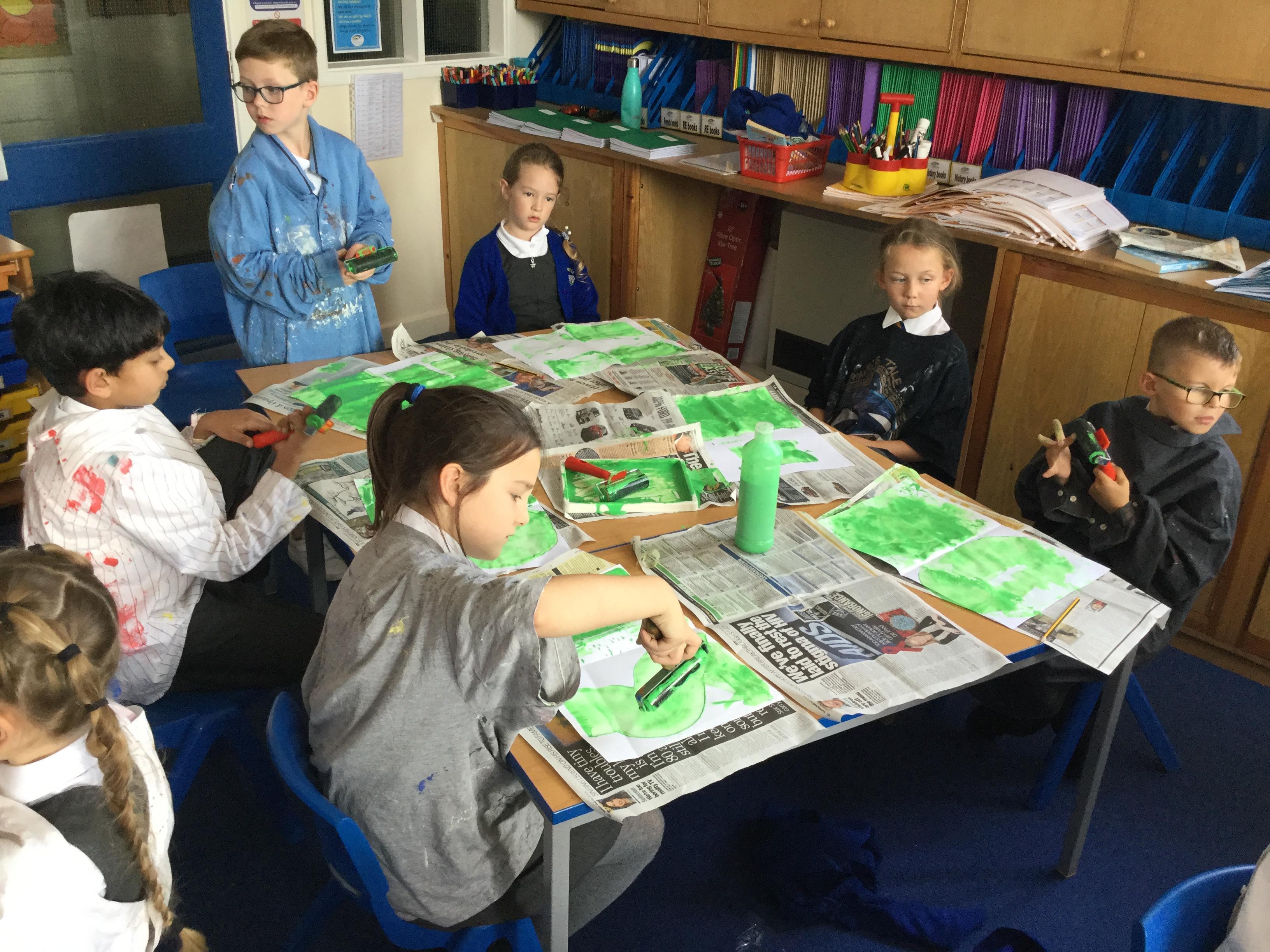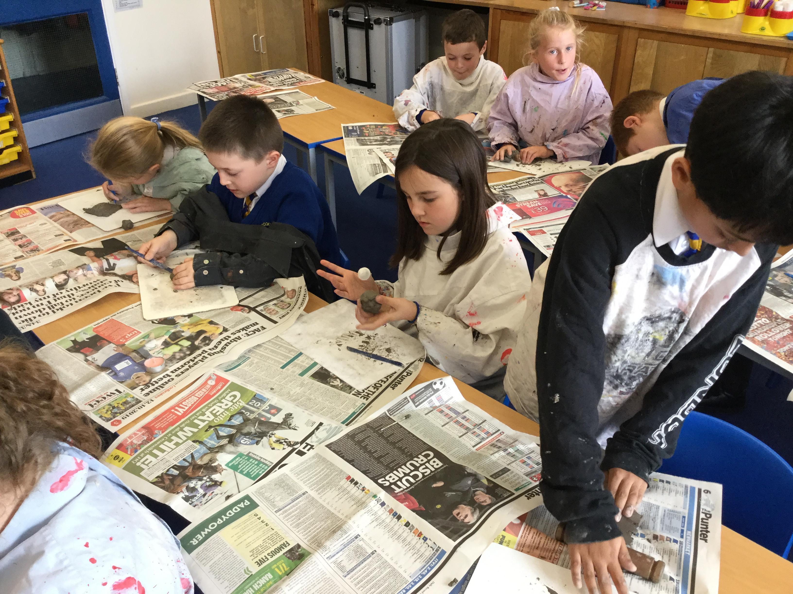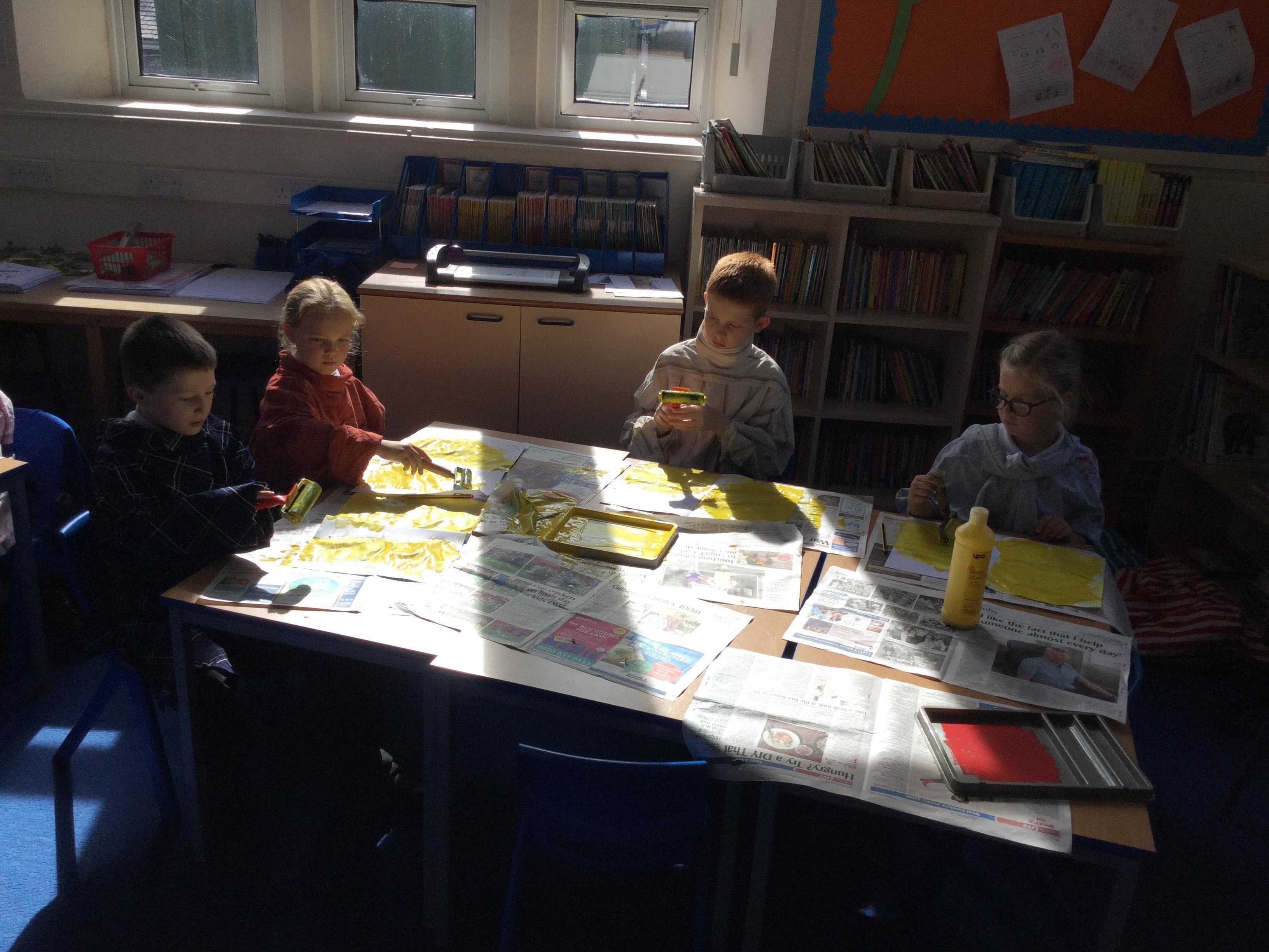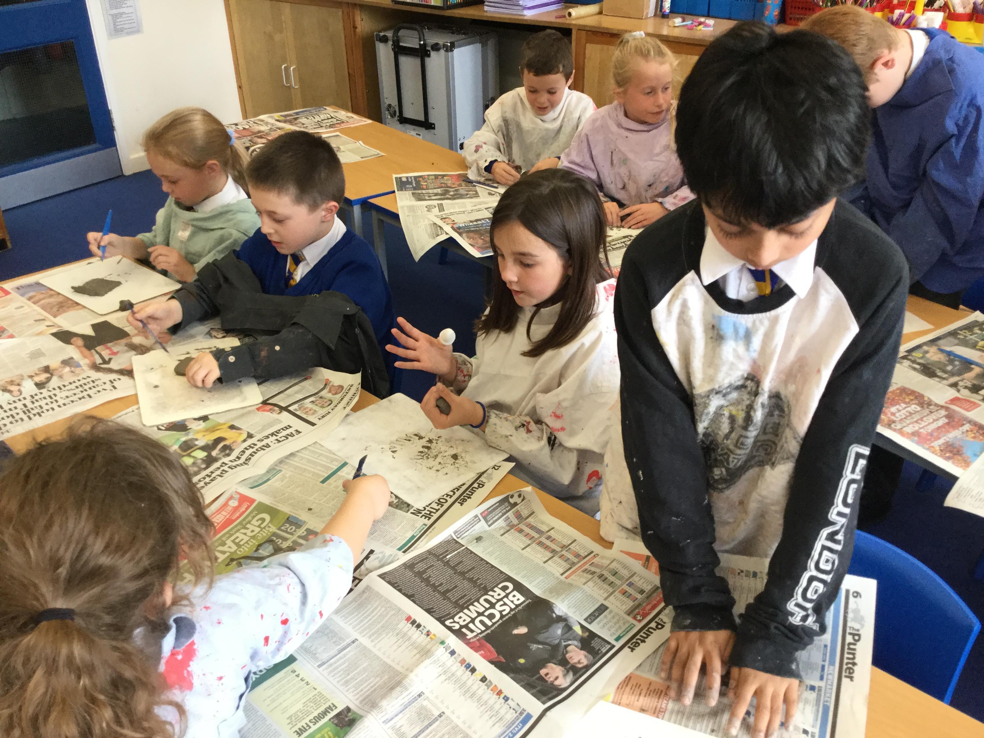 We were inking up paint slabs and experimenting using rollers today. There were lots of different ways to use the roller to print on the paper. One of our favourites was using the side of the roller.