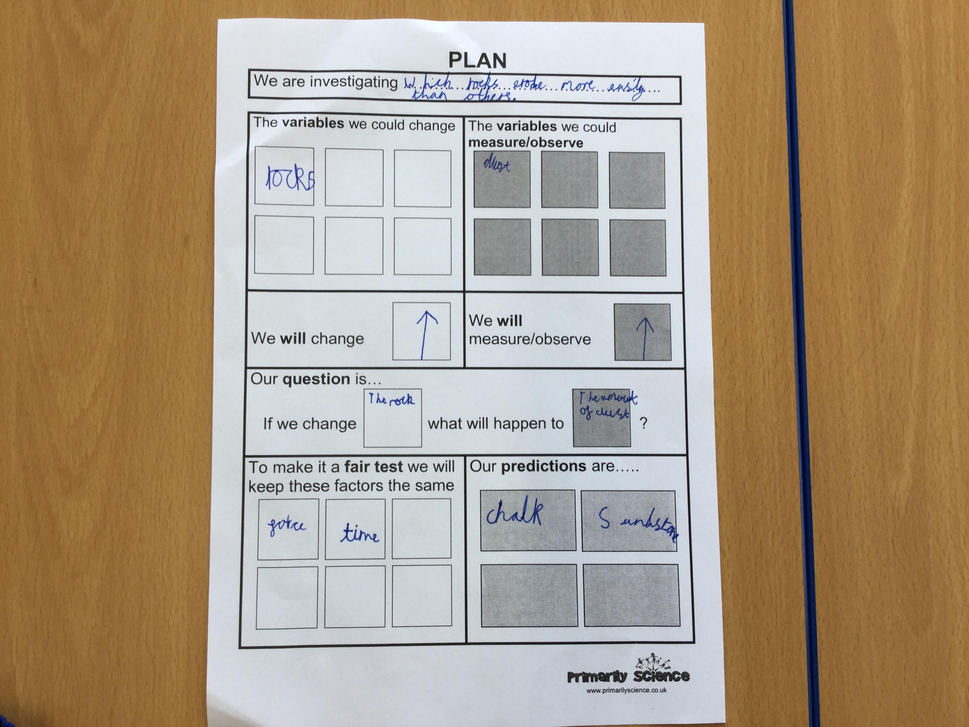 Our science investigation this week was to find out if some rocks erode easier than others. In our groups, we filled out our investigation plan which included our variables and predictions. We then carried out our investigation using rocks, a plastic tub, paper towels and a stopwatch. When we evaluated our results, we found that sandstone had created the most rock dust and, therefore, was the rock that eroded the easiest out of our selection.