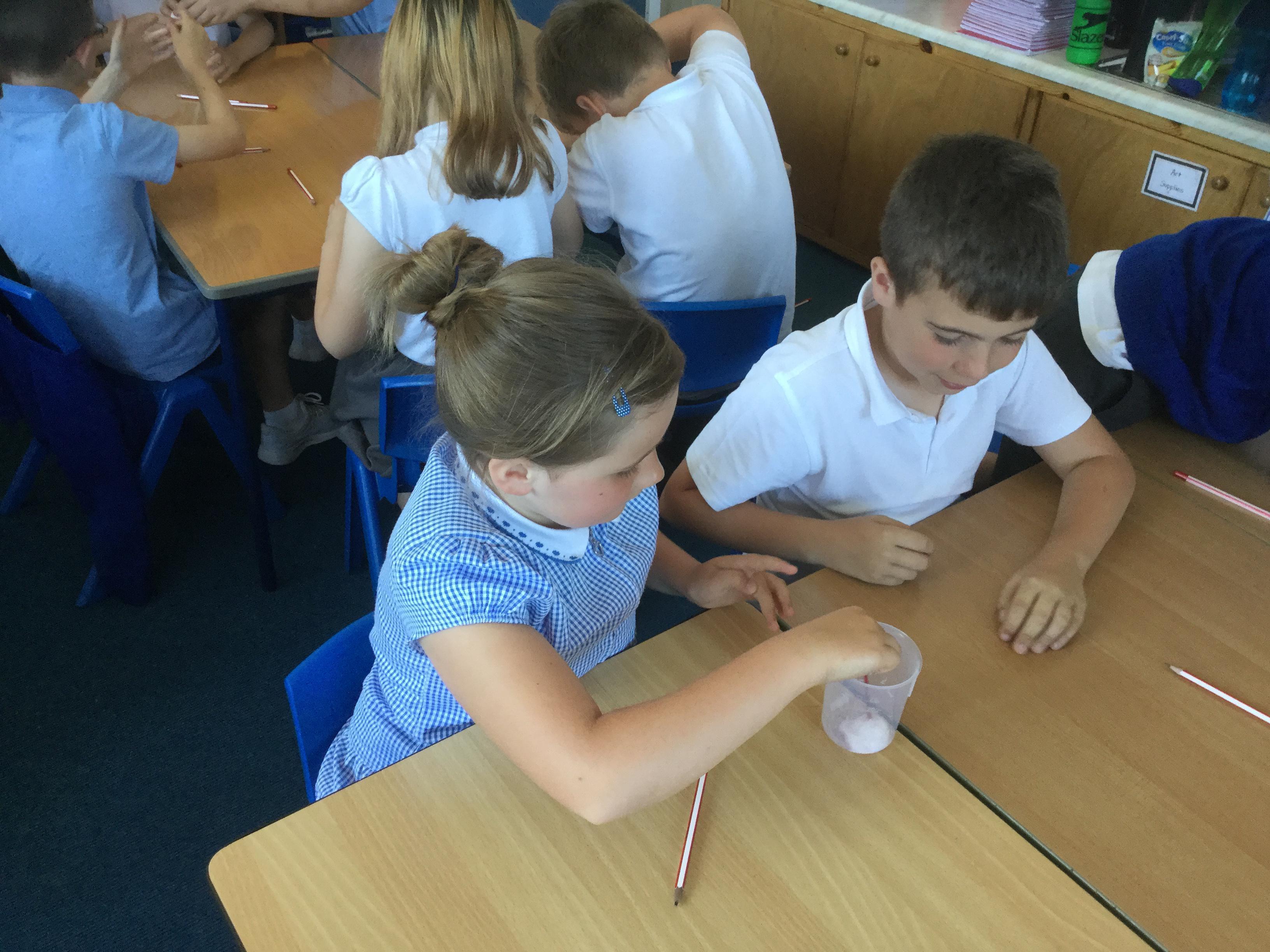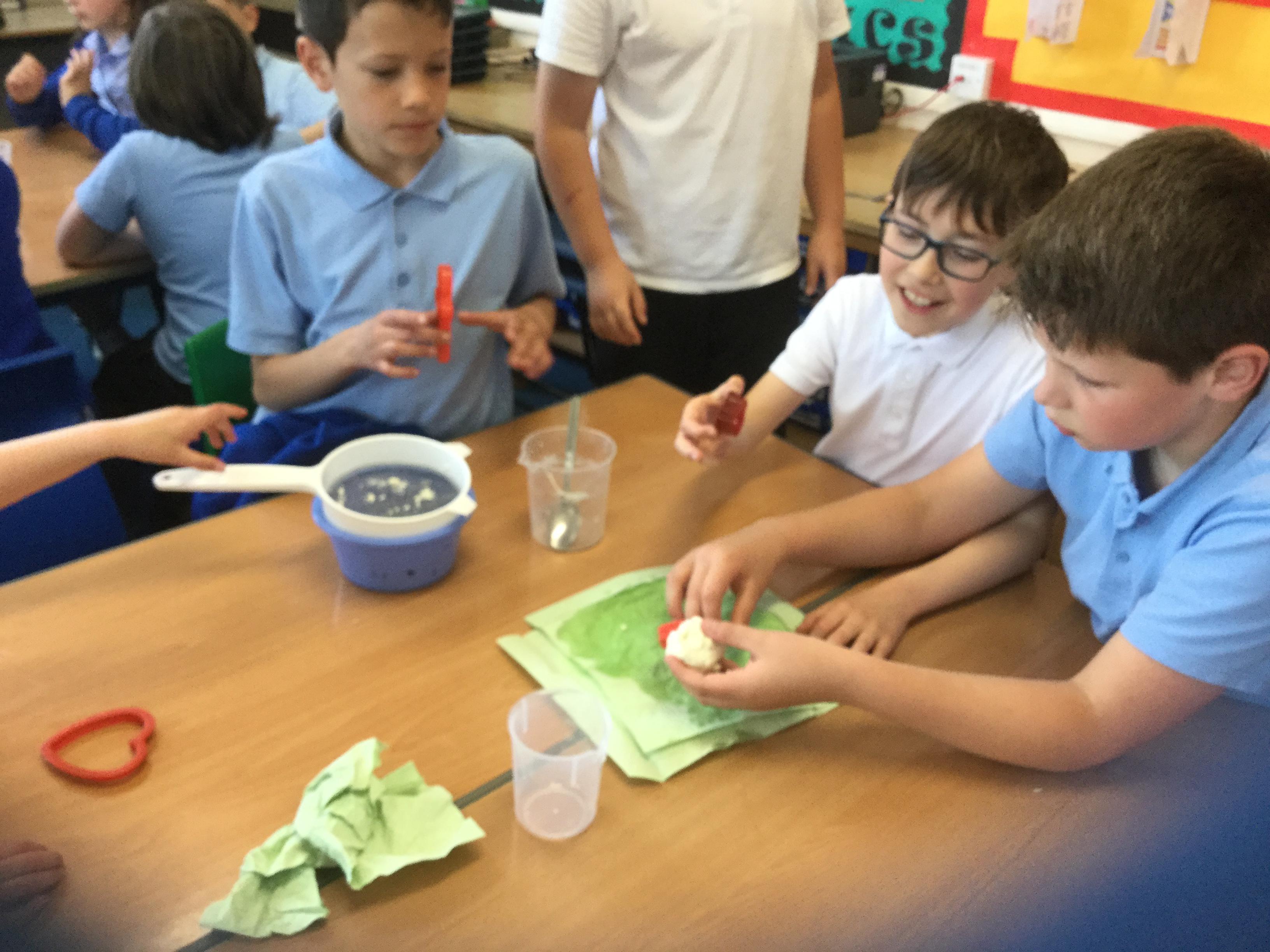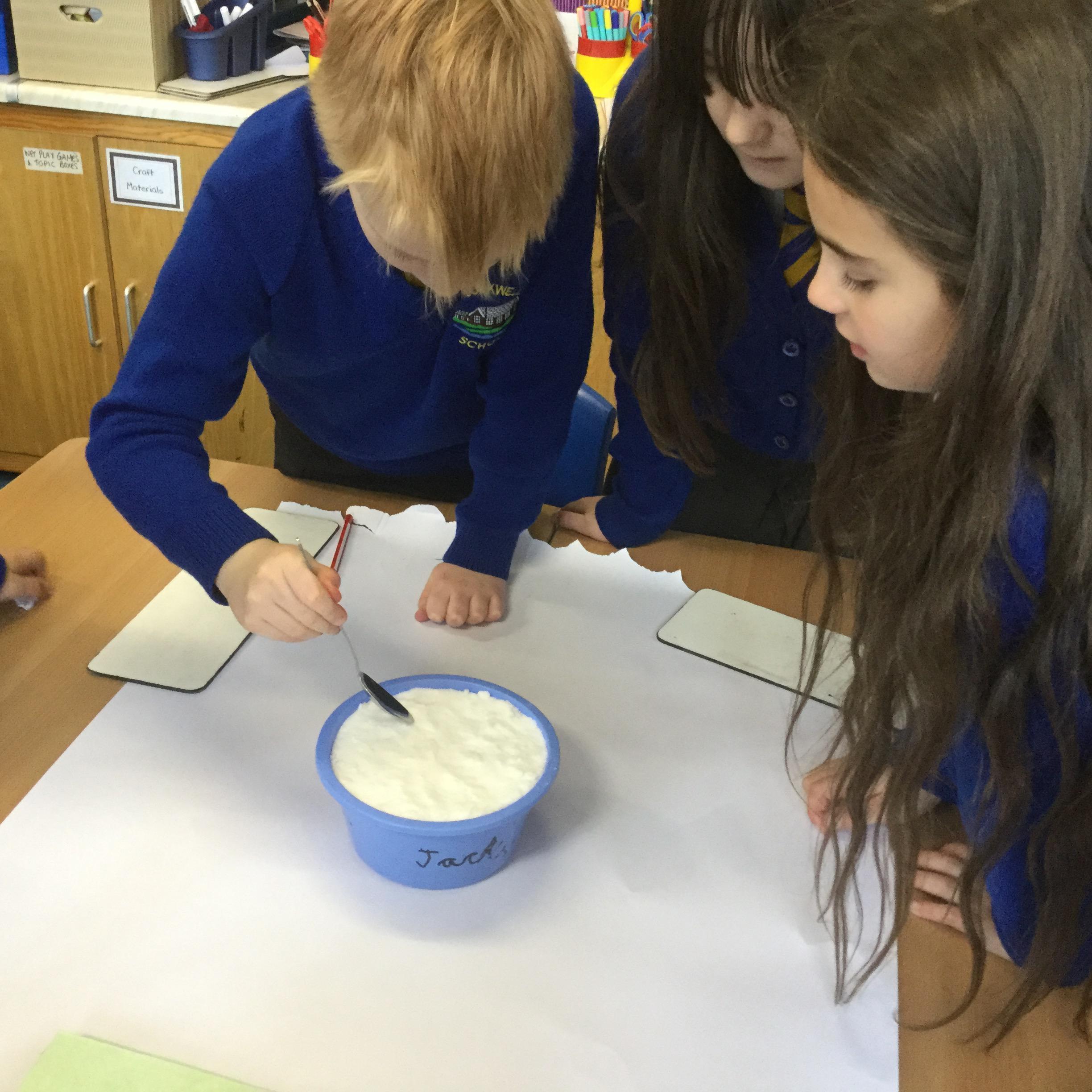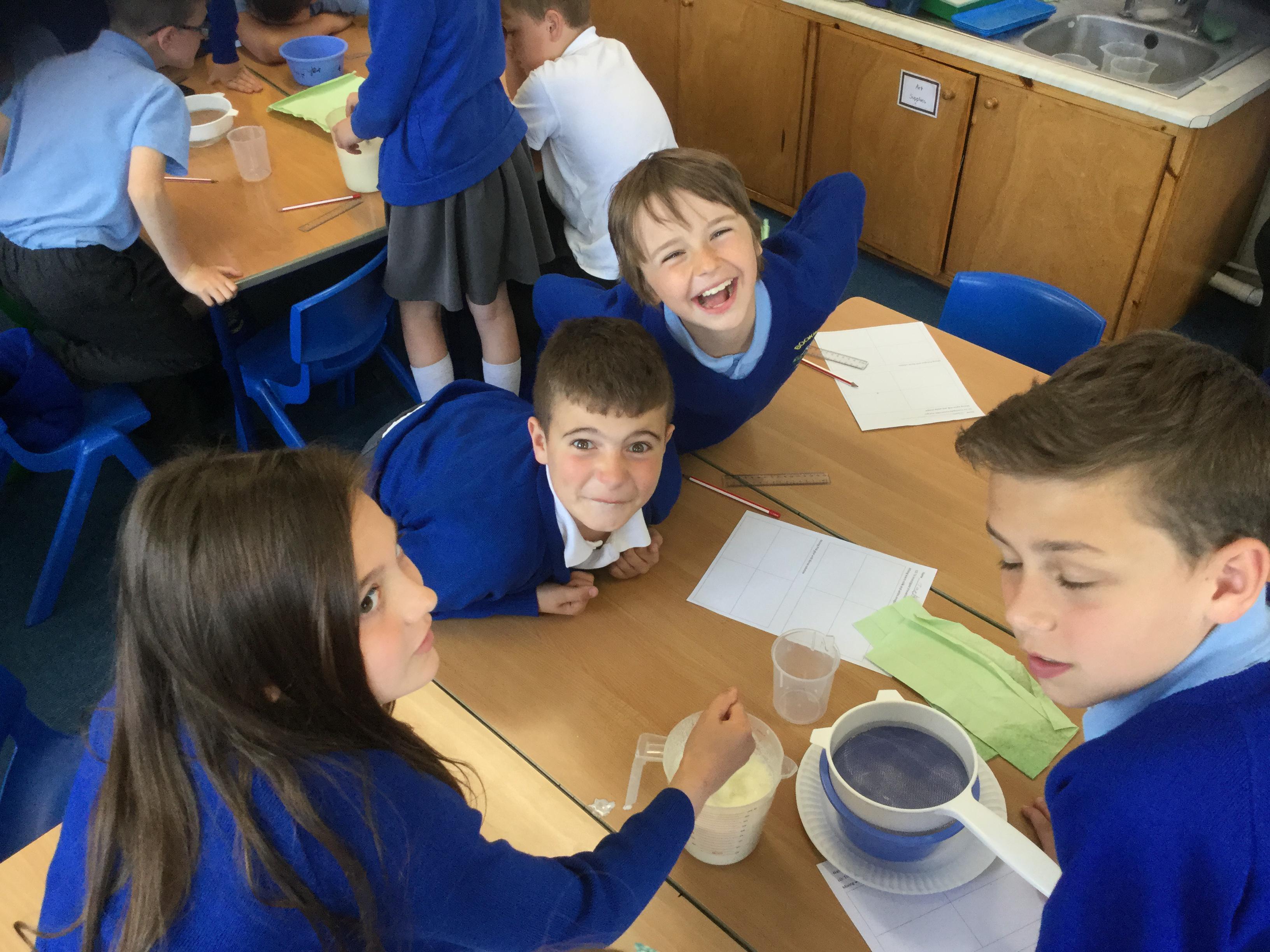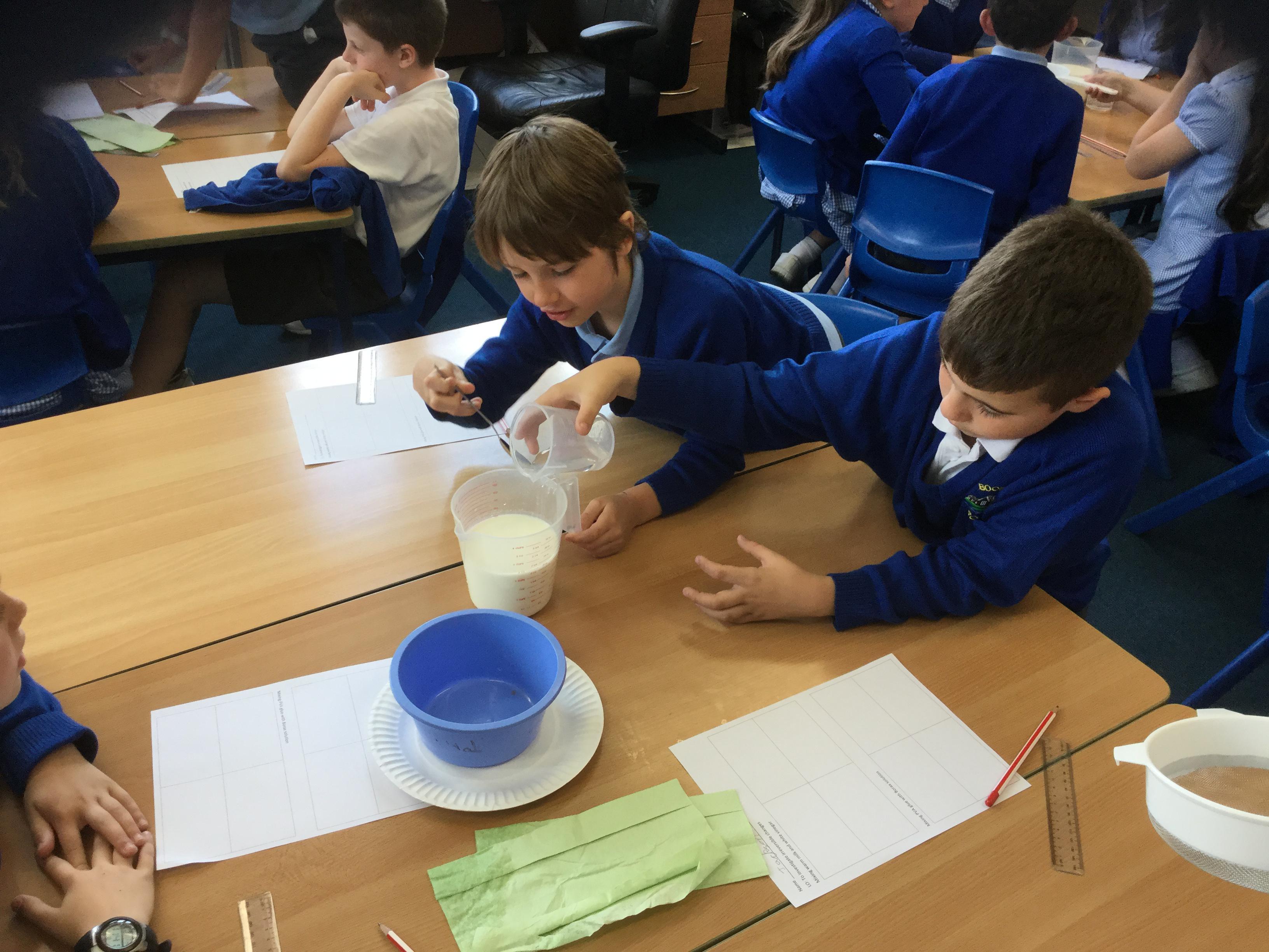 In Science we have been looking at reversible and irreversible changes. We carried out an investigation to see how temperature affected how quickly sugar dissolves (reversible with evaporation) and made plastic using milk and vinegar (irreversible).  It was a lot of fun but a little smelly!