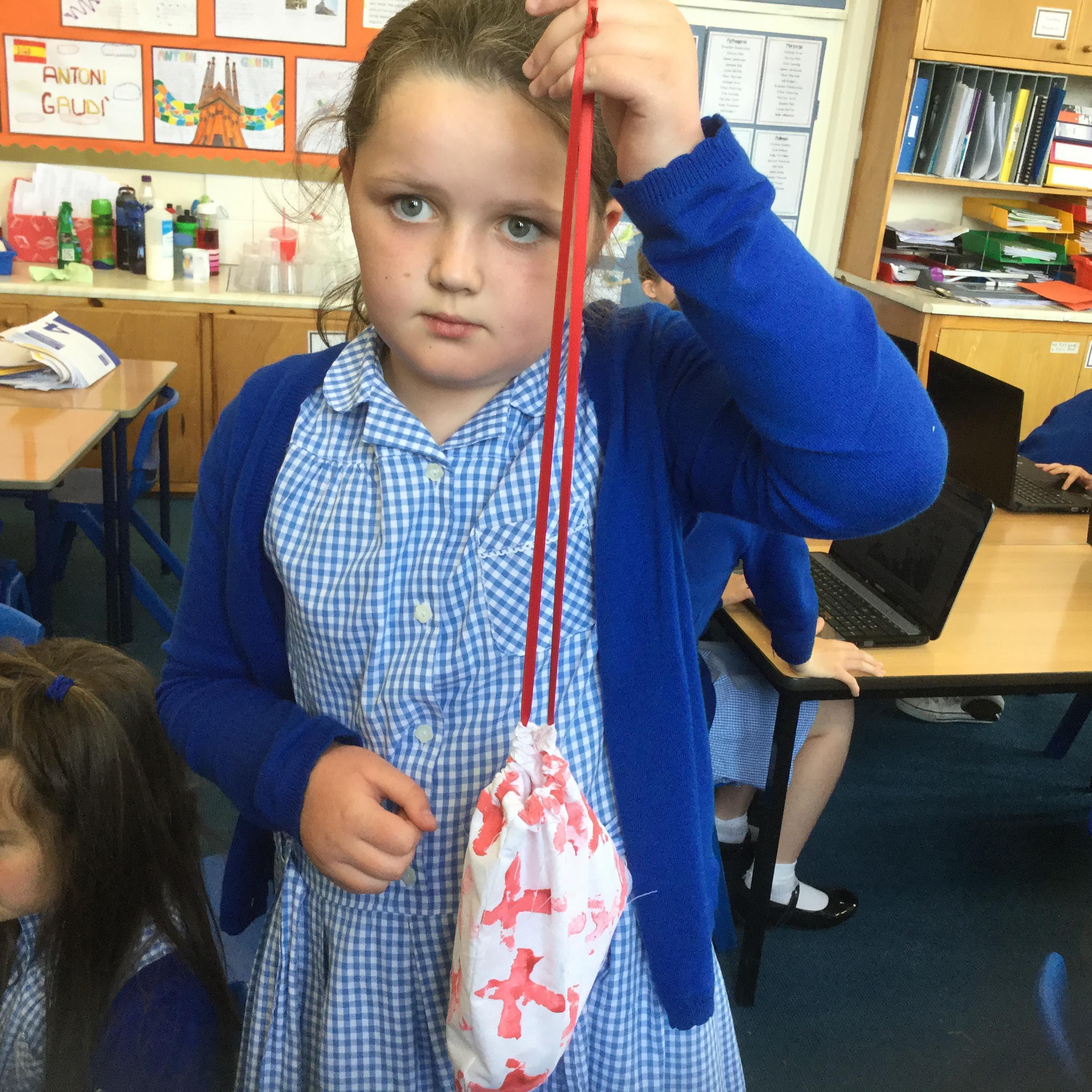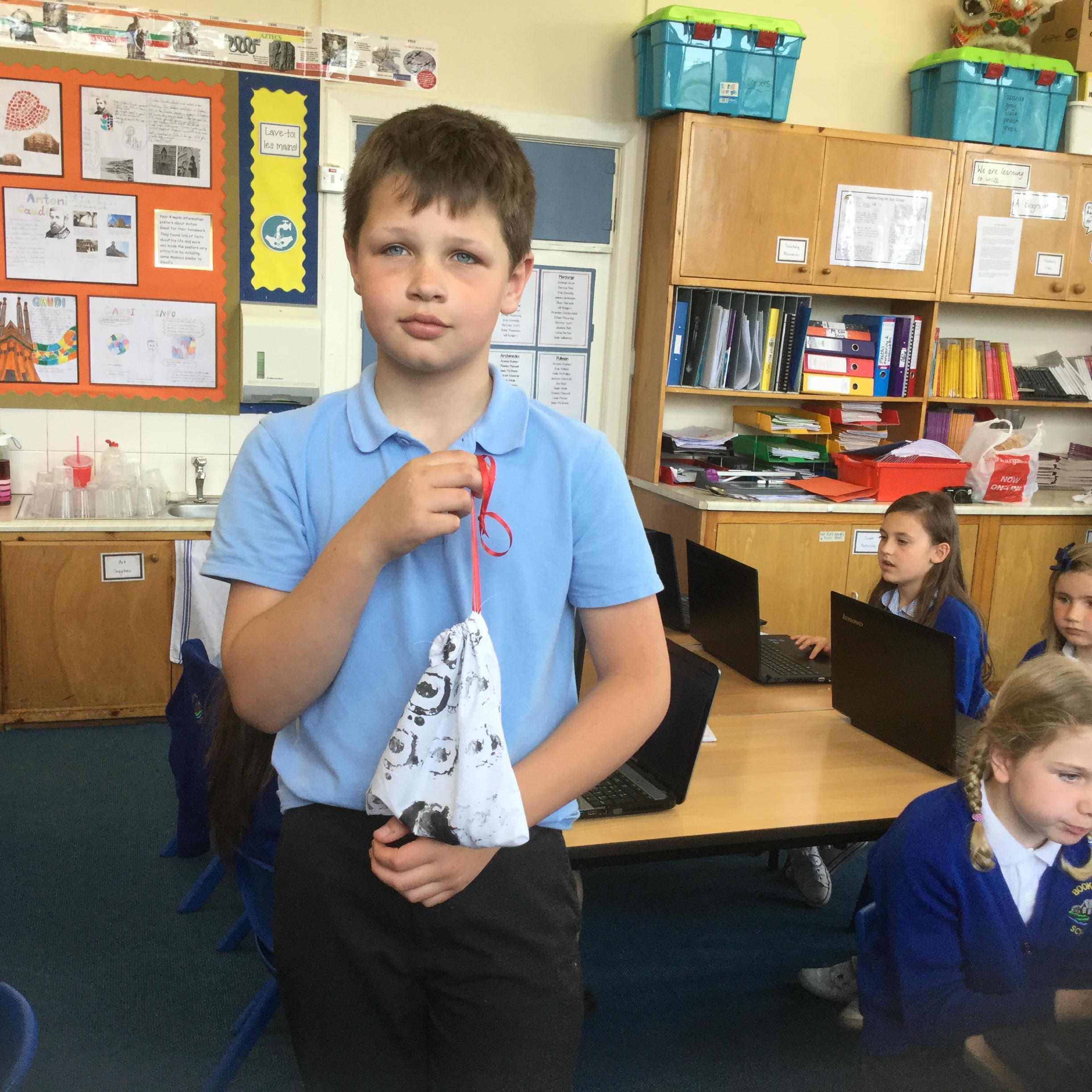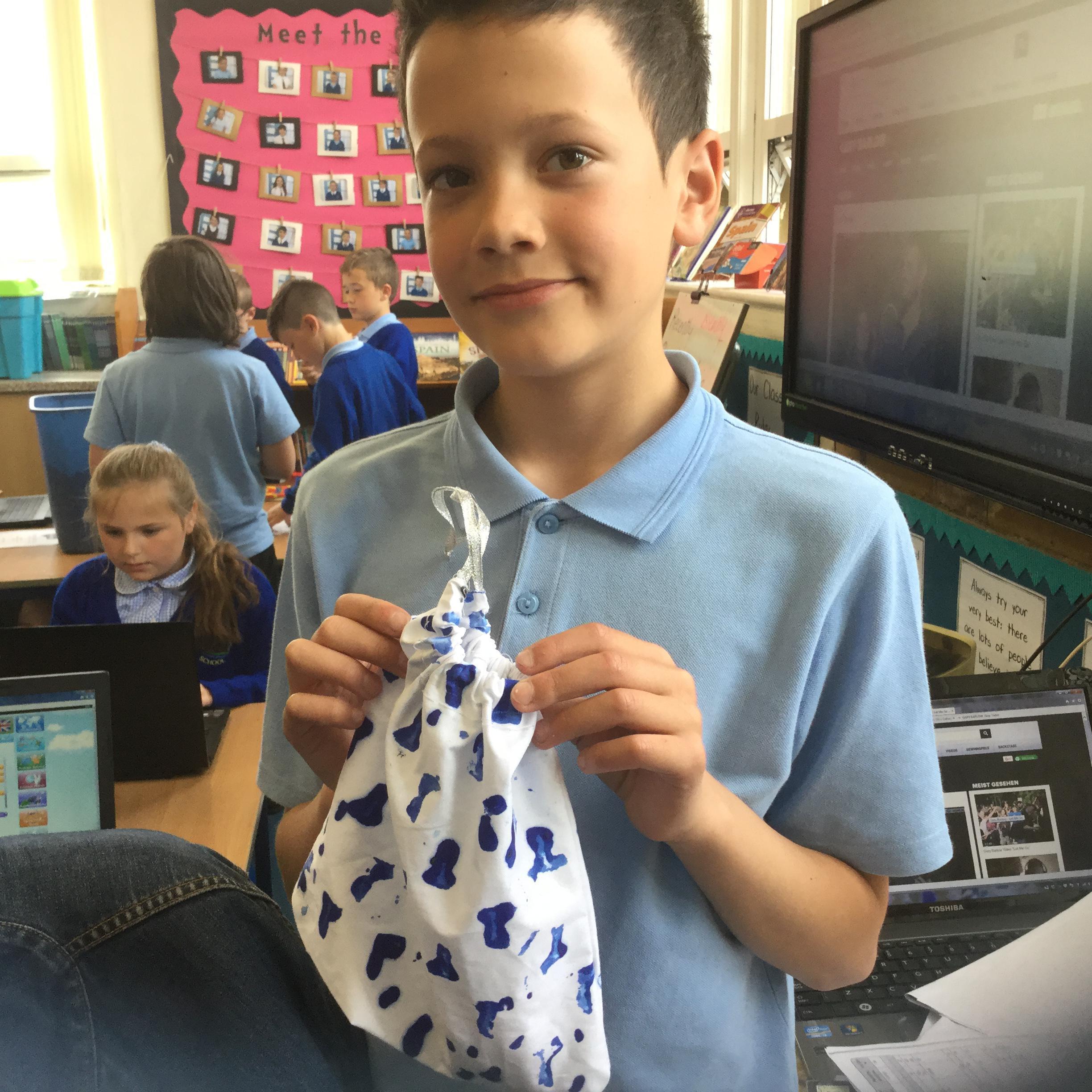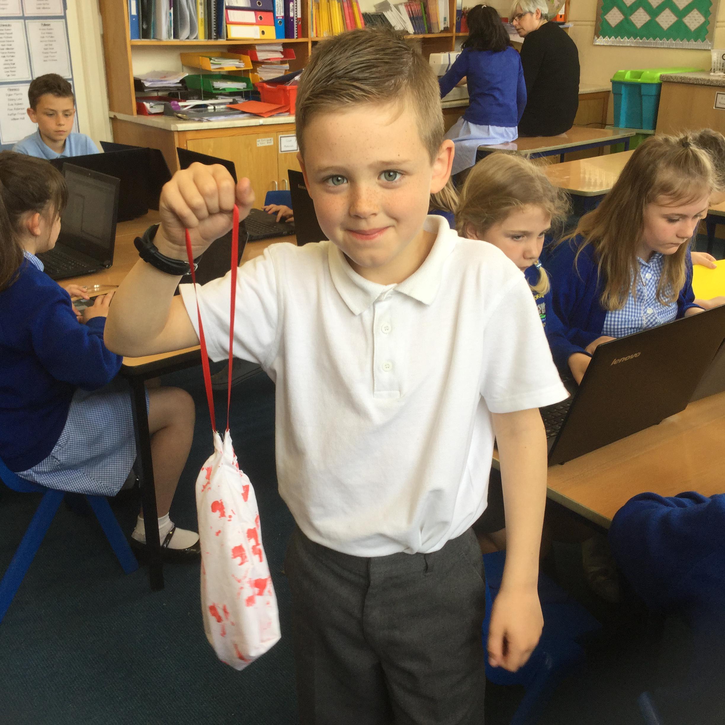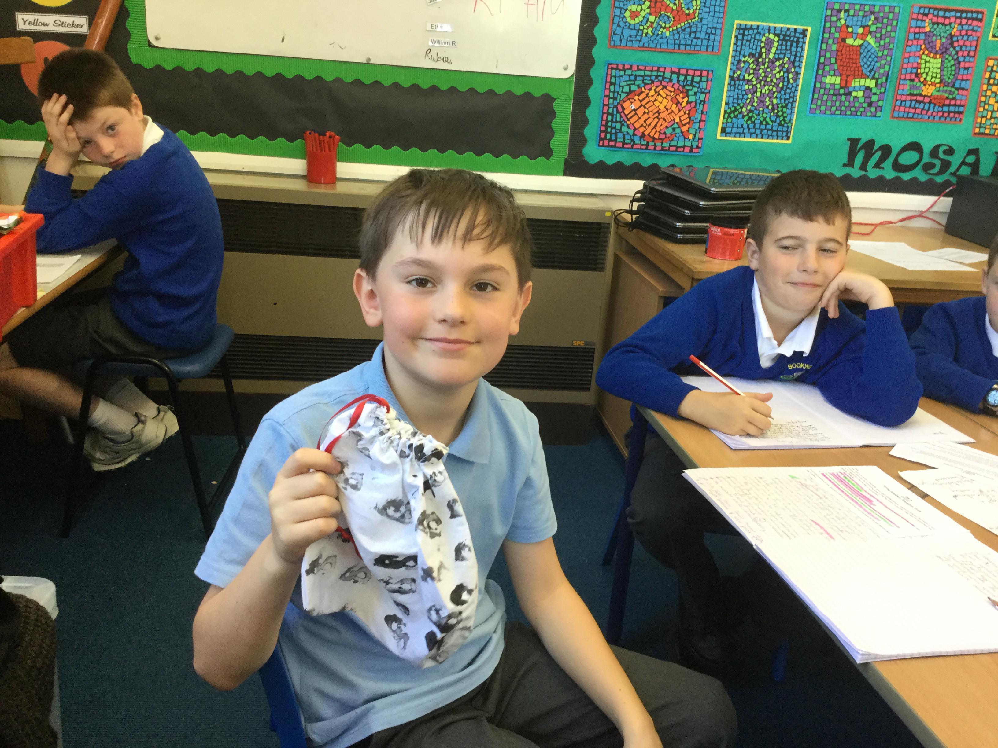 The children made little sacks to keep their Viking runes safe.  We printed patterns onto our cotton fabric using a potato stamp and printing ink.  Once the fabric was dry, the children had a go at sewing them to make a sack.  They did the hems themselves with a needle and thread then Mrs Scaplehorn gave them all a turn on her sewing machine so they could sew the sides shut. Lastly, a ribbon was added to act as a drawstring.  They look fantastic.