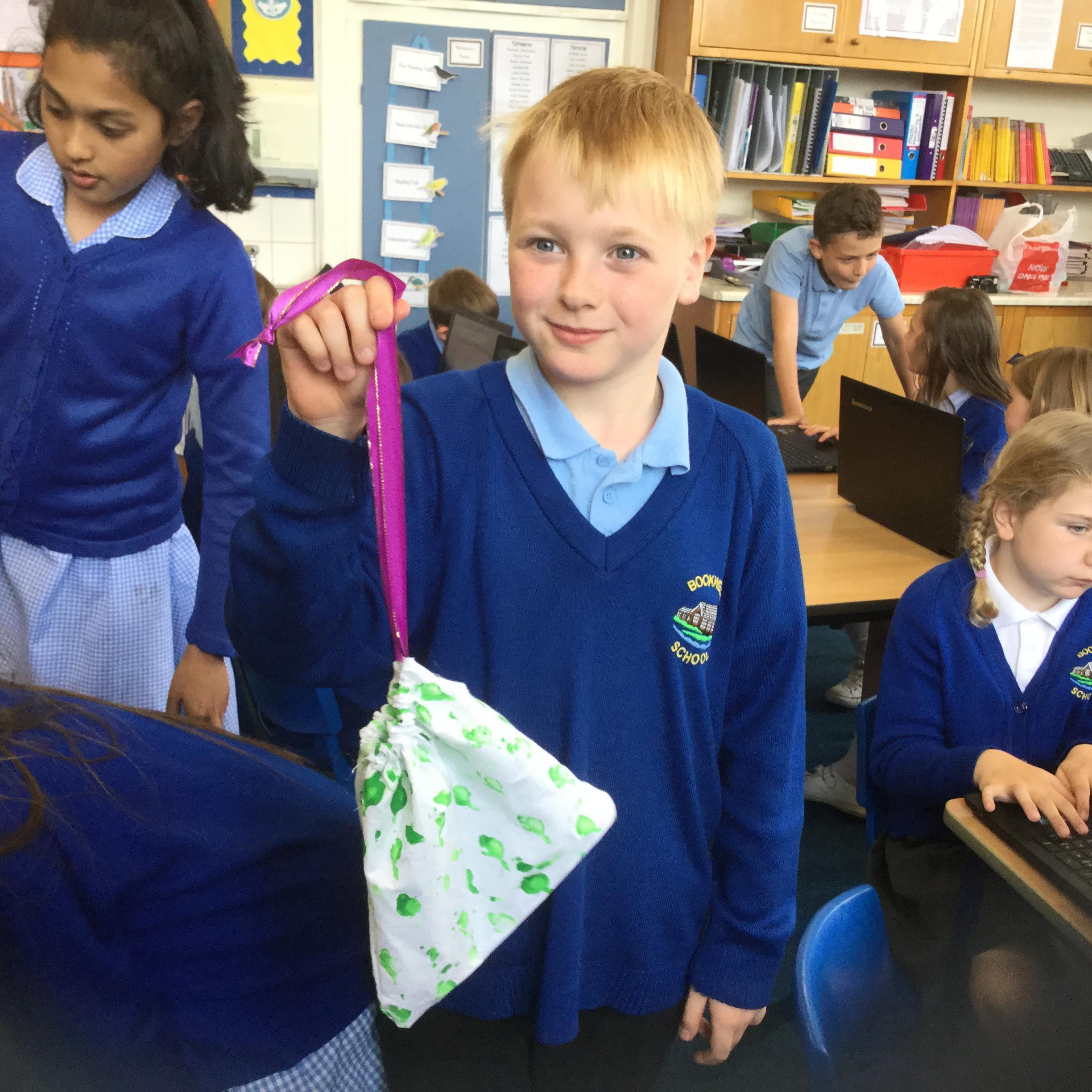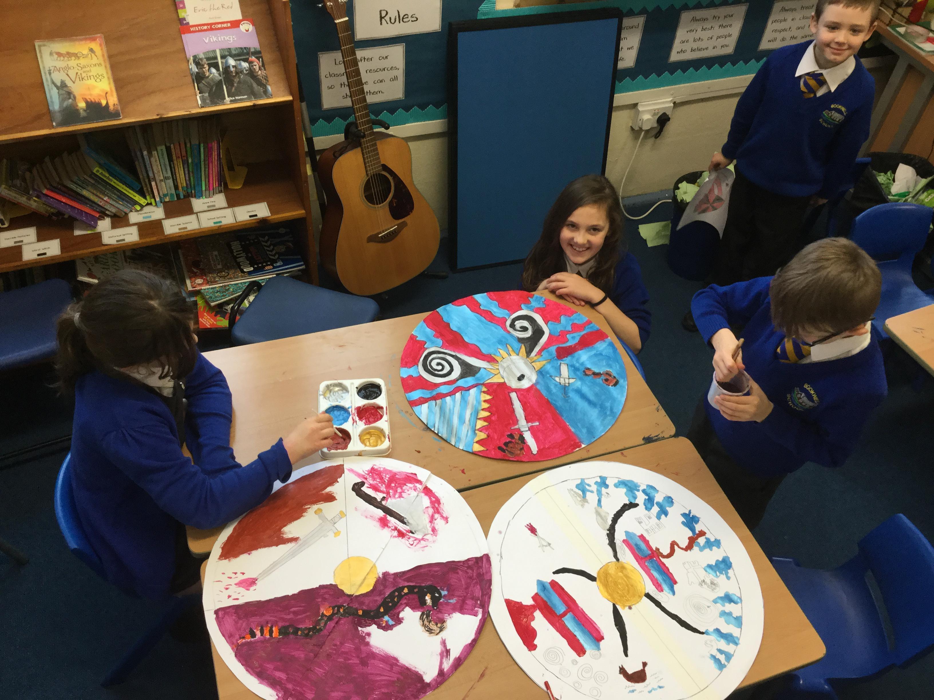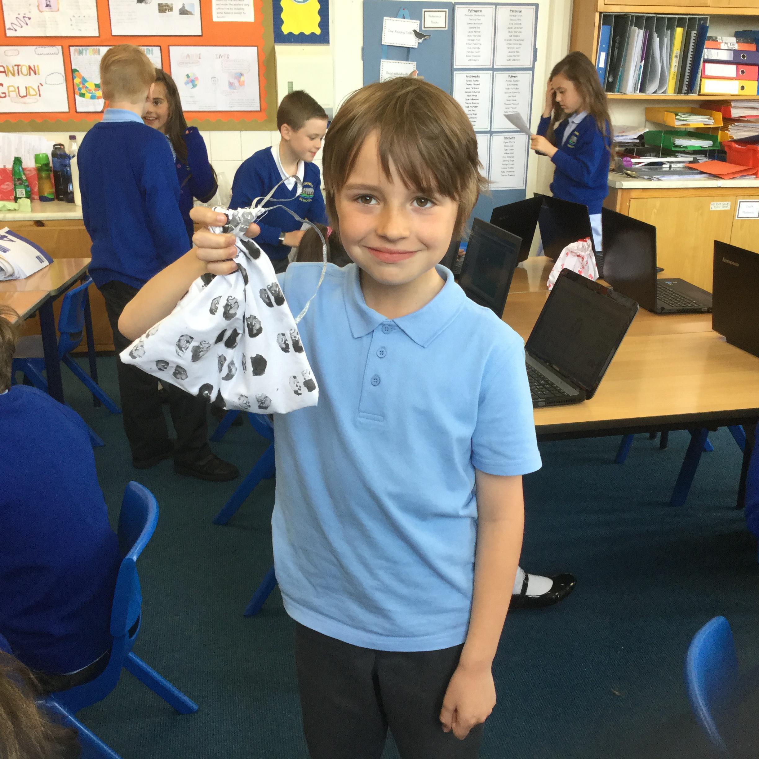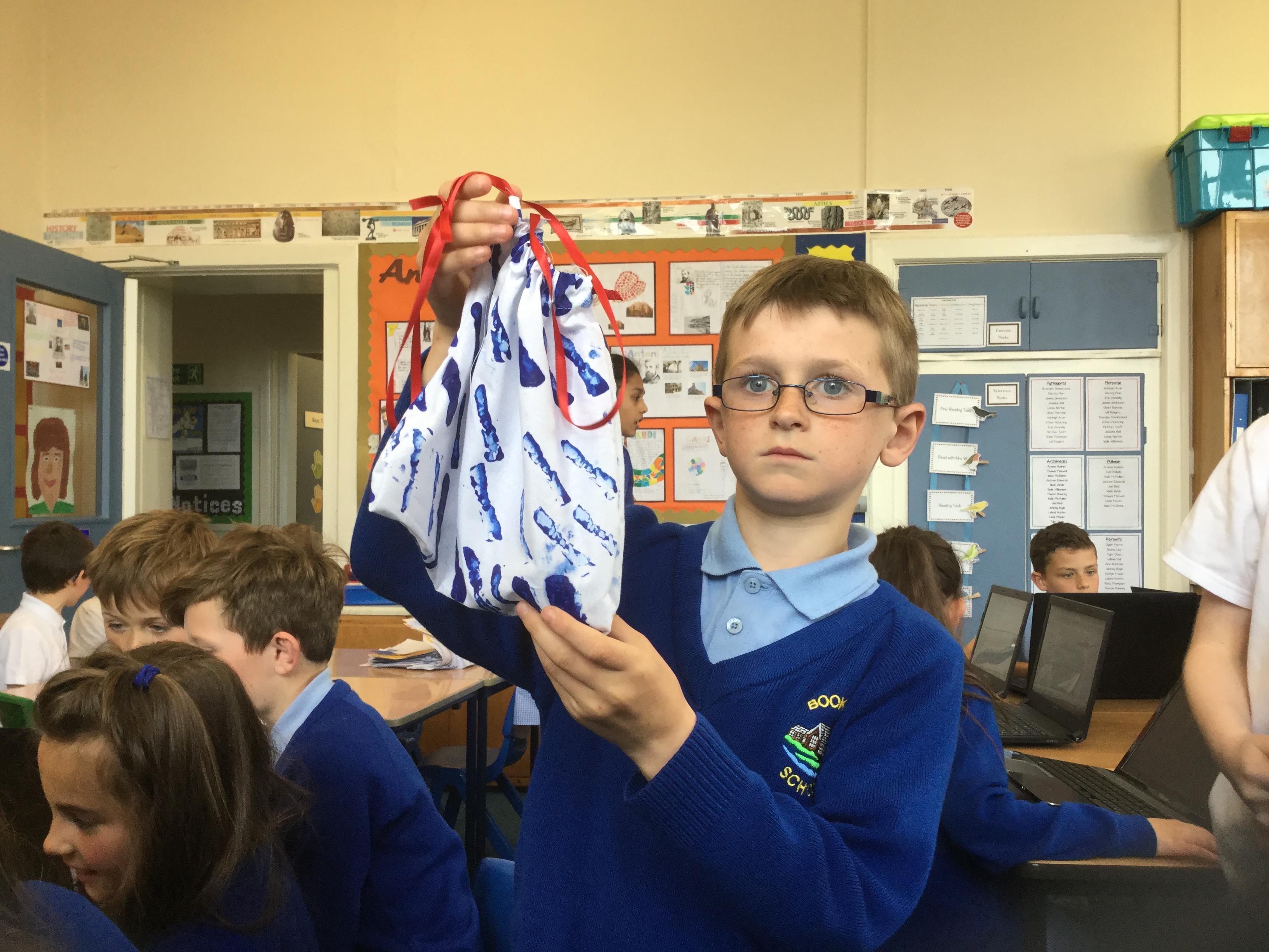 The children made little sacks to keep their Viking runes safe.  We printed patterns onto our cotton fabric using a potato stamp and printing ink.  Once the fabric was dry, the children had a go at sewing them to make a sack.  They did the hems themselves with a needle and thread then Mrs Scaplehorn gave them all a turn on her sewing machine so they could sew the sides shut. Lastly, a ribbon was added to act as a drawstring.  They look fantastic.