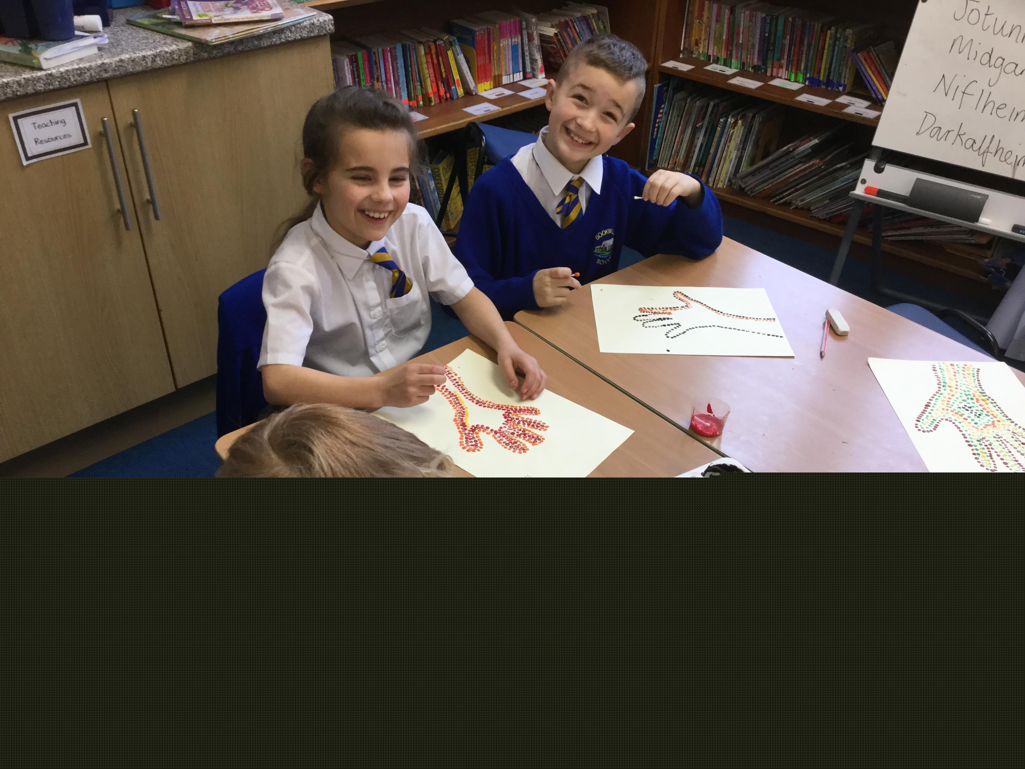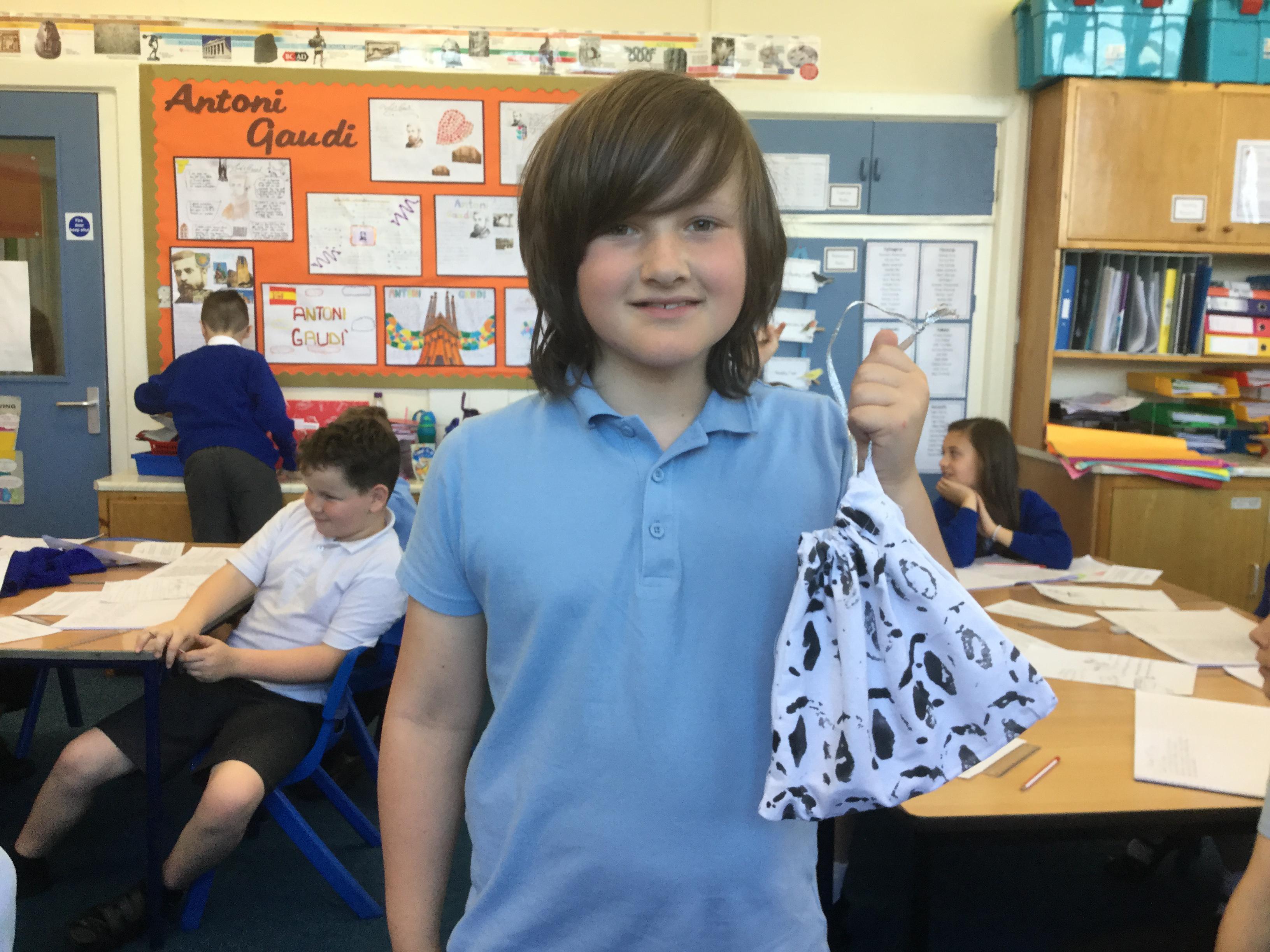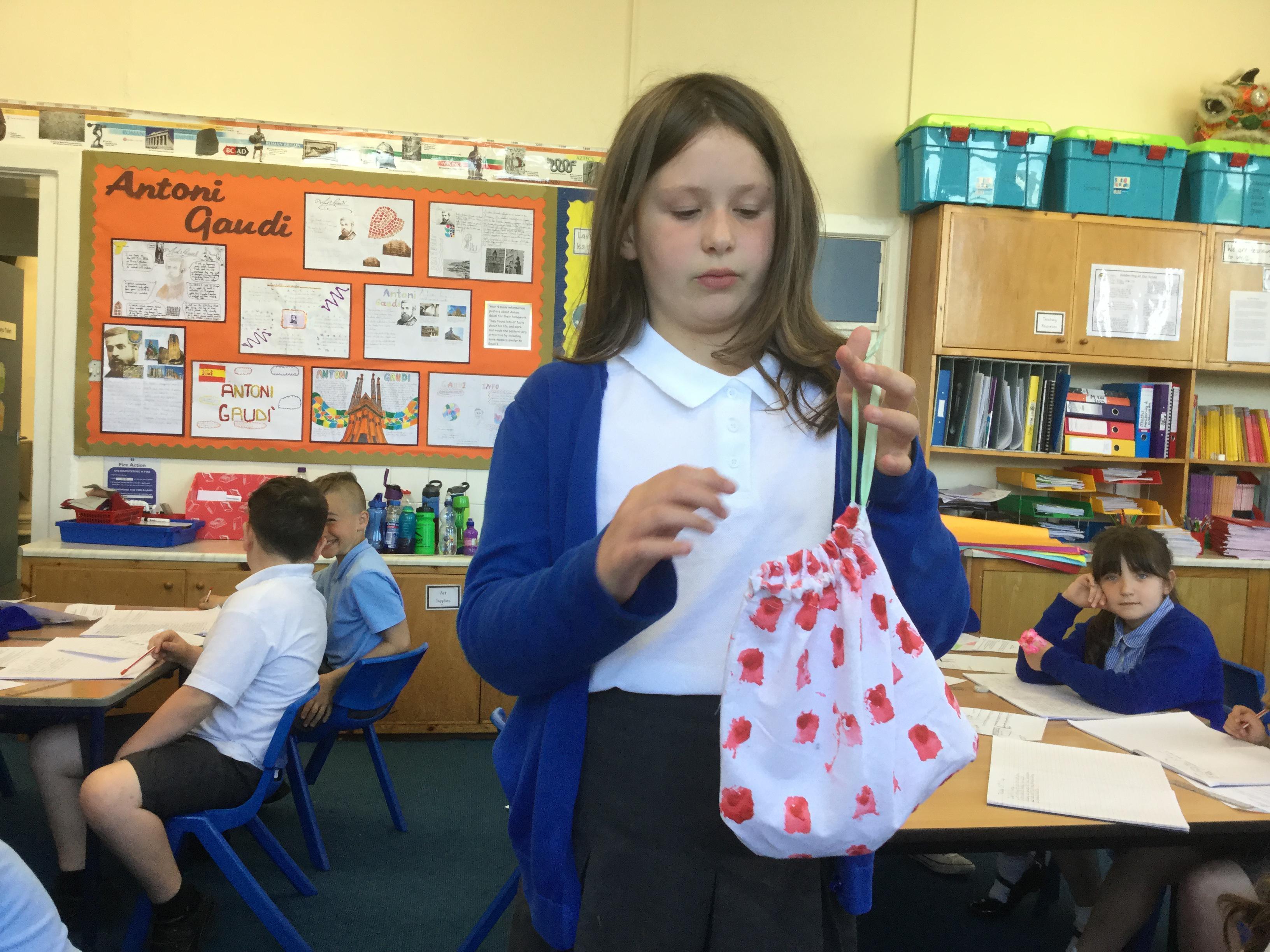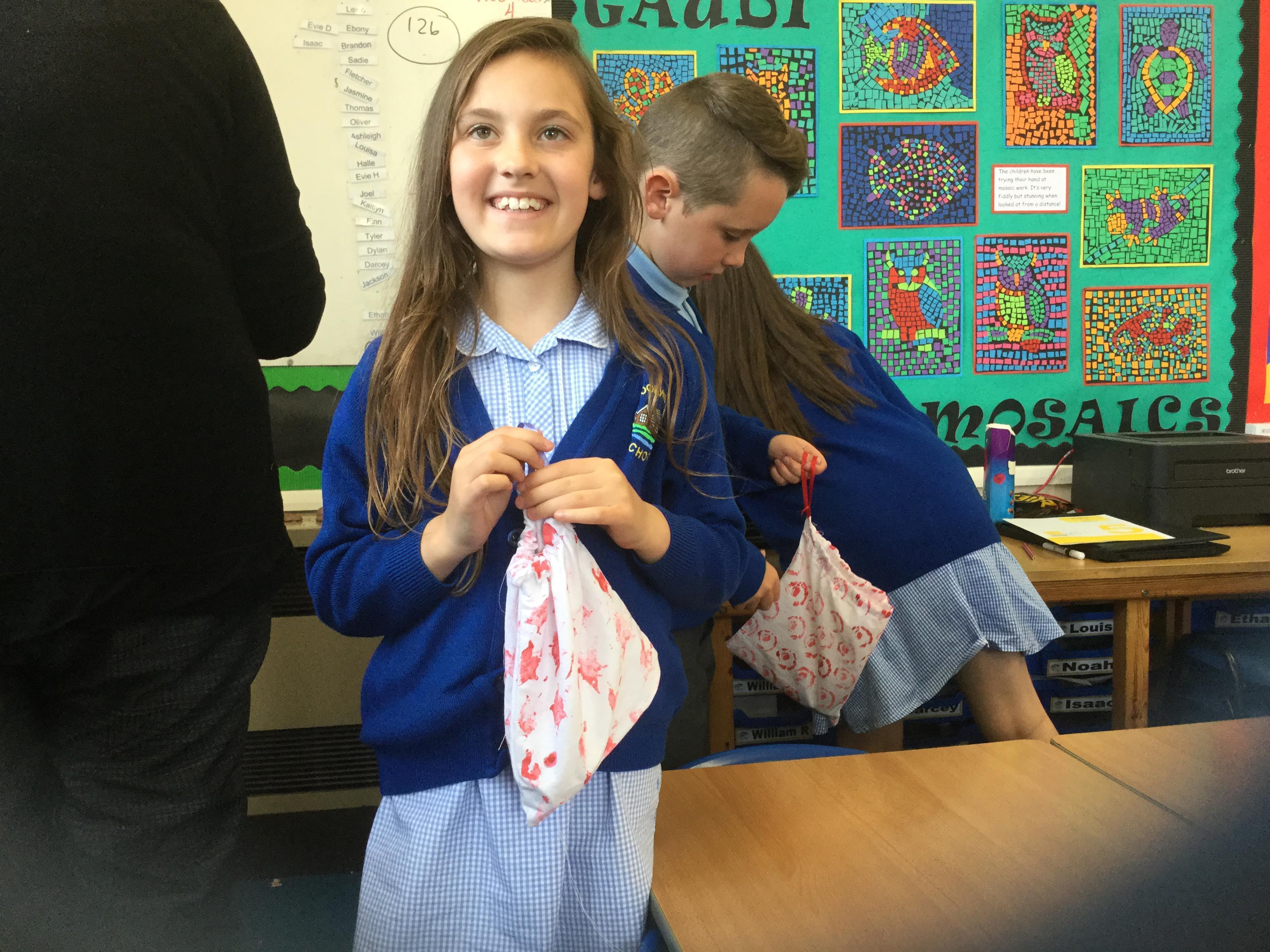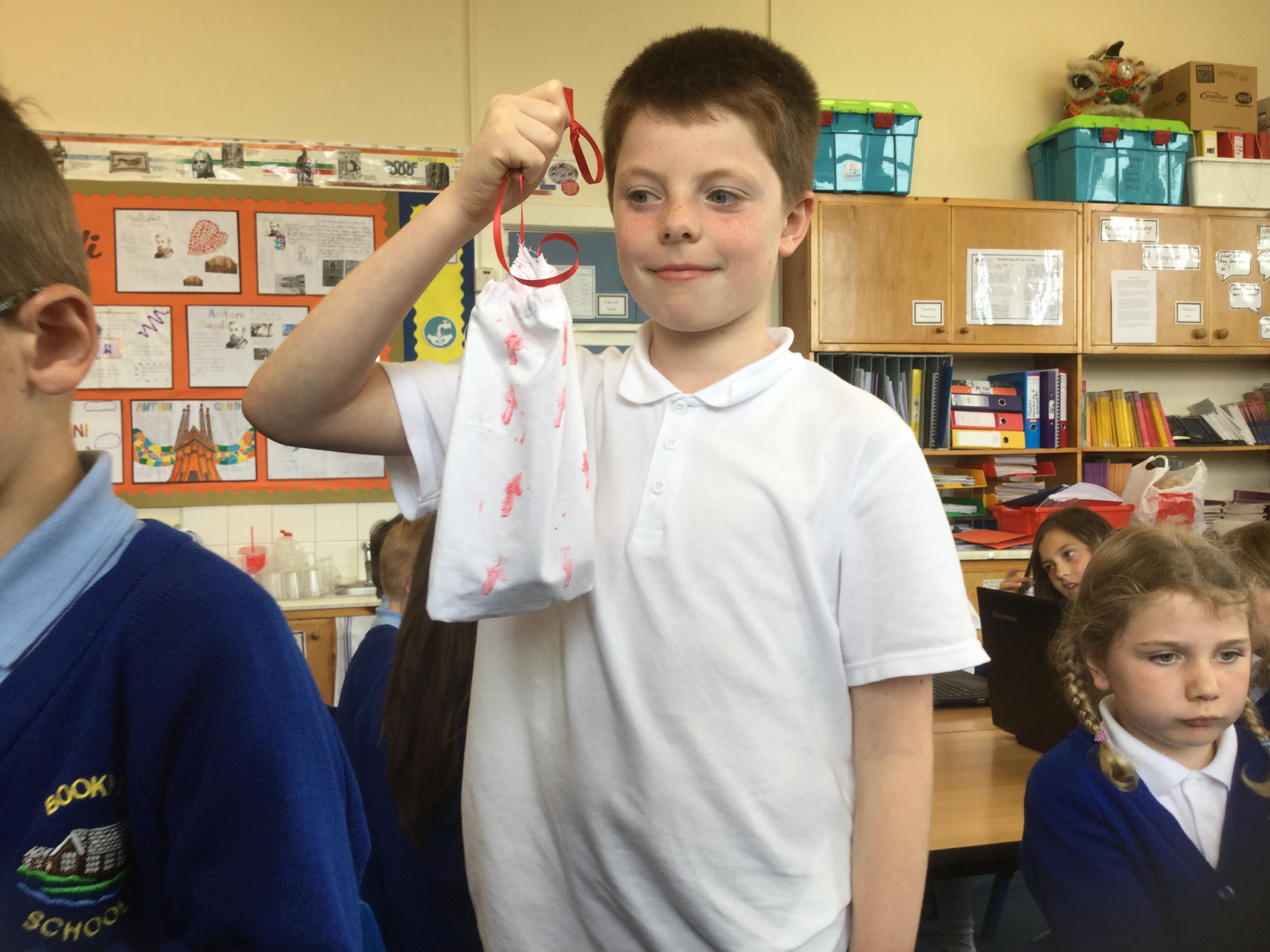 The children made little sacks to keep their Viking runes safe.  We printed patterns onto our cotton fabric using a potato stamp and printing ink.  Once the fabric was dry, the children had a go at sewing them to make a sack.  They did the hems themselves with a needle and thread then Mrs Scaplehorn gave them all a turn on her sewing machine so they could sew the sides shut. Lastly, a ribbon was added to act as a drawstring.  They look fantastic.