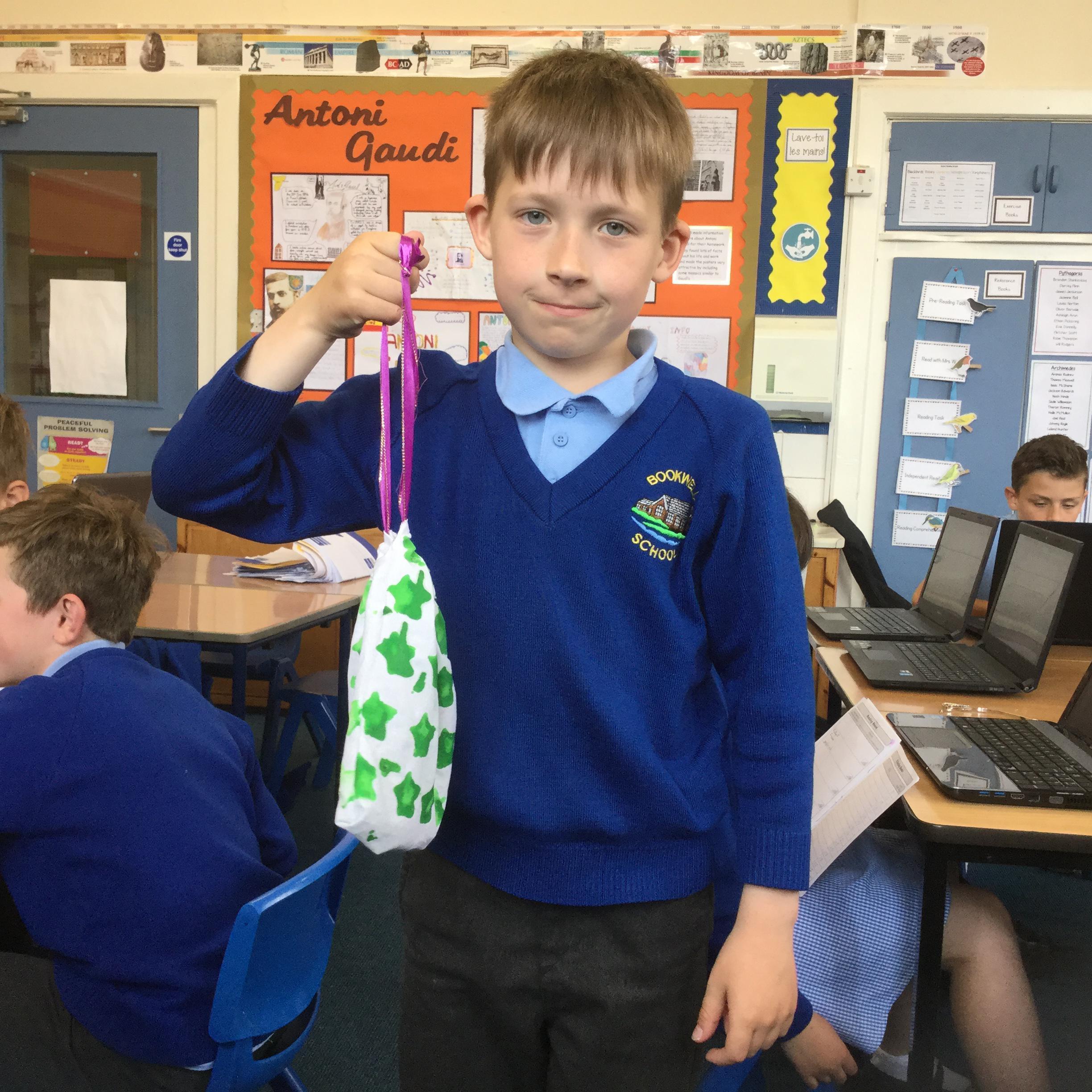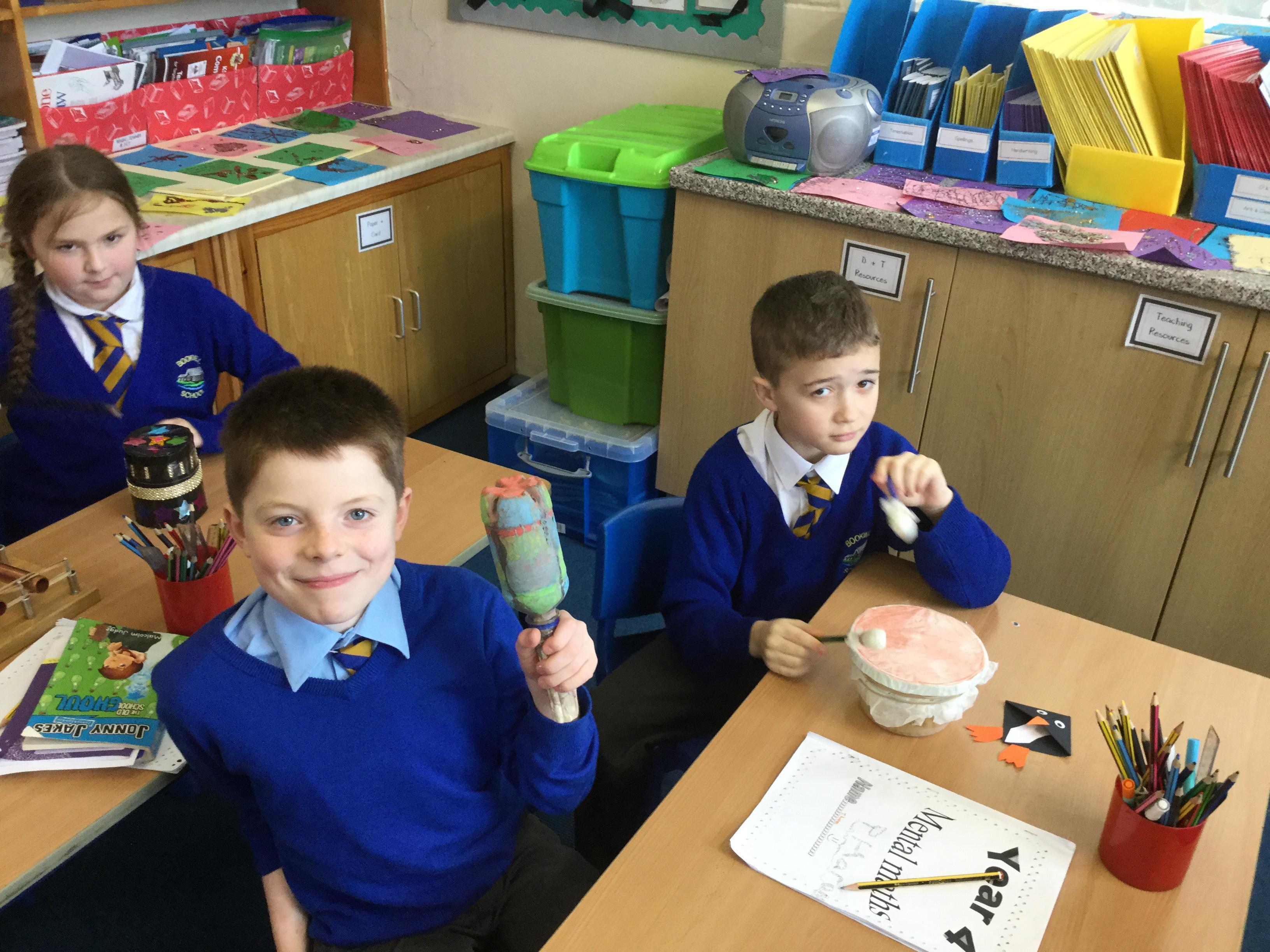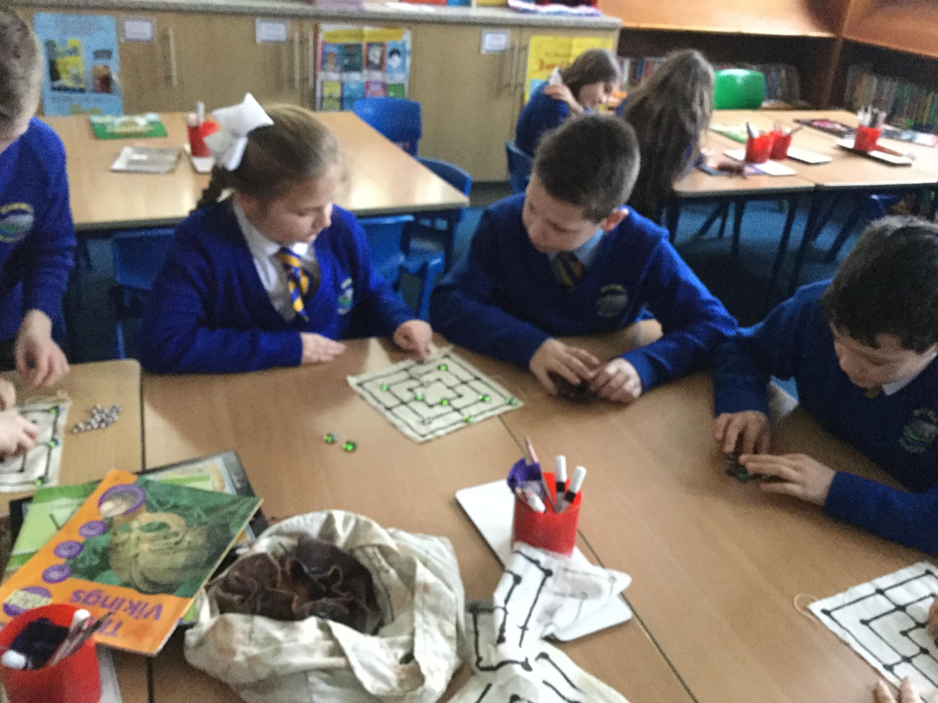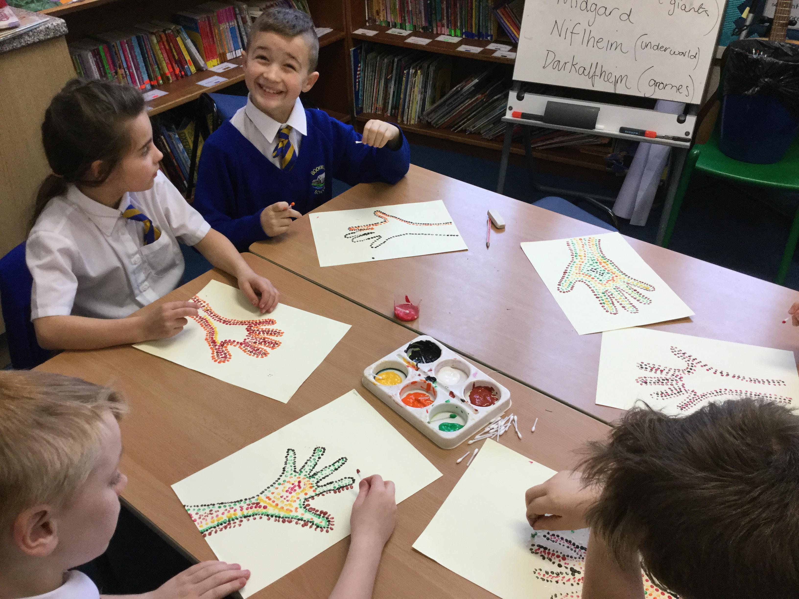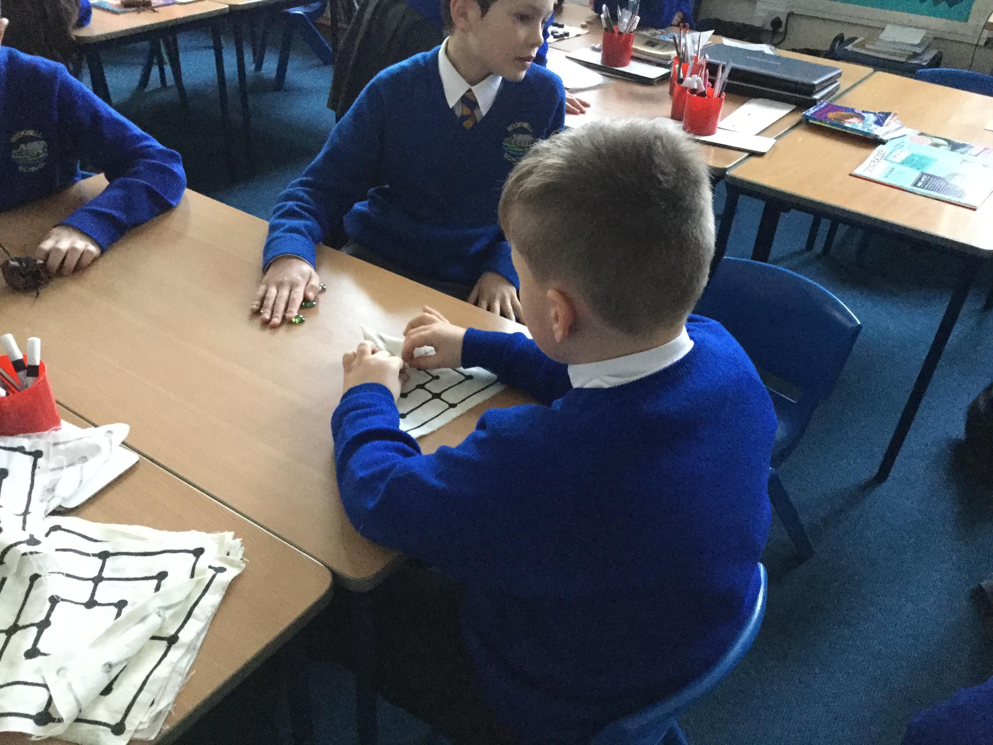 The children made little sacks to keep their Viking runes safe.  We printed patterns onto our cotton fabric using a potato stamp and printing ink.  Once the fabric was dry, the children had a go at sewing them to make a sack.  They did the hems themselves with a needle and thread then Mrs Scaplehorn gave them all a turn on her sewing machine so they could sew the sides shut. Lastly, a ribbon was added to act as a drawstring.  They look fantastic.