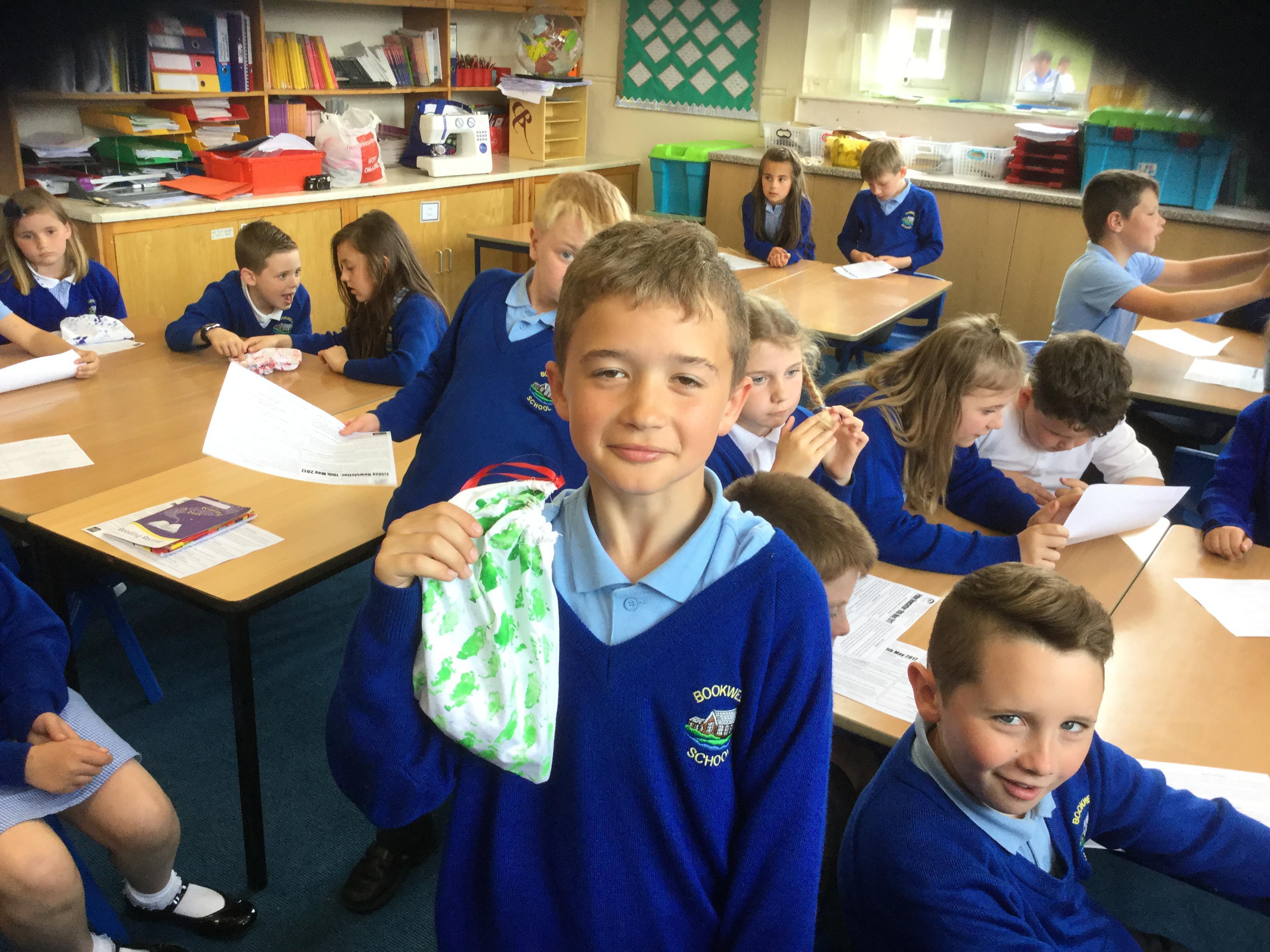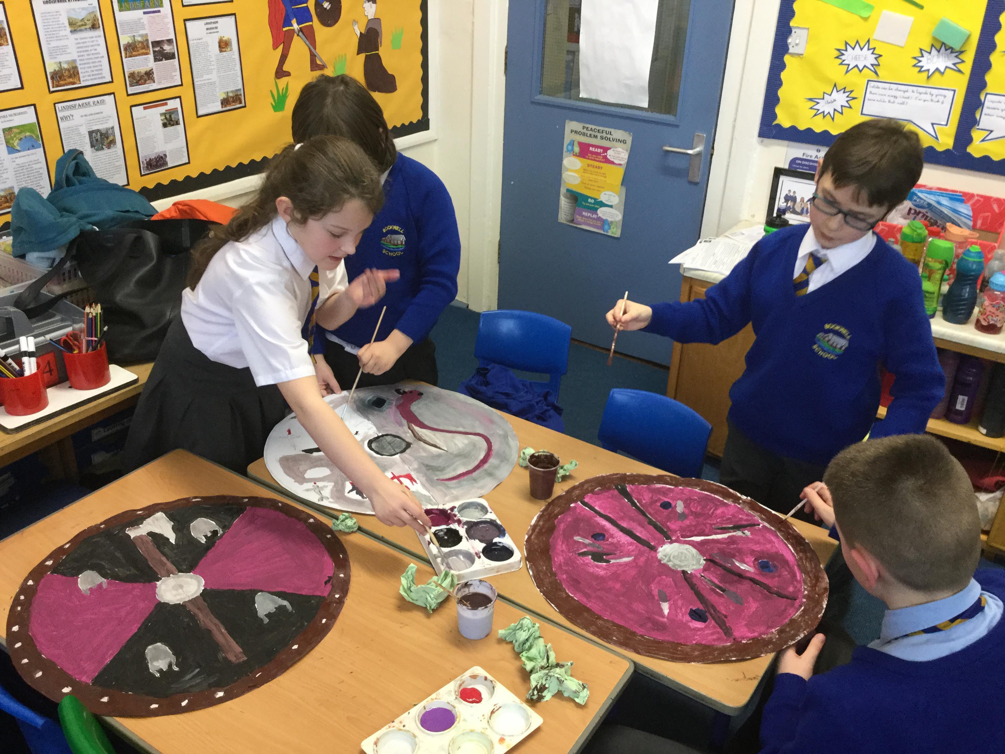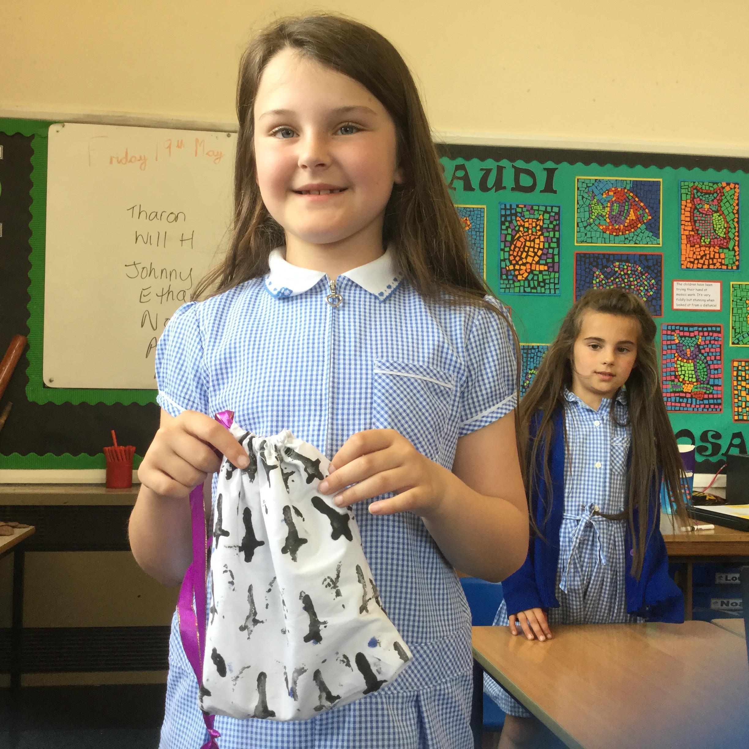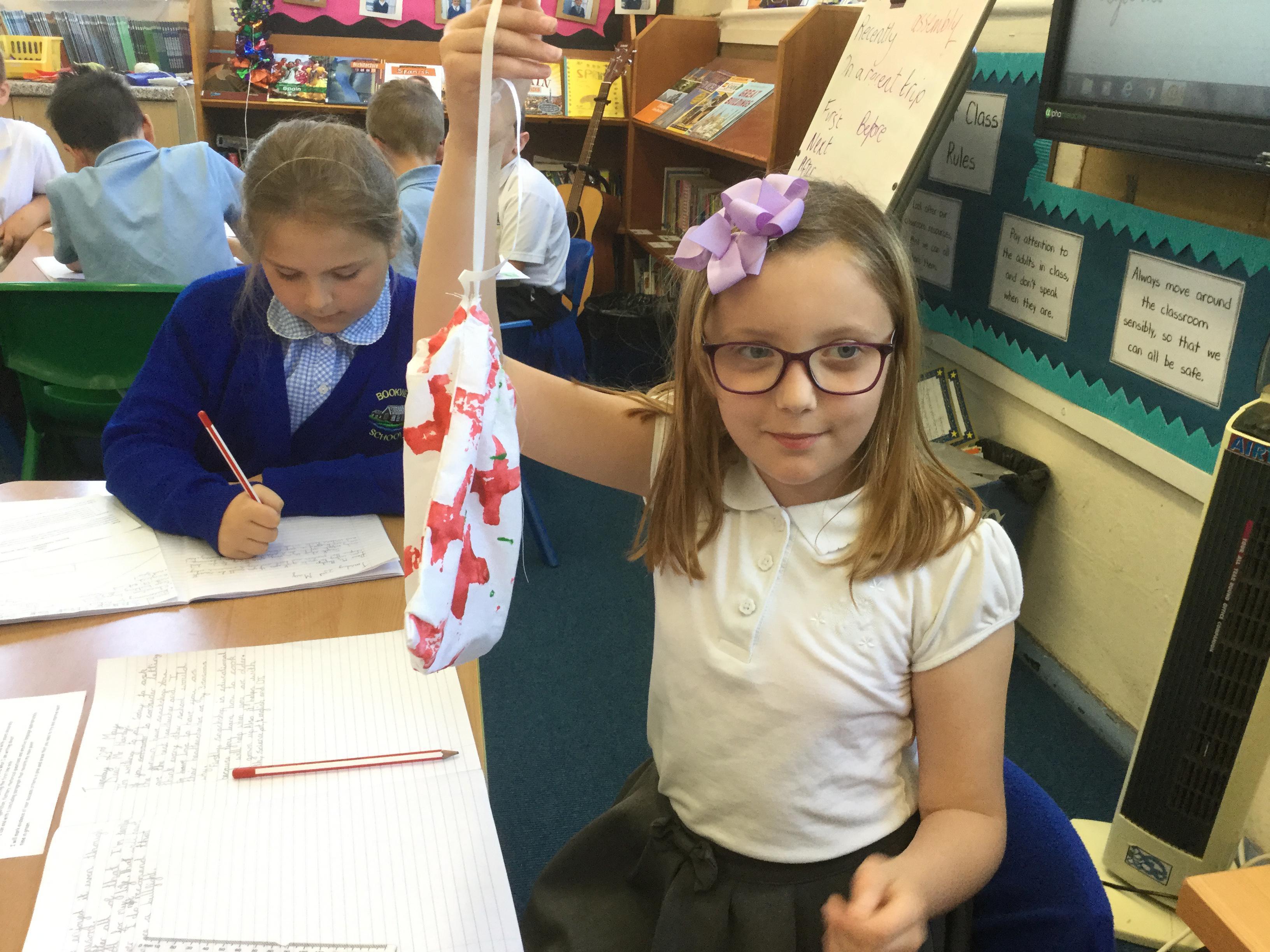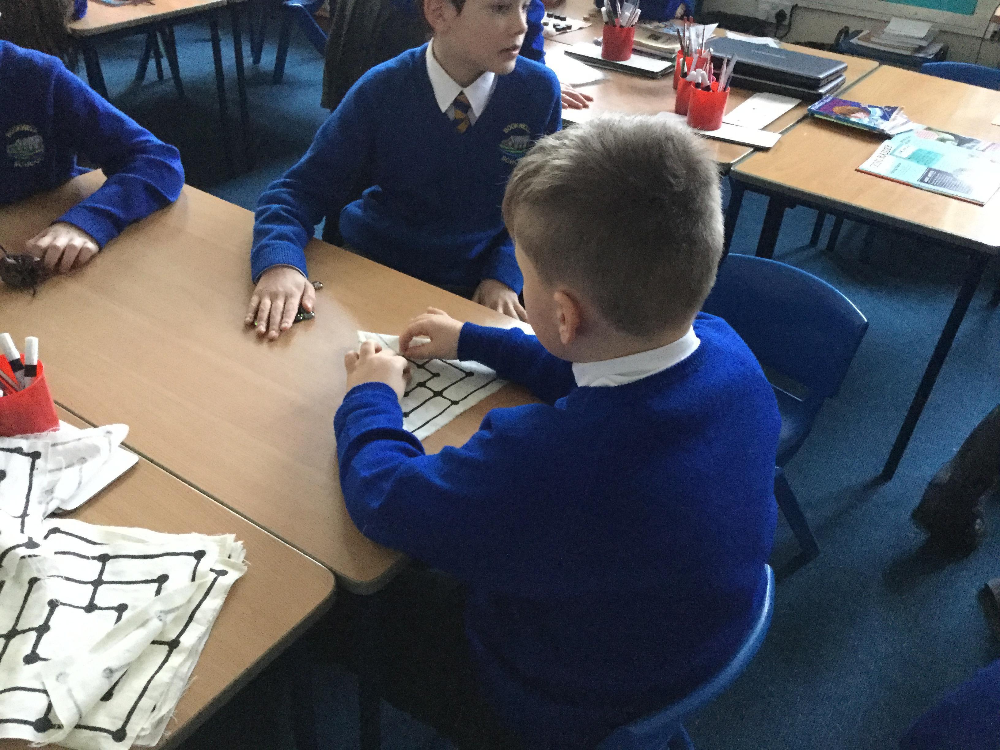 The children made little sacks to keep their Viking runes safe.  We printed patterns onto our cotton fabric using a potato stamp and printing ink.  Once the fabric was dry, the children had a go at sewing them to make a sack.  They did the hems themselves with a needle and thread then Mrs Scaplehorn gave them all a turn on her sewing machine so they could sew the sides shut. Lastly, a ribbon was added to act as a drawstring.  They look fantastic.