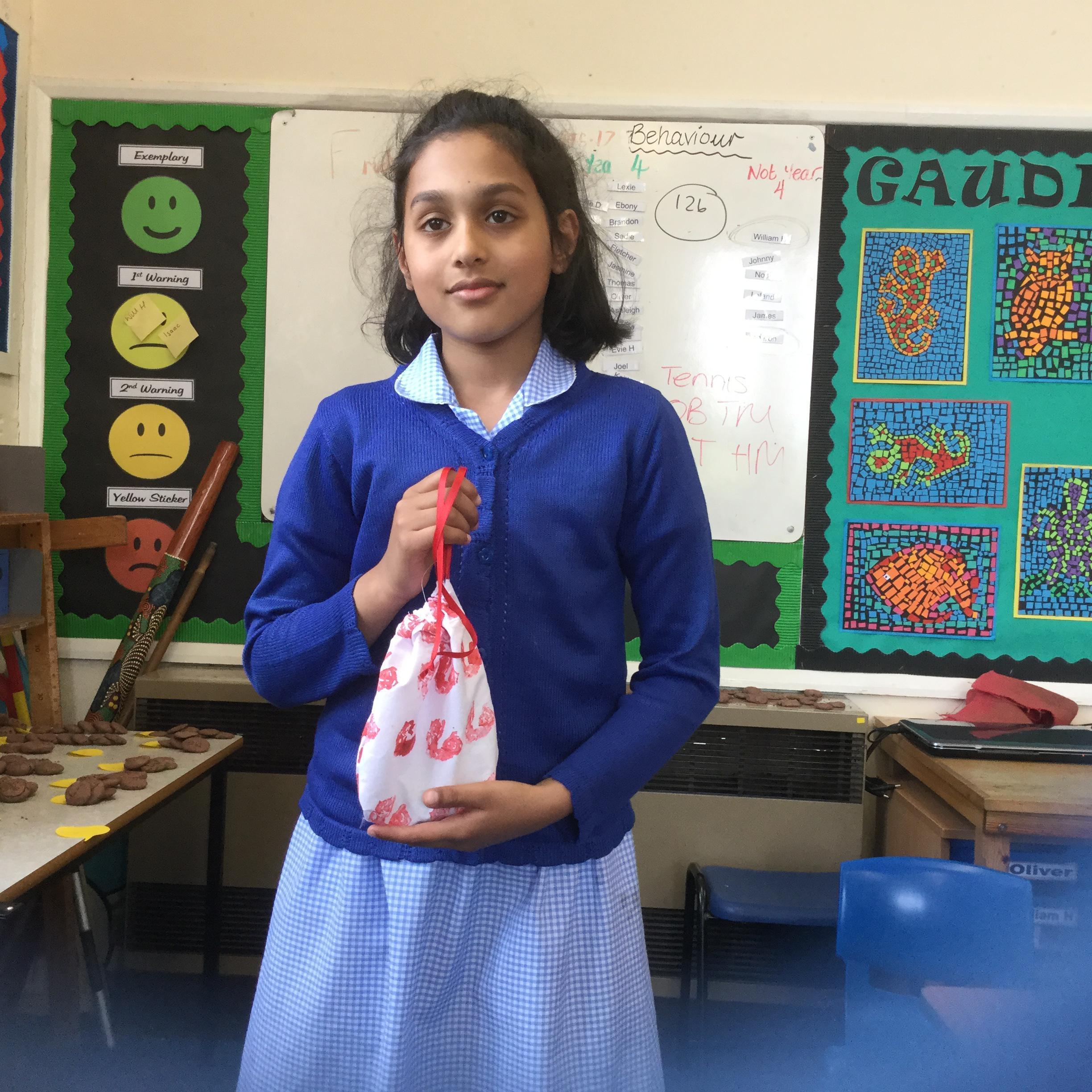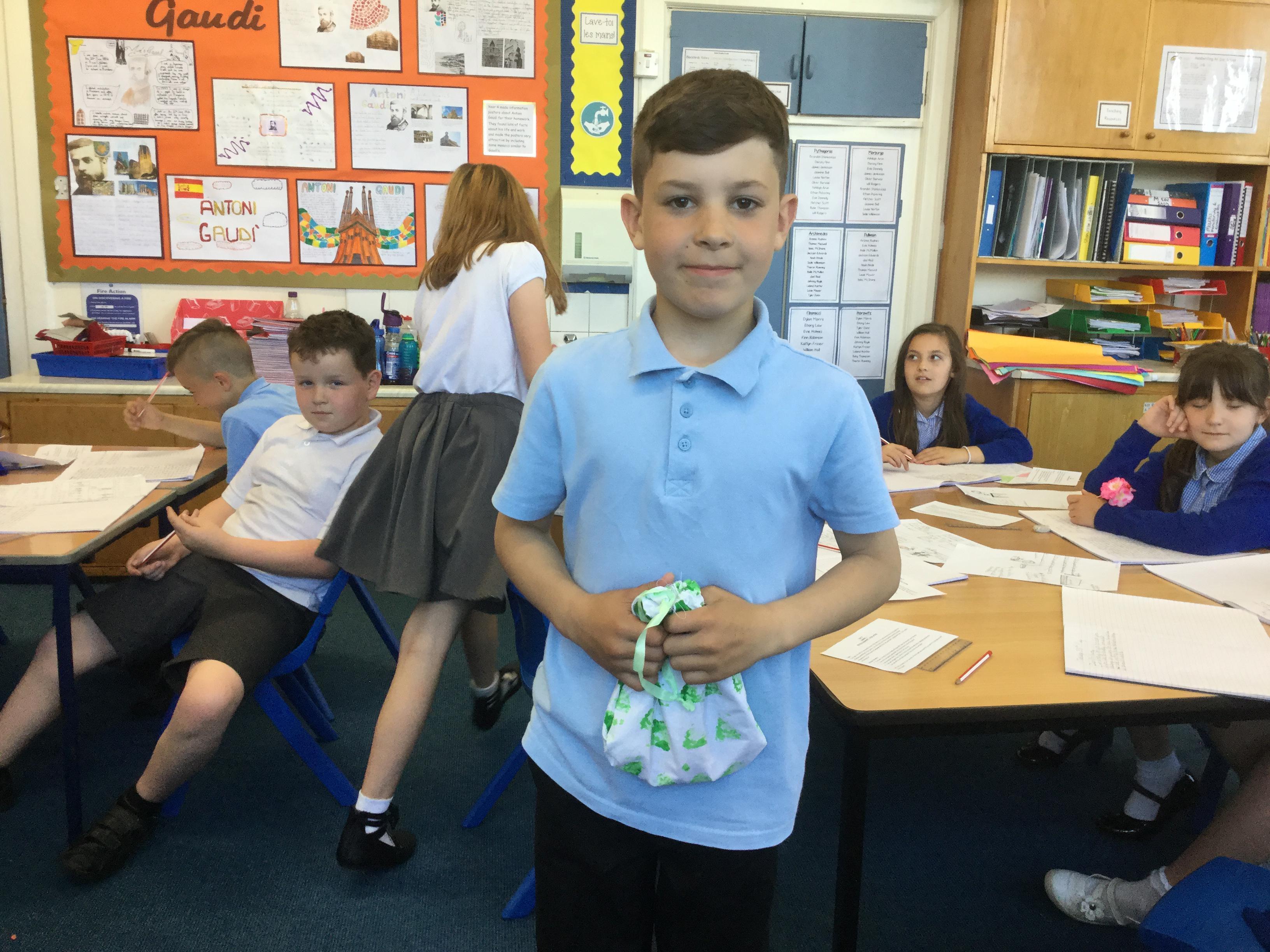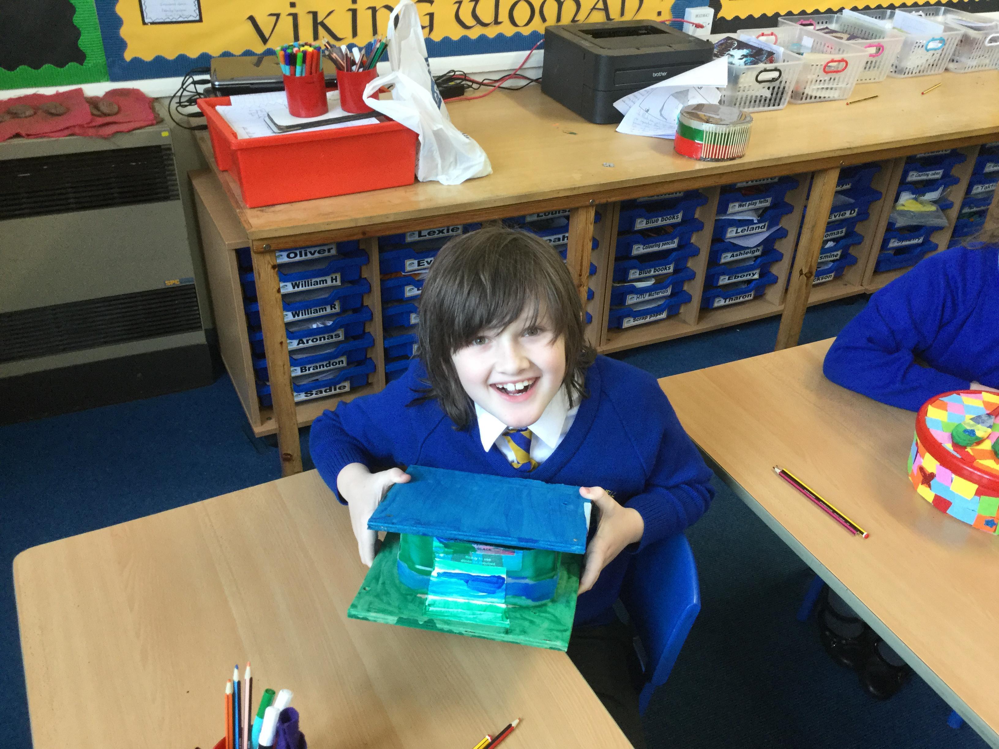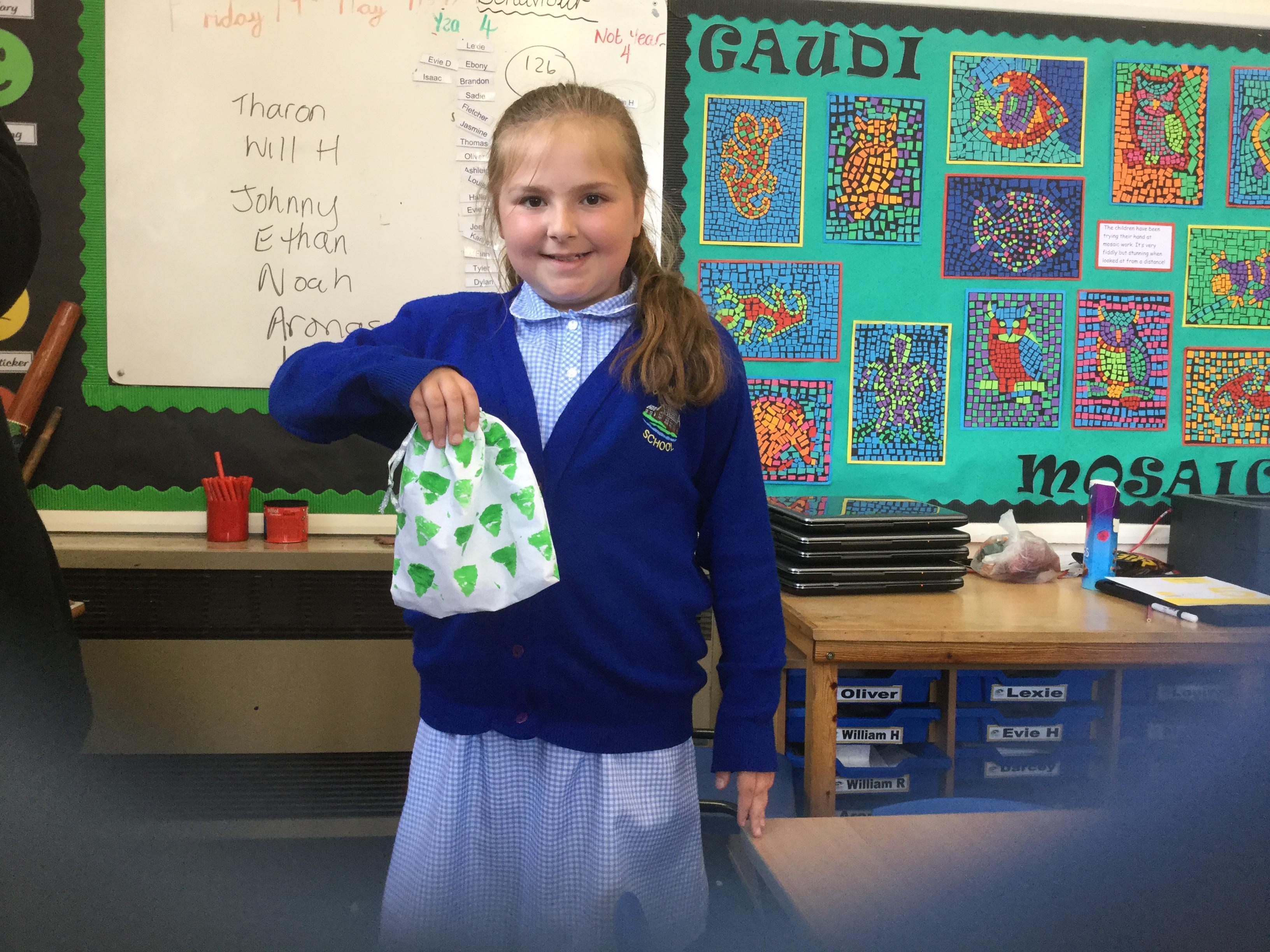 The children made little sacks to keep their Viking runes safe.  We printed patterns onto our cotton fabric using a potato stamp and printing ink.  Once the fabric was dry, the children had a go at sewing them to make a sack.  They did the hems themselves with a needle and thread then Mrs Scaplehorn gave them all a turn on her sewing machine so they could sew the sides shut. Lastly, a ribbon was added to act as a drawstring.  They look fantastic.