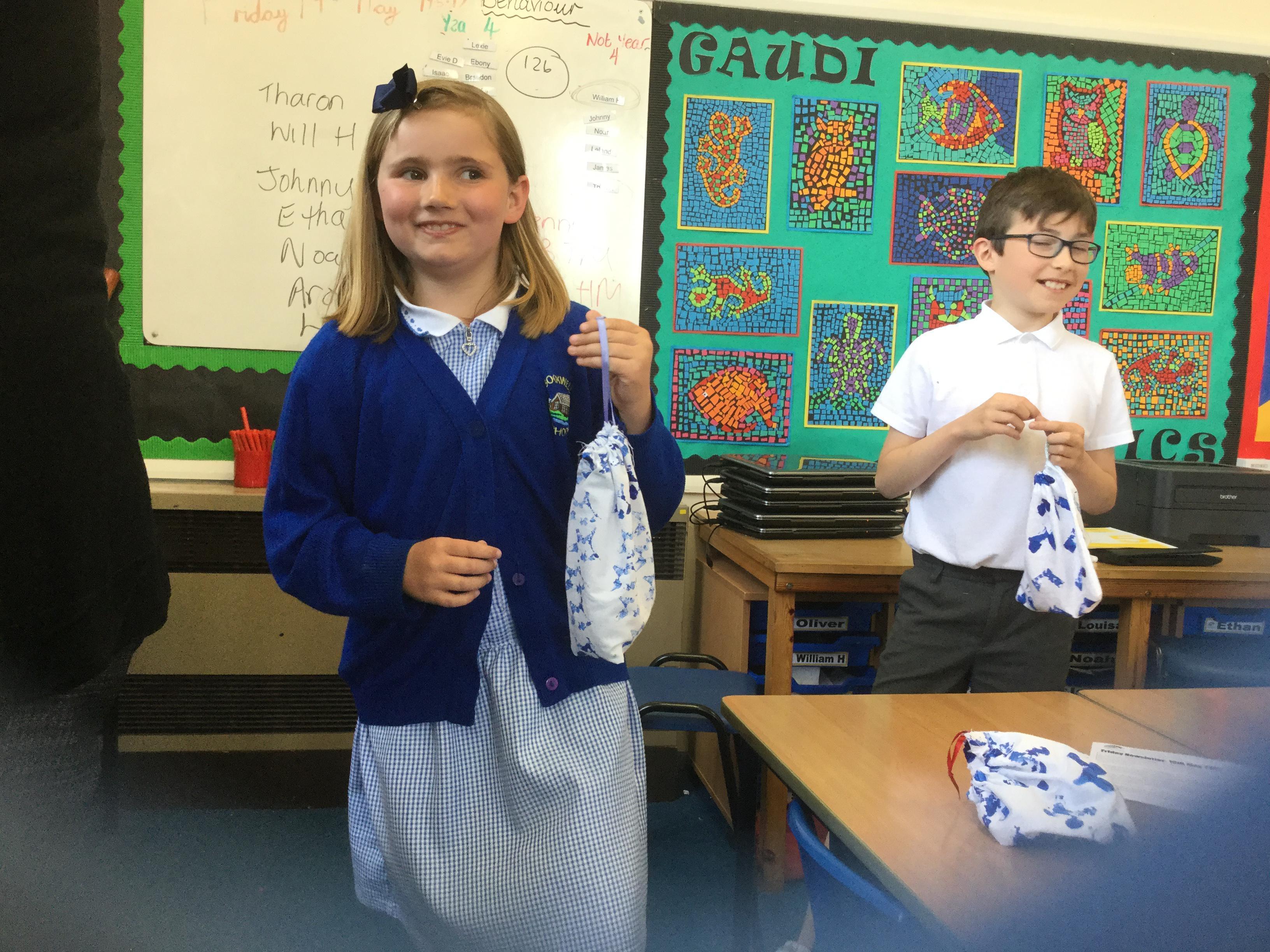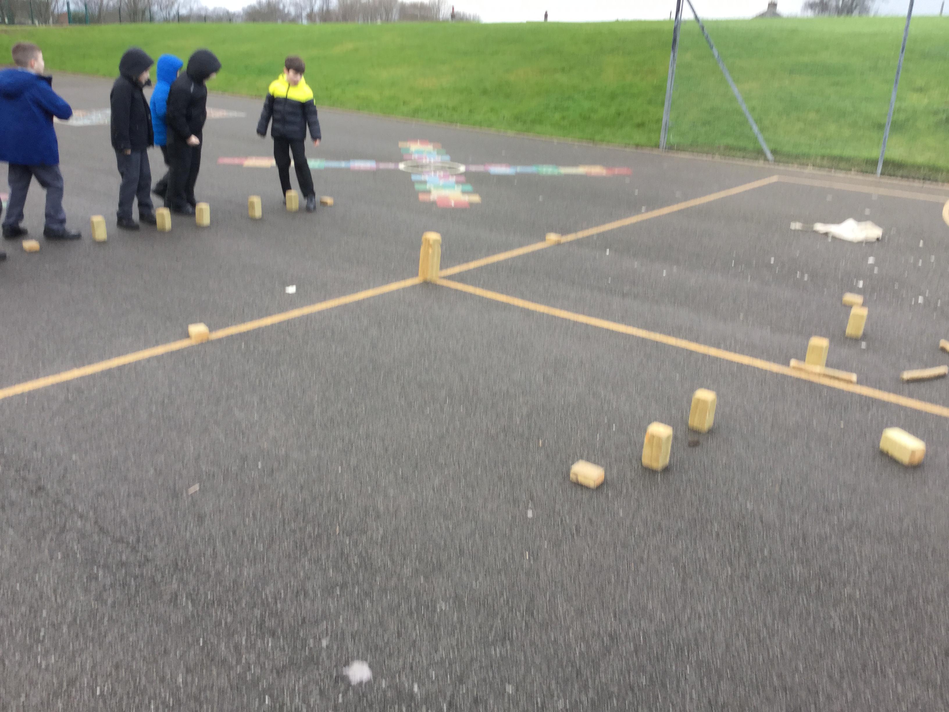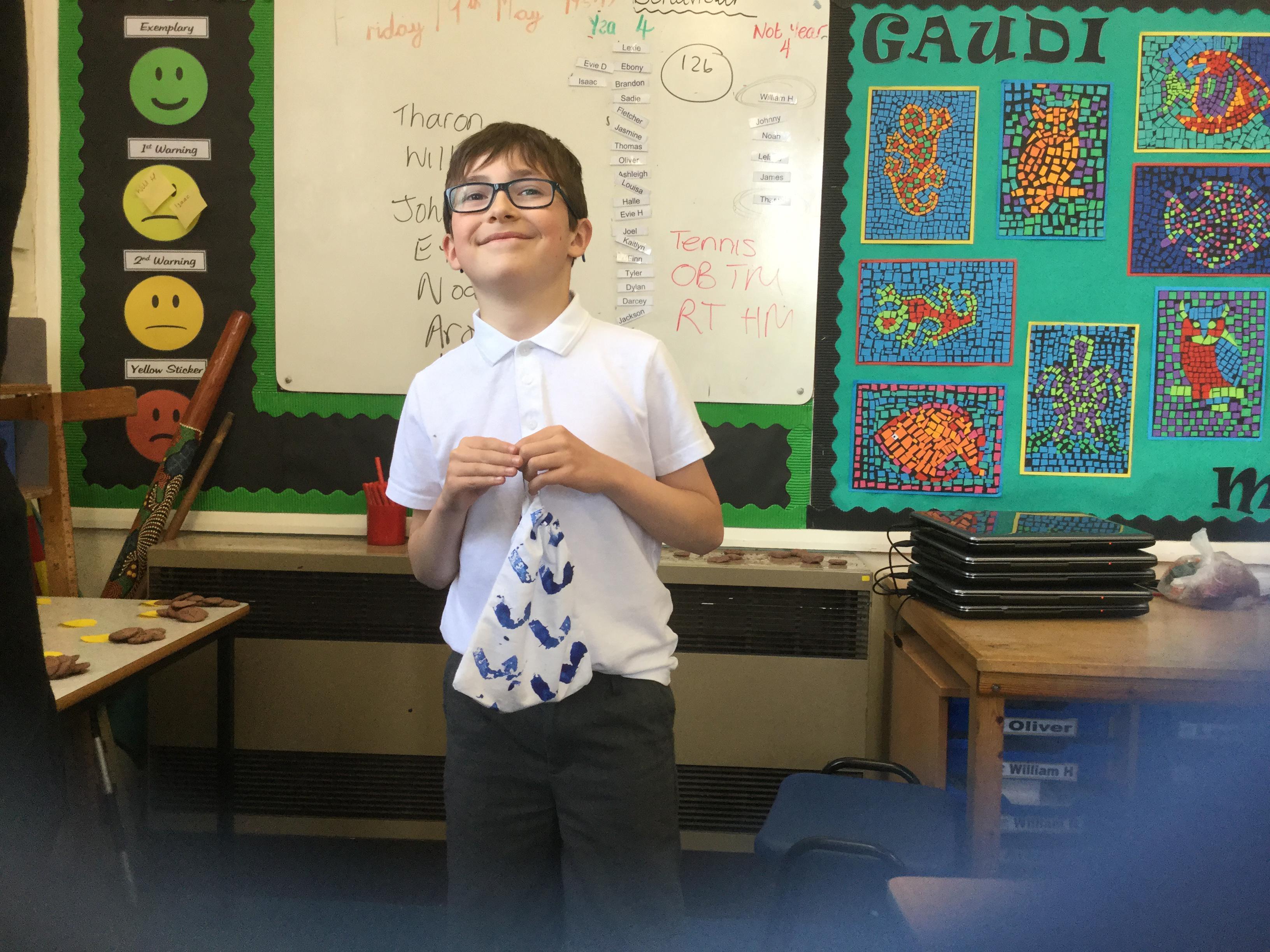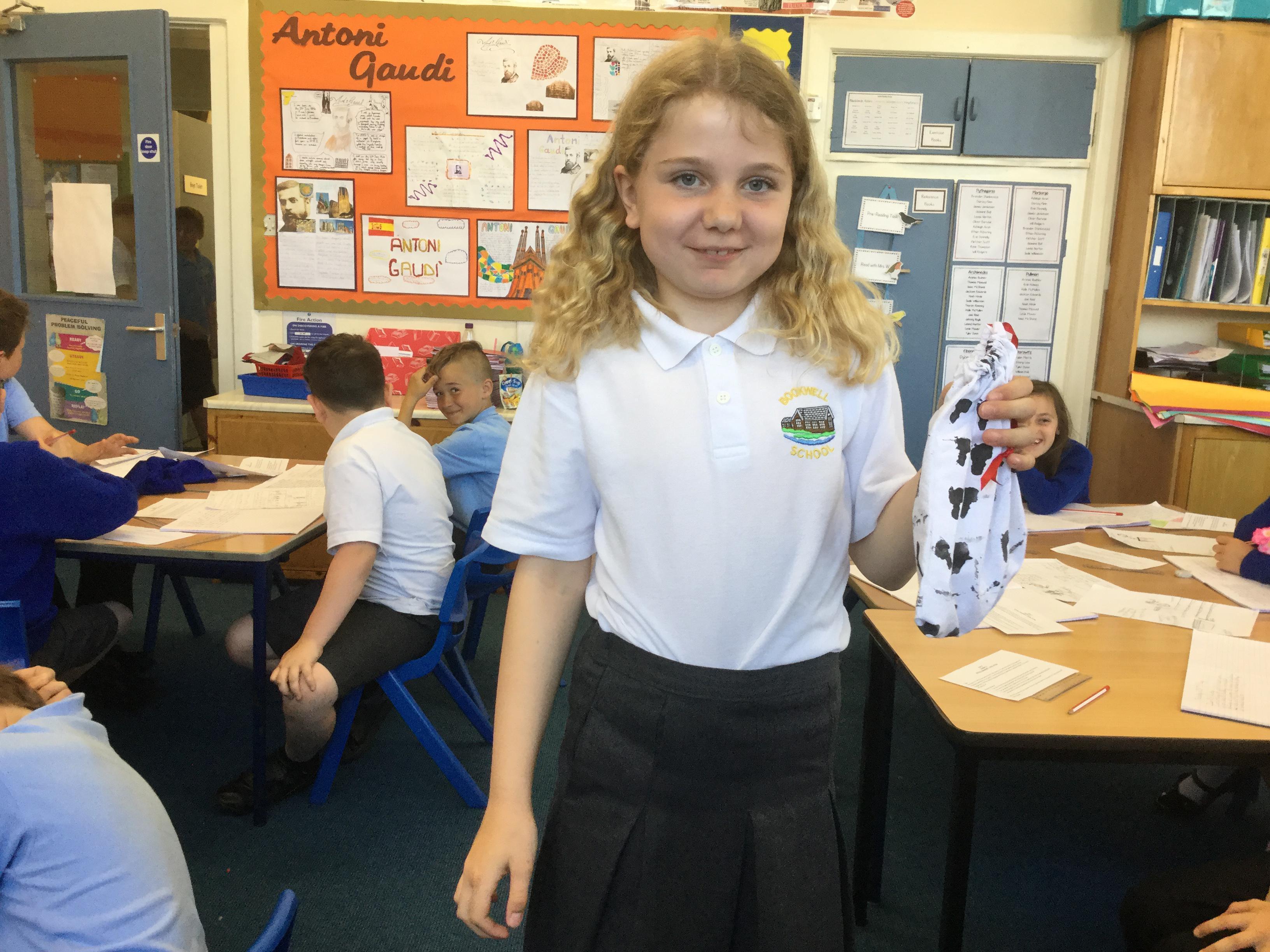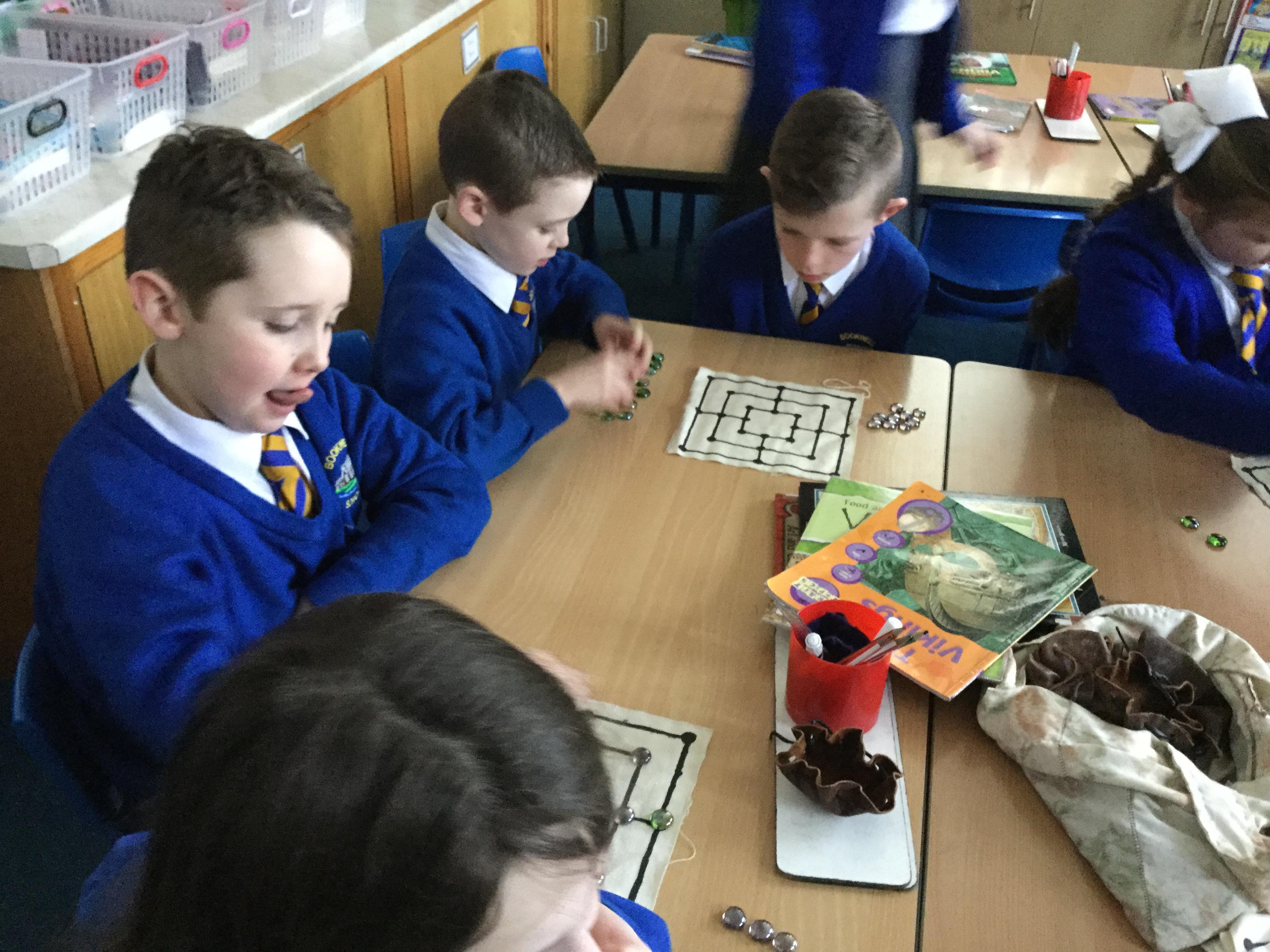 The children made little sacks to keep their Viking runes safe.  We printed patterns onto our cotton fabric using a potato stamp and printing ink.  Once the fabric was dry, the children had a go at sewing them to make a sack.  They did the hems themselves with a needle and thread then Mrs Scaplehorn gave them all a turn on her sewing machine so they could sew the sides shut. Lastly, a ribbon was added to act as a drawstring.  They look fantastic.