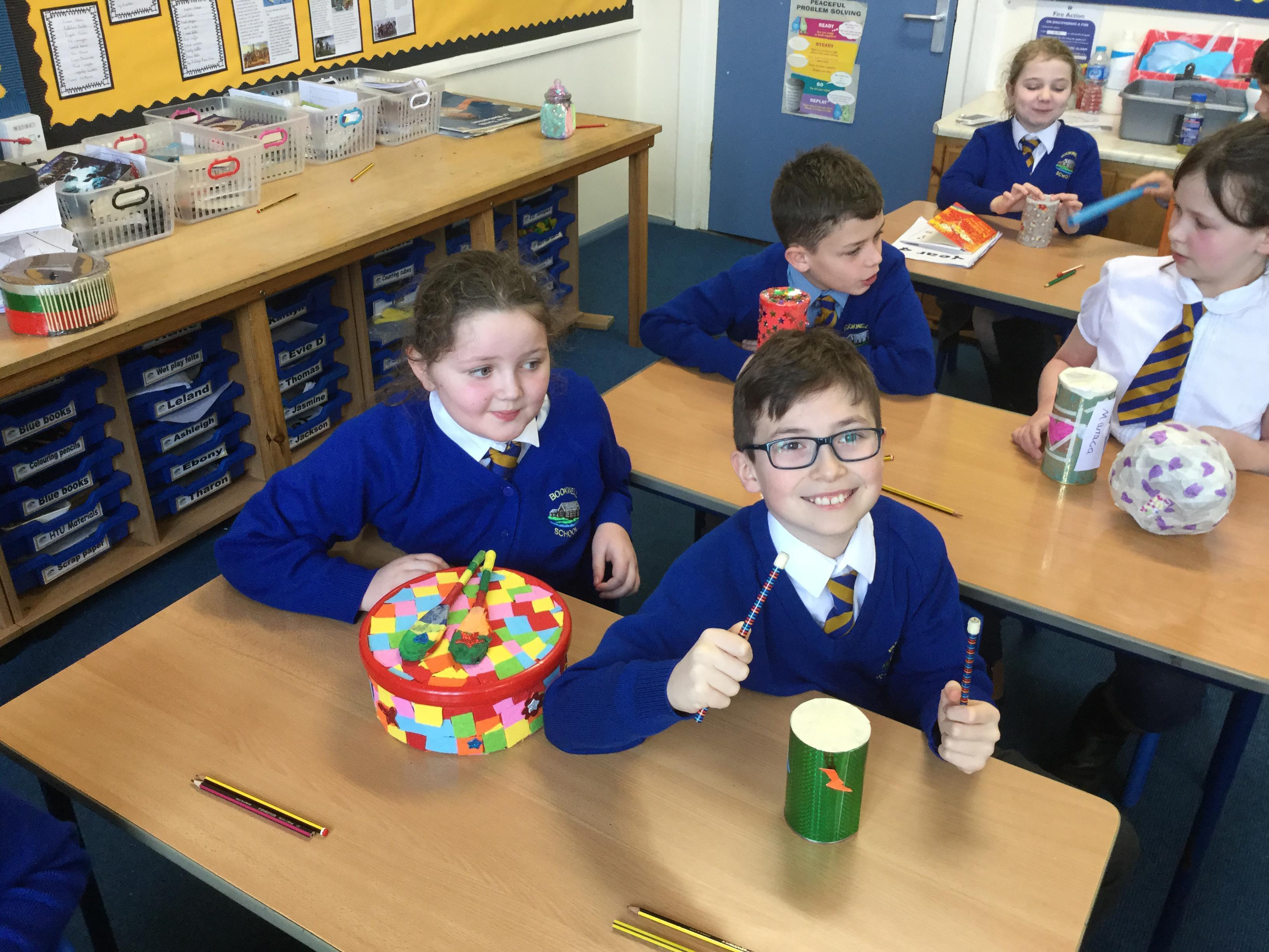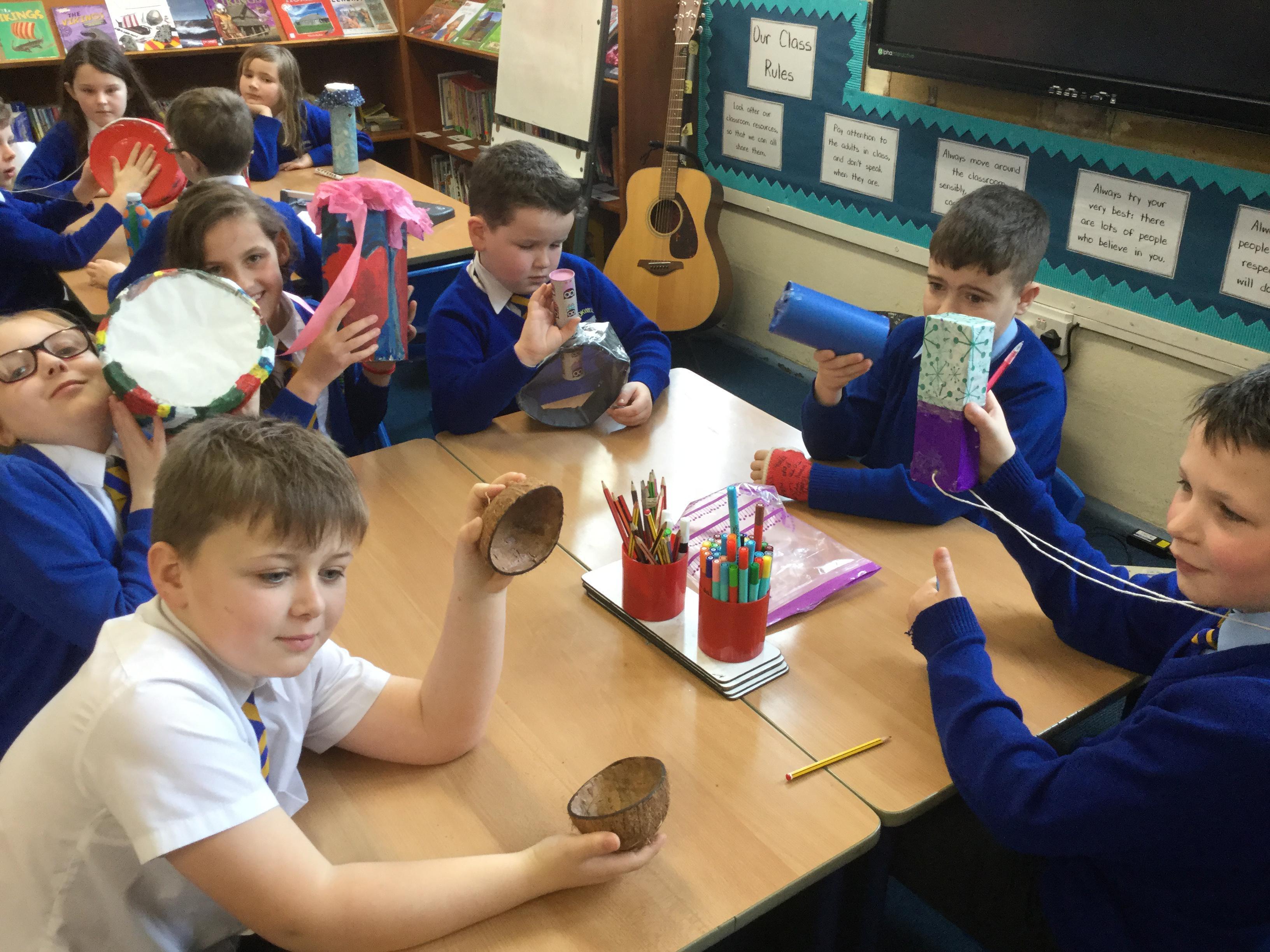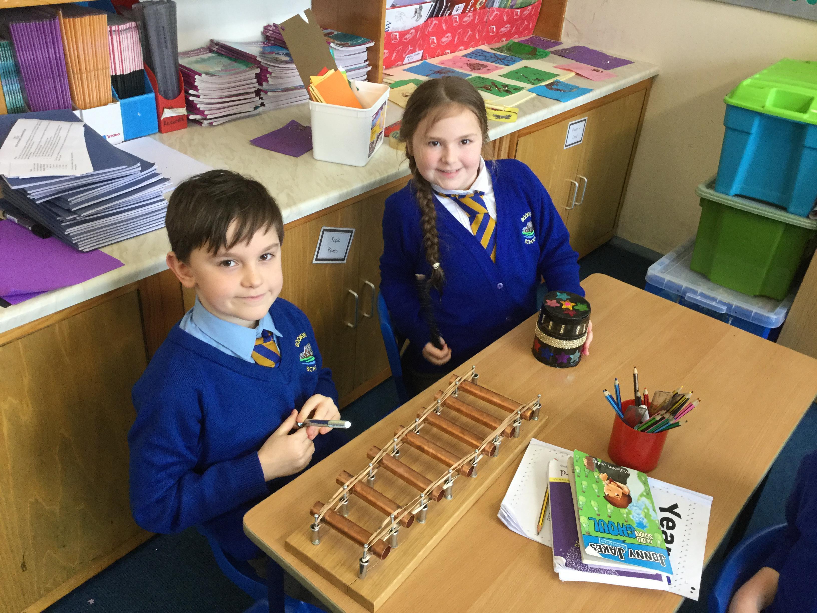 The children made musical instruments for their holiday homework. They made a beautiful job of them and we had a great time playing them in our music lesson.