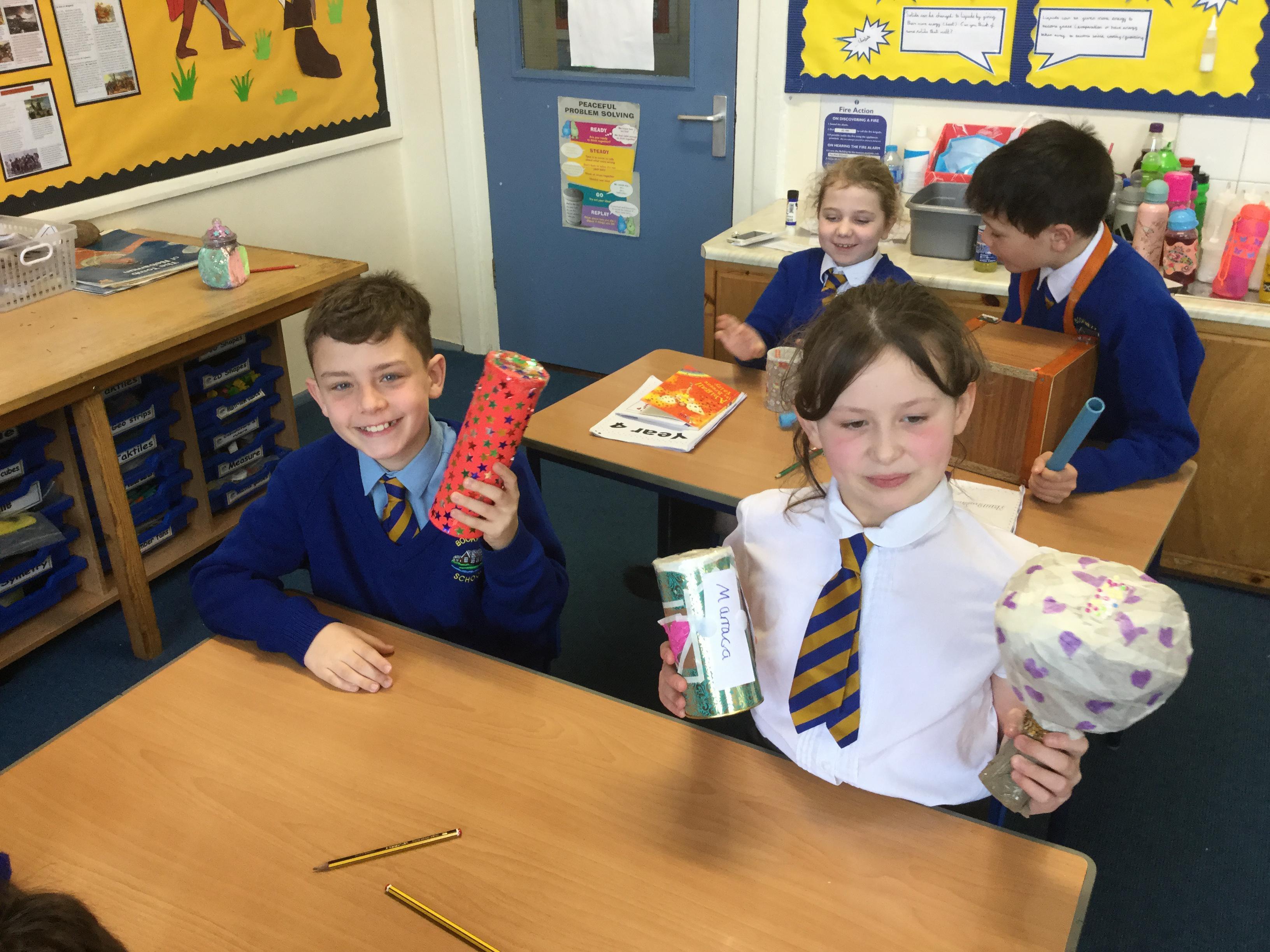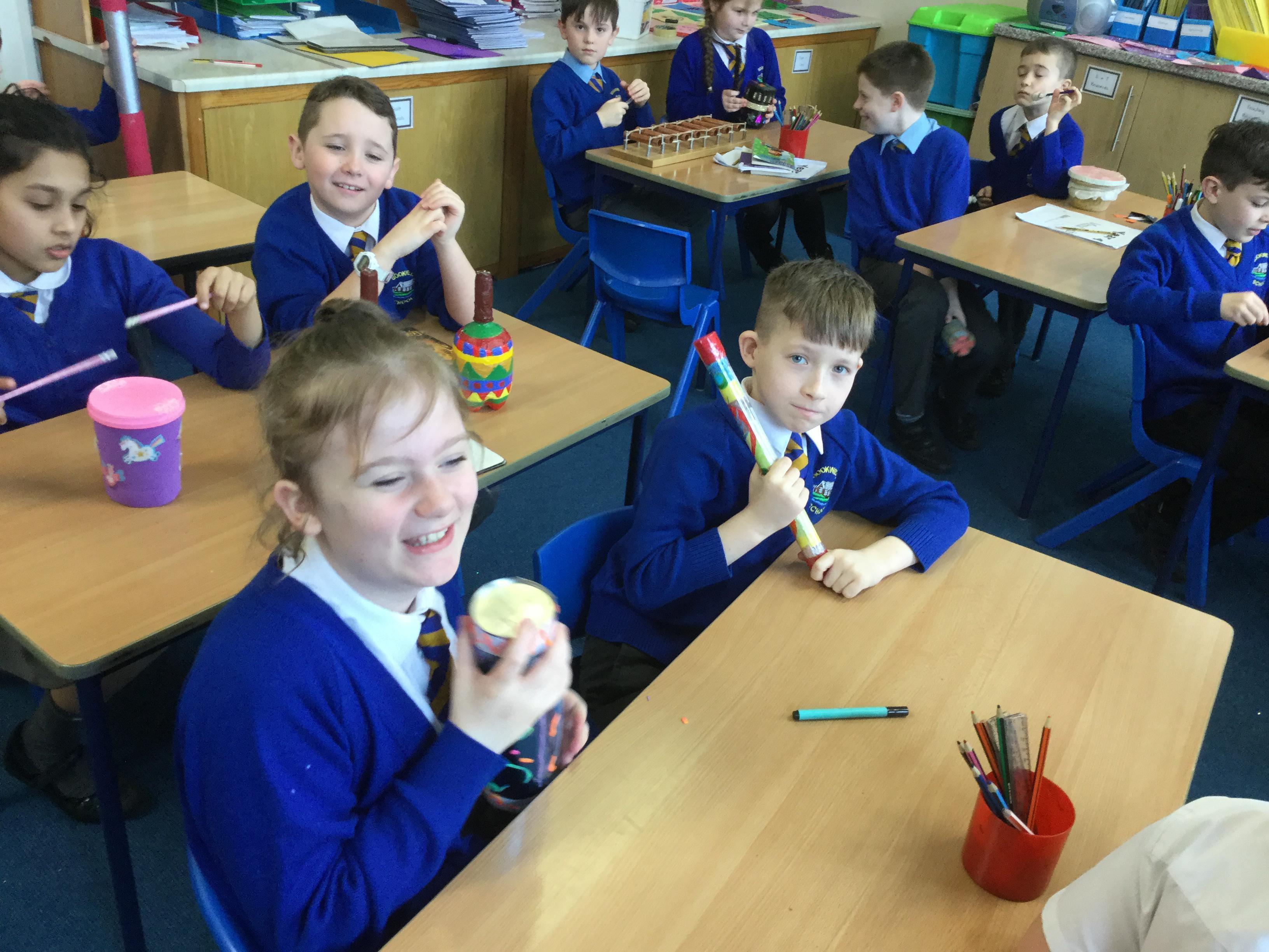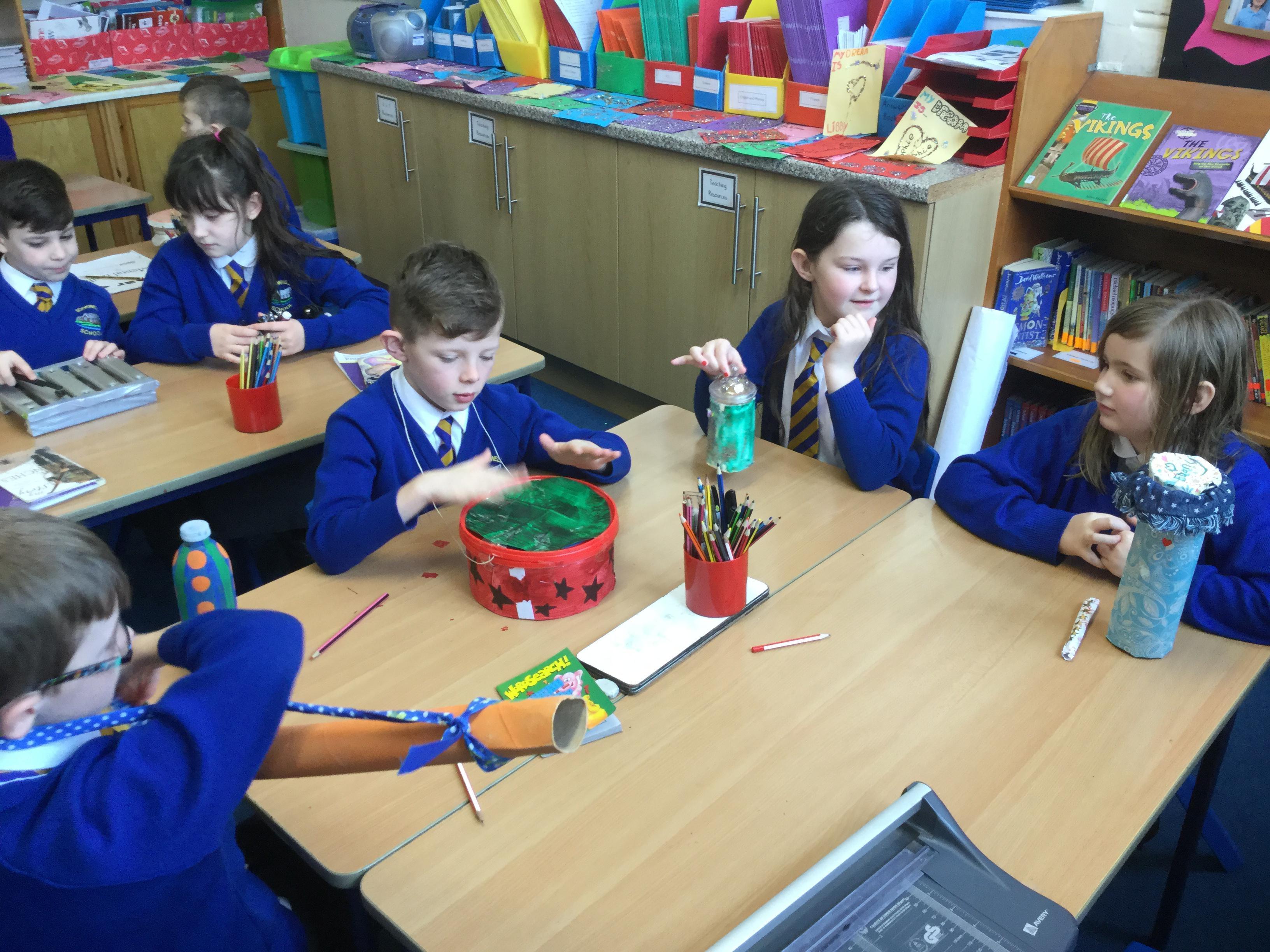 The children made musical instruments for their holiday homework. They made a beautiful job of them and we had a great time playing them in our music lesson.