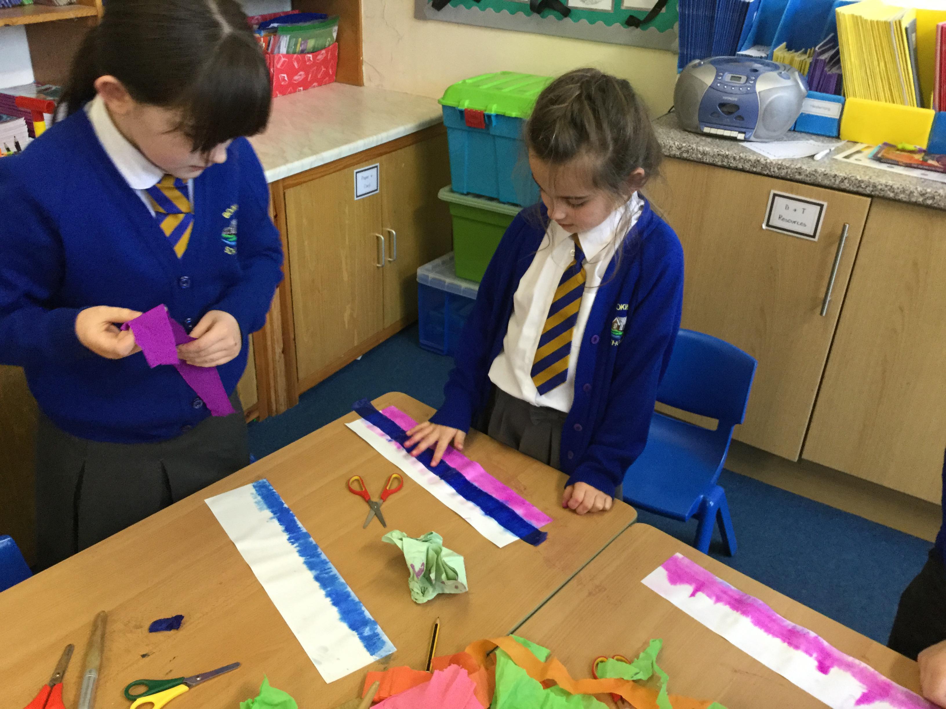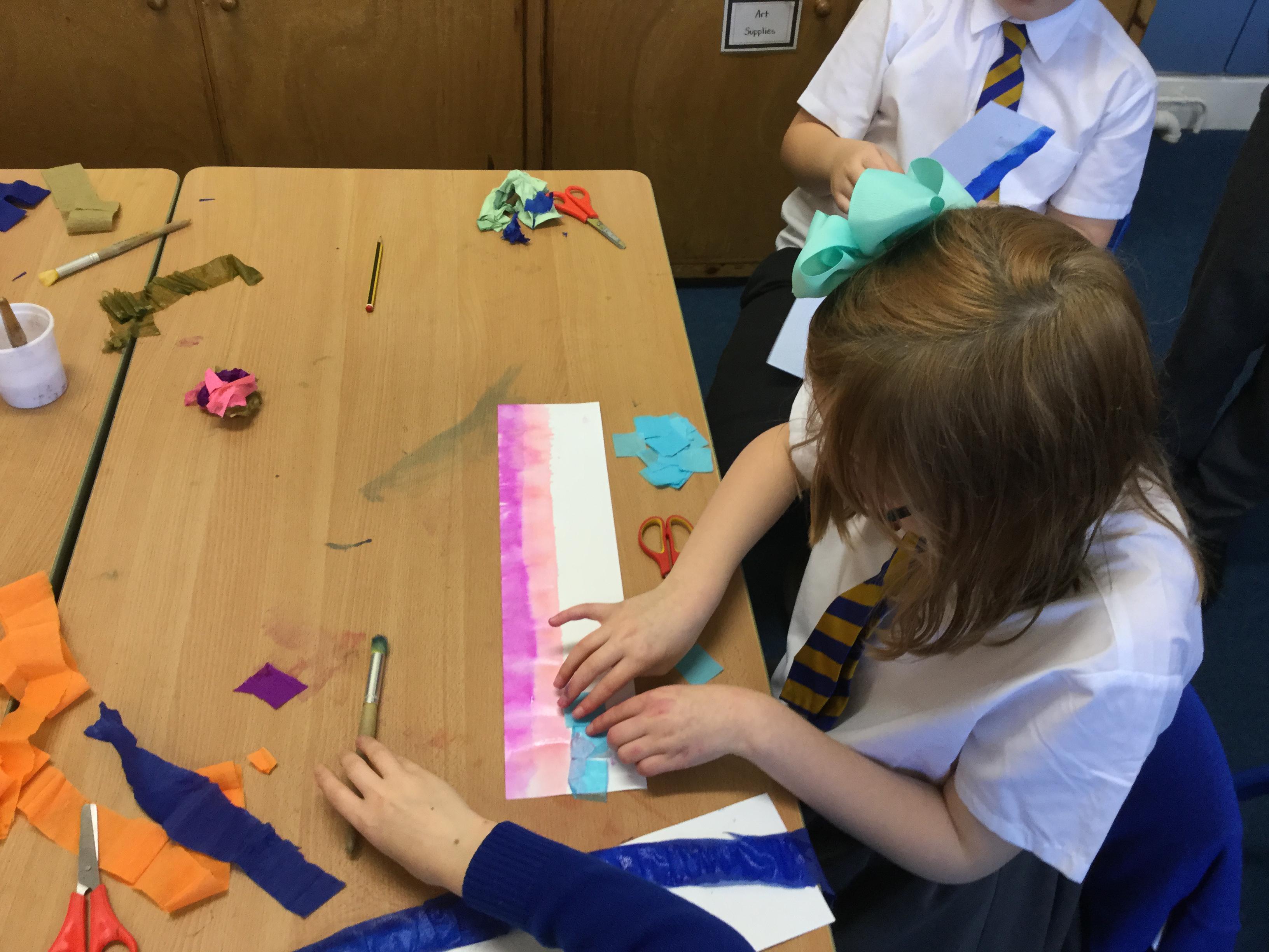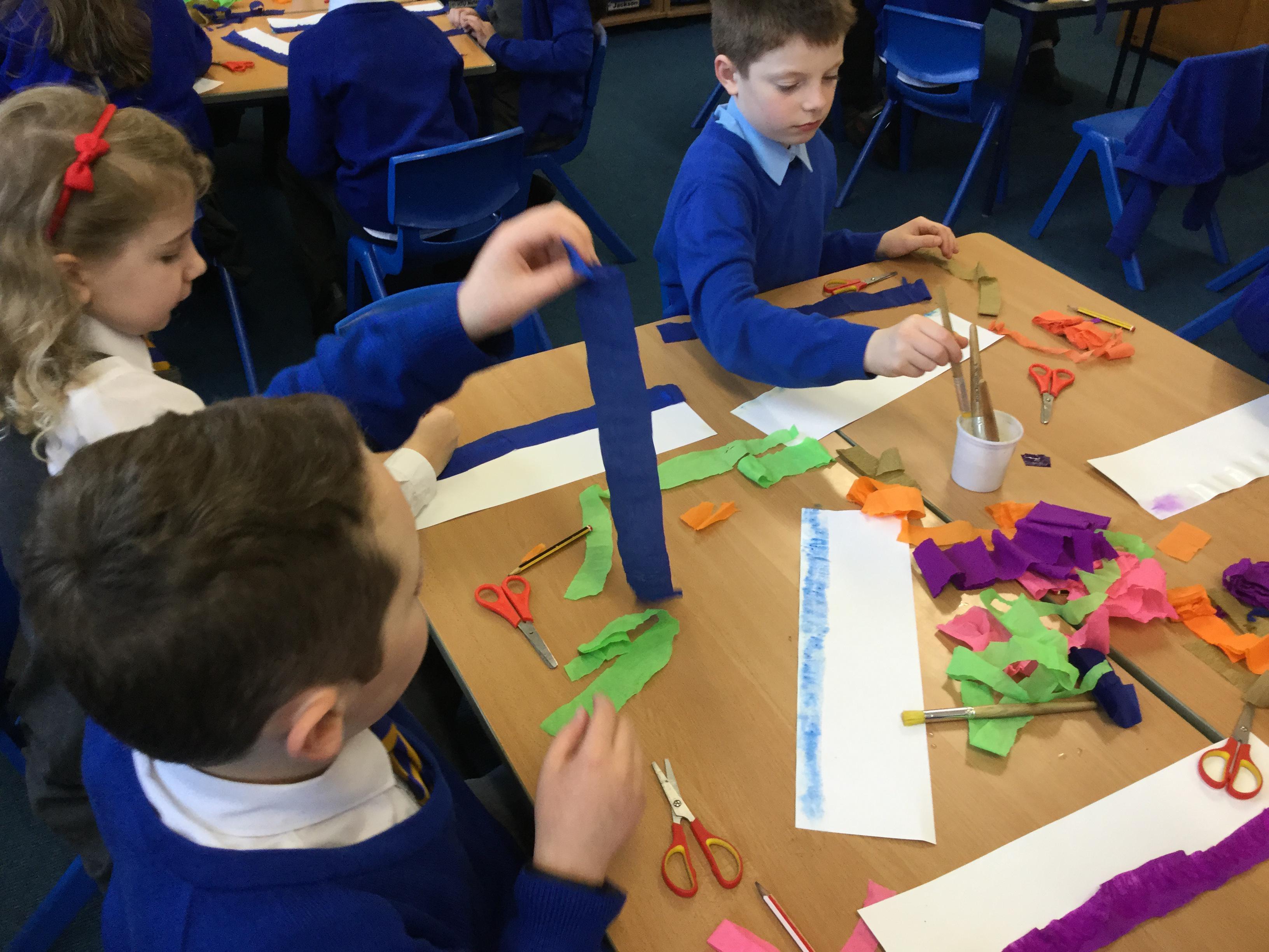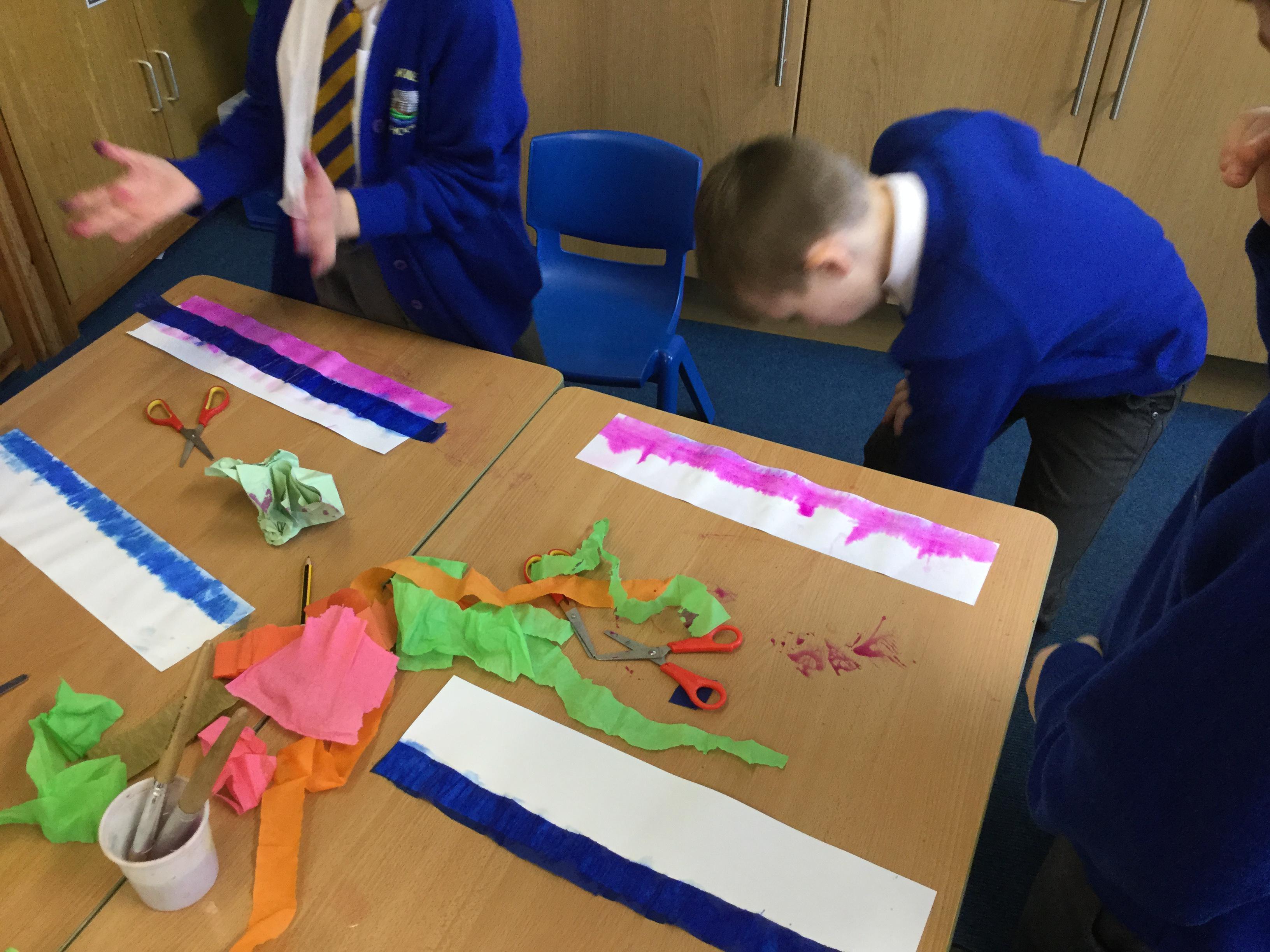 We have a couple of Art projects under way this half term. We have started making 'Calligraphy Banners' for our Chinese New Year mini-topic. We dyed cartridge paper using tissue and crepe paper to make the background for our Chinese writing.