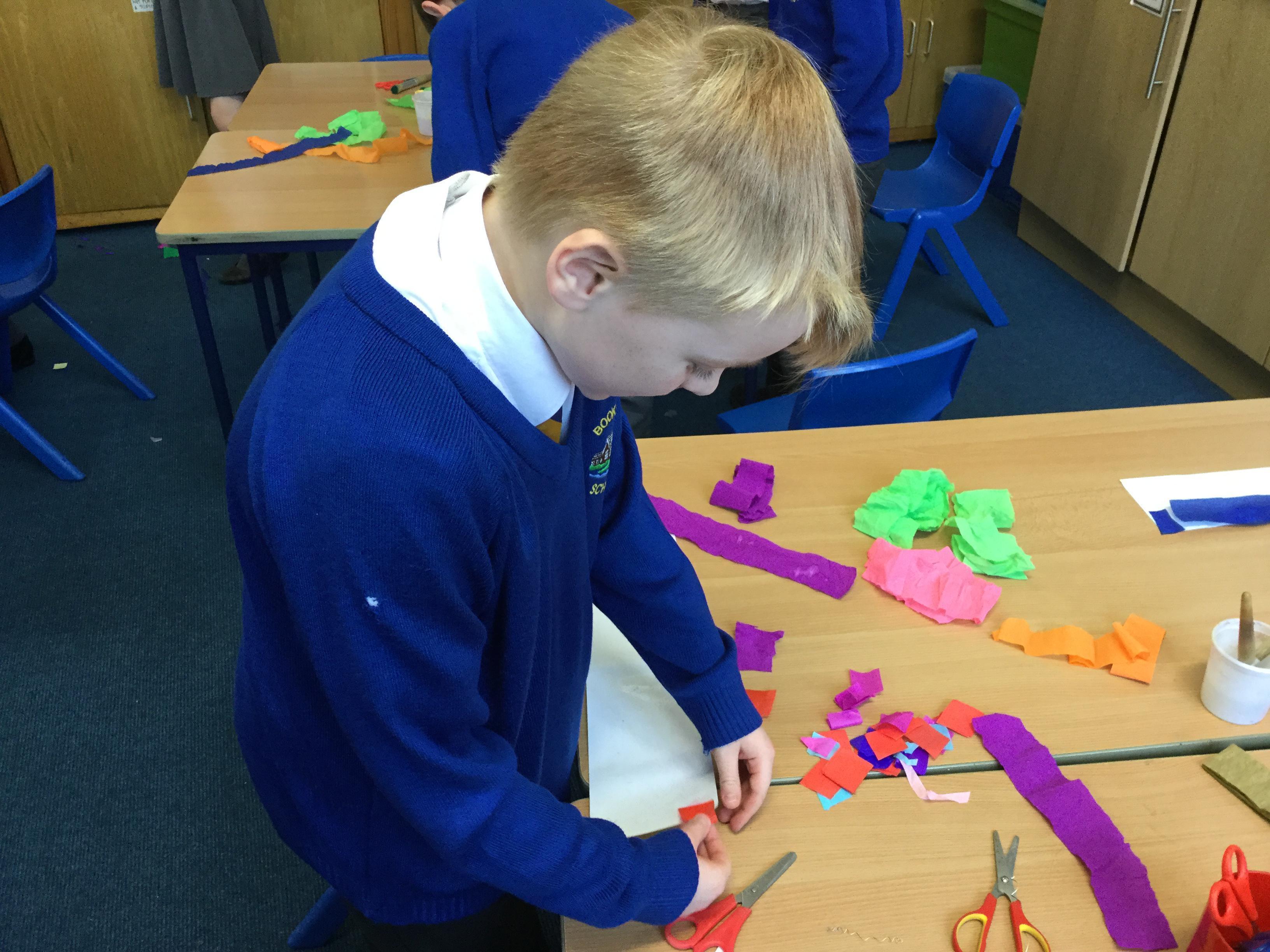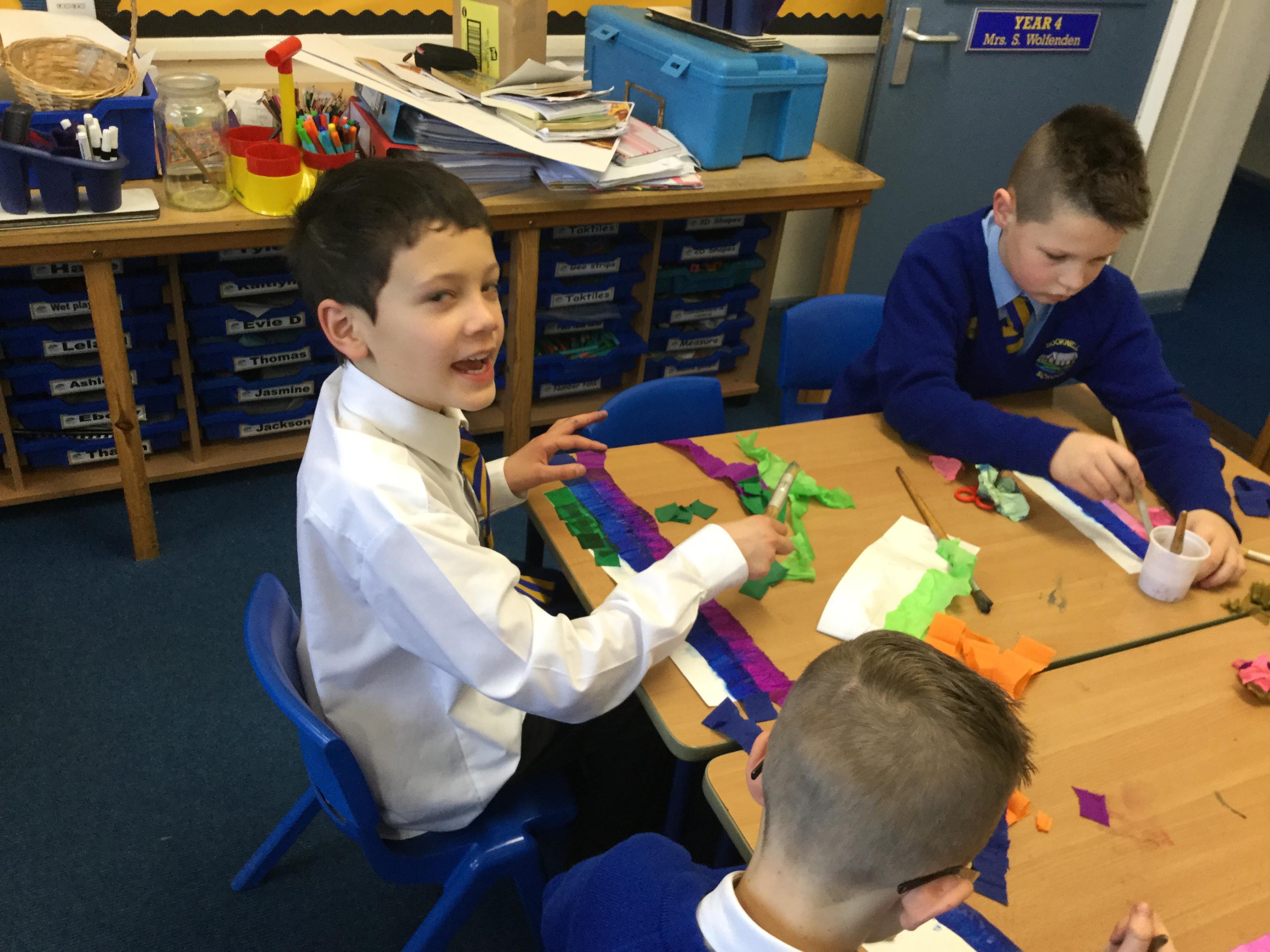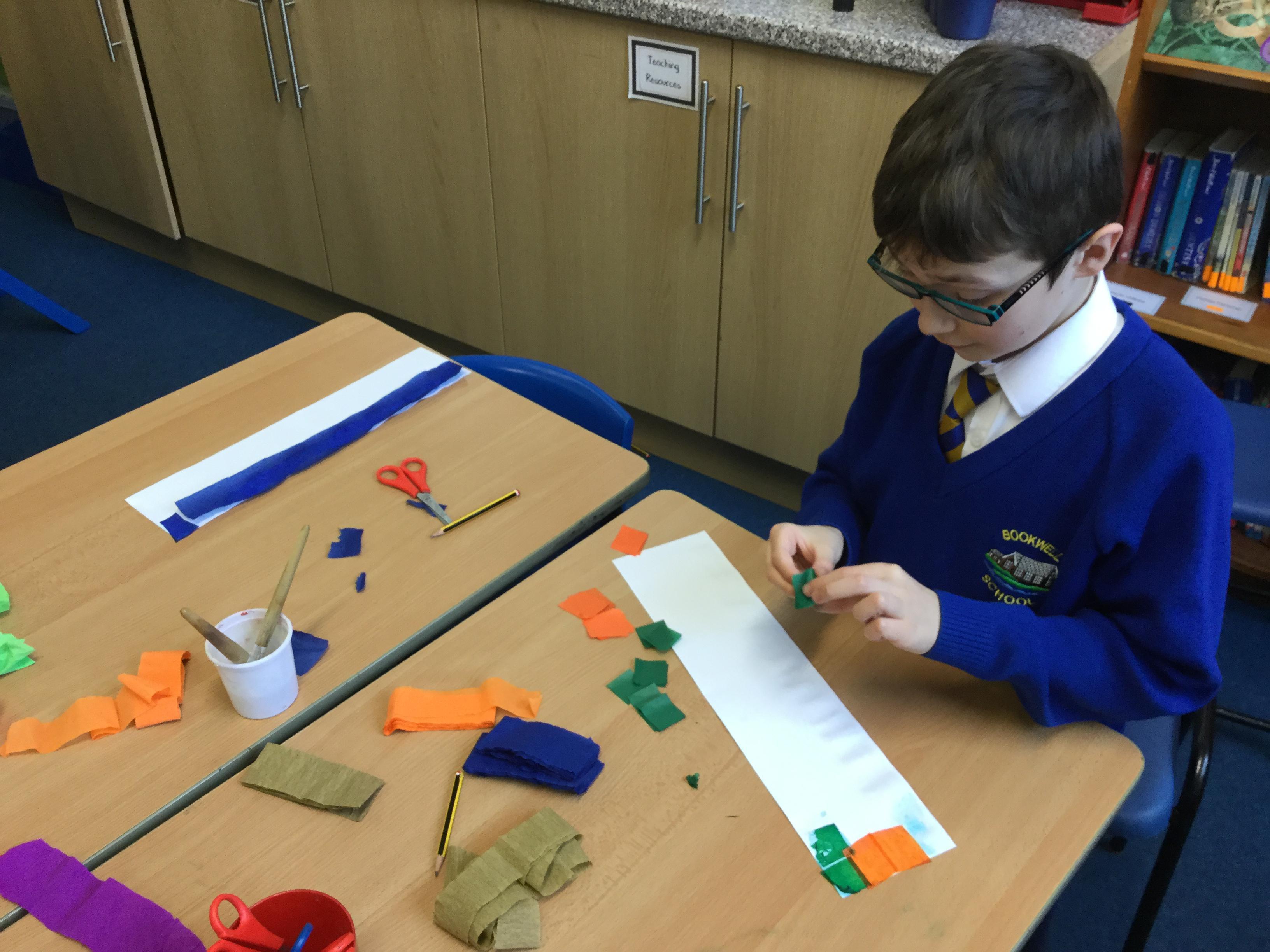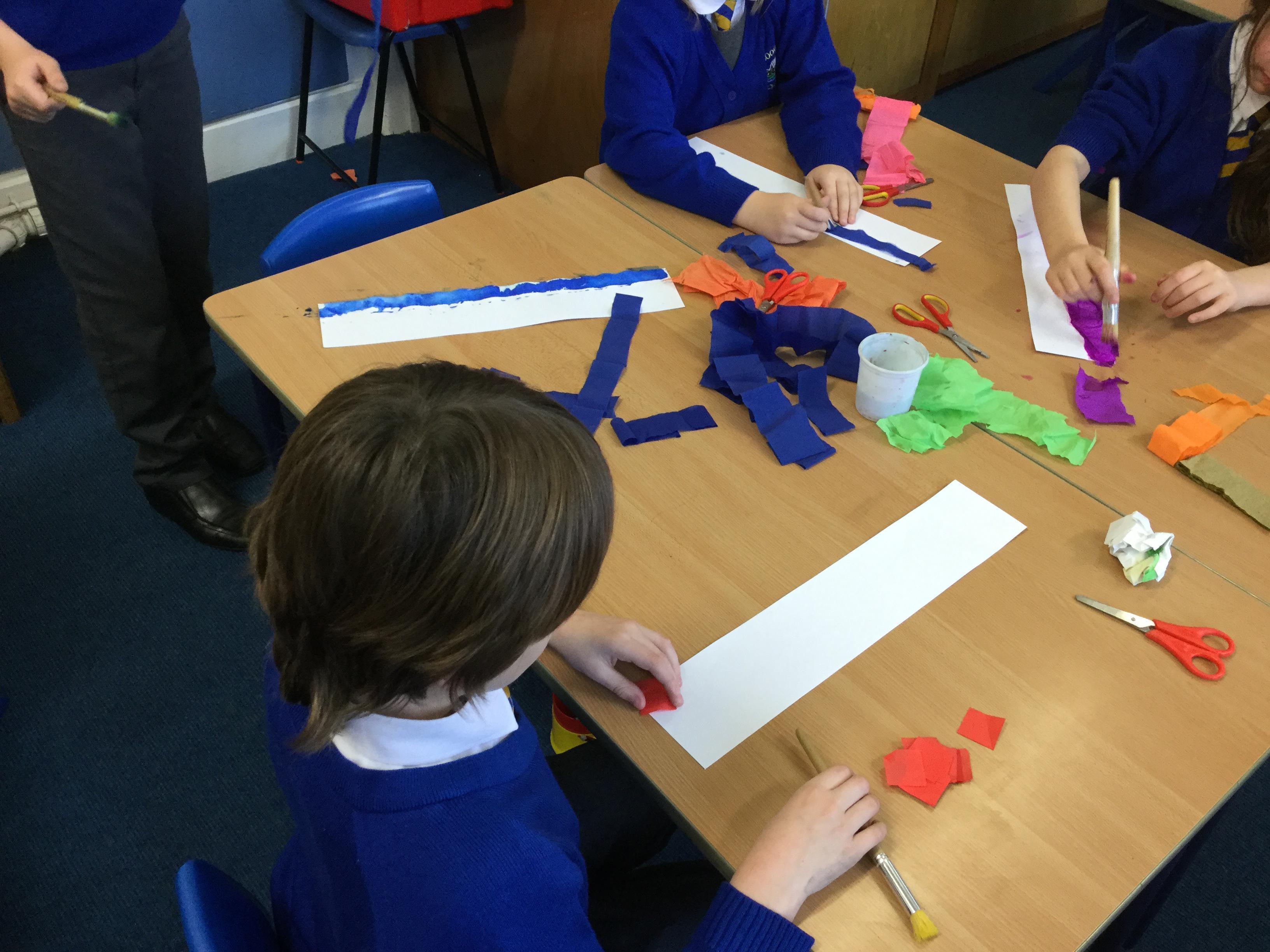 We have a couple of Art projects under way this half term. We have started making 'Calligraphy Banners' for our Chinese New Year mini-topic. We dyed cartridge paper using tissue and crepe paper to make the background for our Chinese writing.