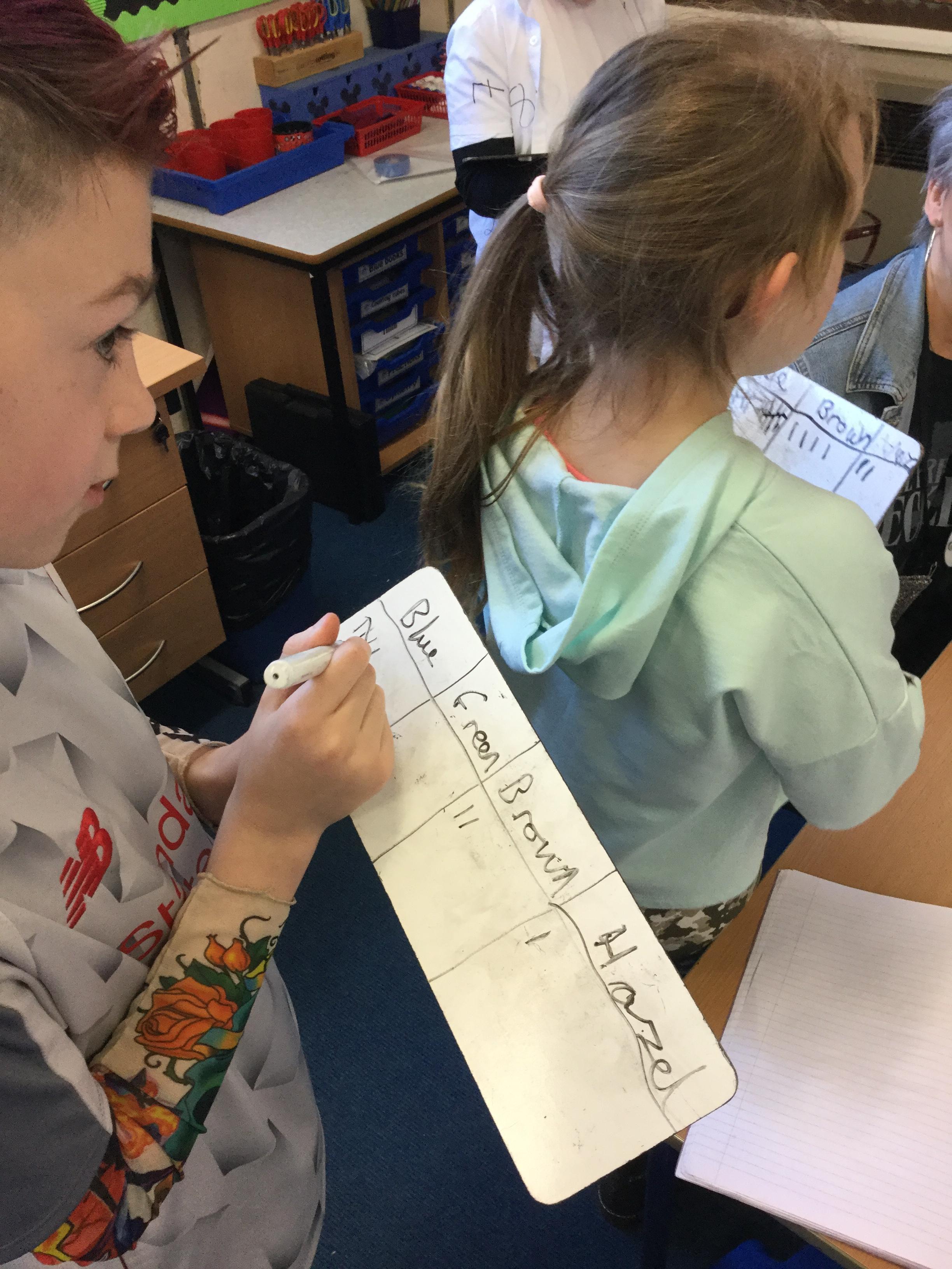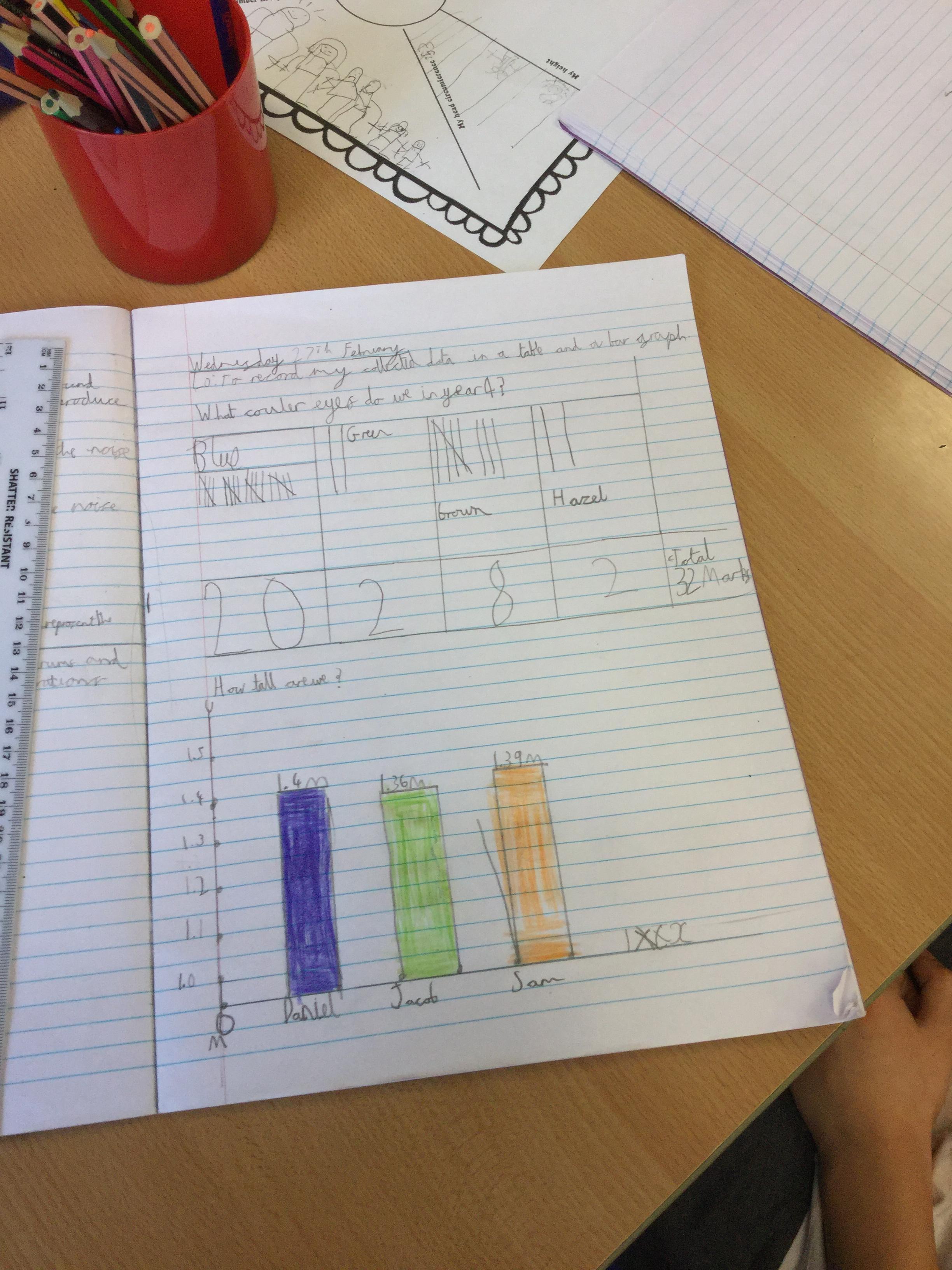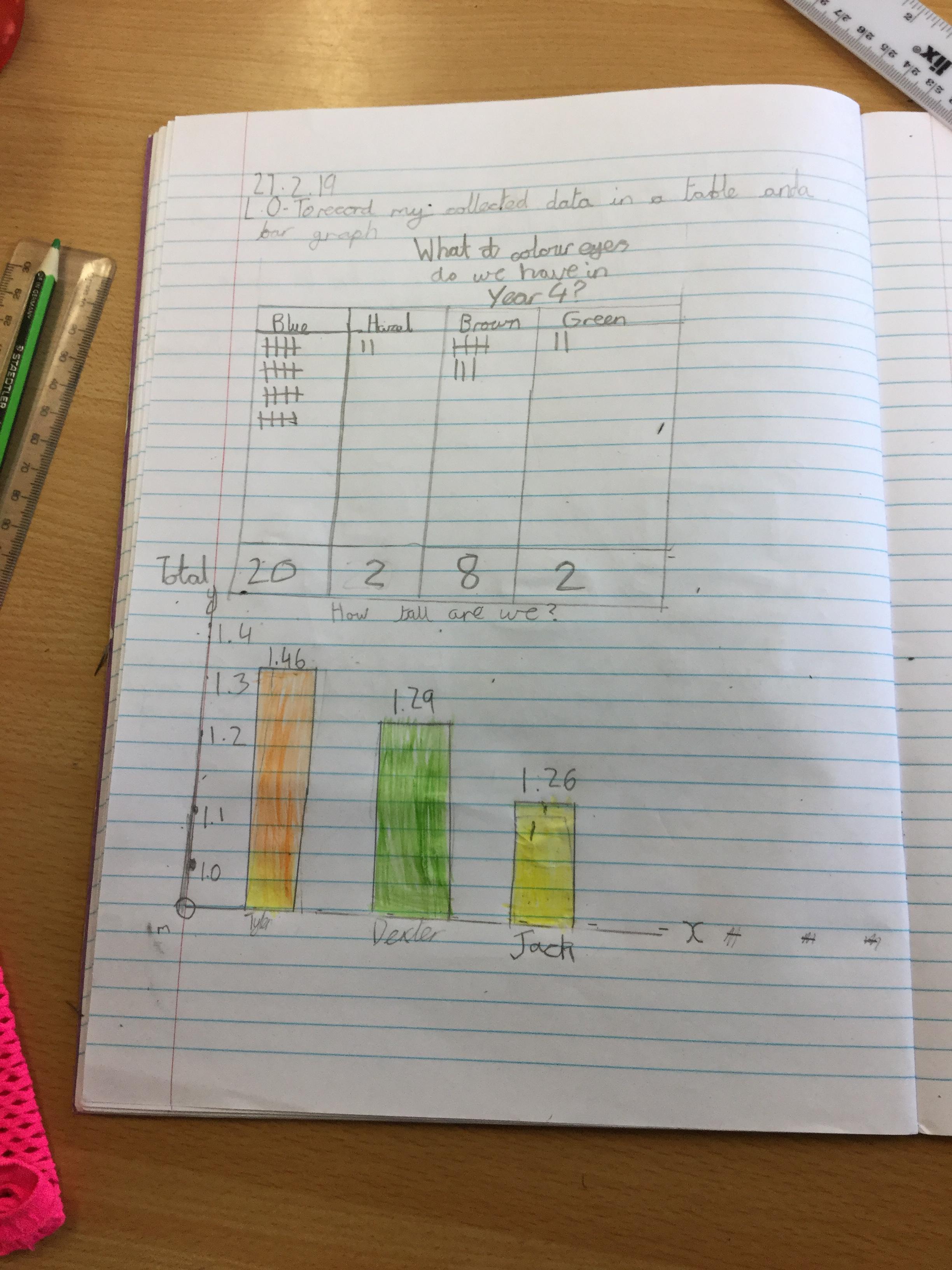 In Science we have investigated height and how tall each member of our class is and also looked at eye colour, to determine which was the most popular colour within our class. To measure our height we worked in pairs using metre sticks to get an accurate result and to collate data for eye colour we completed a class survey. We took the results and created a bar graph and table to show our findings and compare the data collected.