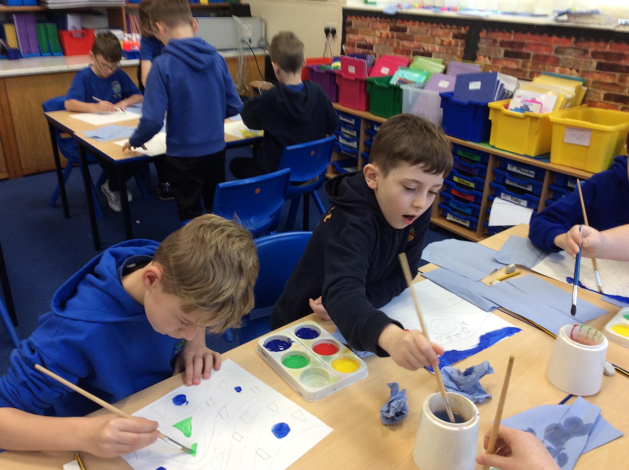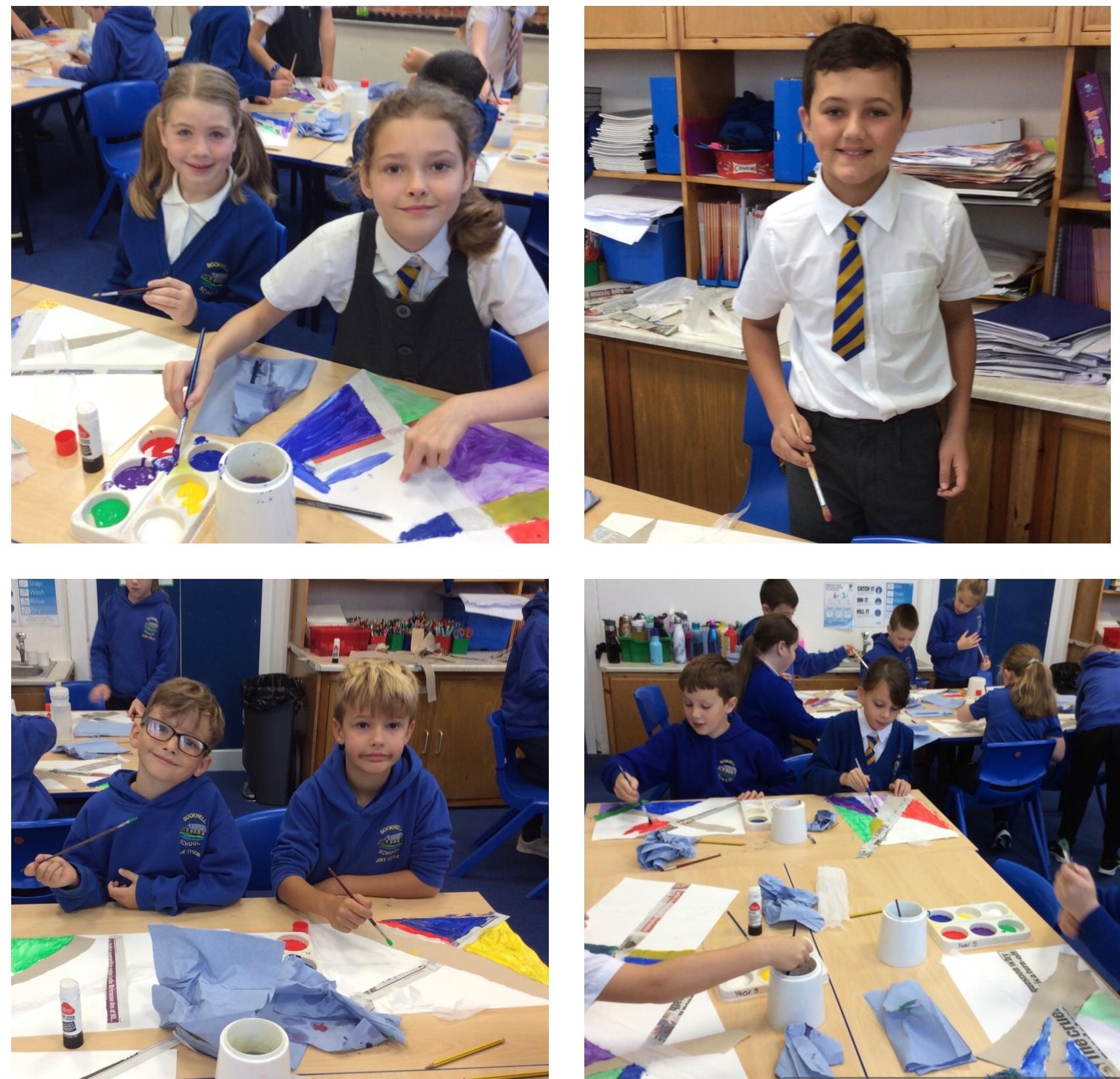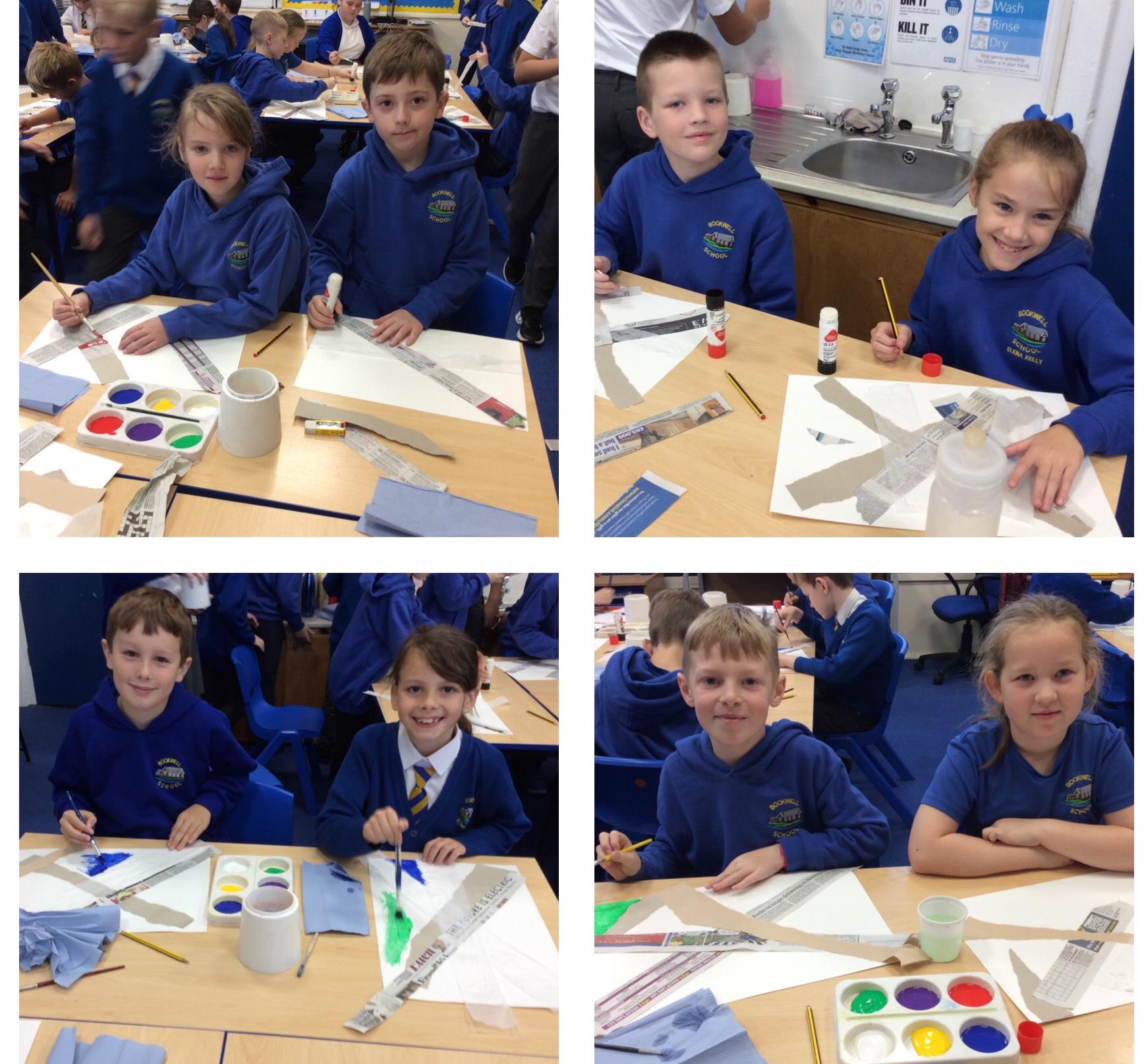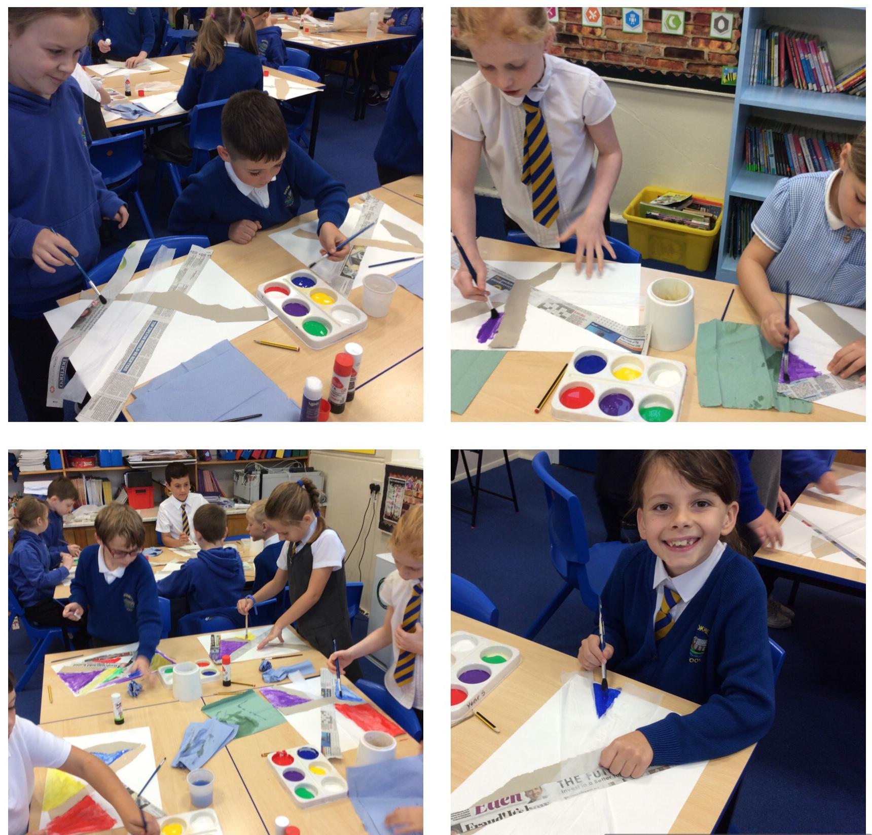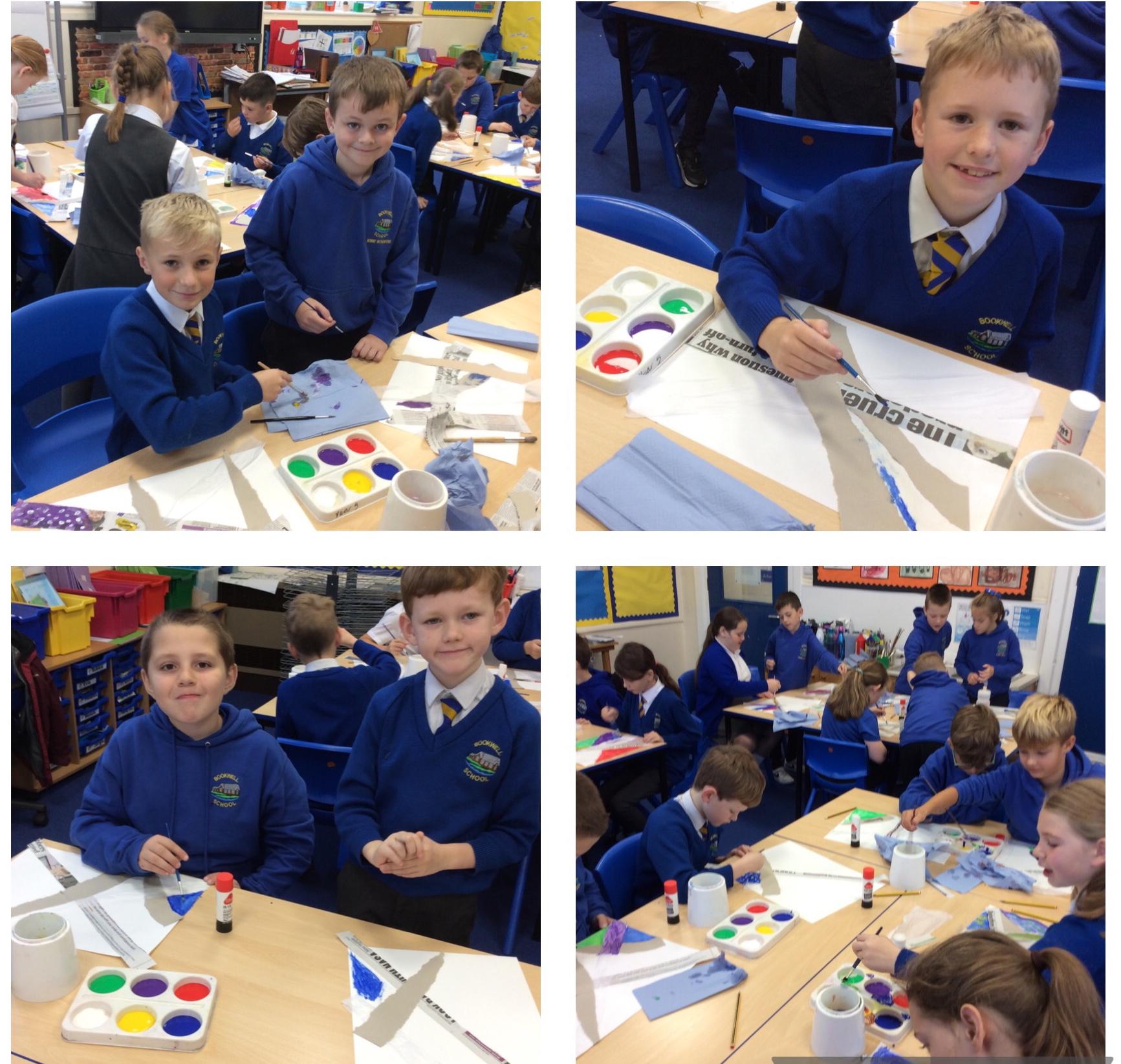 Year 4 have enjoyed using collage to build up a textured surface to paint on. They have mixed colours and overpainted areas to add detail and interest. Their concentration and skill was impressive and they were very organised with their resources. Well done Year 4.