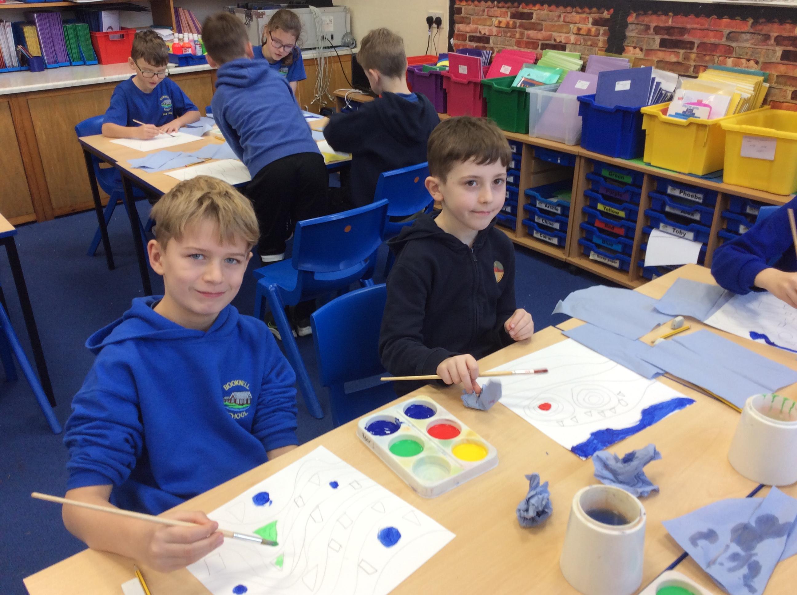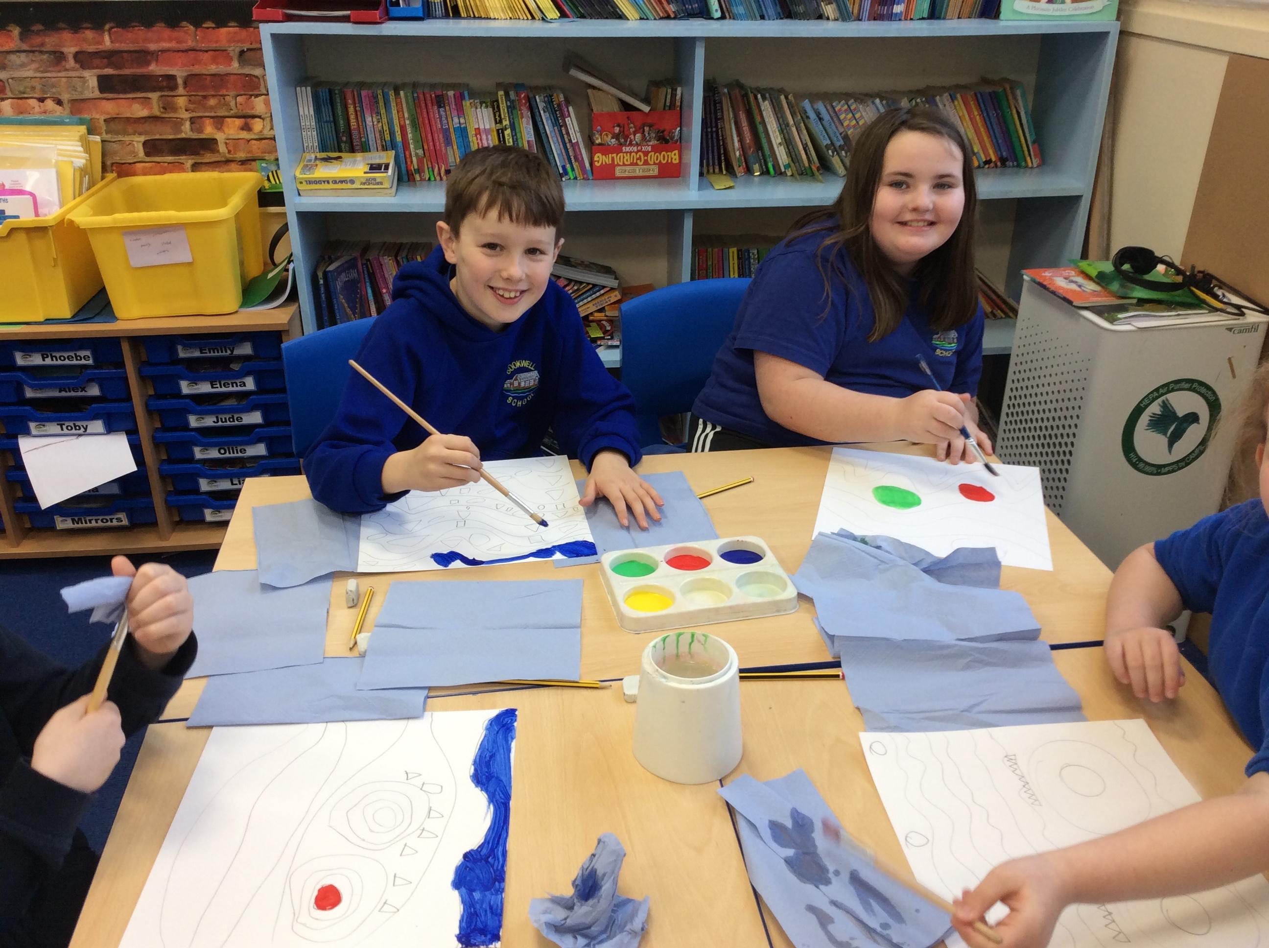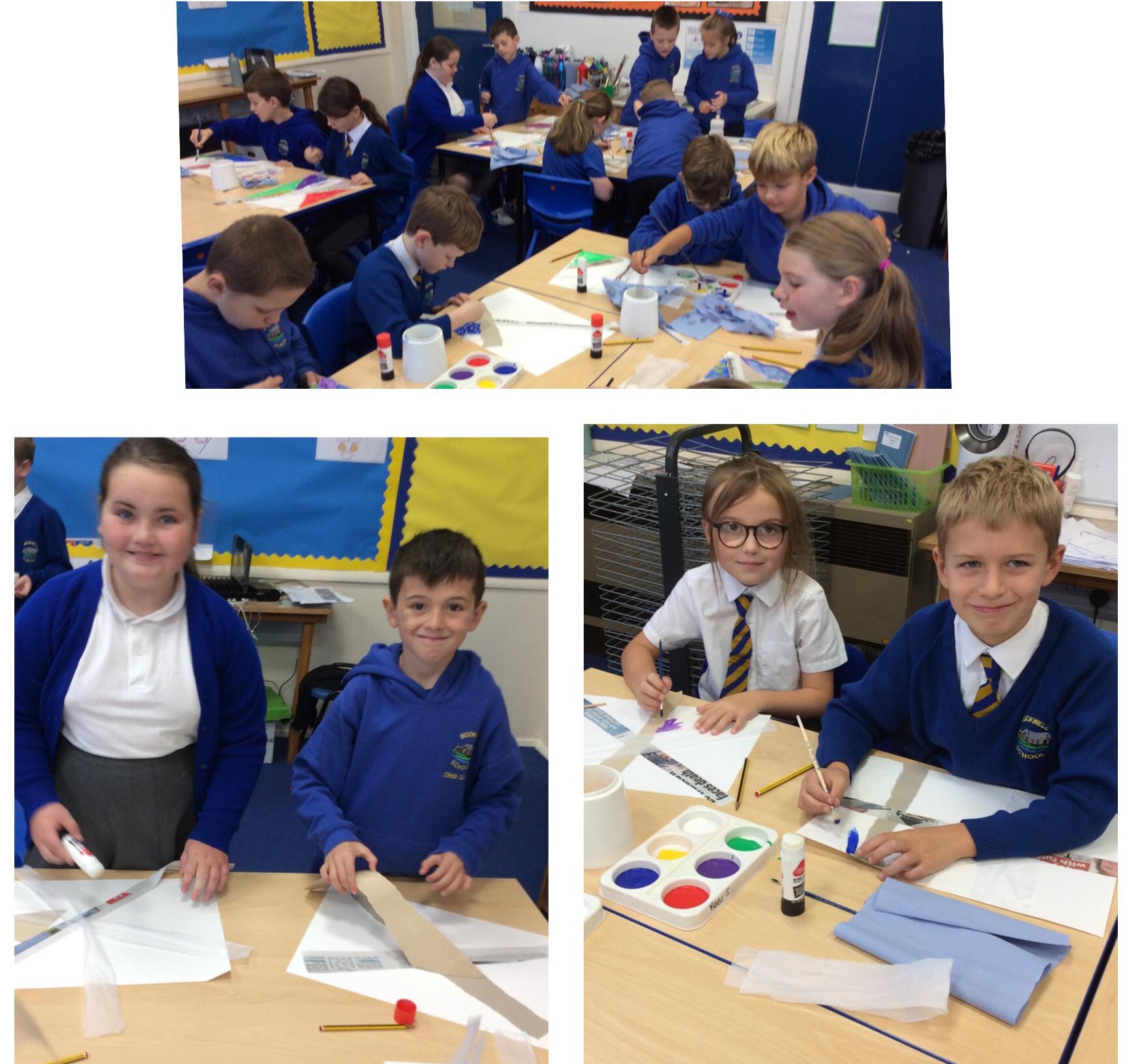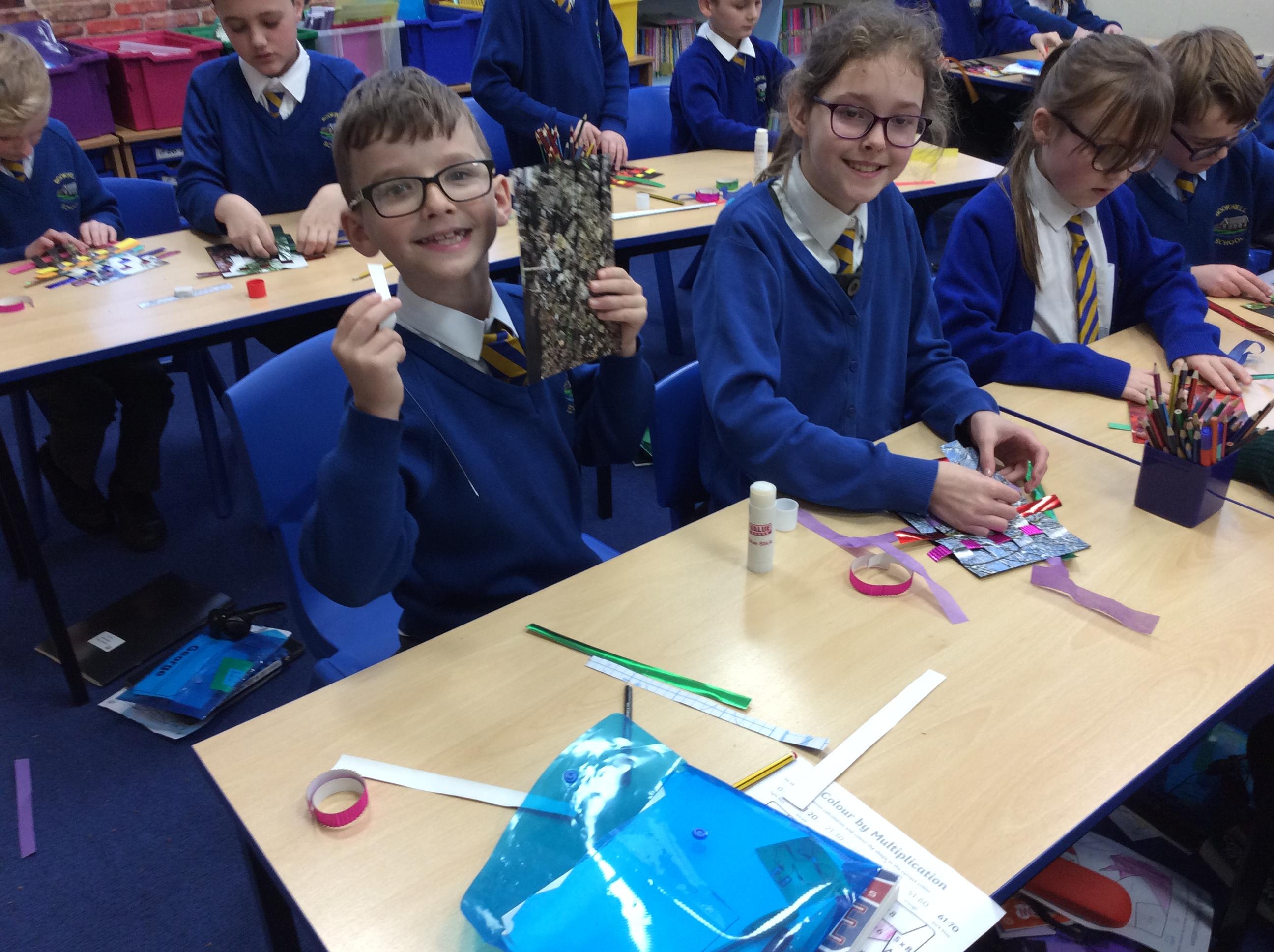 Year 4 have enjoyed using collage to build up a textured surface to paint on. They have mixed colours and overpainted areas to add detail and interest. Their concentration and skill was impressive and they were very organised with their resources. Well done Year 4.