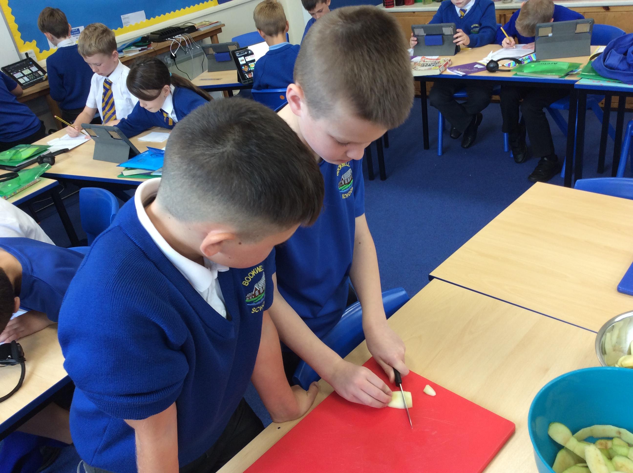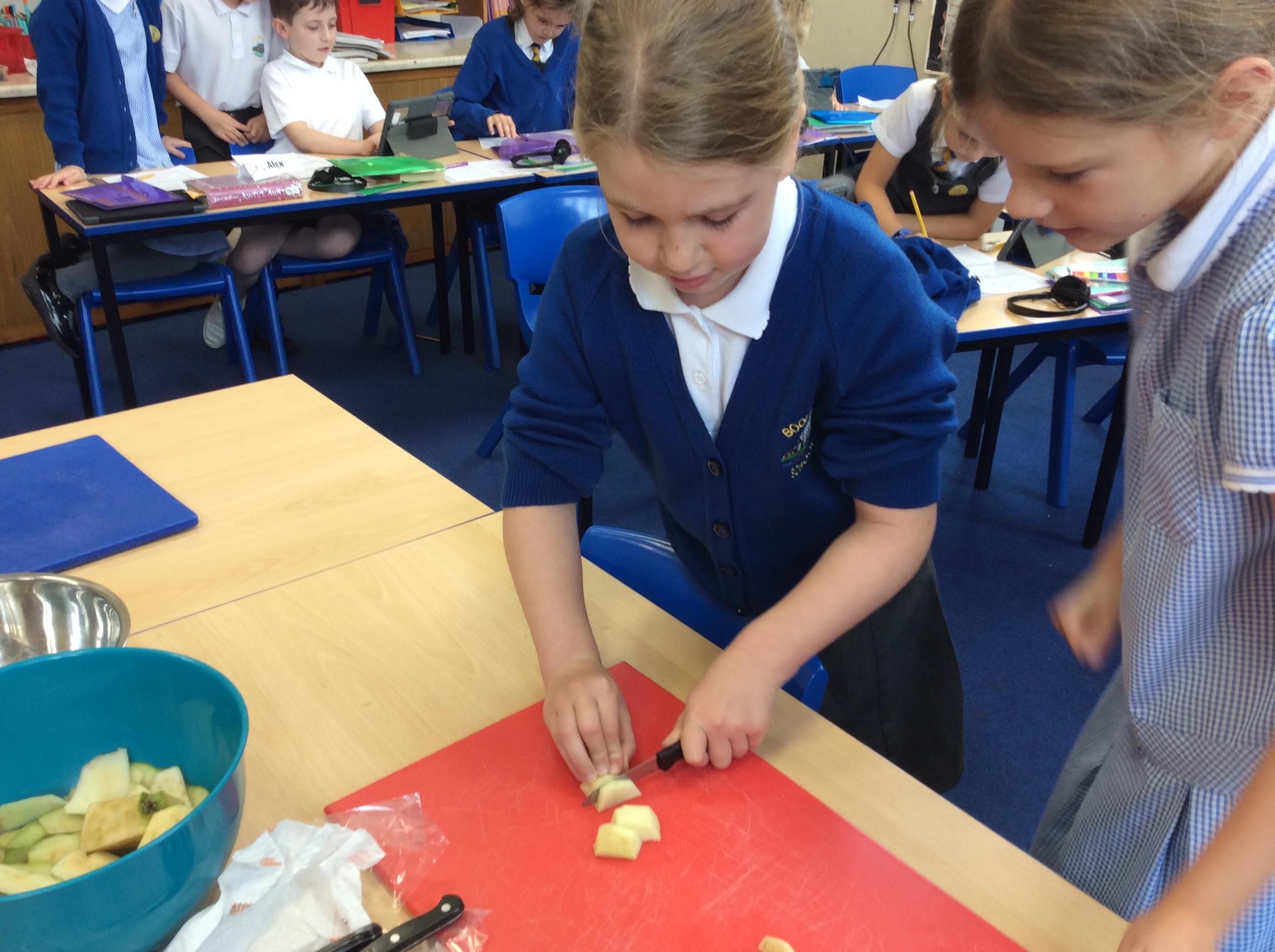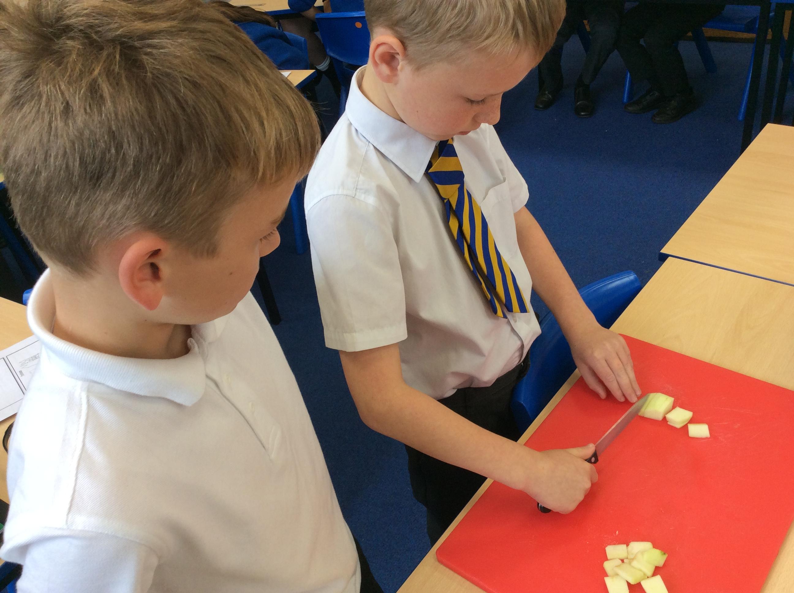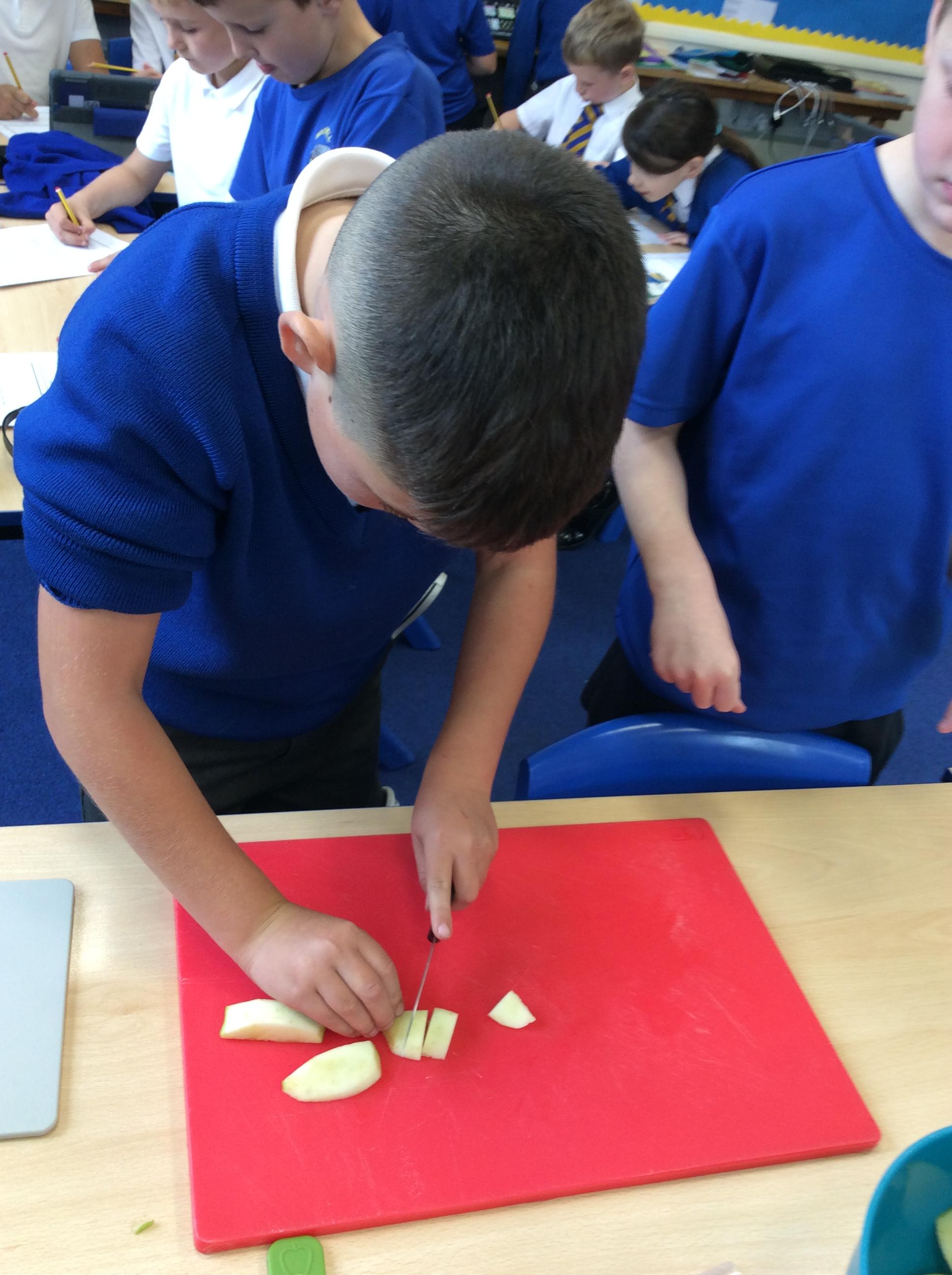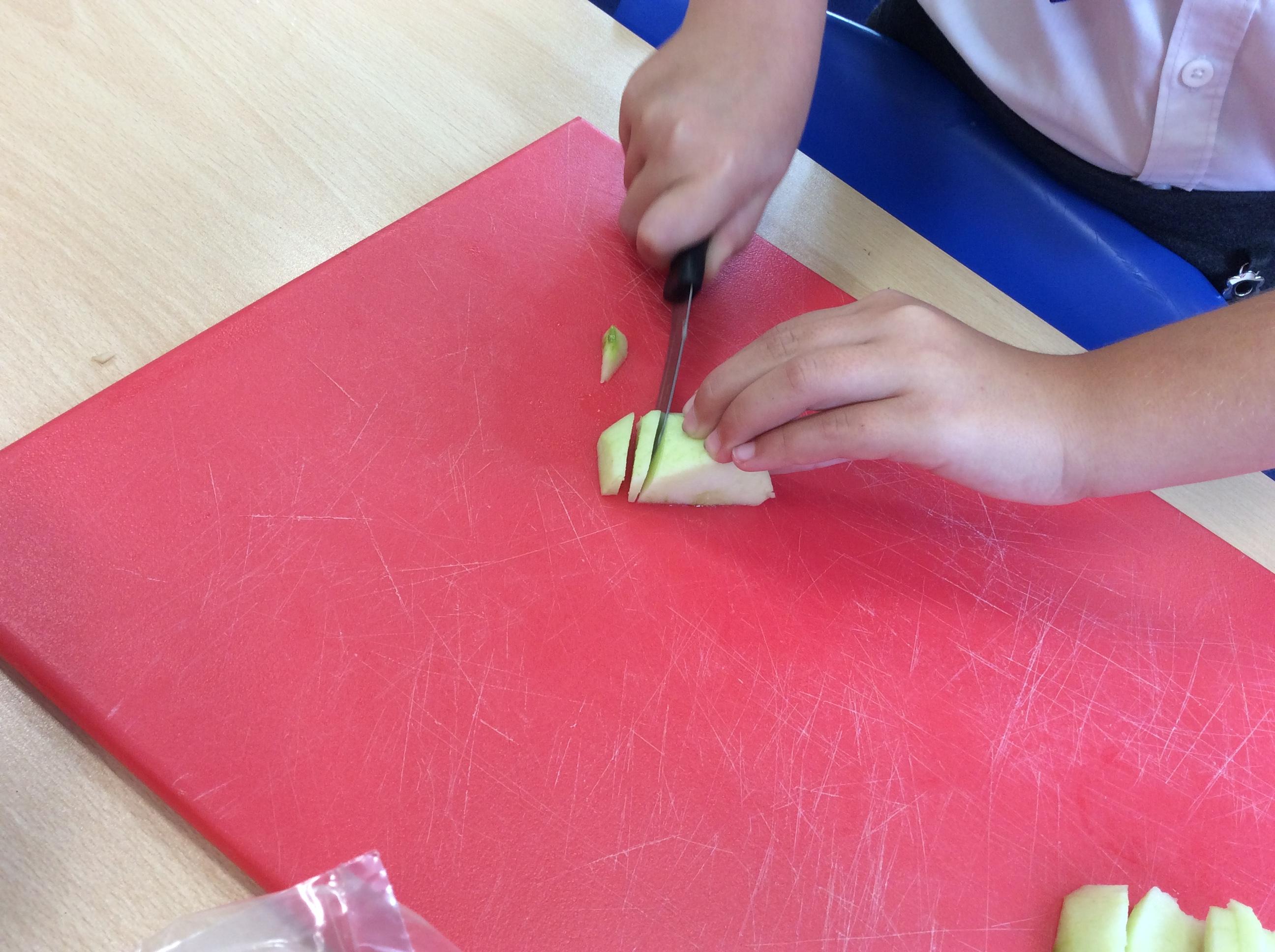 During Jennifer Carver week year 4 evaluated flapjacks before adapting the recipe with extra ingredients. We taste tested and then changed the quantities to make our own flapjacks. We made 3 different types and then evaluated them against our first evaluation. Apple flapjack was the class favourite, we looked at the texture, taste, smell and appearance. All pupils used their chopping and slicing skills.