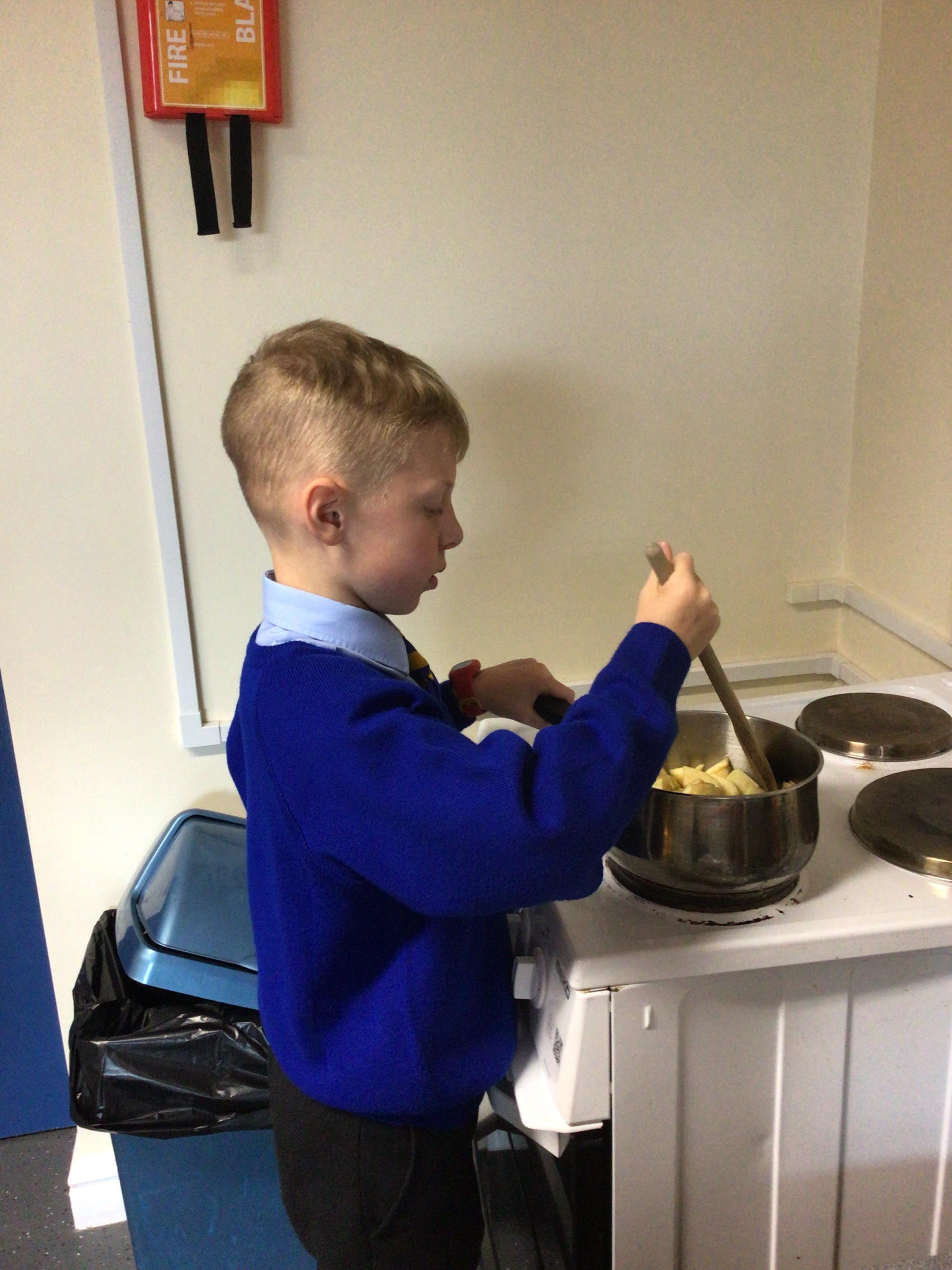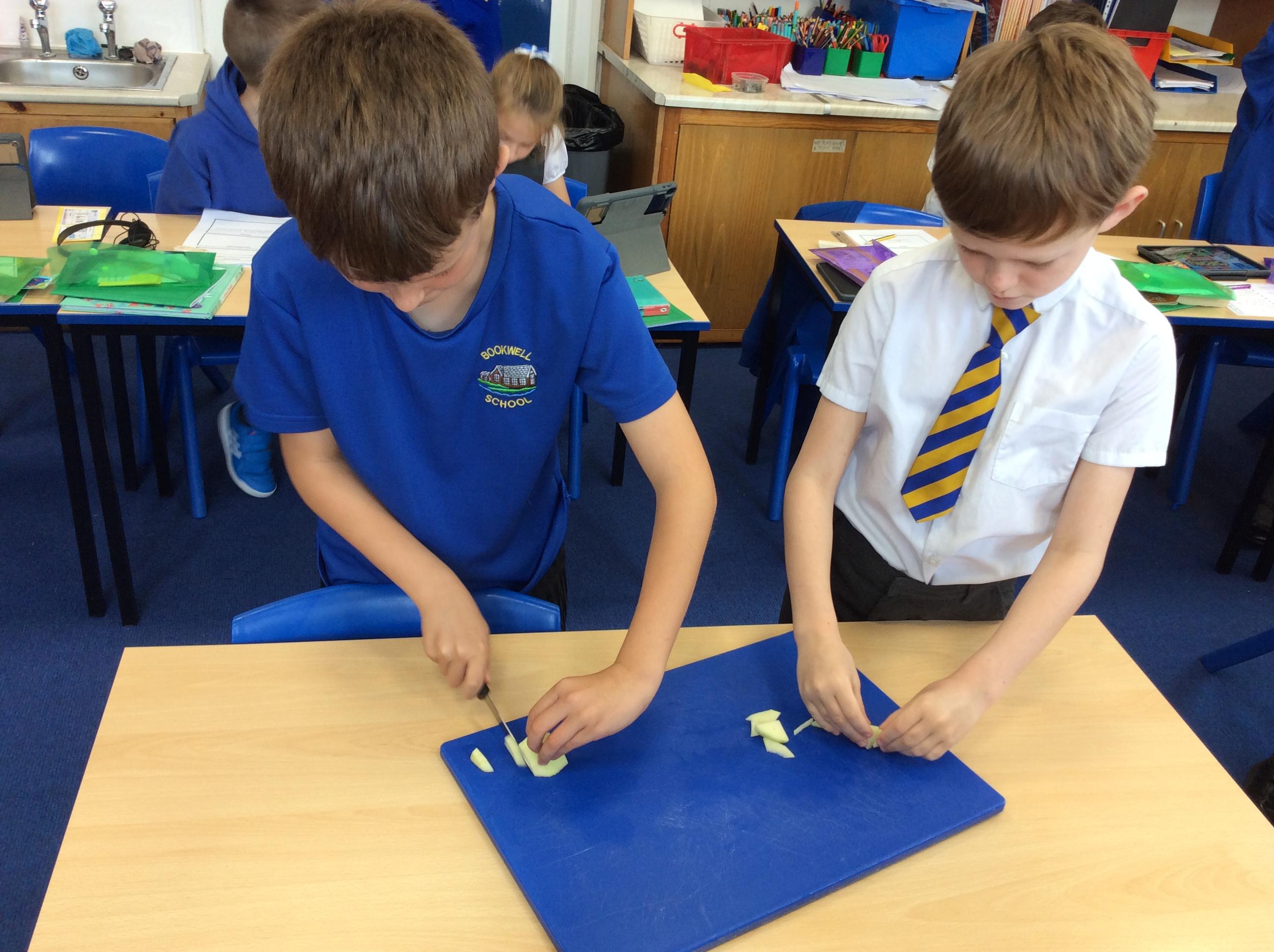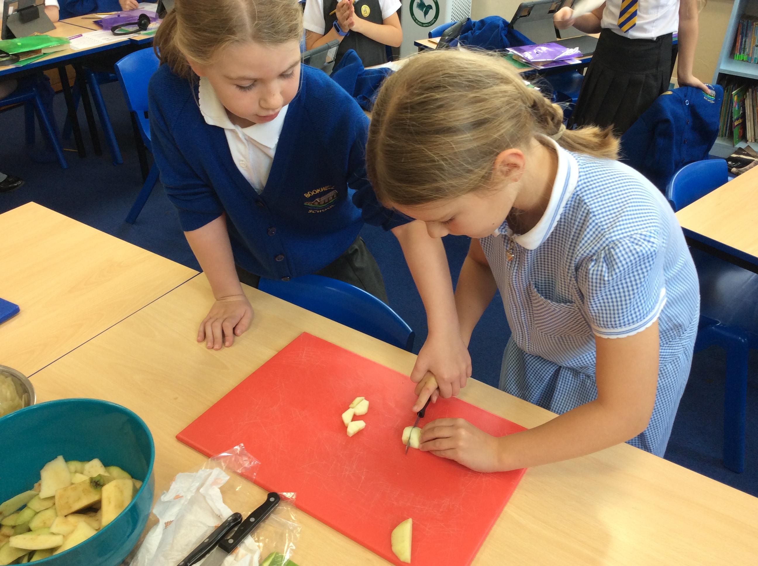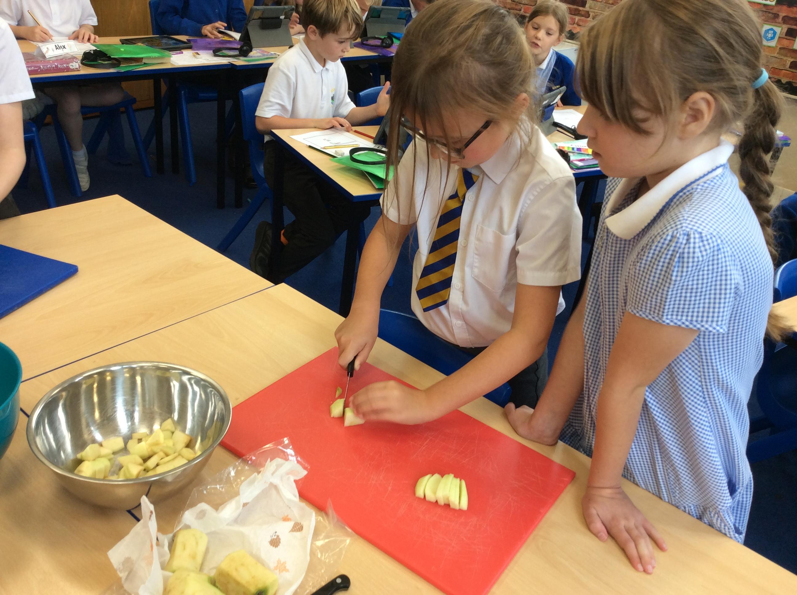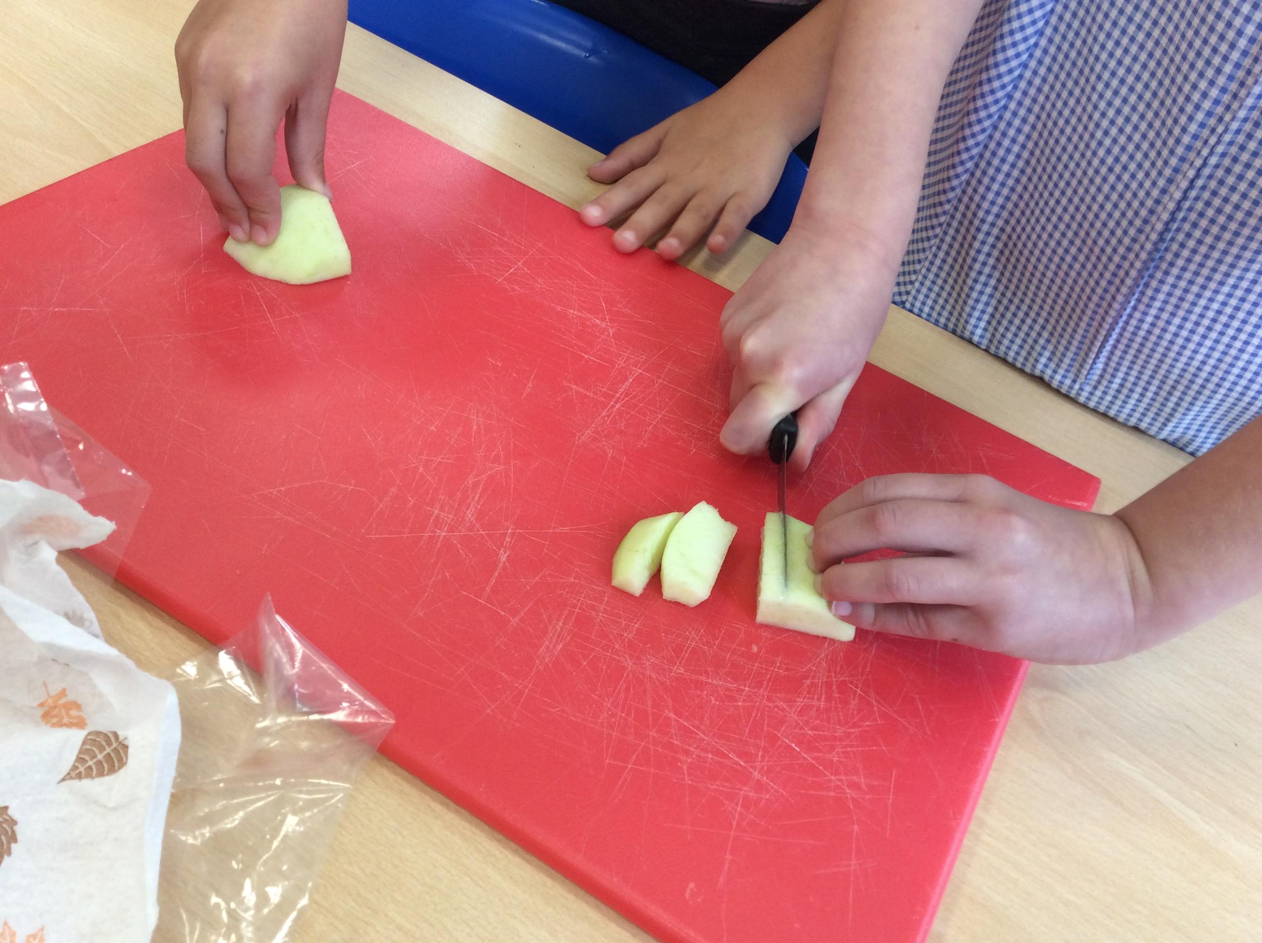 During Jennifer Carver week year 4 evaluated flapjacks before adapting the recipe with extra ingredients. We taste tested and then changed the quantities to make our own flapjacks. We made 3 different types and then evaluated them against our first evaluation. Apple flapjack was the class favourite, we looked at the texture, taste, smell and appearance. All pupils used their chopping and slicing skills.