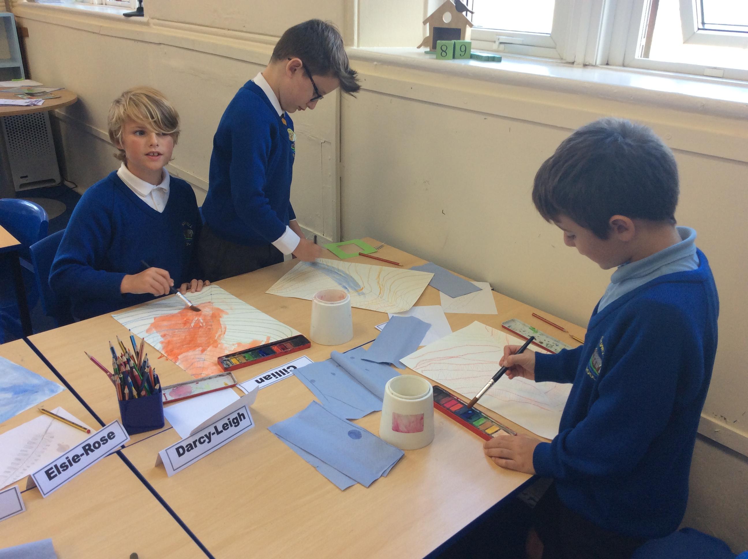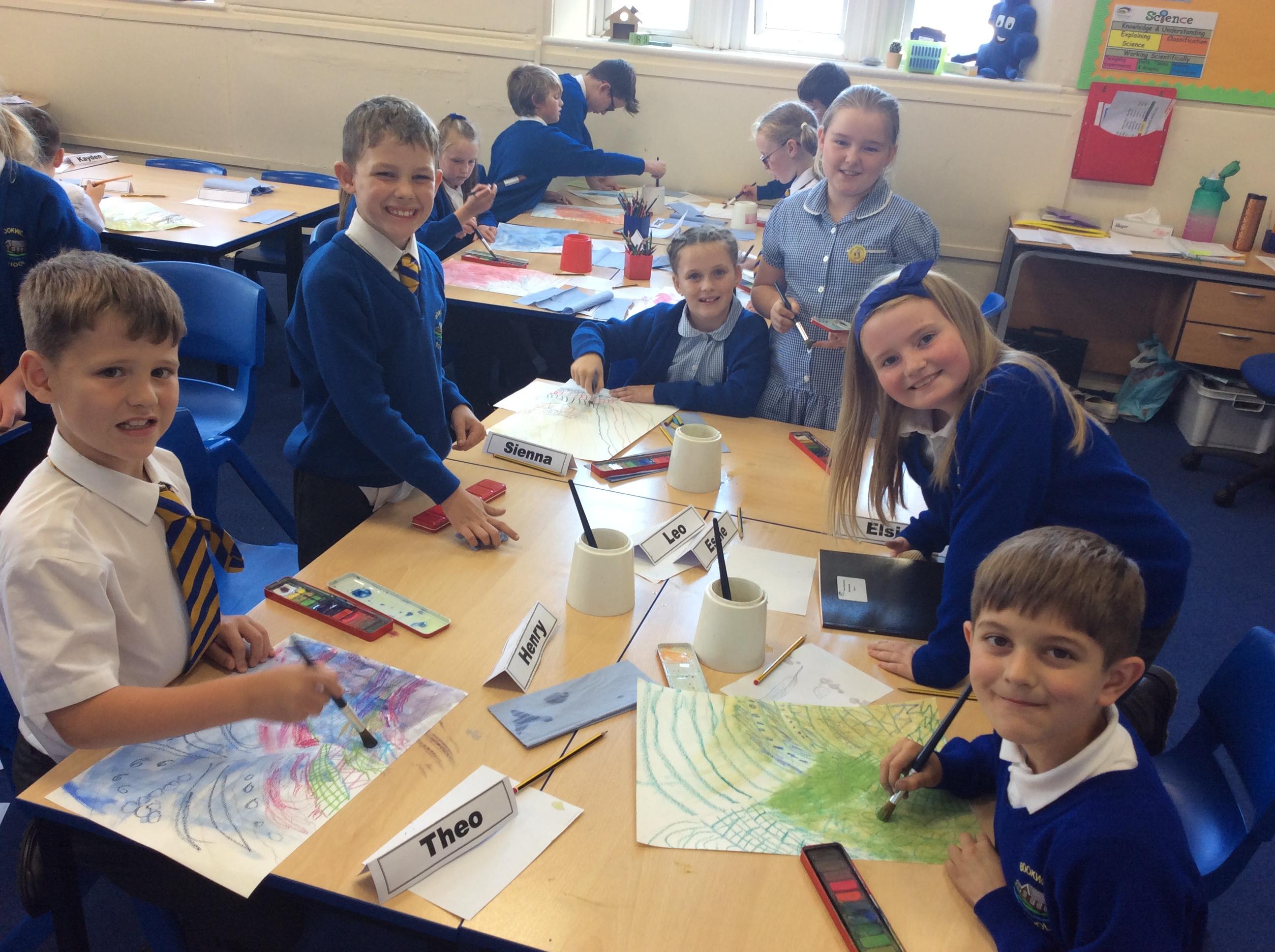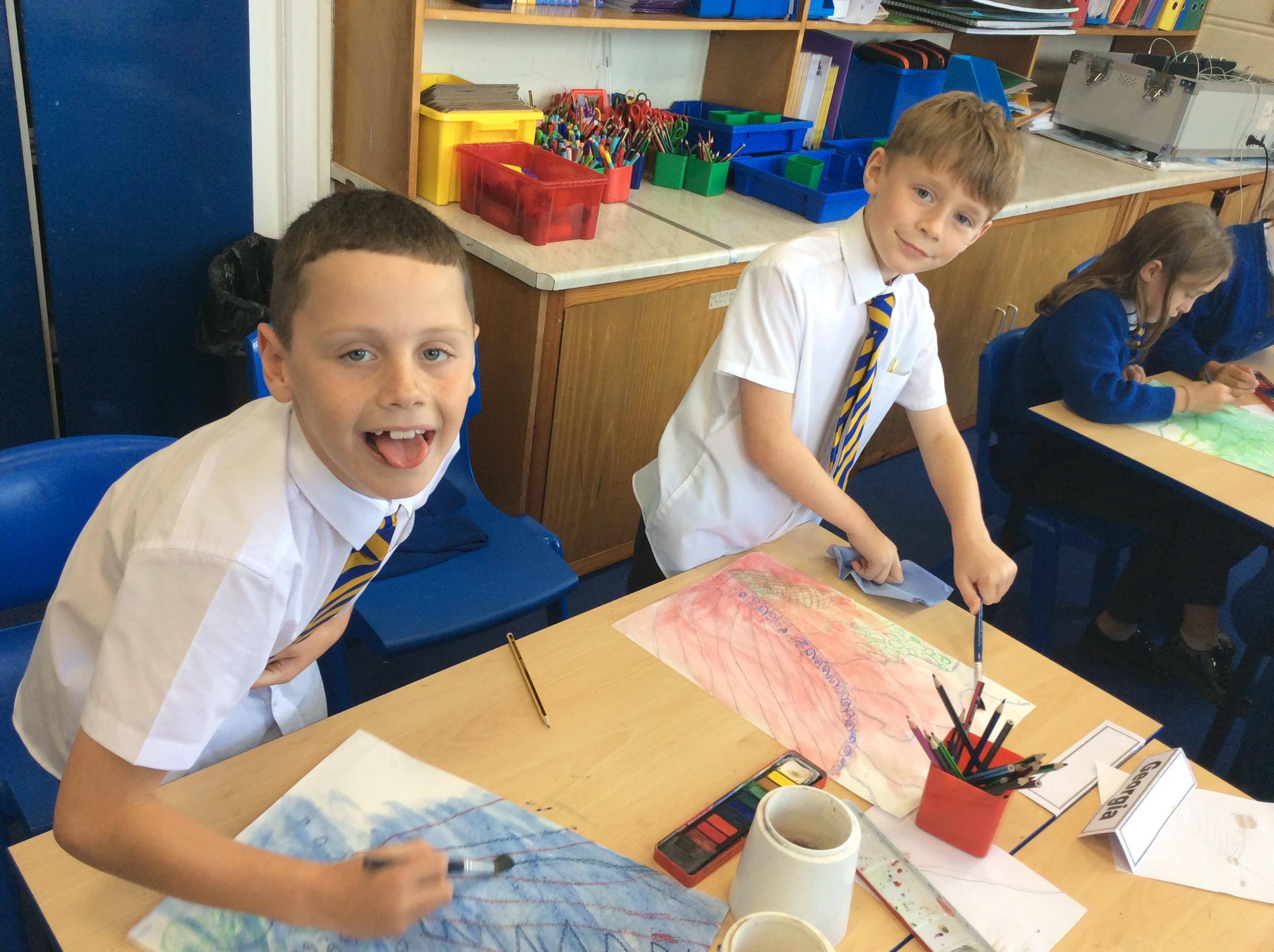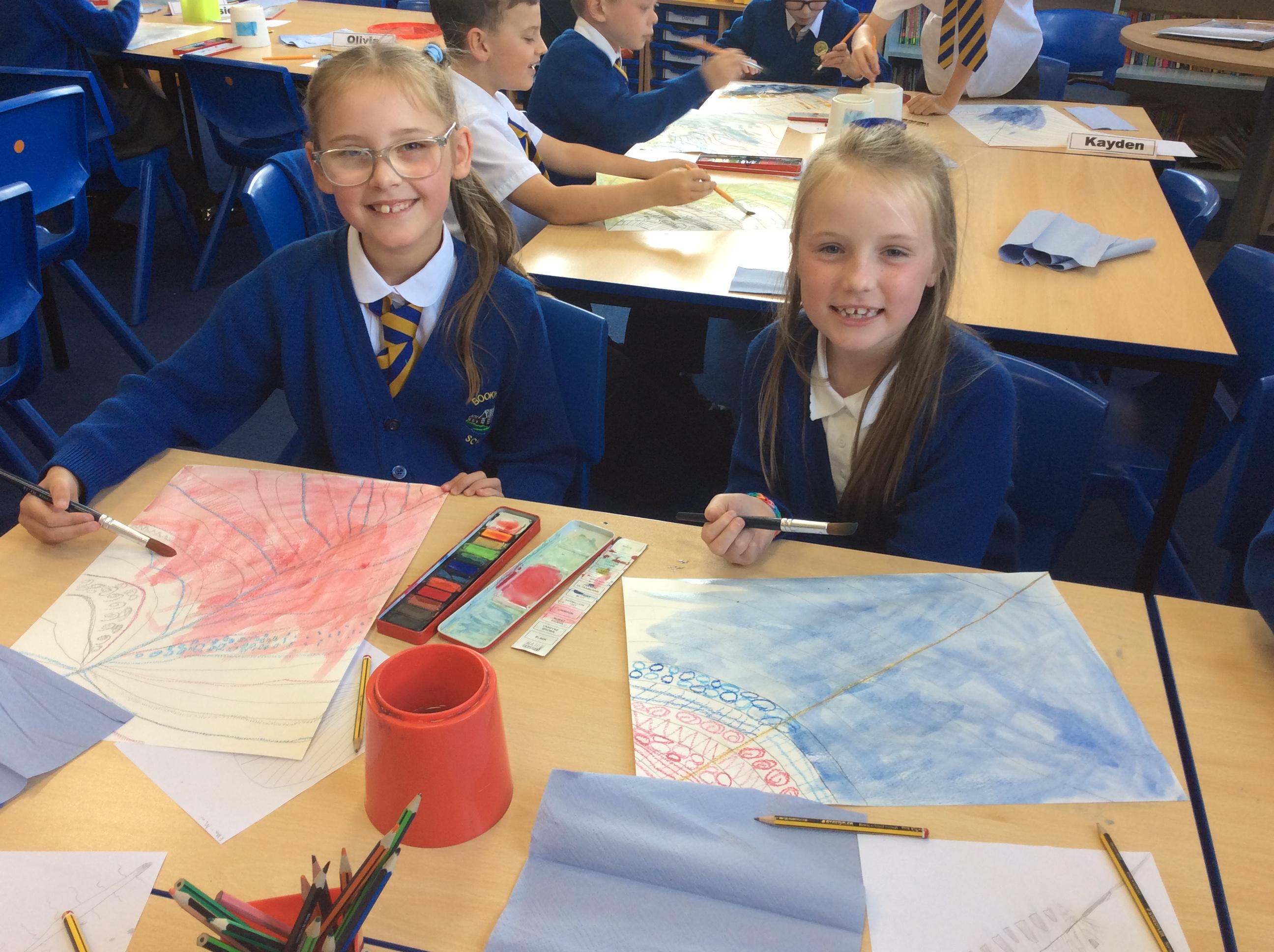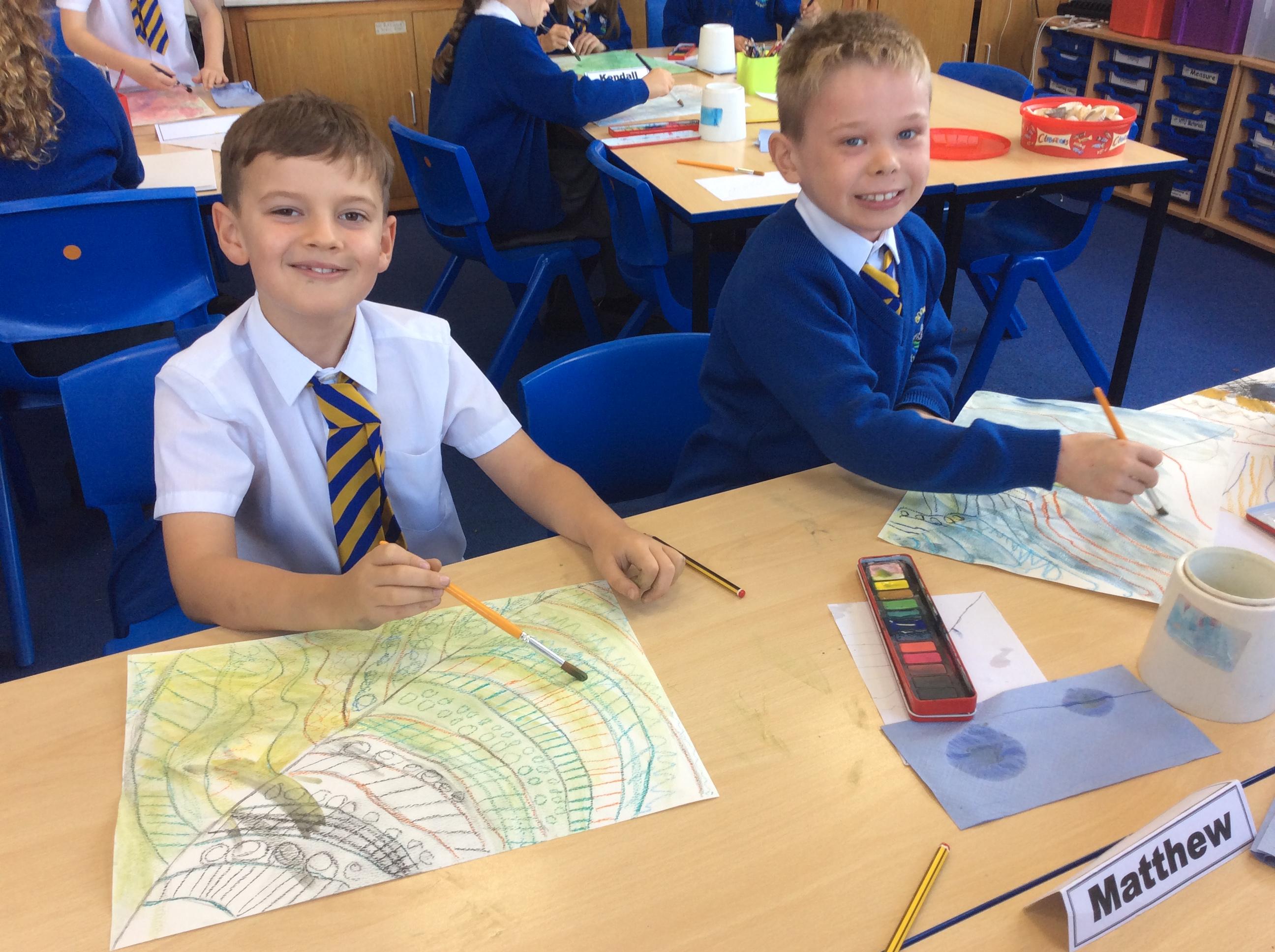 Year 4 have been very creative by using a range of mark making techniques to create large scale paintings based on their own drawings of feathers and shells.