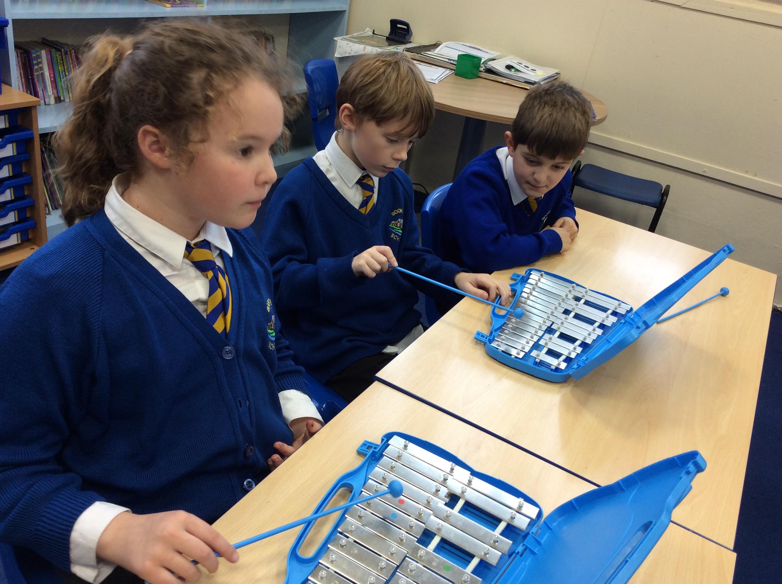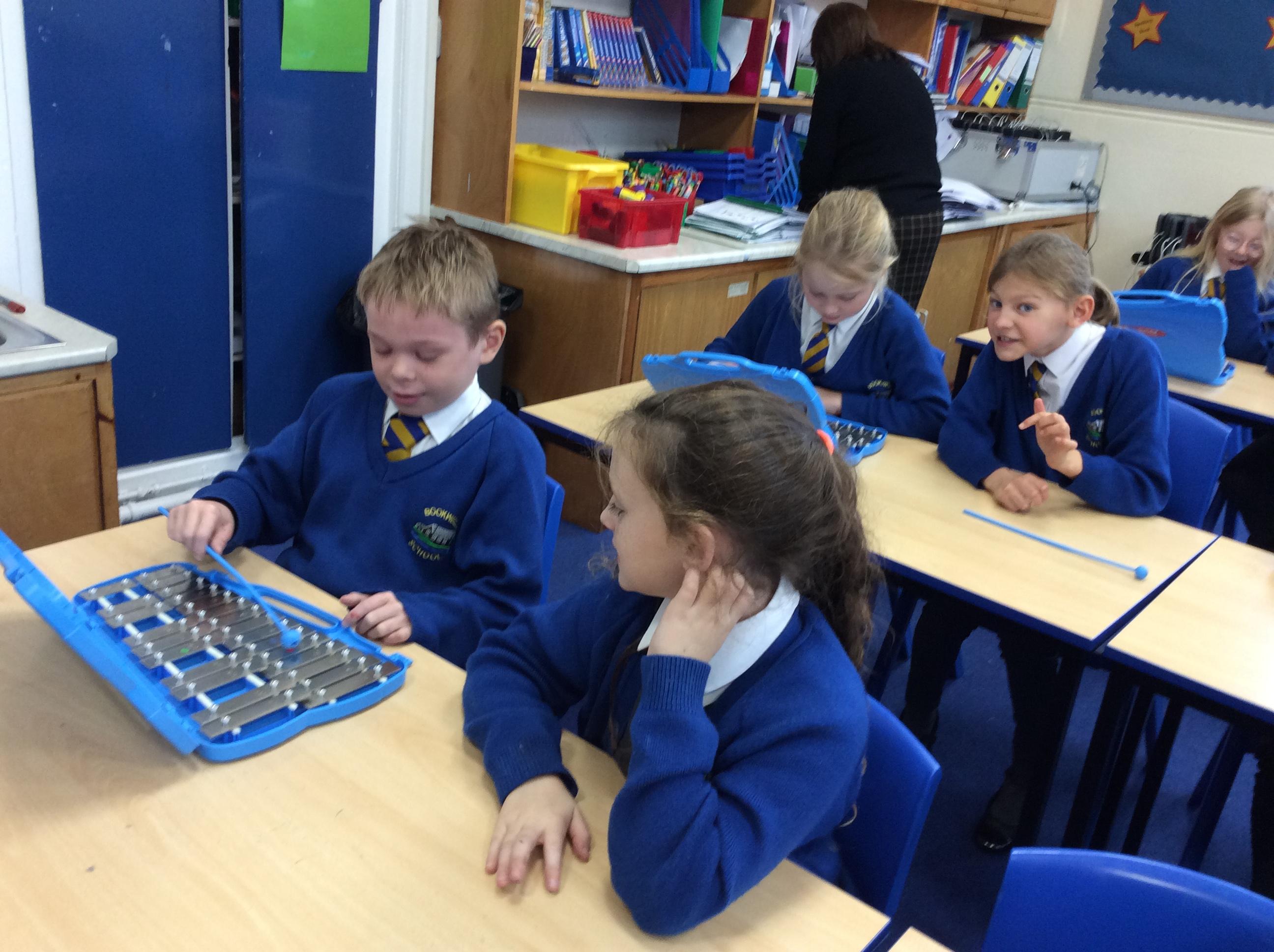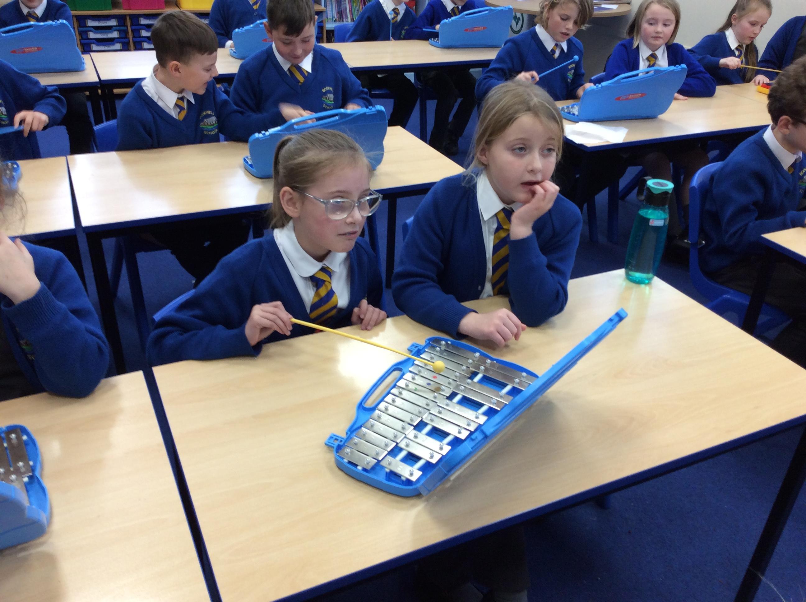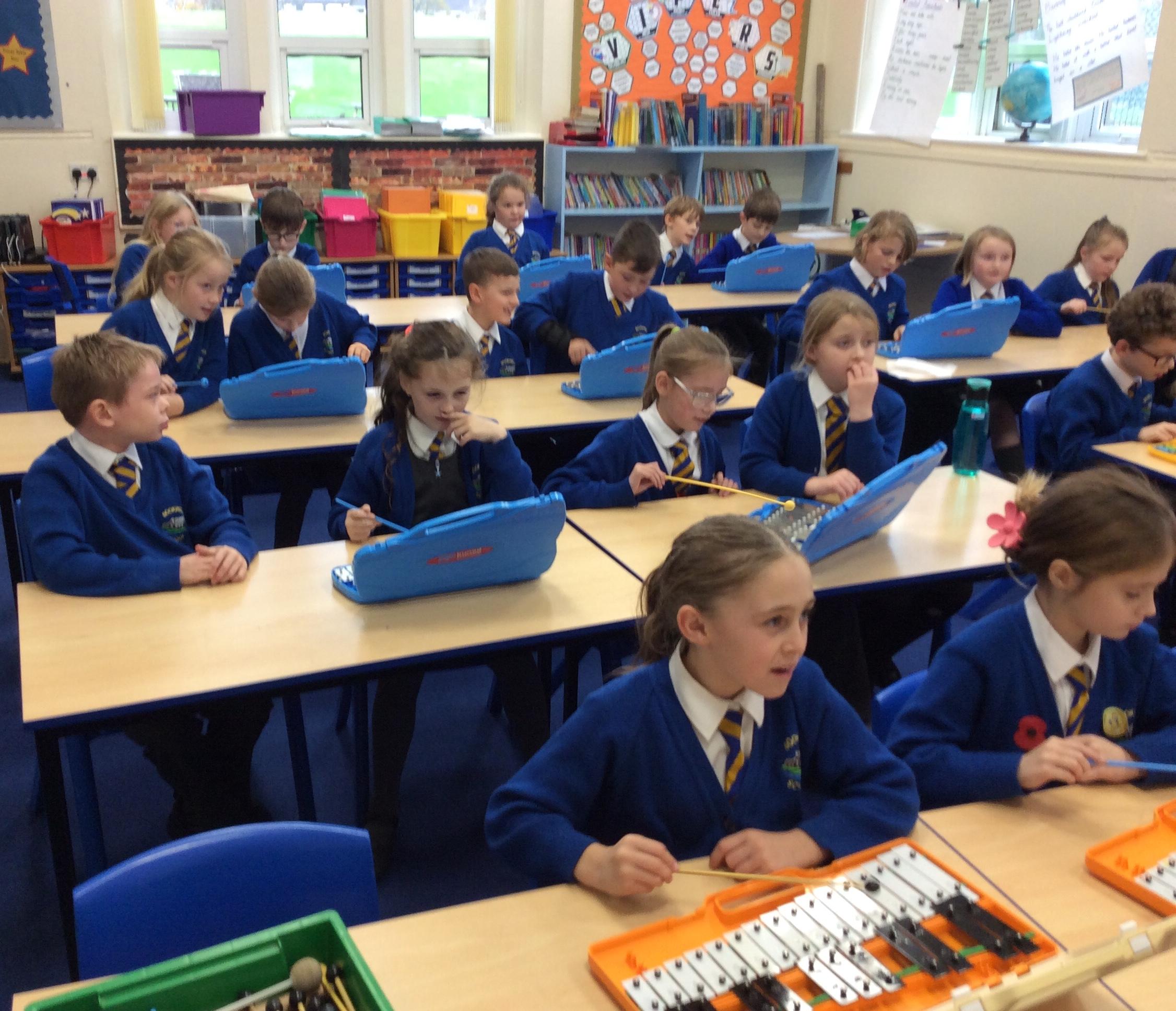 In Music year 4 have been helping their learning partner follow the music when playing the glockenspiel.
