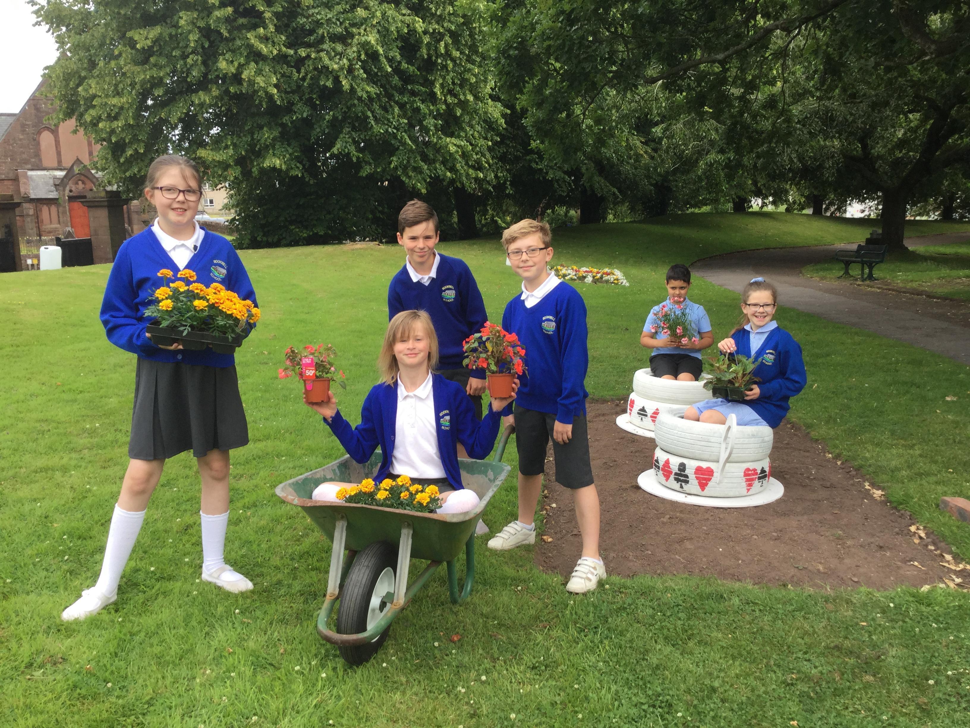 As part of year 5 homework we were asked to design a flower bed for Egremont castle to the theme ‘Alice in Wonderland’. Mrs Robinson and Miss Doran took the best parts of our designs to create a final plan. Today year 5 gardeners went and planted the flower bed ready for judging. Doesn’t it look amazing?
