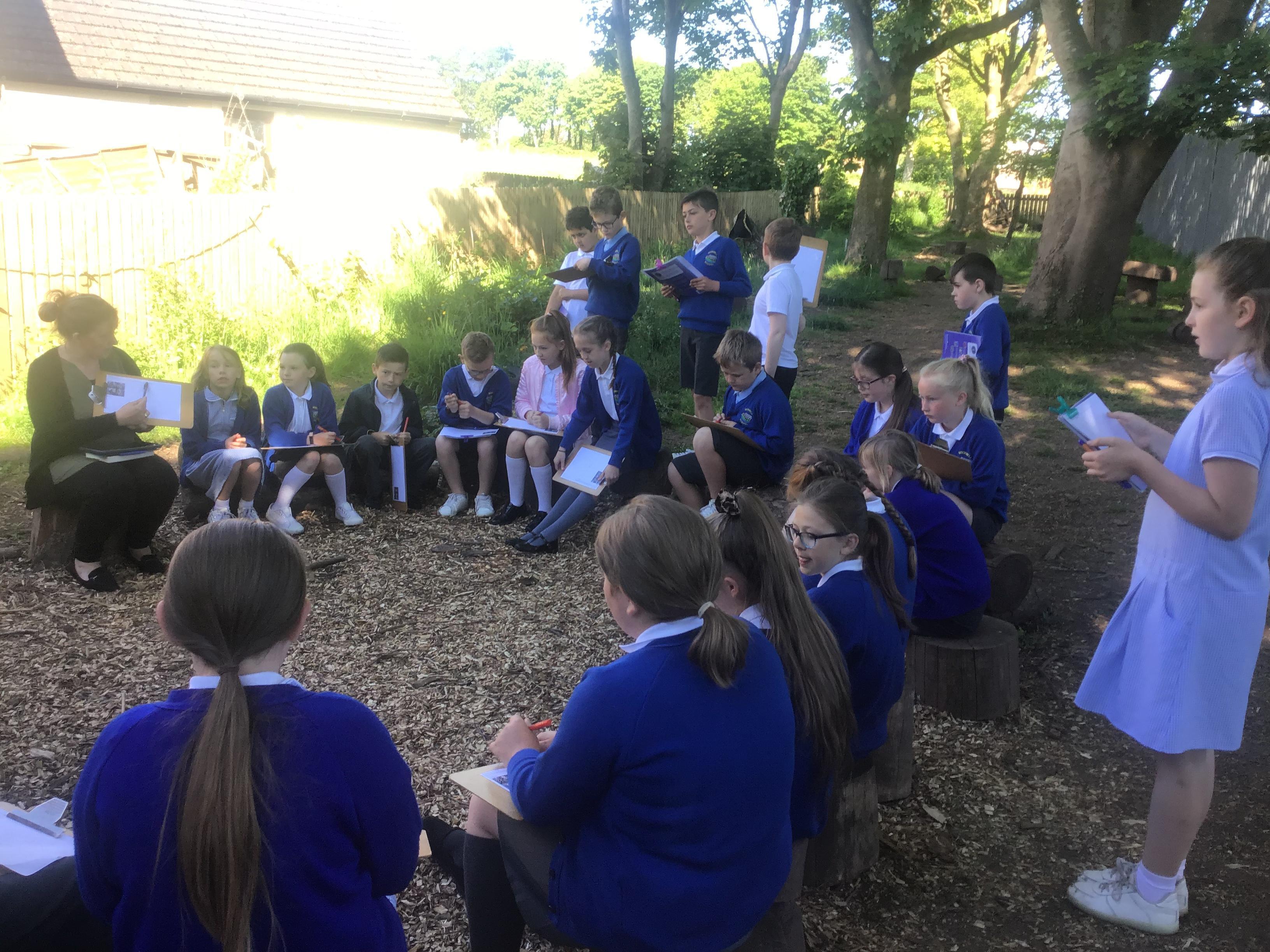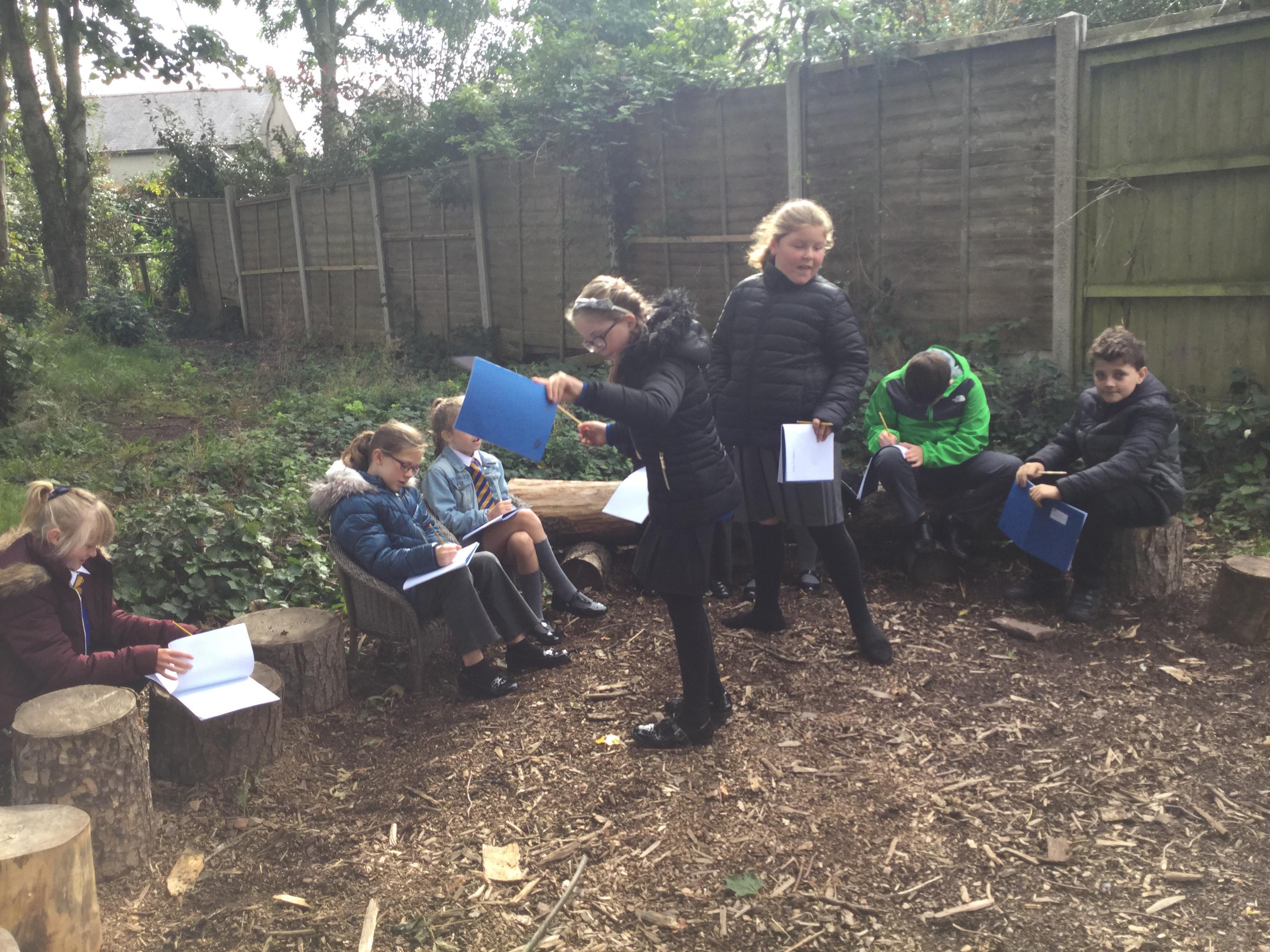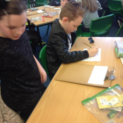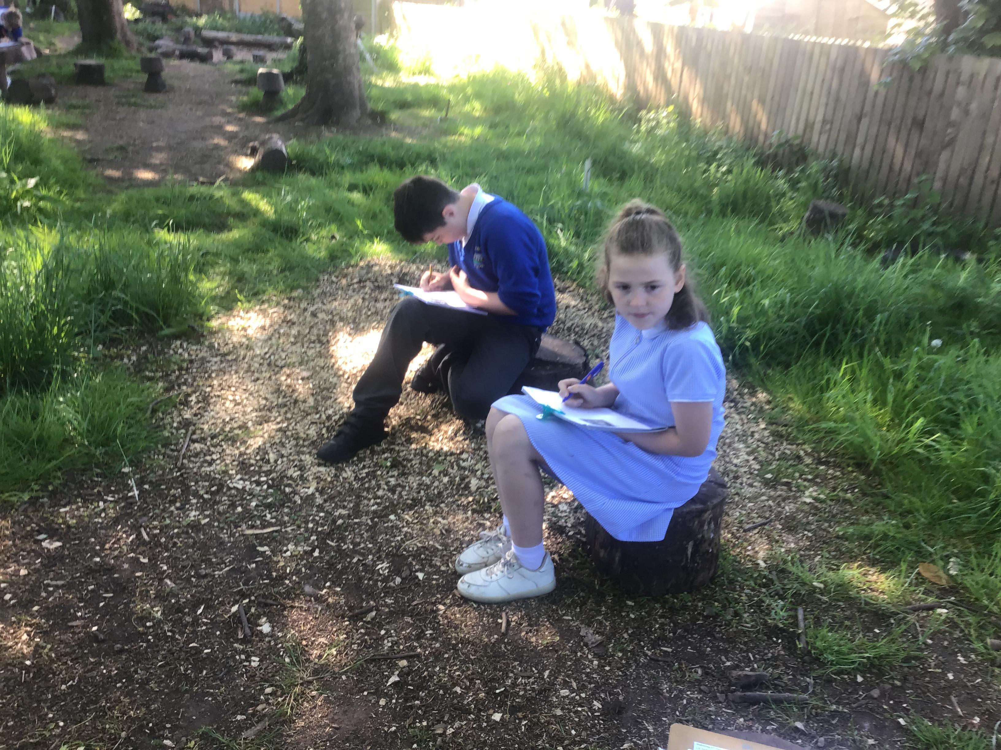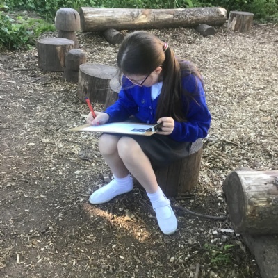 In English we are creating a woodland setting for our animal stories. To inspire our writing we have been exploring the woodland looking at the different things we can describe.