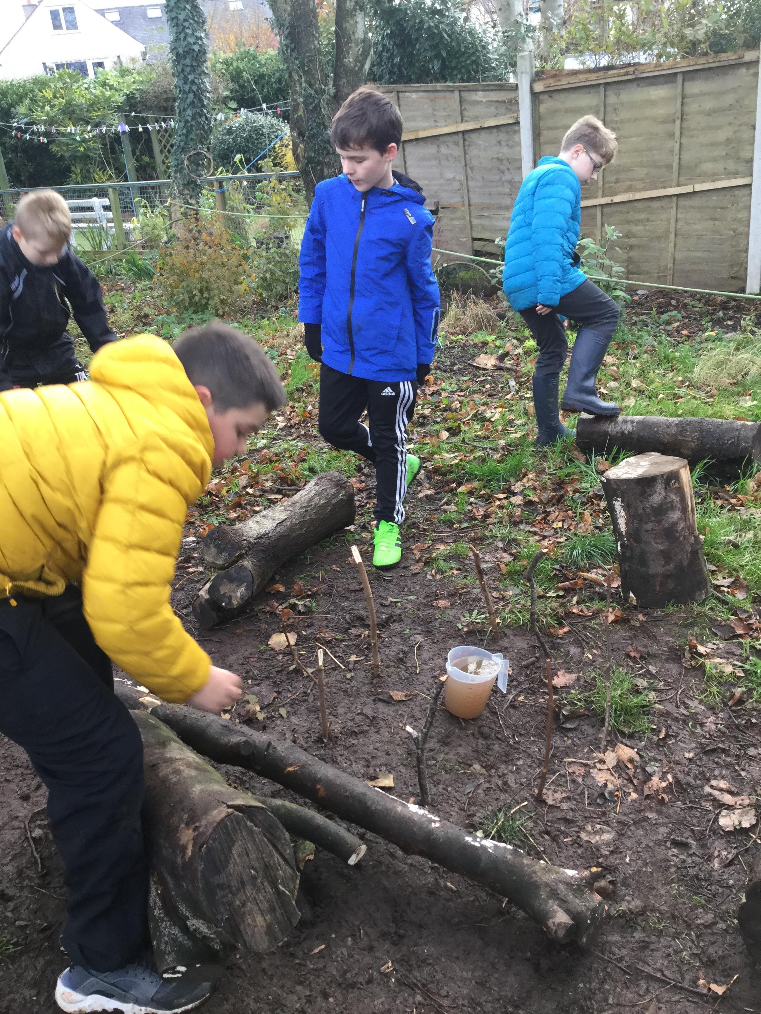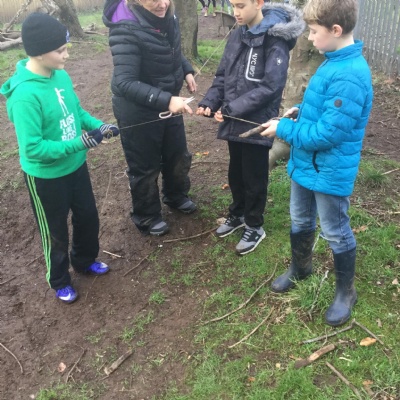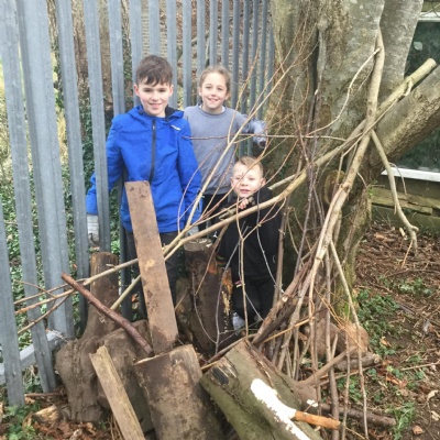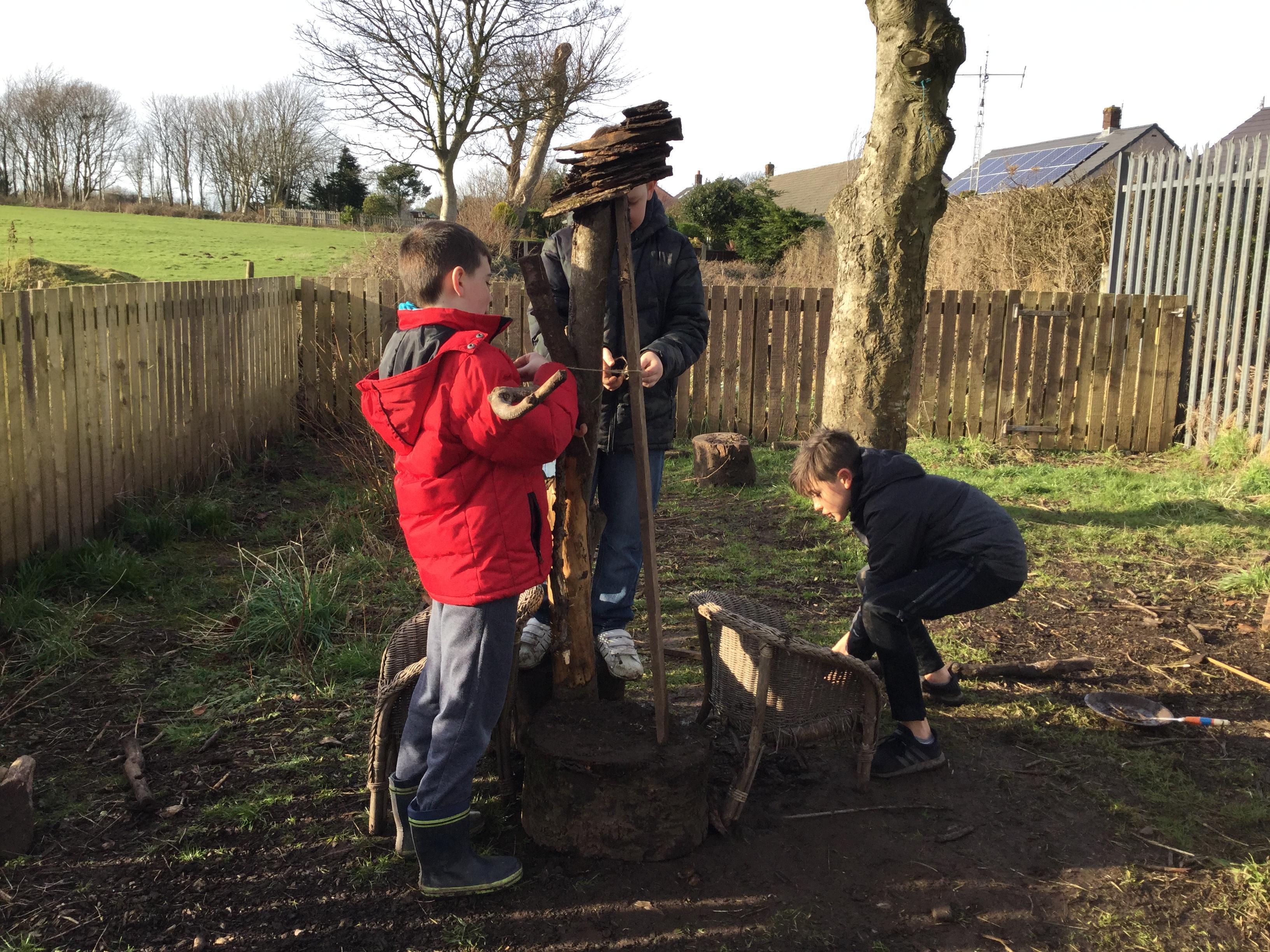 Our first afternoon in the woodland involved us thinking about what forces we could make and use. Then we explored shelter building, thinking about what makes a good shelter. Some of shelters had sofas and one even had a lift.