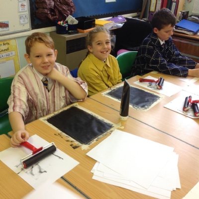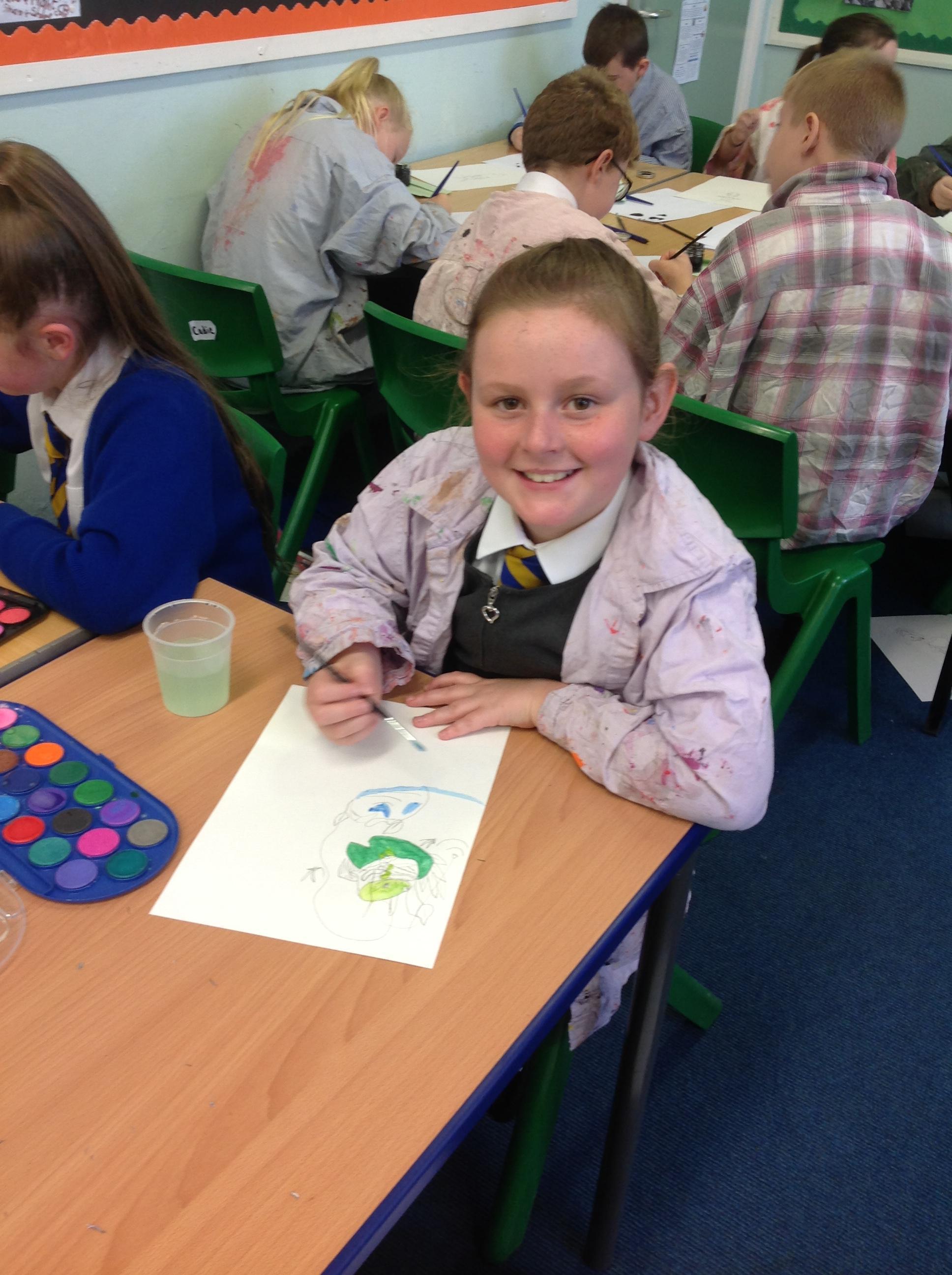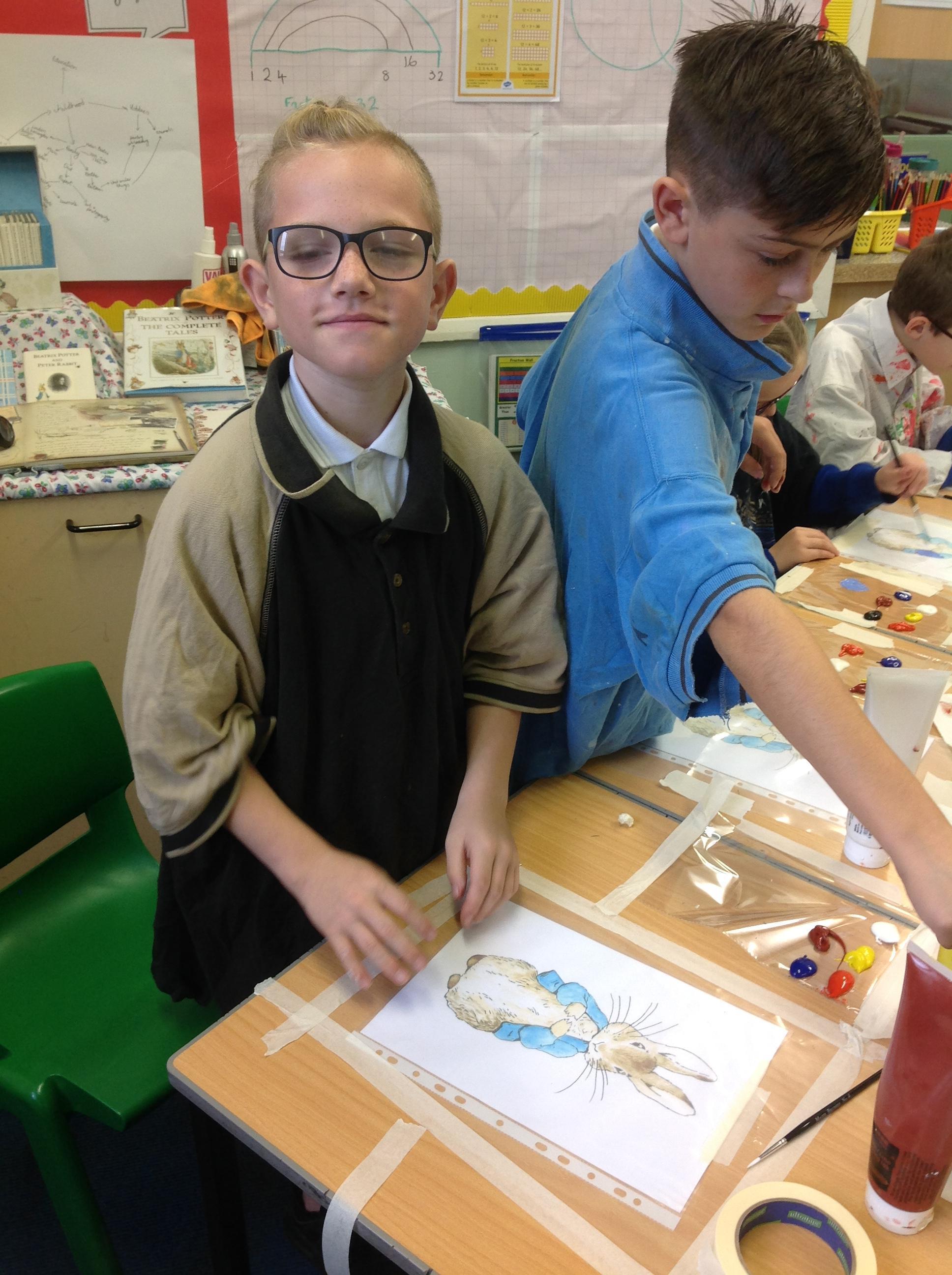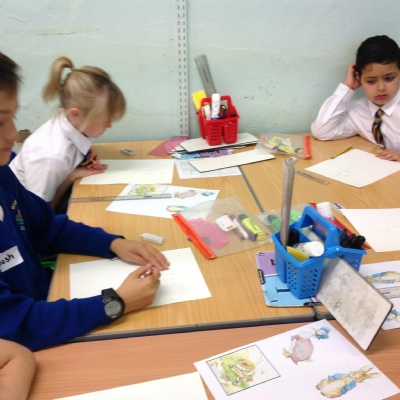 On Thursday 4th October we were very excited to welcome a 'real' artist into our class. Jenny, an illustrator, started our day telling us about her artwork and her job as an illustrator. Many of her images are often drawn separately then she scans them into the computer and uses photoshop to combine them. To help her create her images she often uses photo's and even makes models of scenes she would like to make. The rest of the day she taught us how to create pencil sketches of Beatrix Potter's characters before we got the opportunity to use water colours and ink just like the famous artist did. We also learnt two different printing techniques.