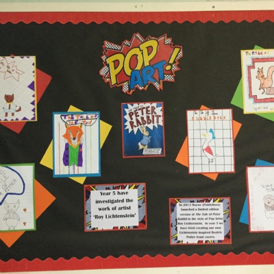 In Key Stage 2 we have been creating pop art inspired work. We discovered an artist, Roy Lichtenstein, whose work inspired a special edition of Peter Rabbit so we have had a go at creating ur own book covers using a Pop Art style. Some of us included his unique style of ben-day dots and comic book style fonts and features.