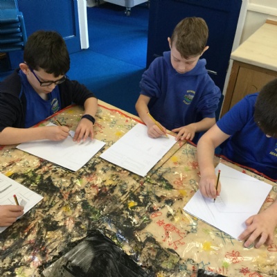 The children started this topic by interpreting forms from direct observation and then drawing images of a house. Afterwards they used a viewfinder to focus on a small part of their drawing, which they would then turn into a monoprint.