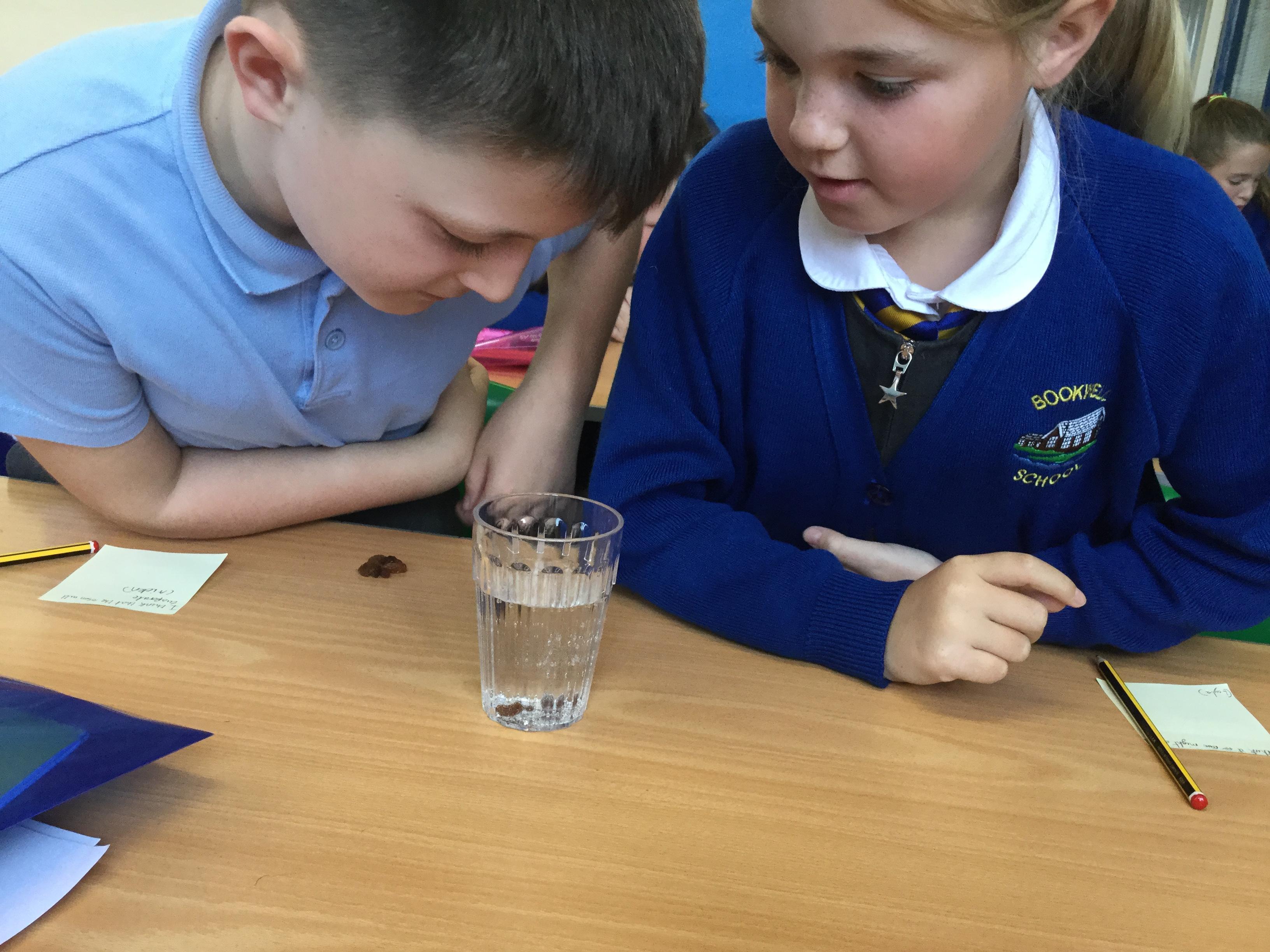 Today the children were making predictions about what would happen when they dropped raisins into some lemonade. They observed what happened and then had to try and explain the reason for it. They were amazed when the raisin rose, started floating and then sank repeatedly.