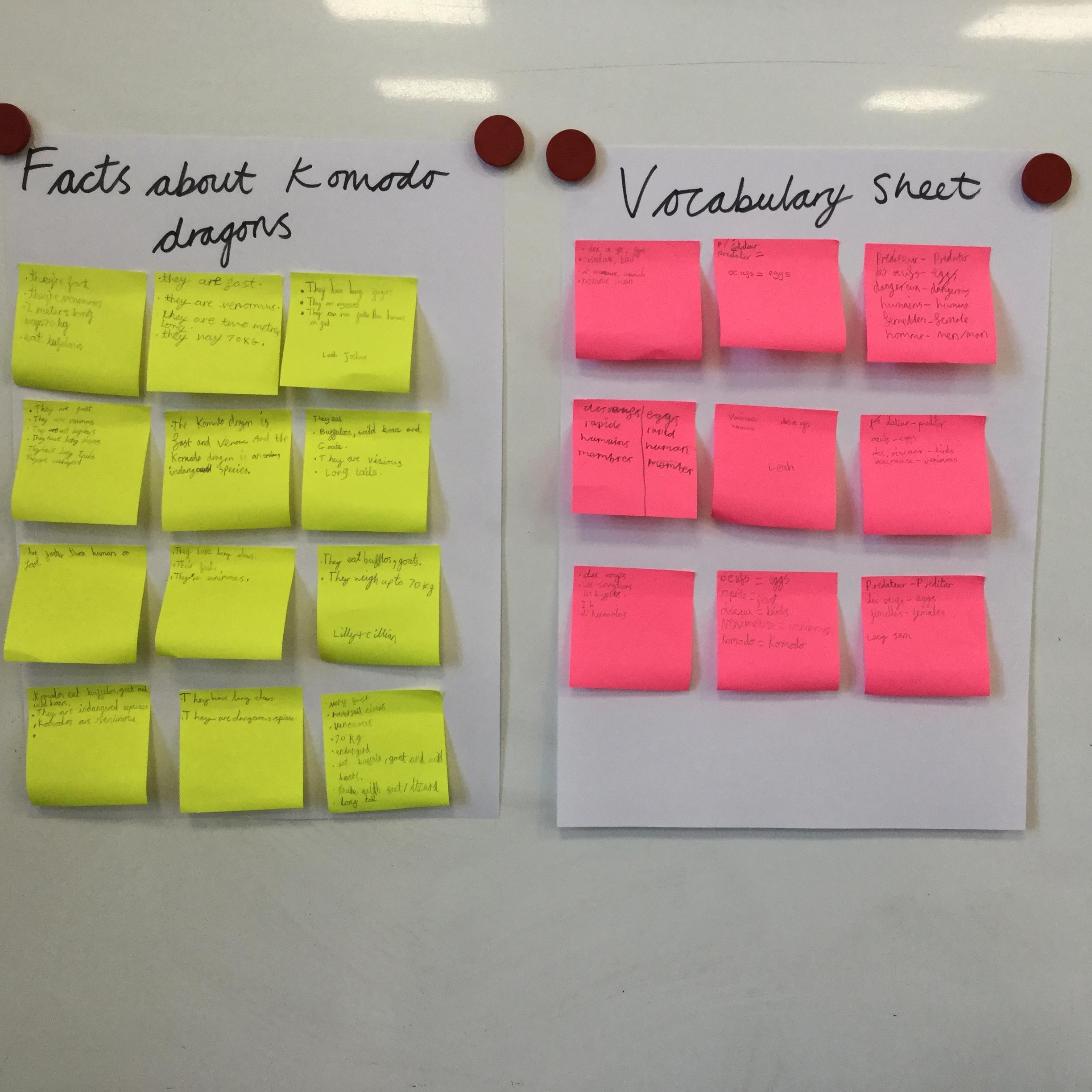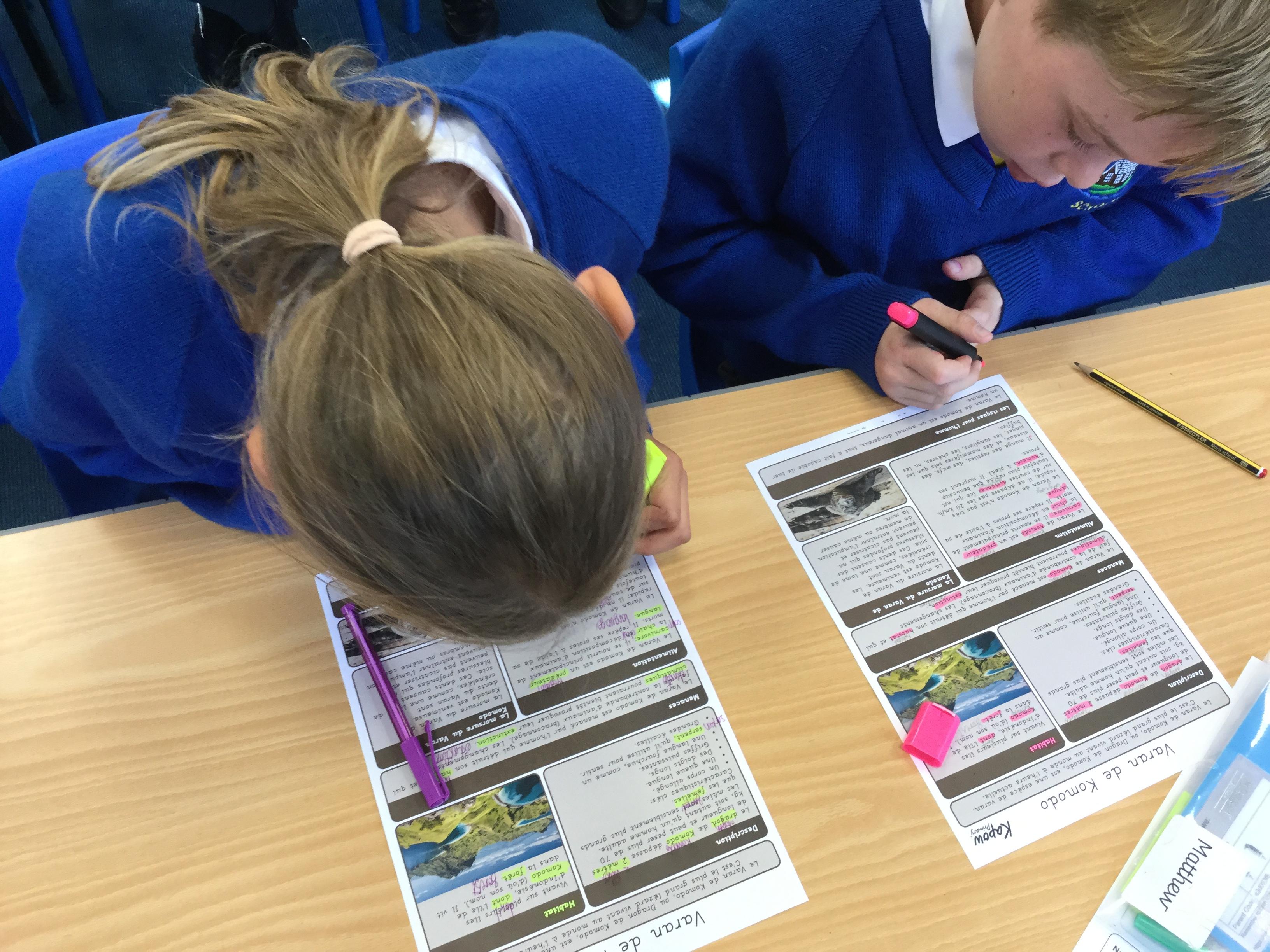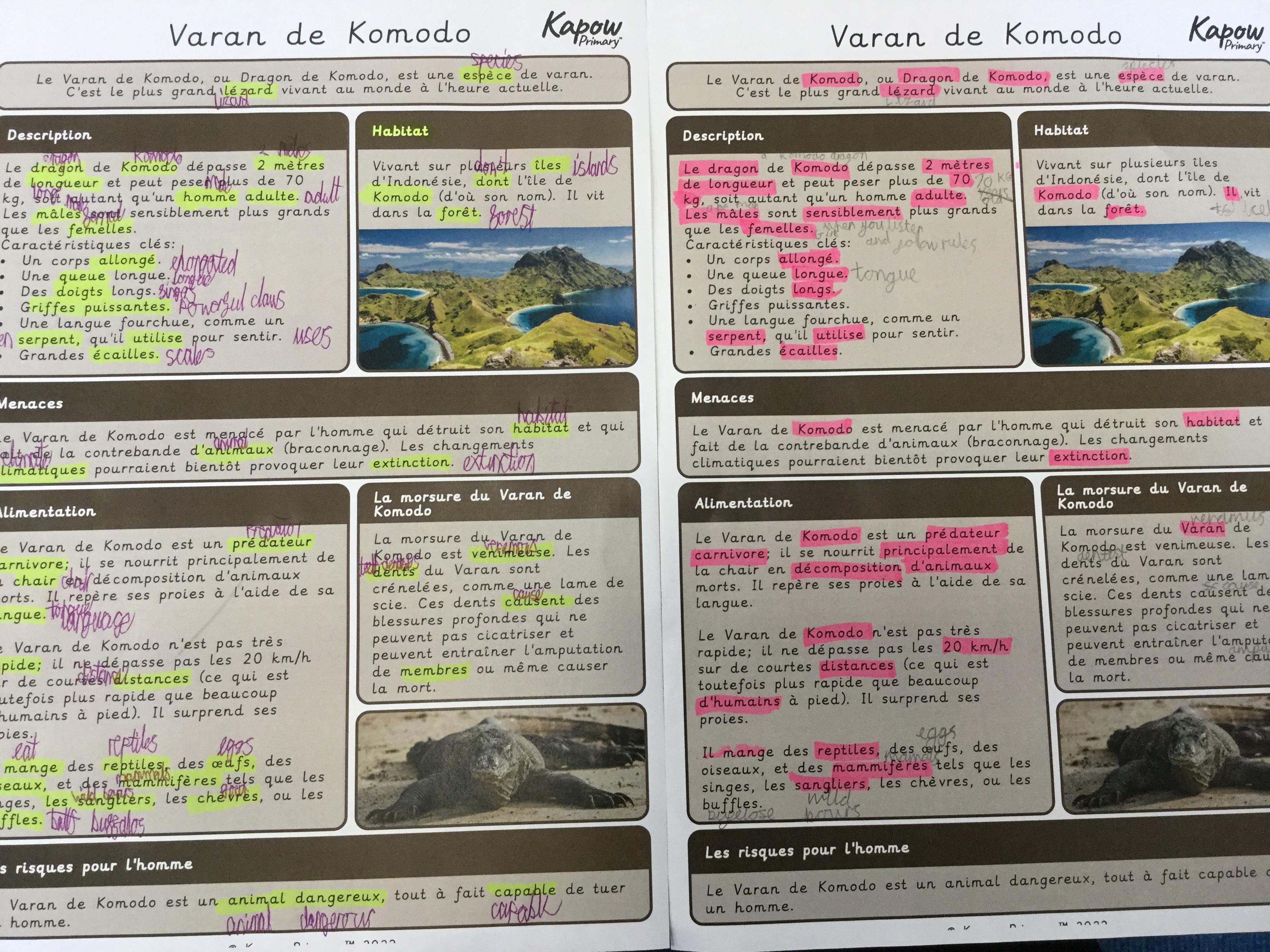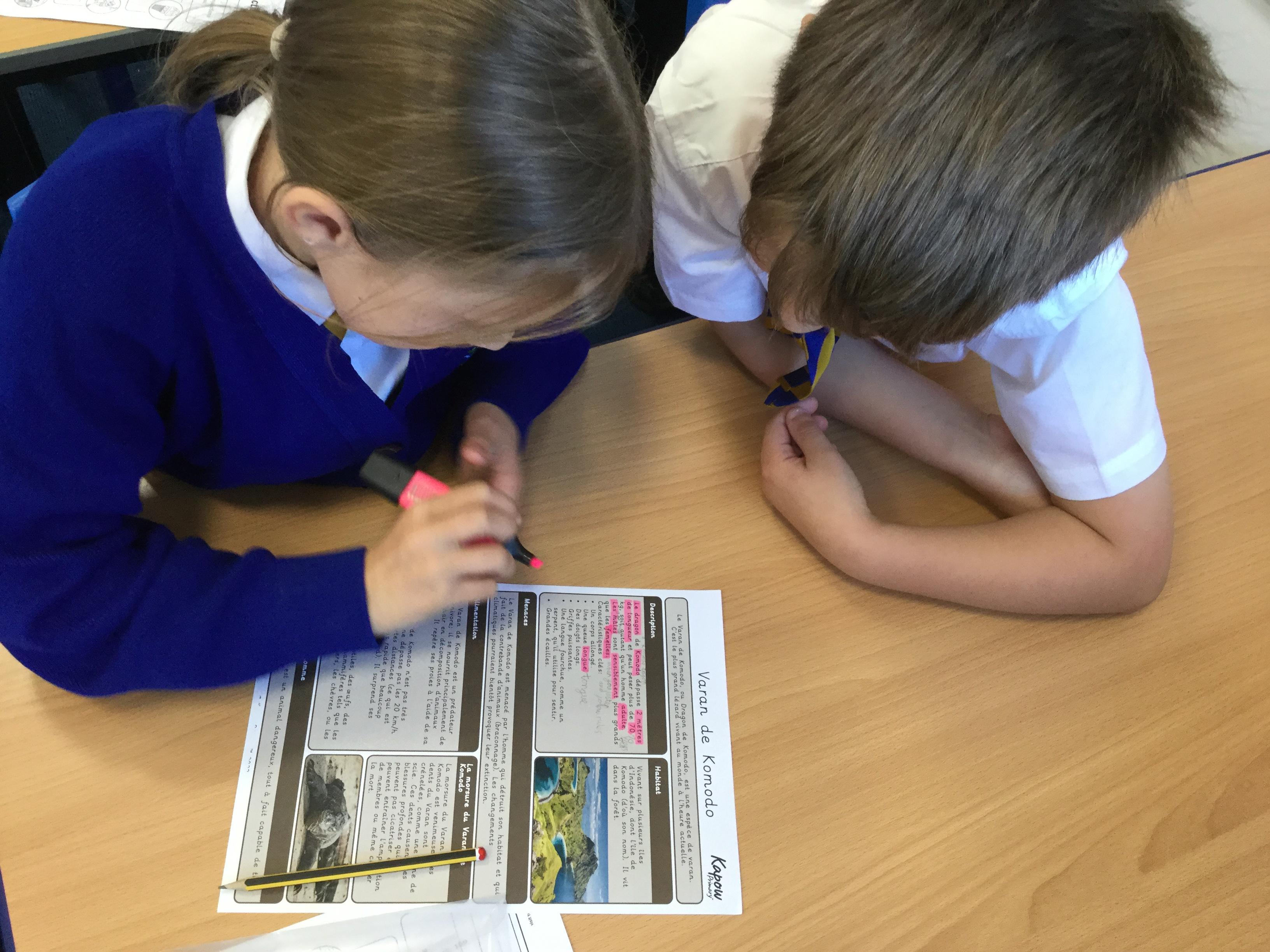 The children have been decoding a French text about the Komodo dragon by finding words that are similar to English words. They then had to write down some facts that they could learn from reading the text.