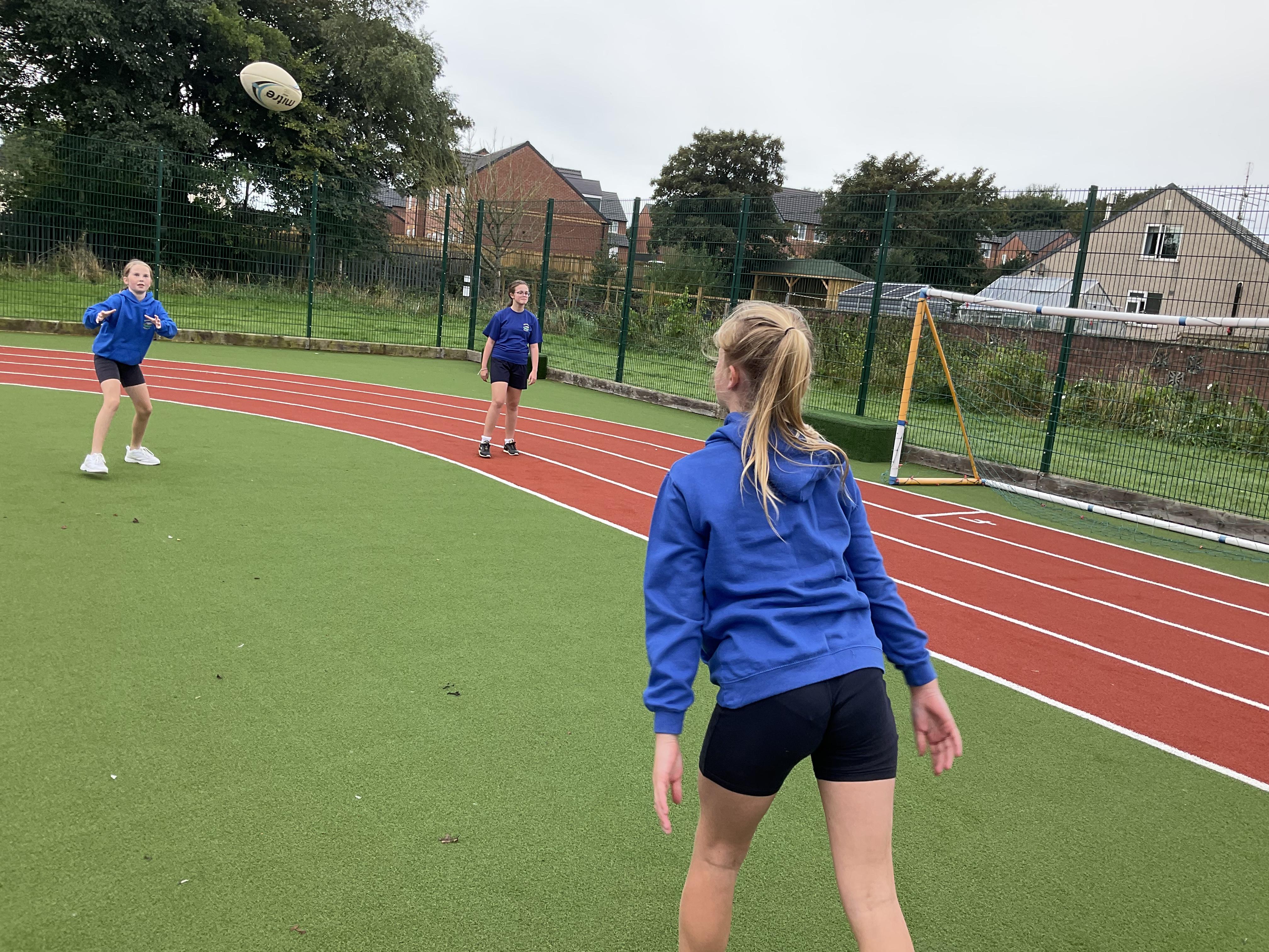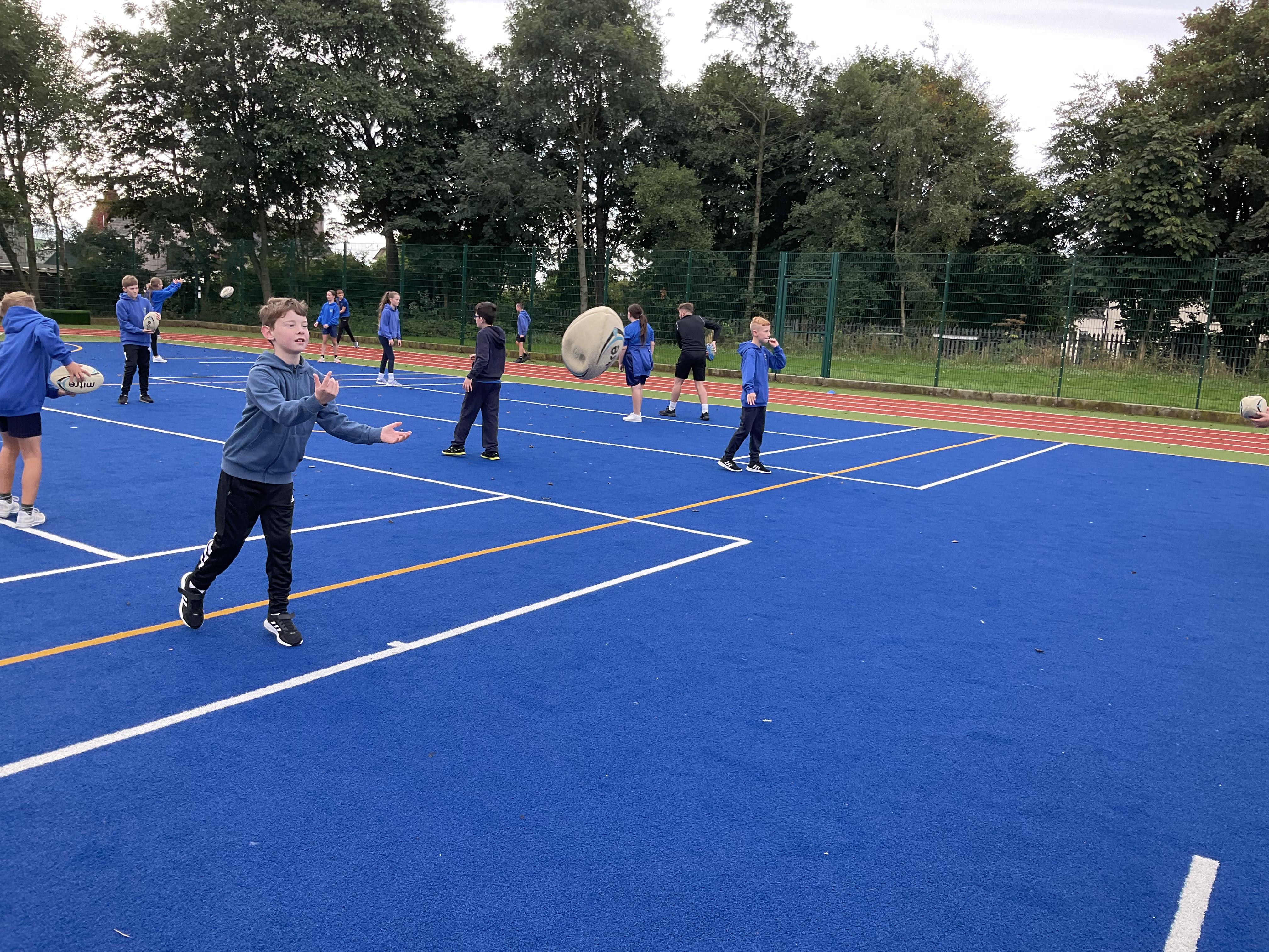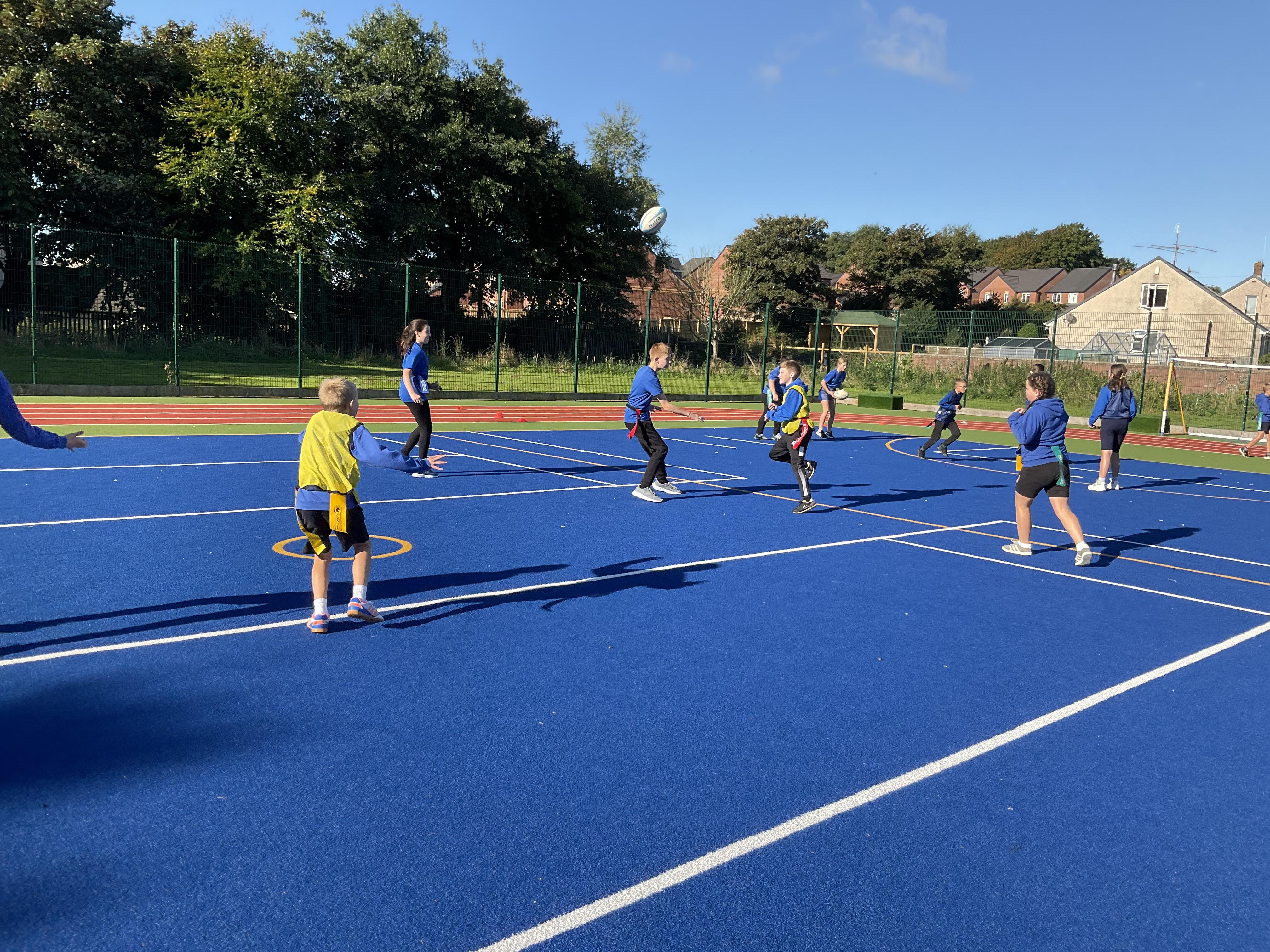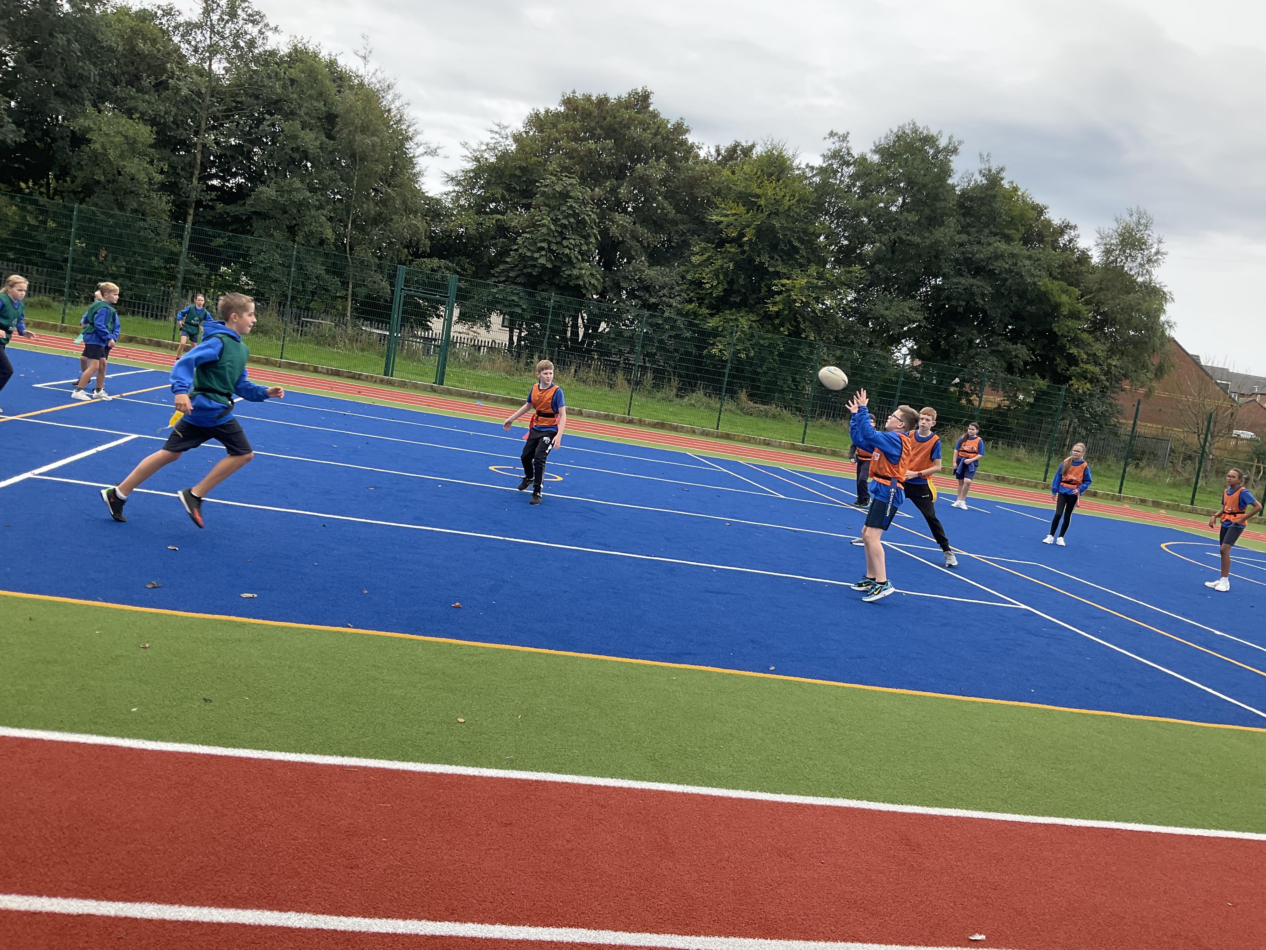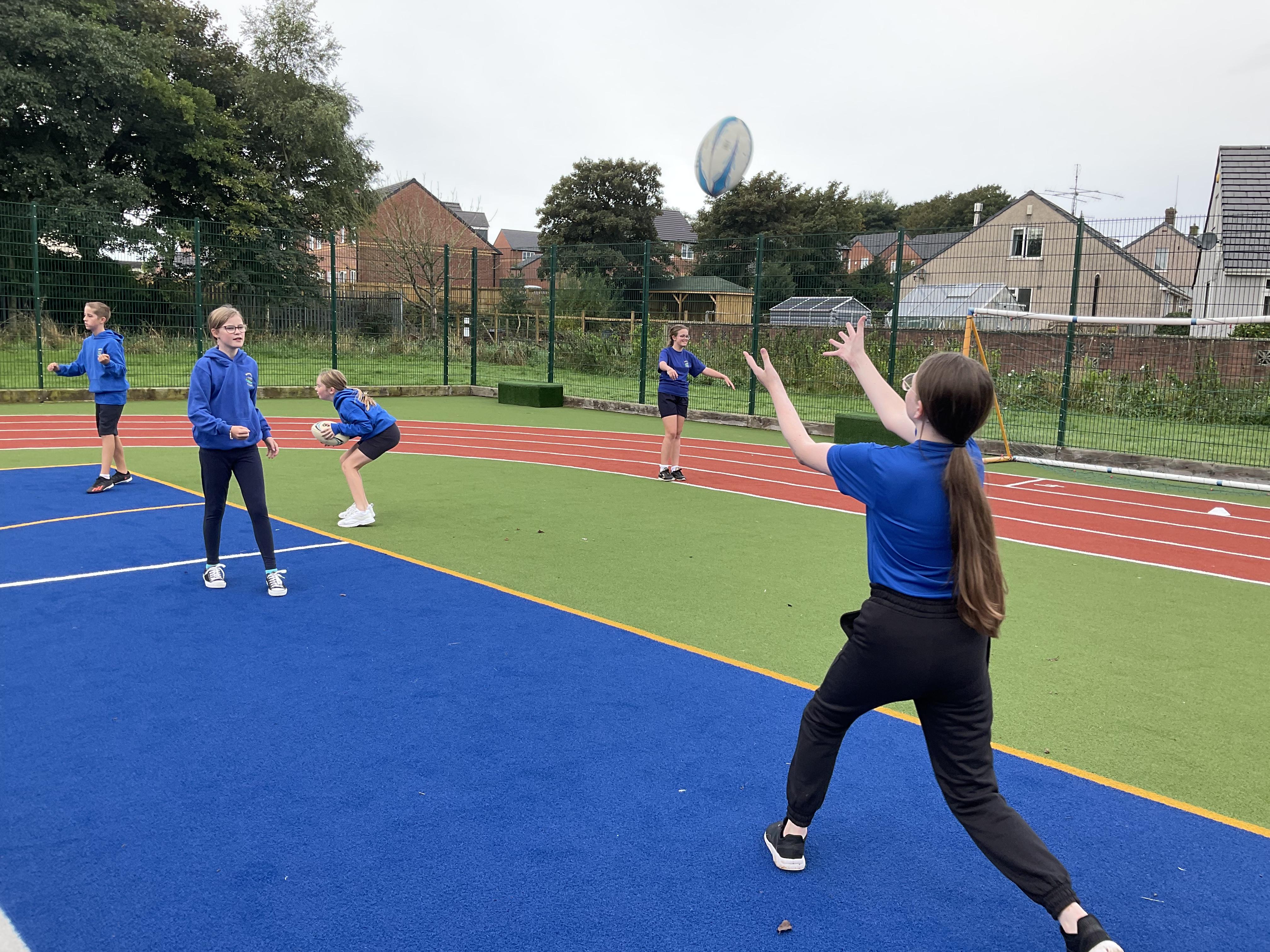 In PE, the children are learning the skills and rules of tag rugby. They have been doing lots of drills involving carrying and passing the ball properly, and practising their footwork.