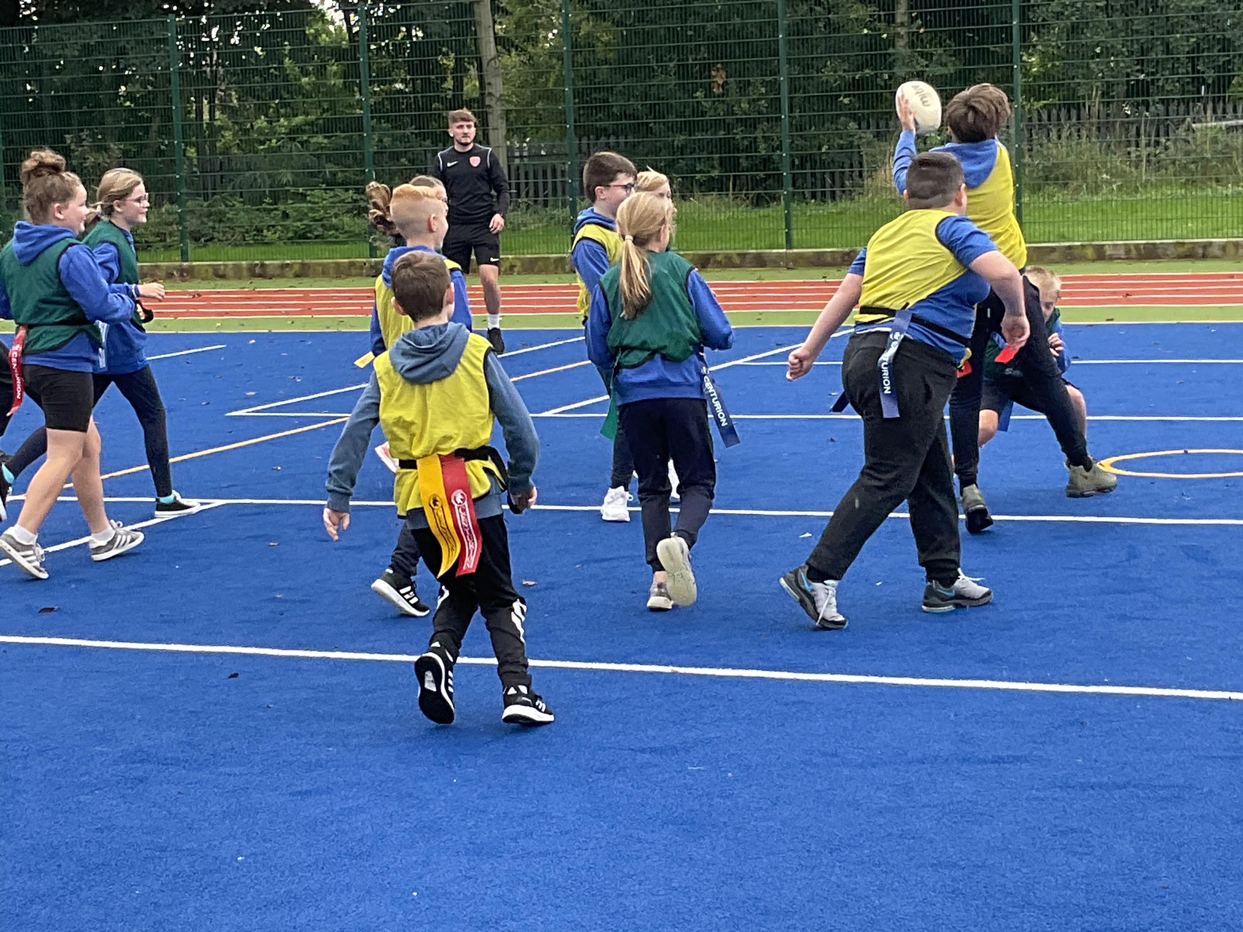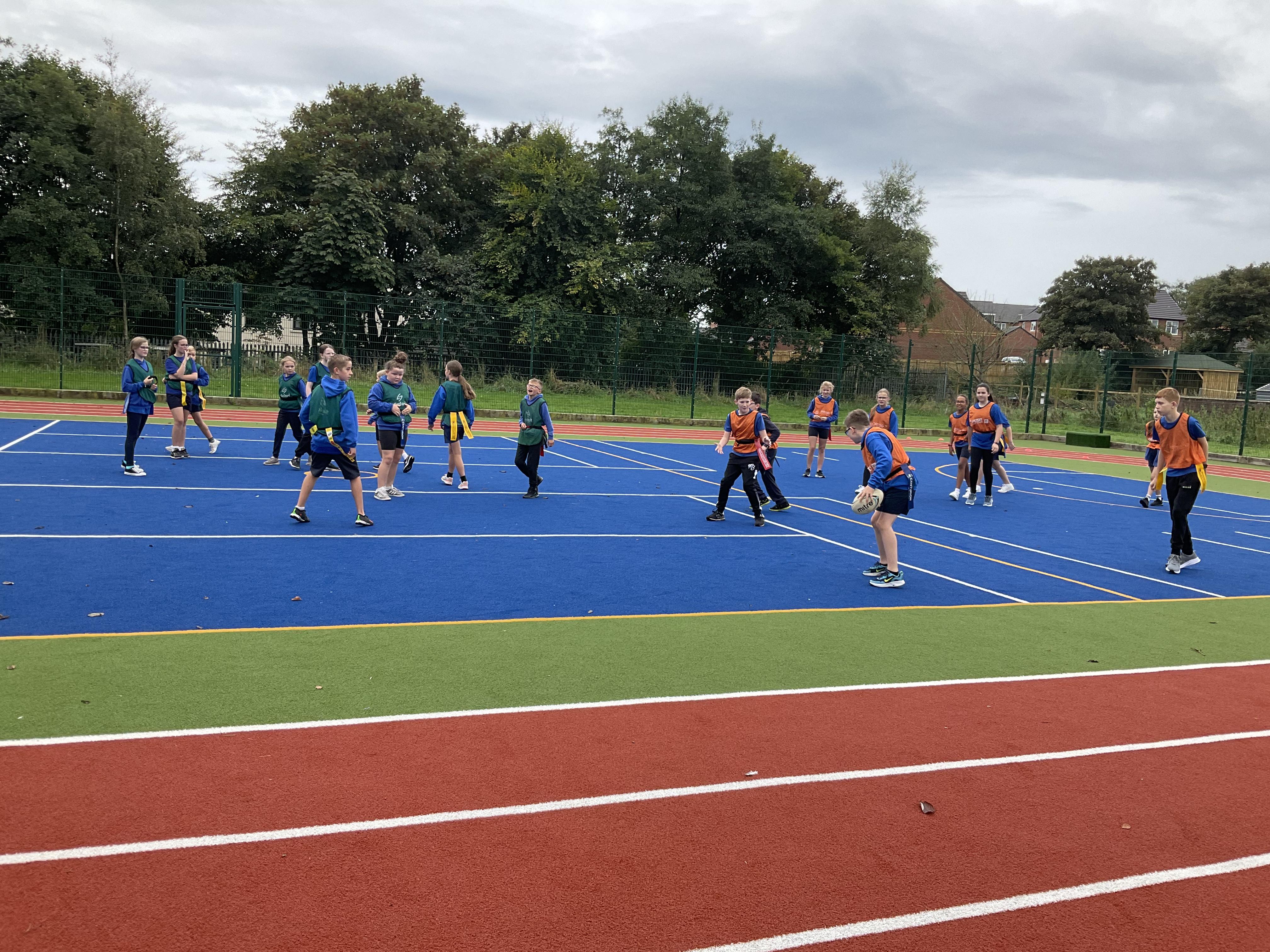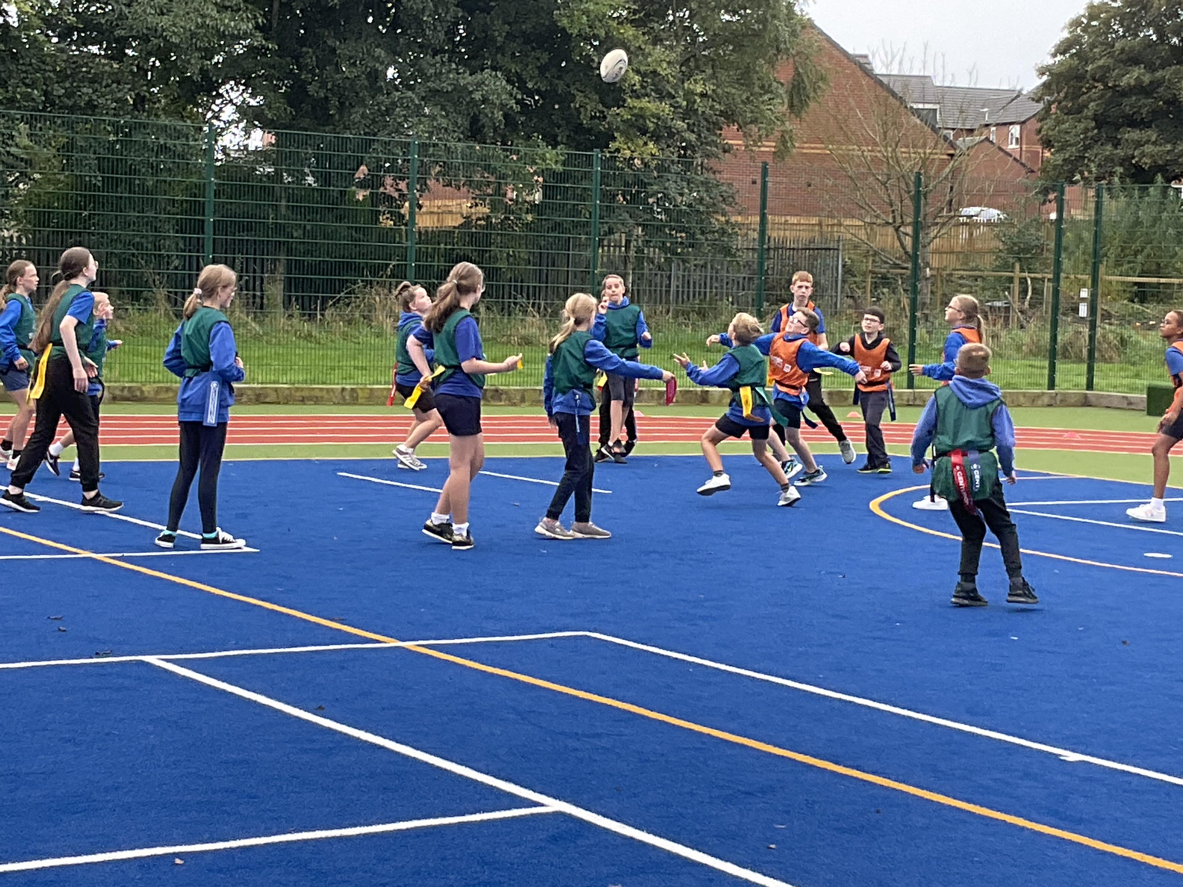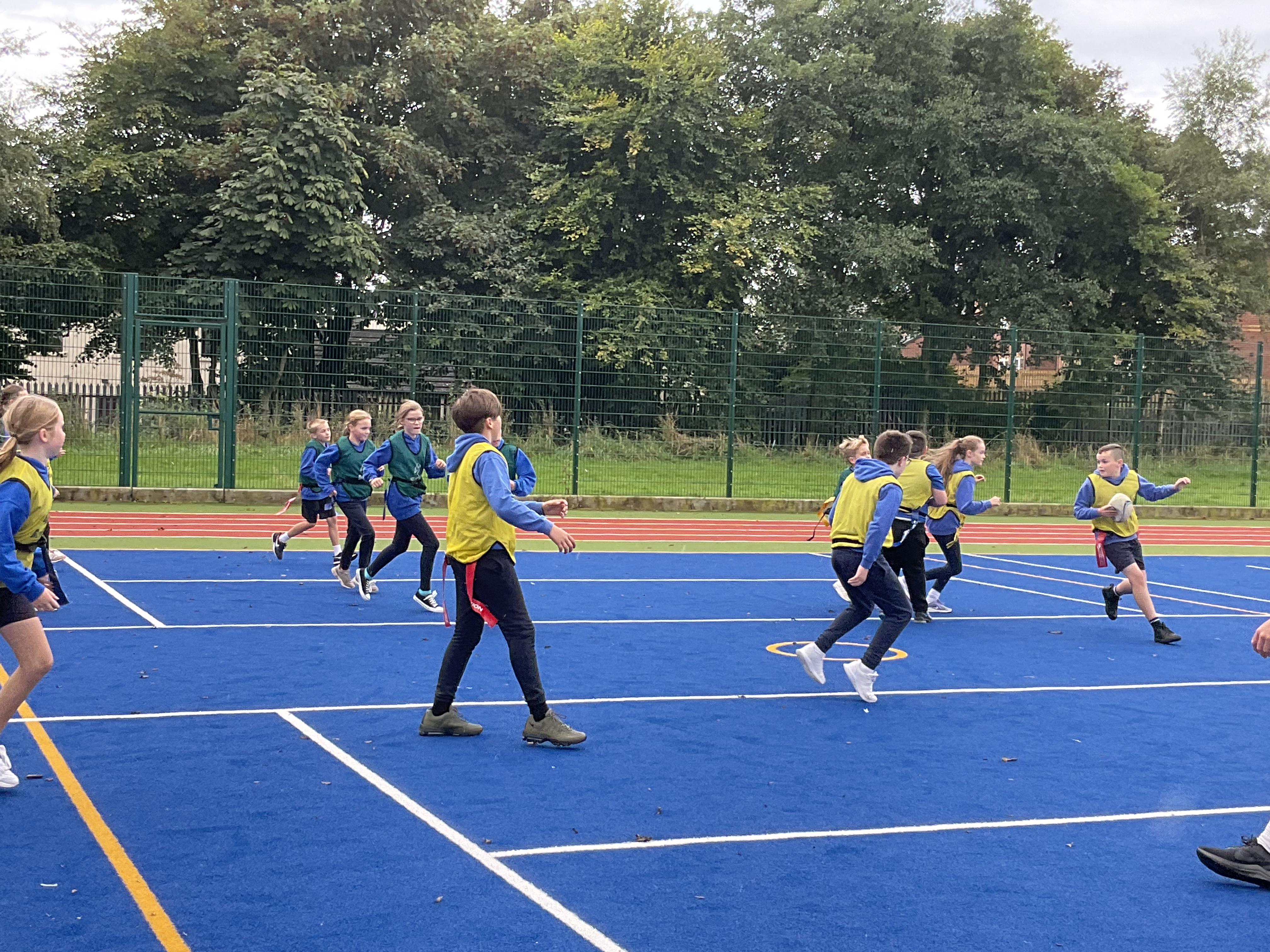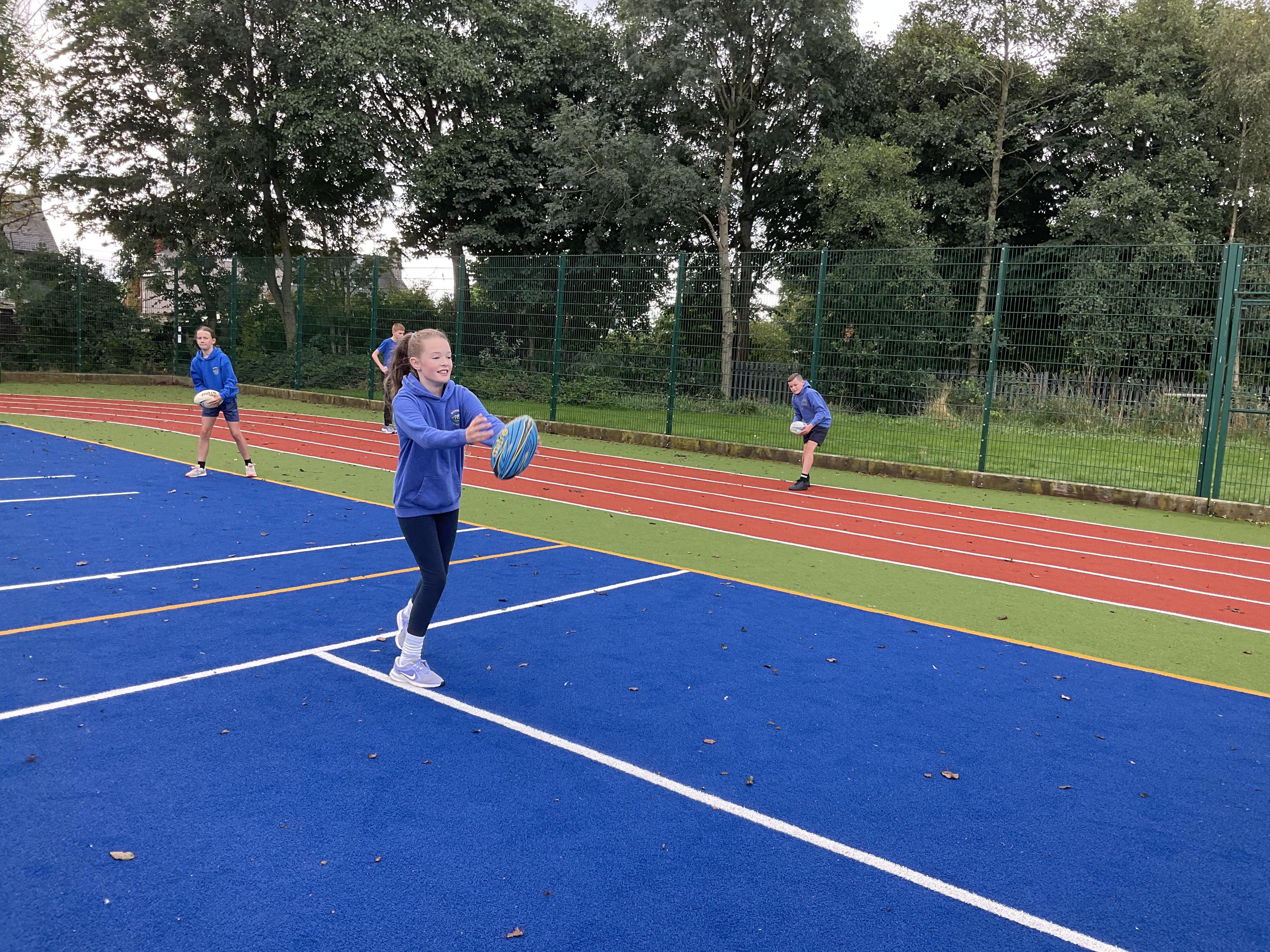 In PE, the children are learning the skills and rules of tag rugby. They have been doing lots of drills involving carrying and passing the ball properly, and practising their footwork.