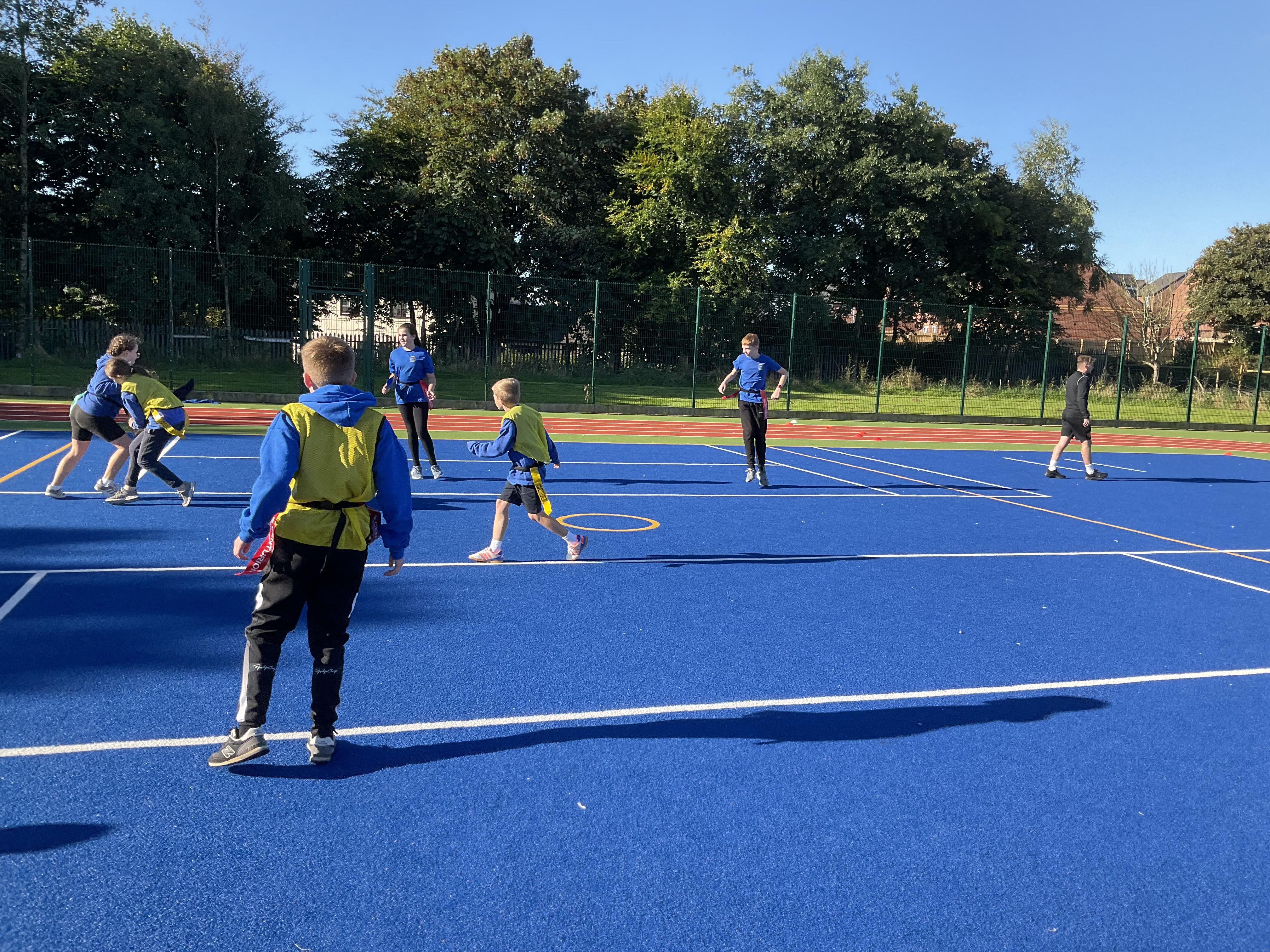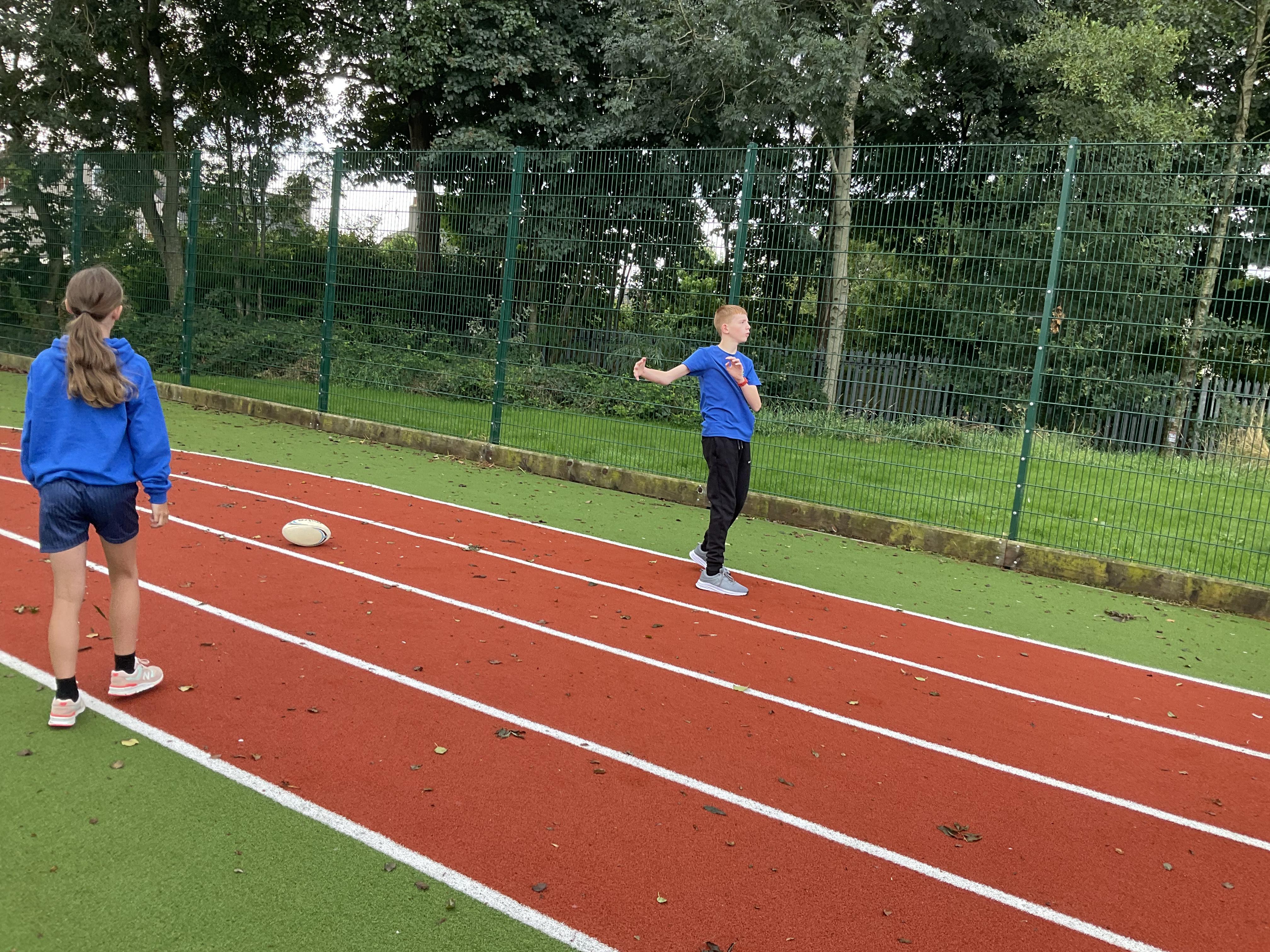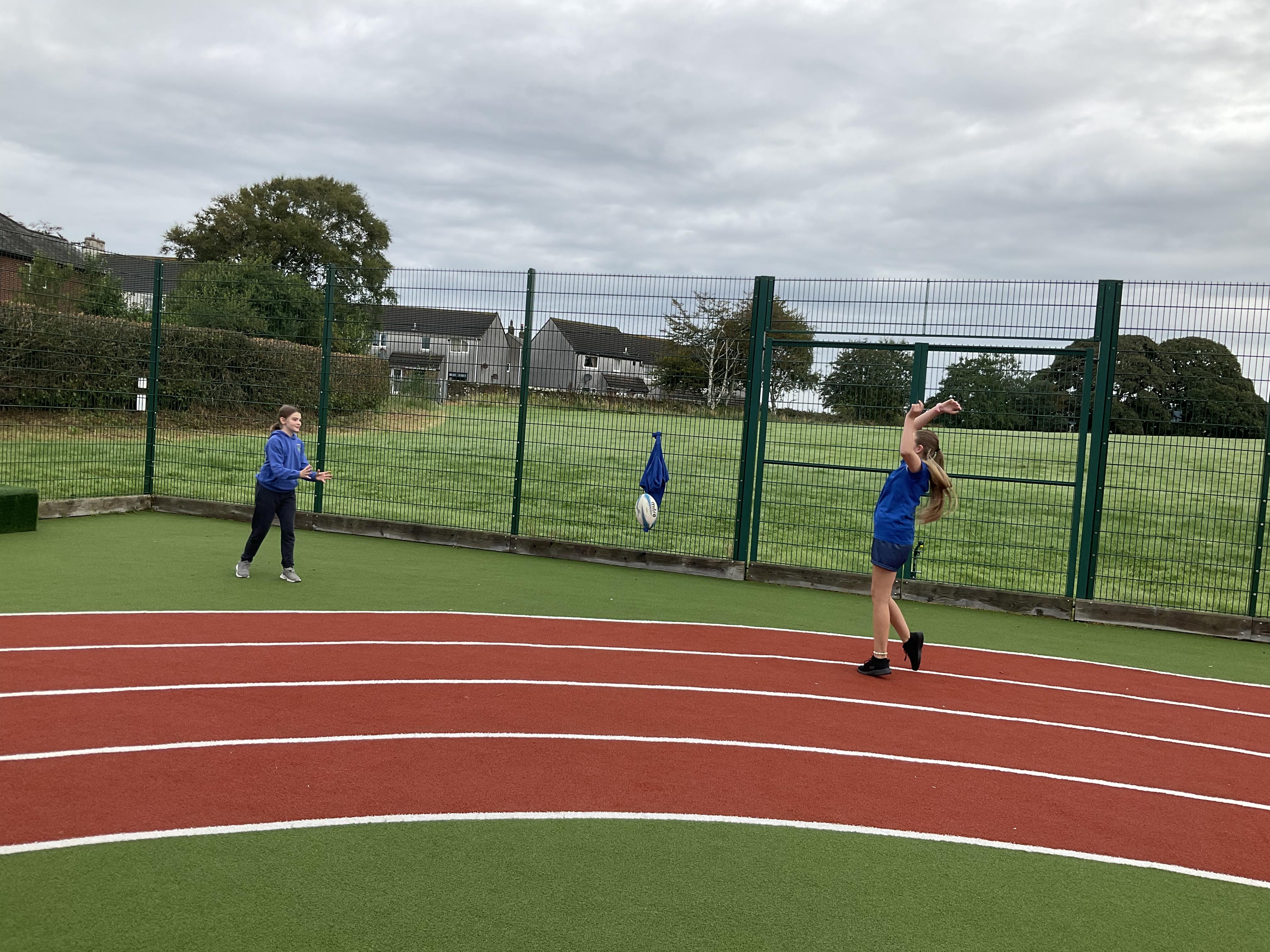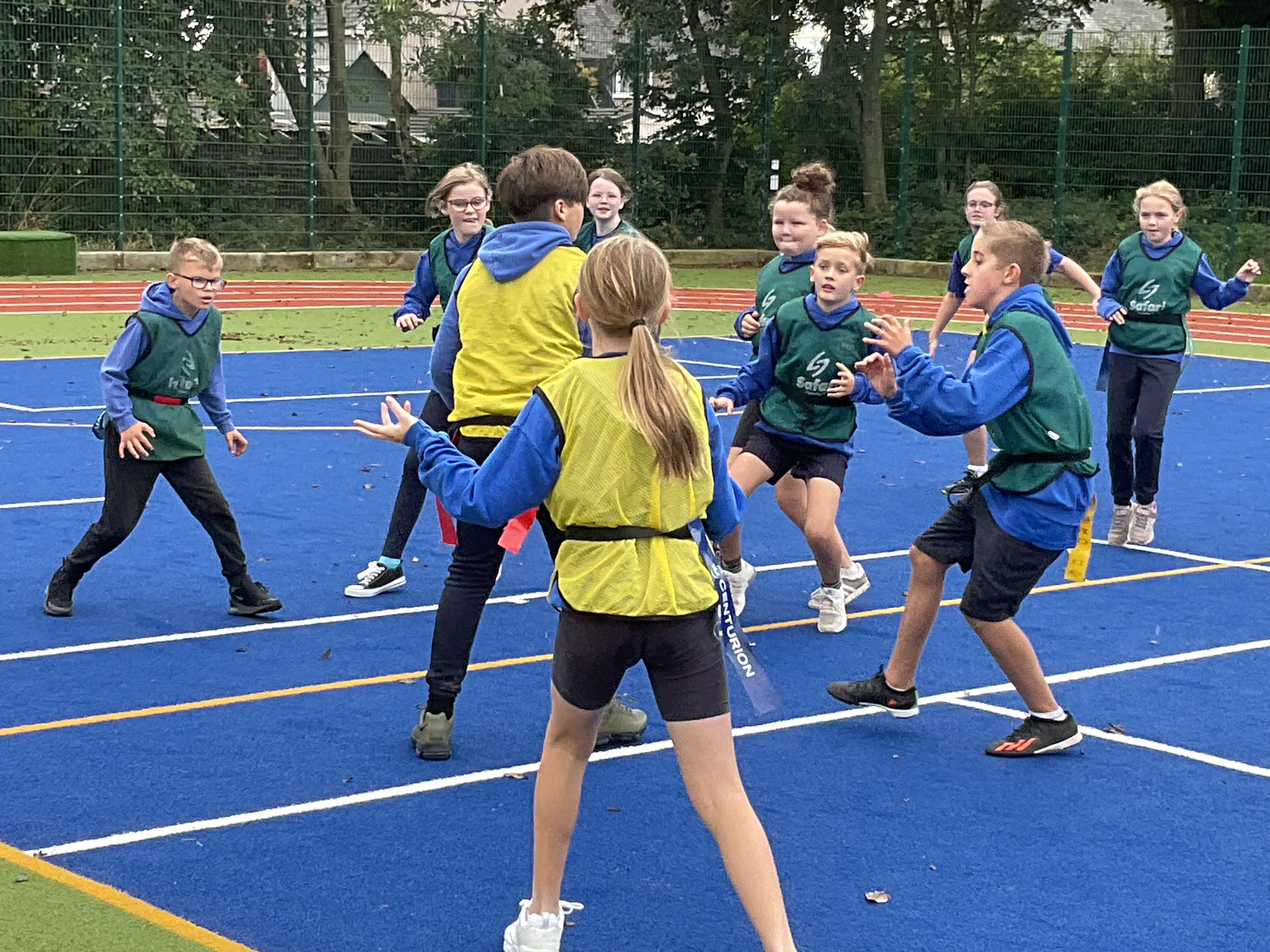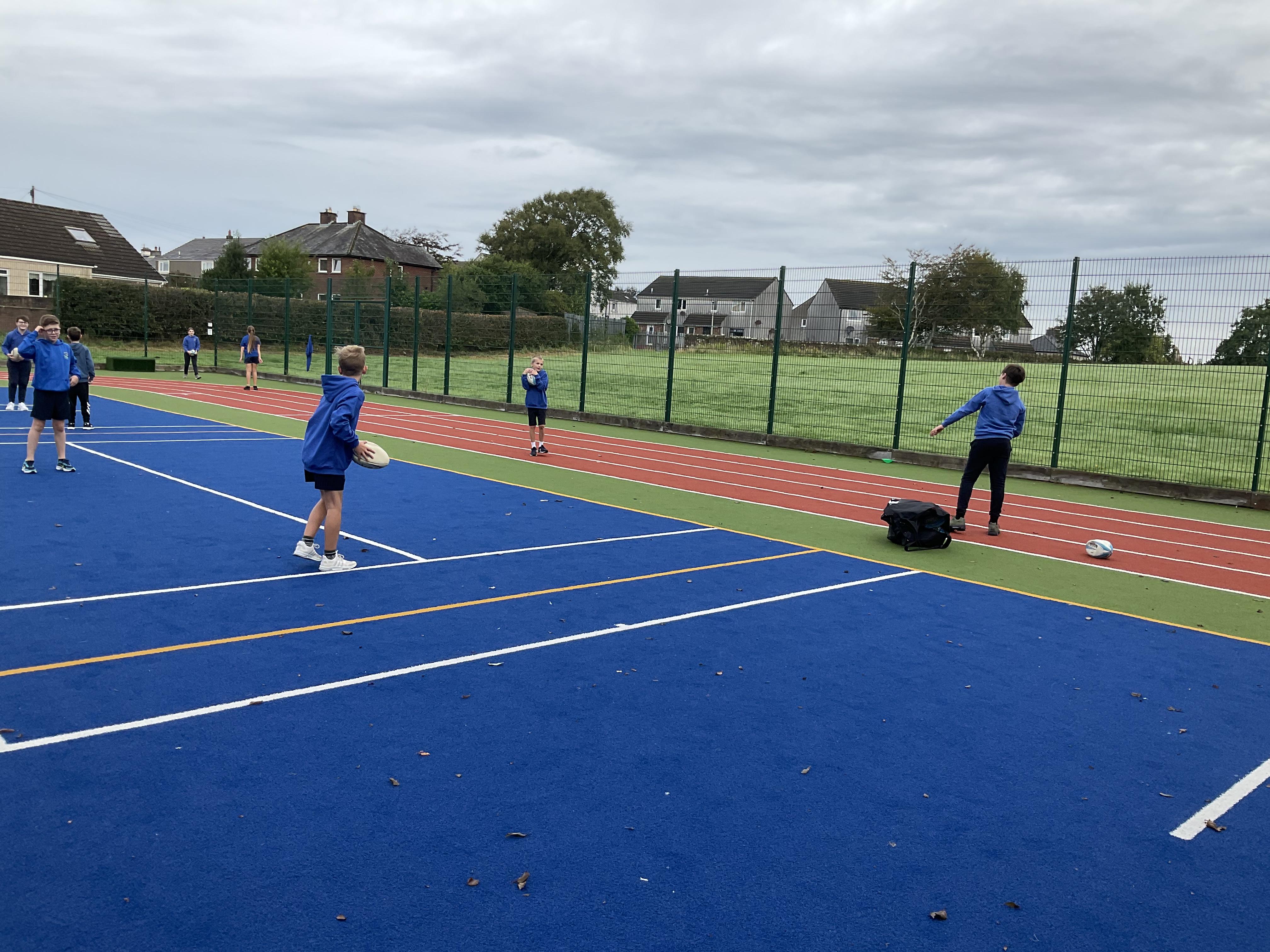 In PE, the children are learning the skills and rules of tag rugby. They have been doing lots of drills involving carrying and passing the ball properly, and practising their footwork.