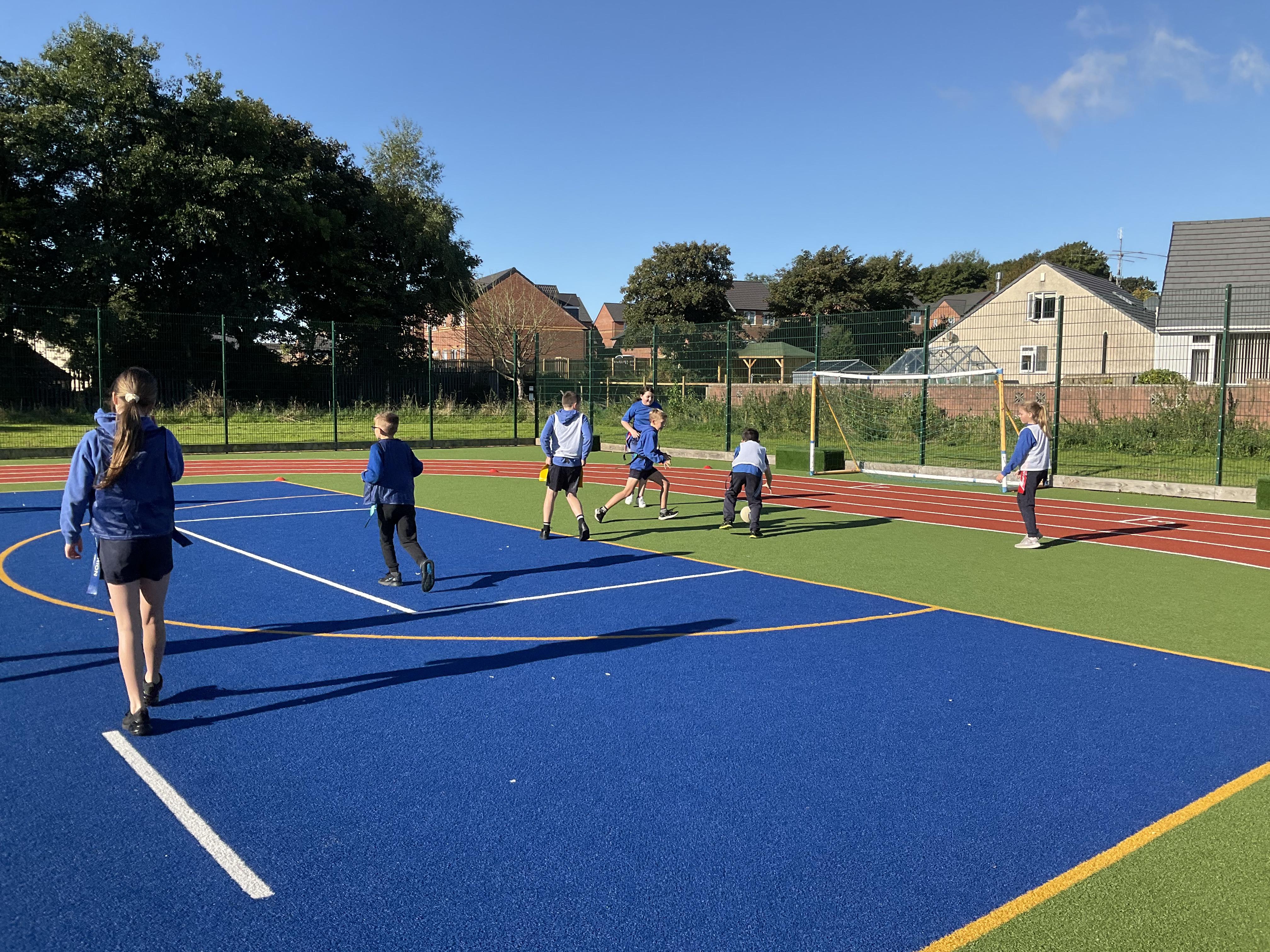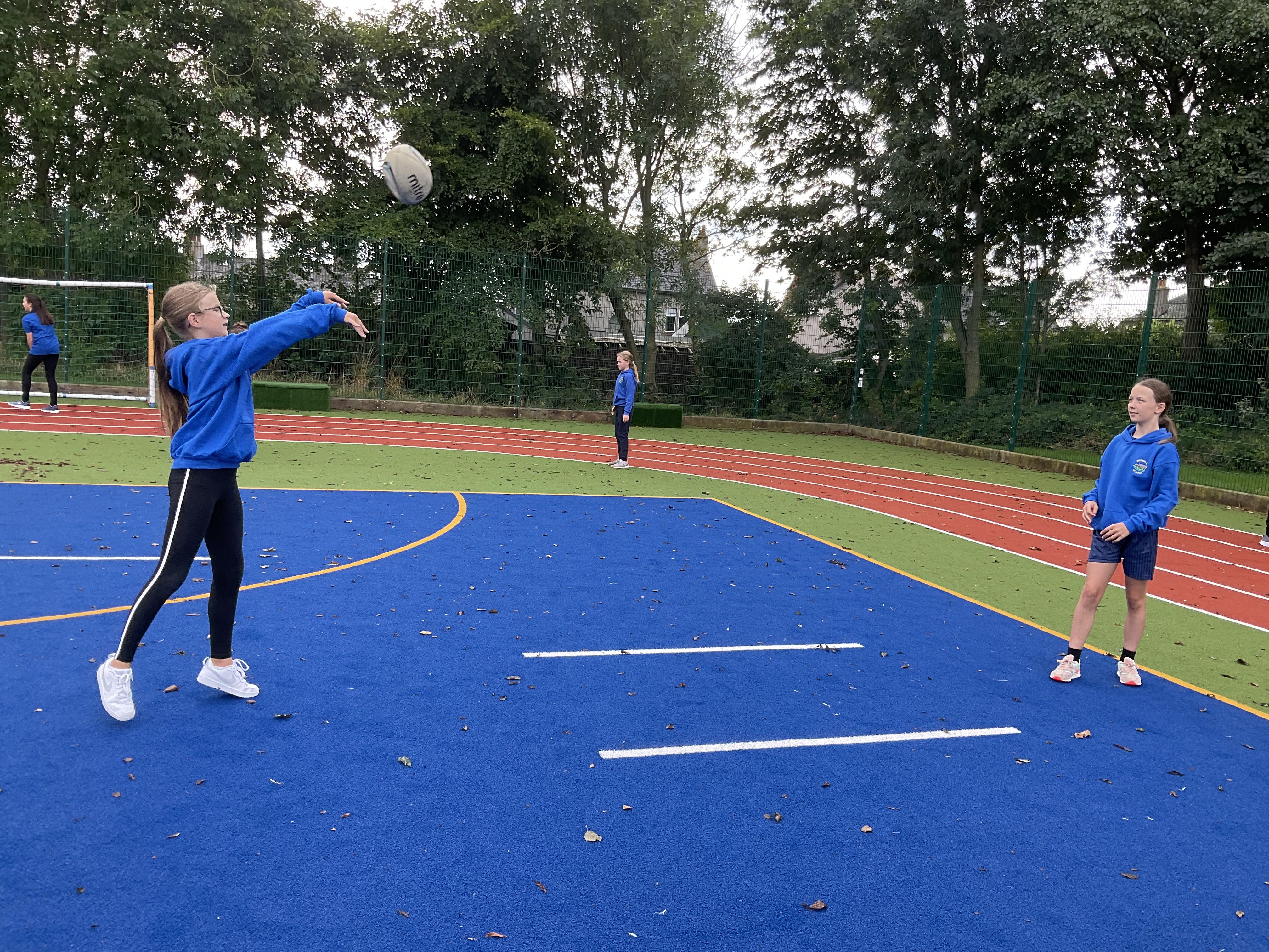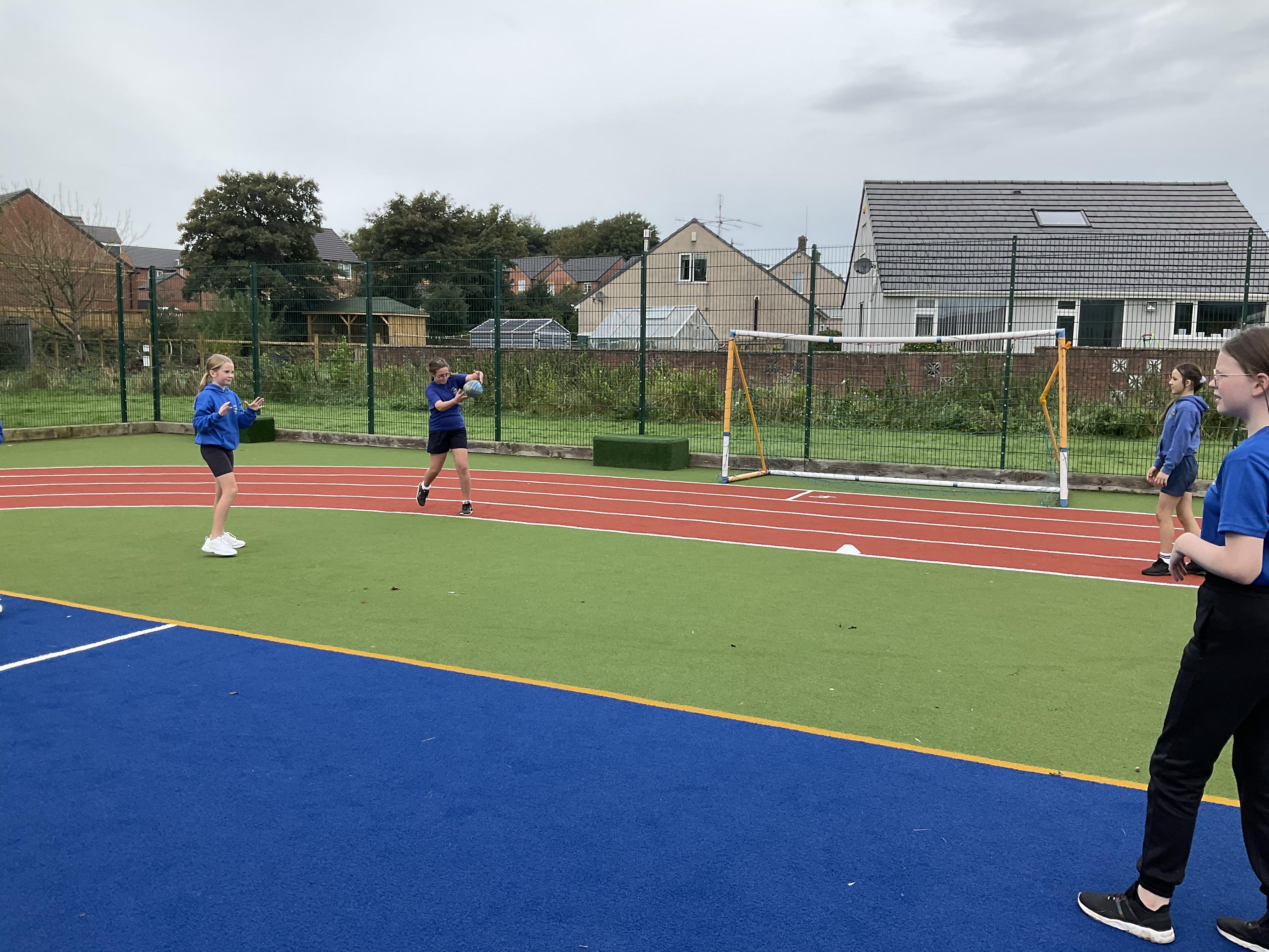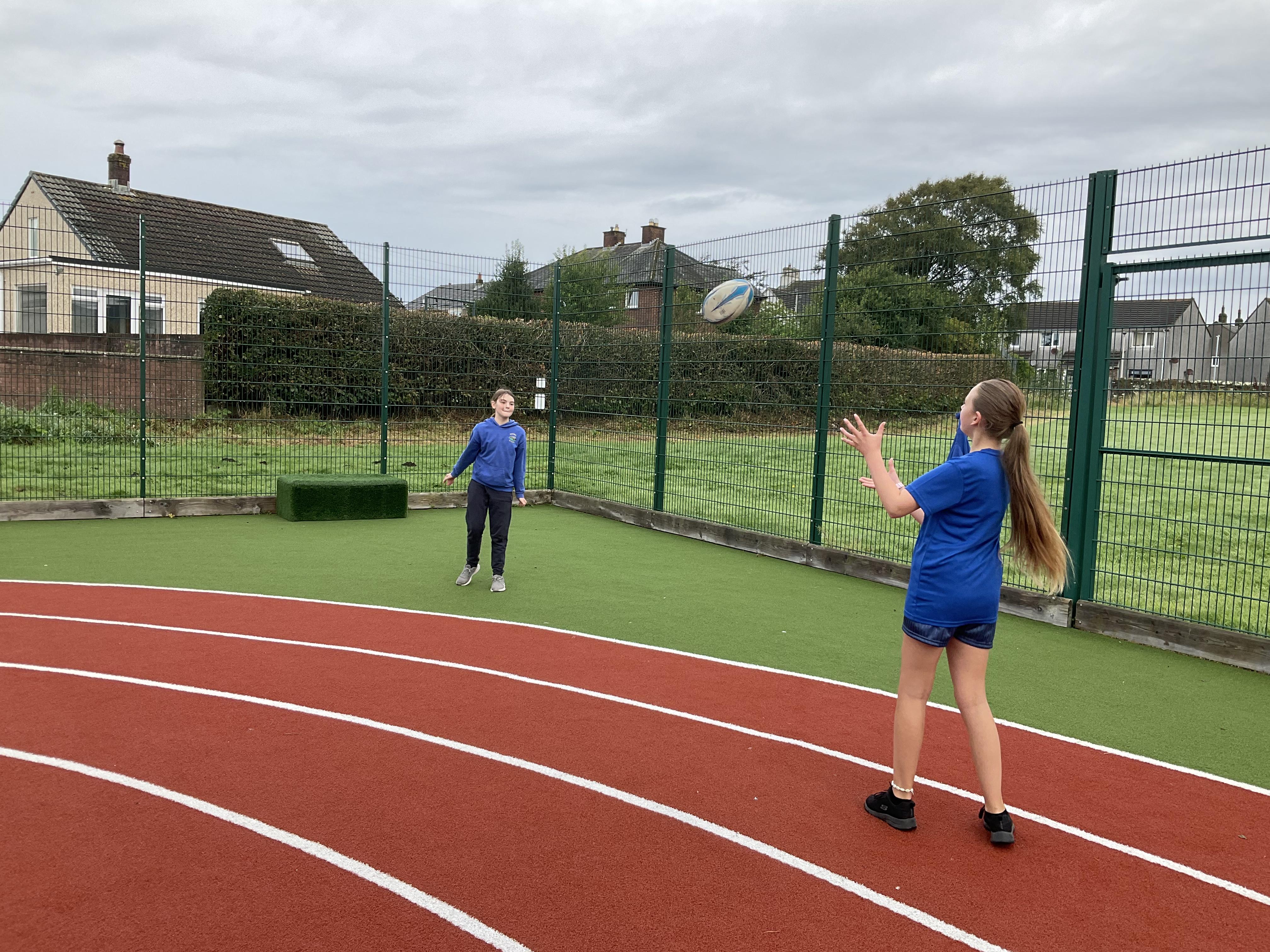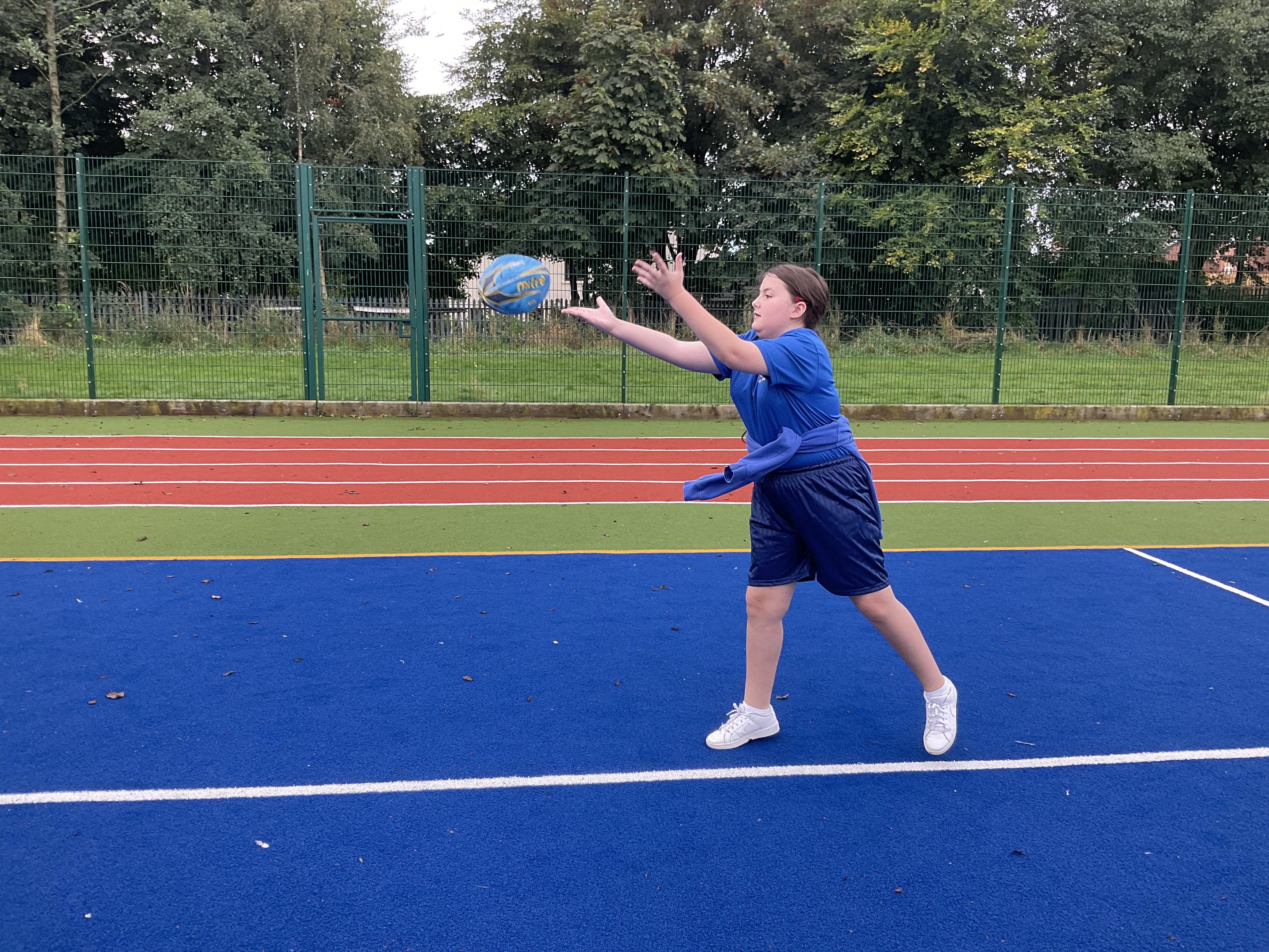 In PE, the children are learning the skills and rules of tag rugby. They have been doing lots of drills involving carrying and passing the ball properly, and practising their footwork.