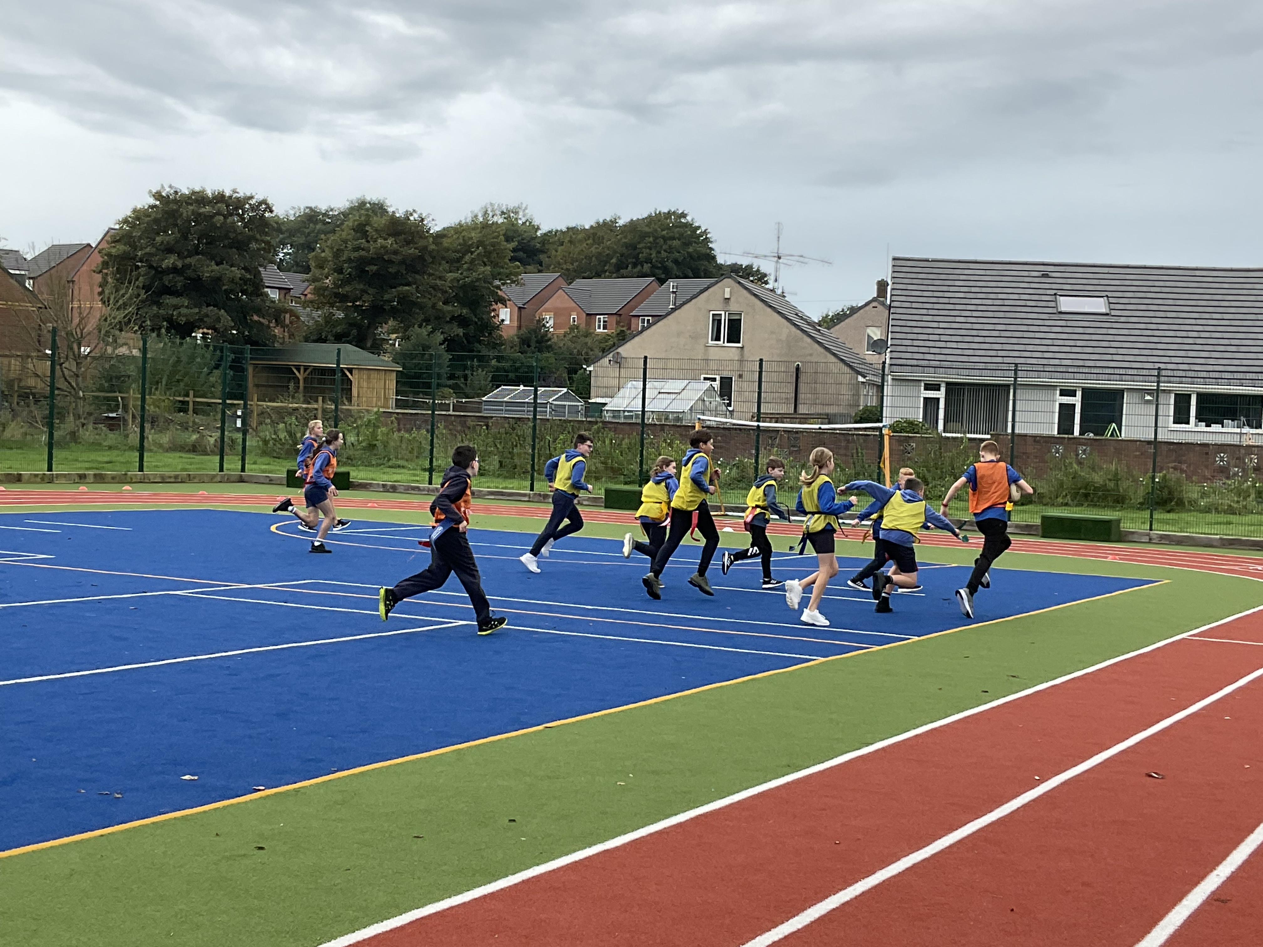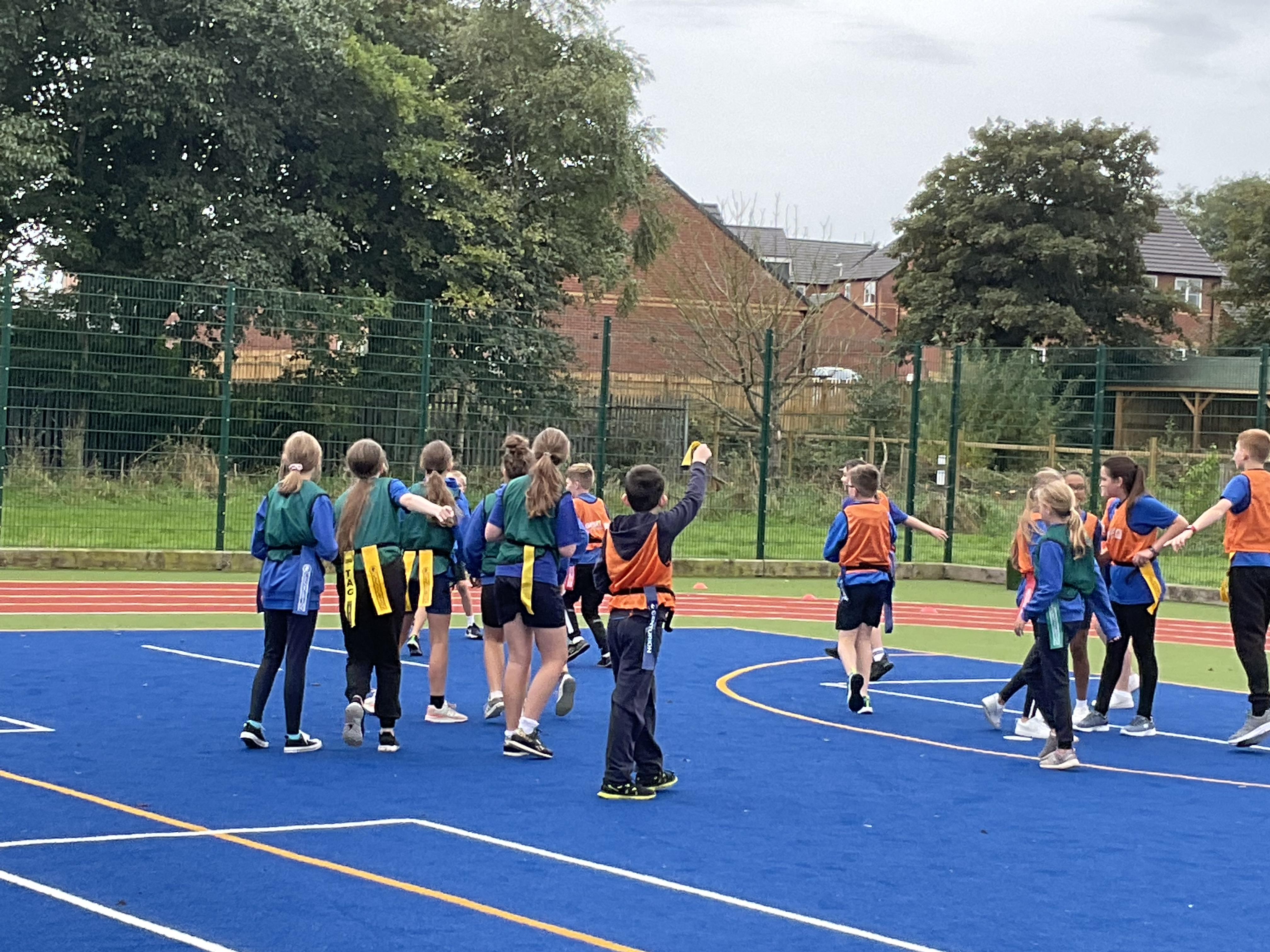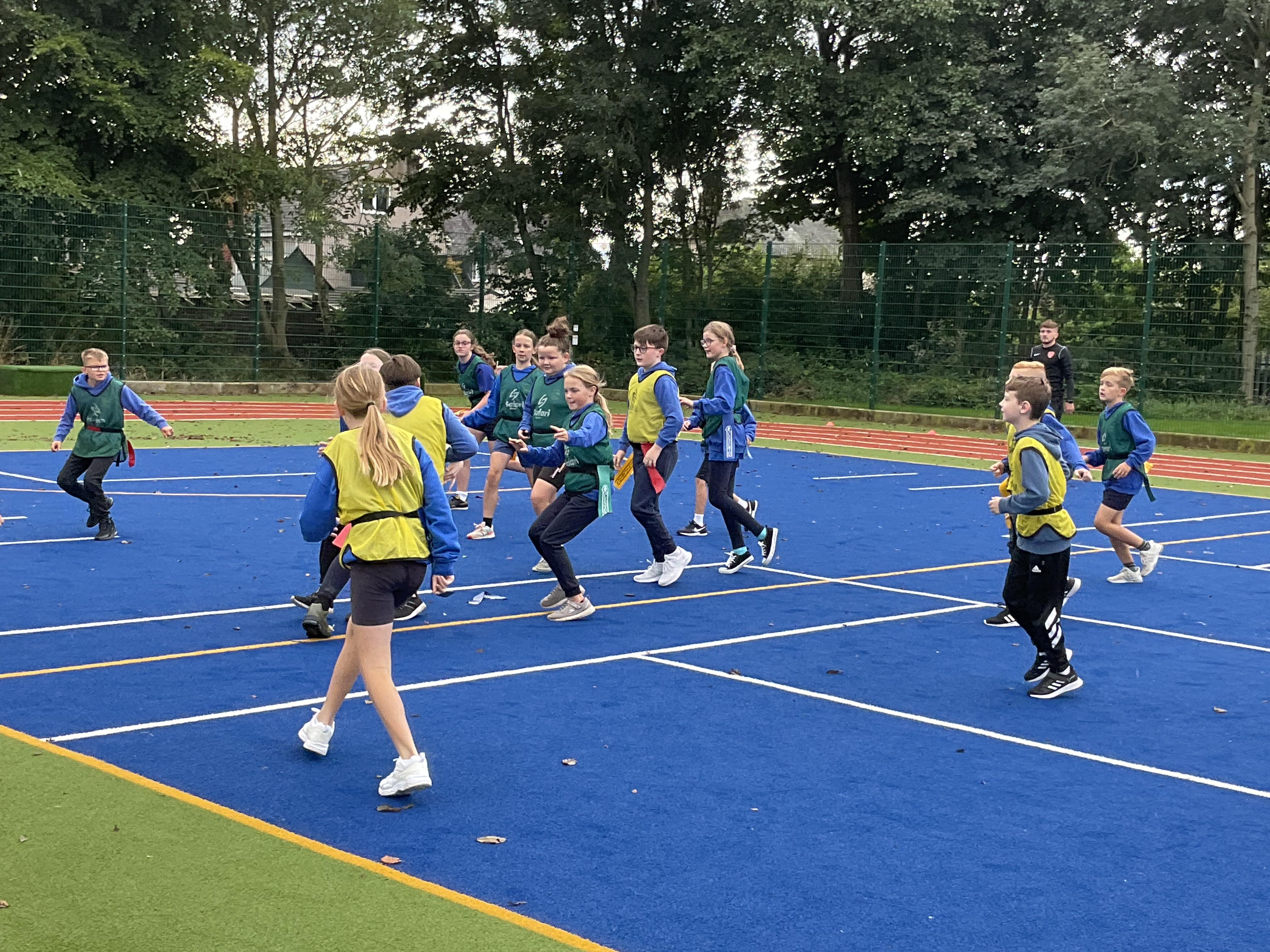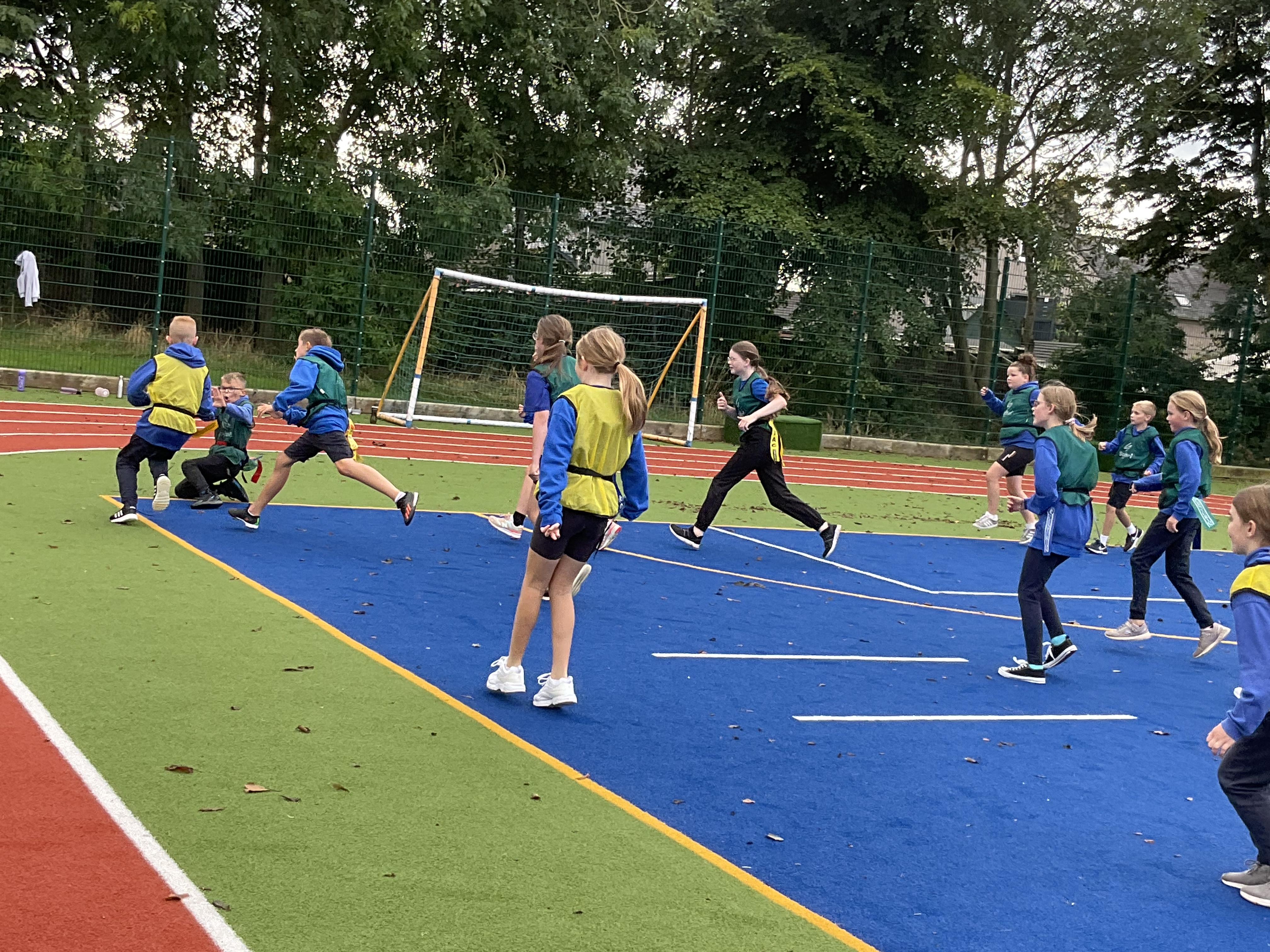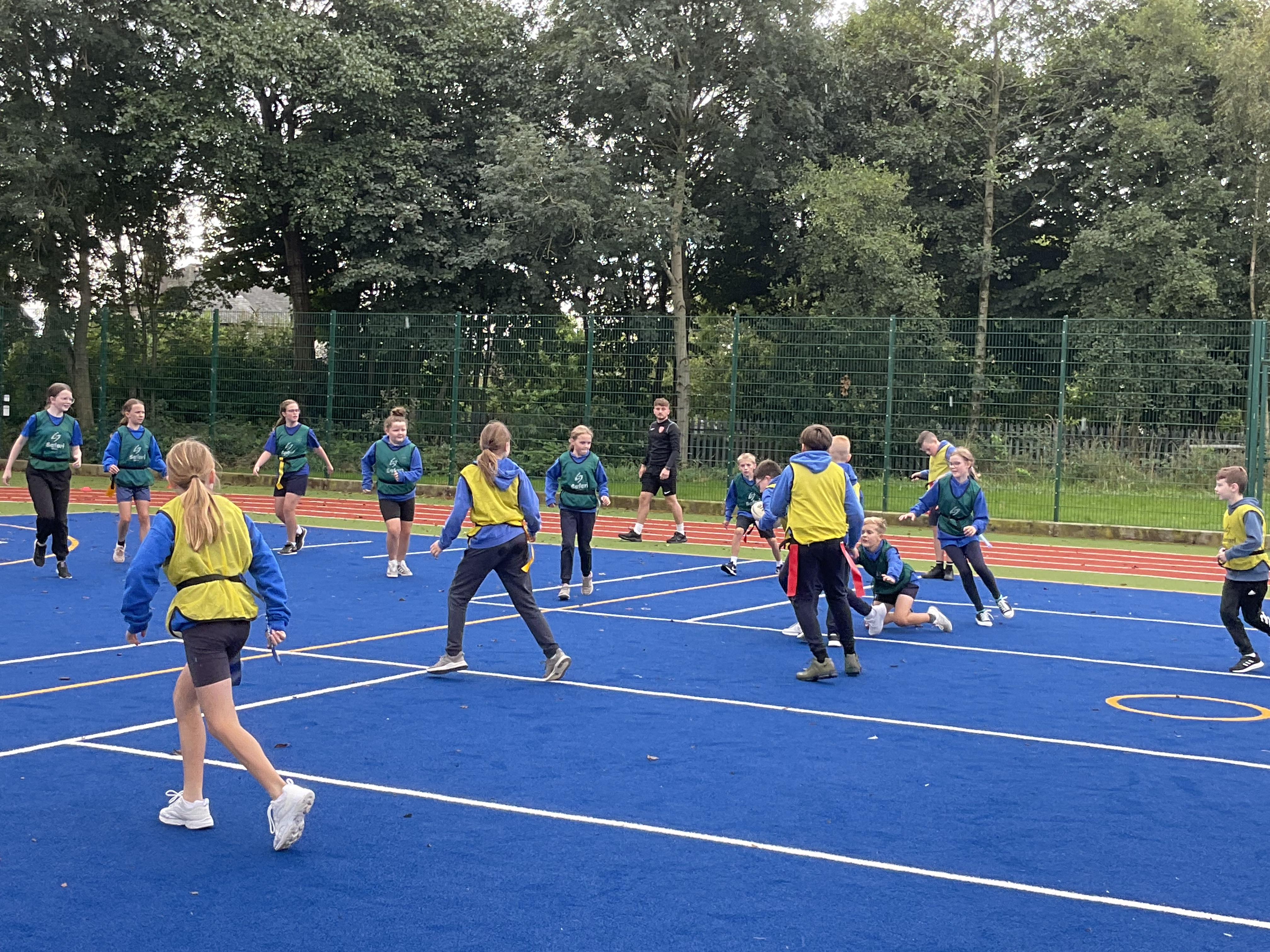 In PE, the children are learning the skills and rules of tag rugby. They have been doing lots of drills involving carrying and passing the ball properly, and practising their footwork.